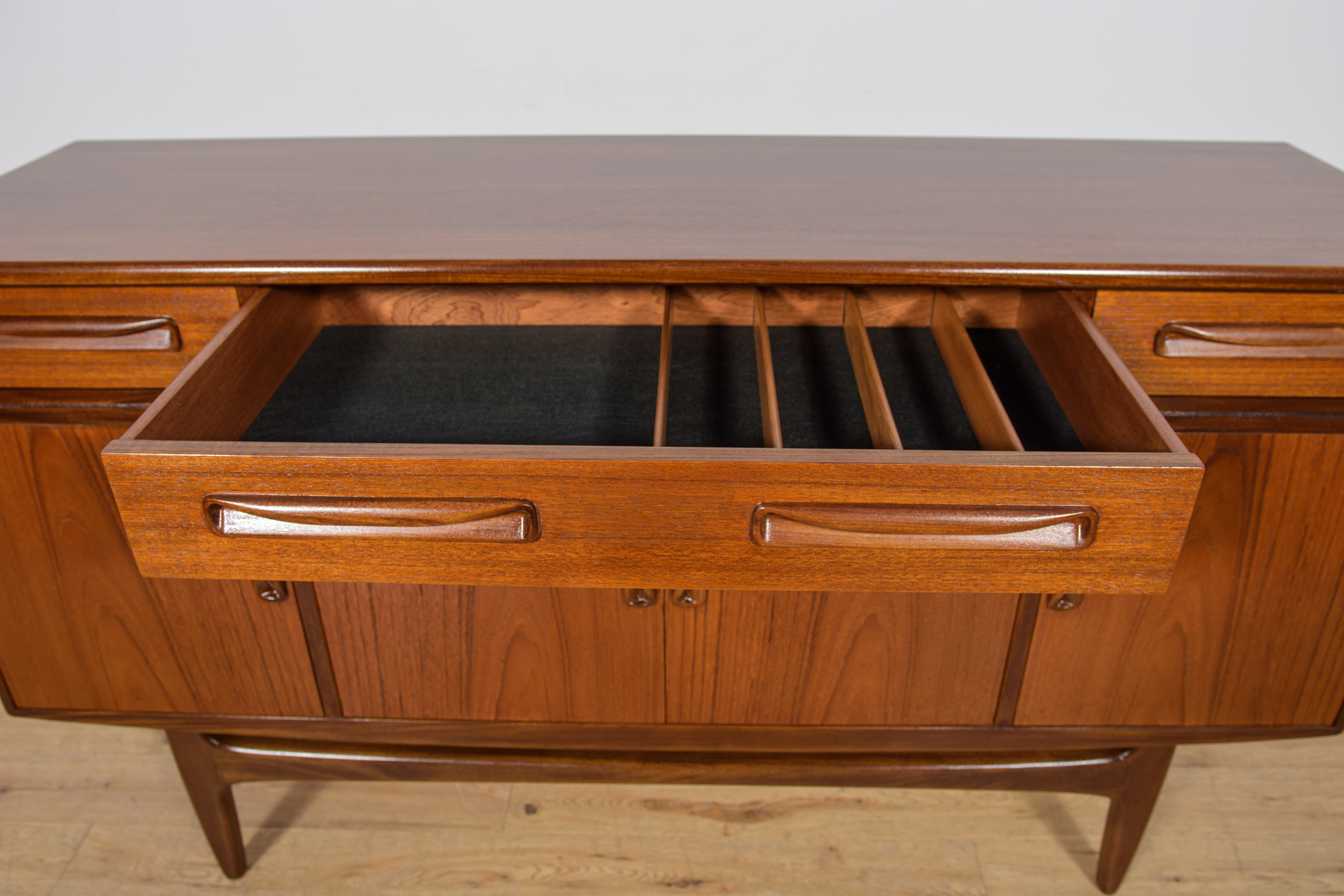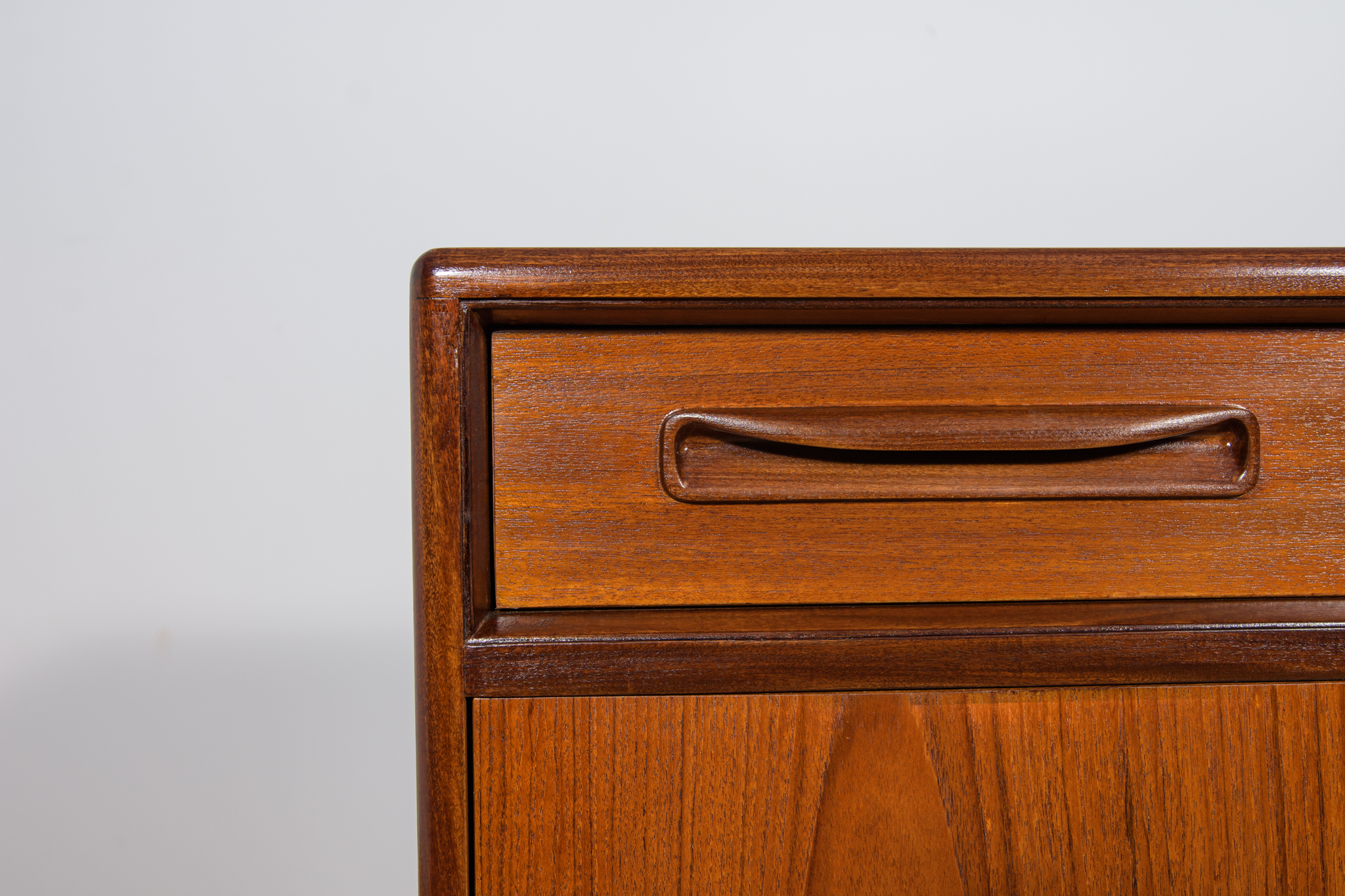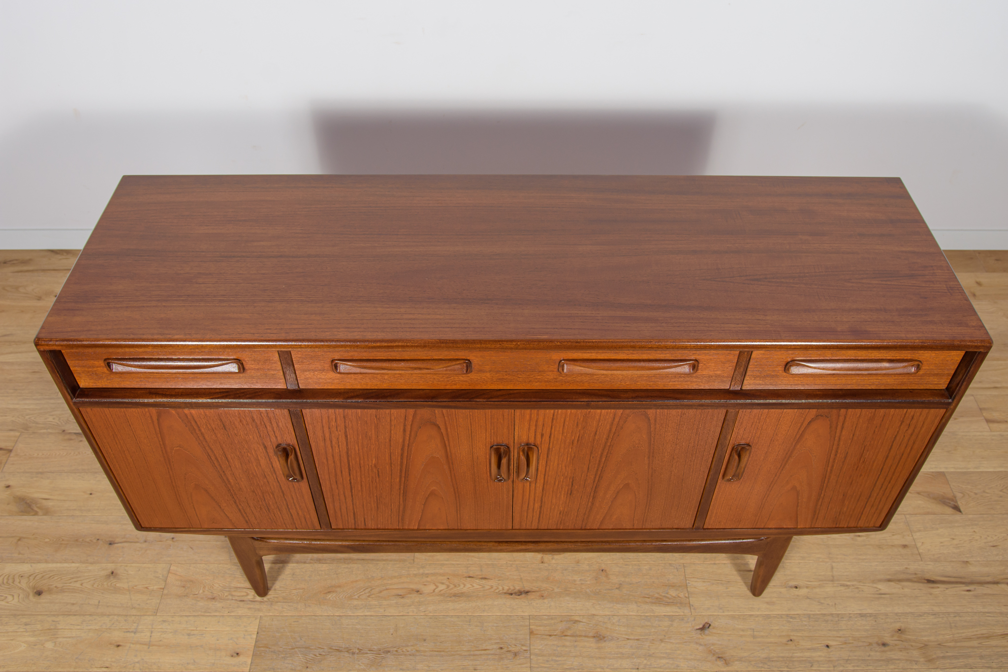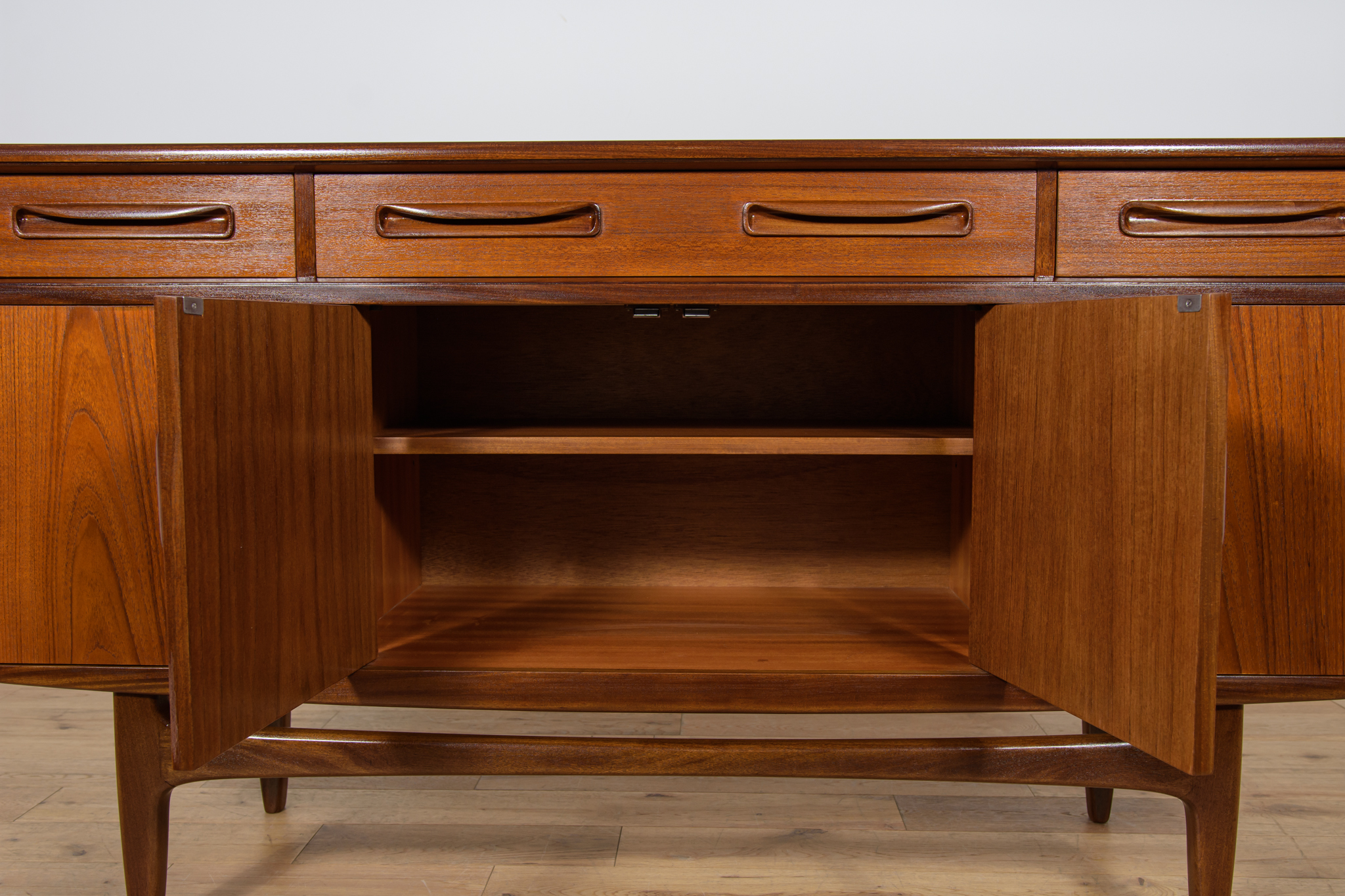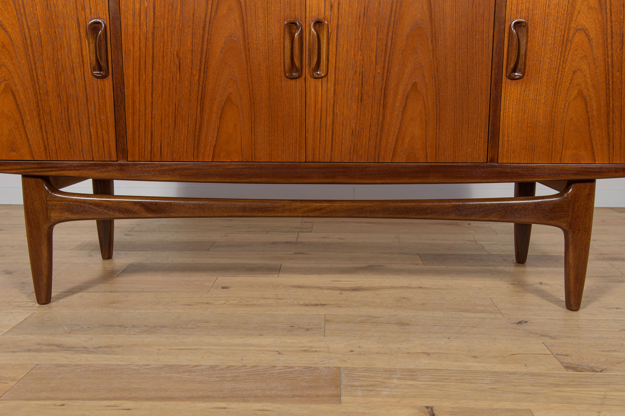 This elegant Scandinavian influenced credenza designed by Victor Wilkins became an instant Classic for G-Plan, it is an exceptionally well-balanced design with dark Afromosia sculpted handles and trim contrasting against the teak veneer. It sits upon an elegantly curved stretcher and tapered legs. Completely restored. Sideboard cleaned from the old surface and painted oak stain and finished with quality Danish oil.