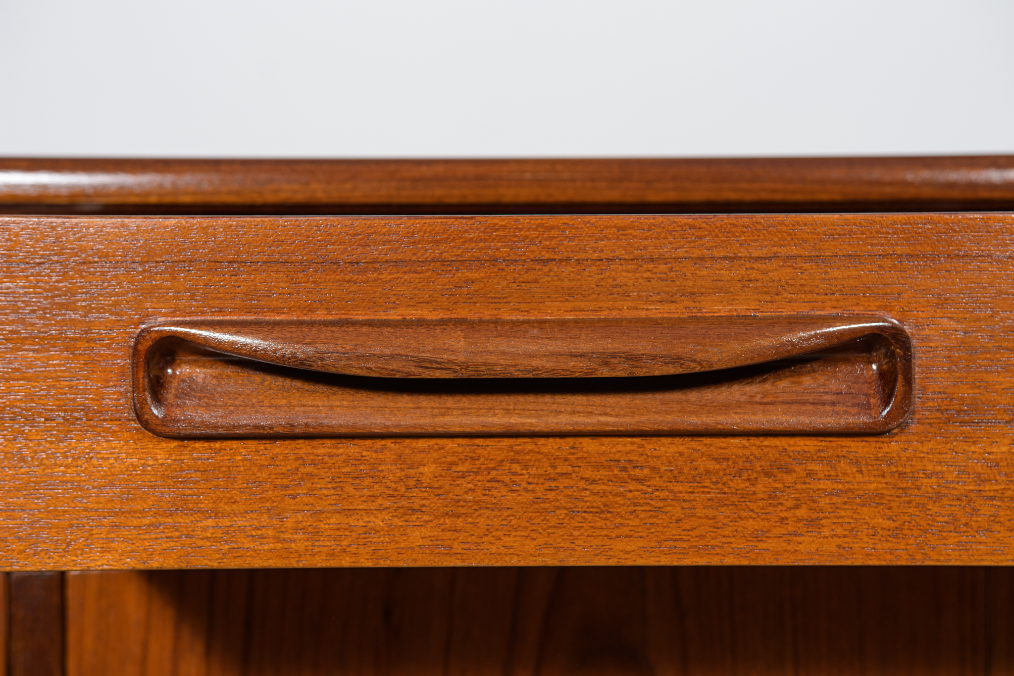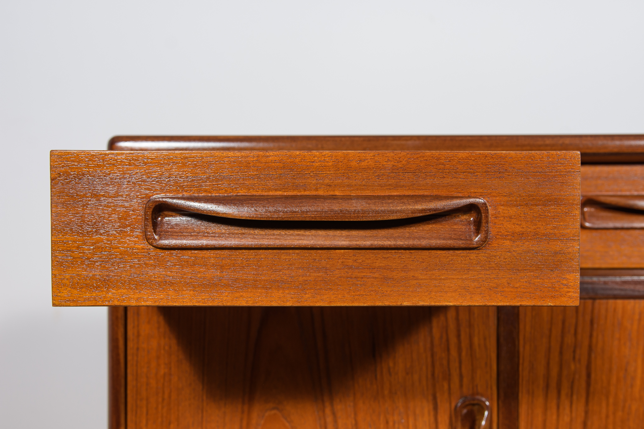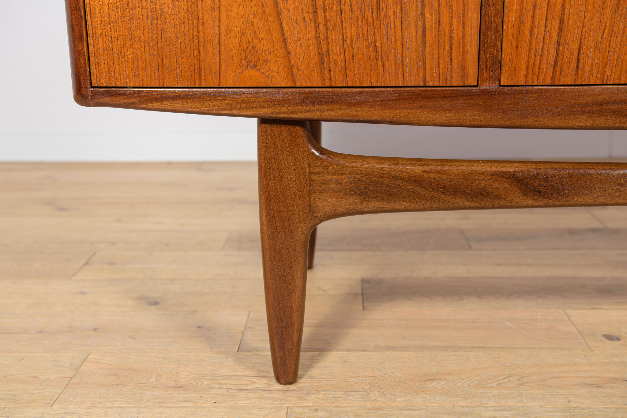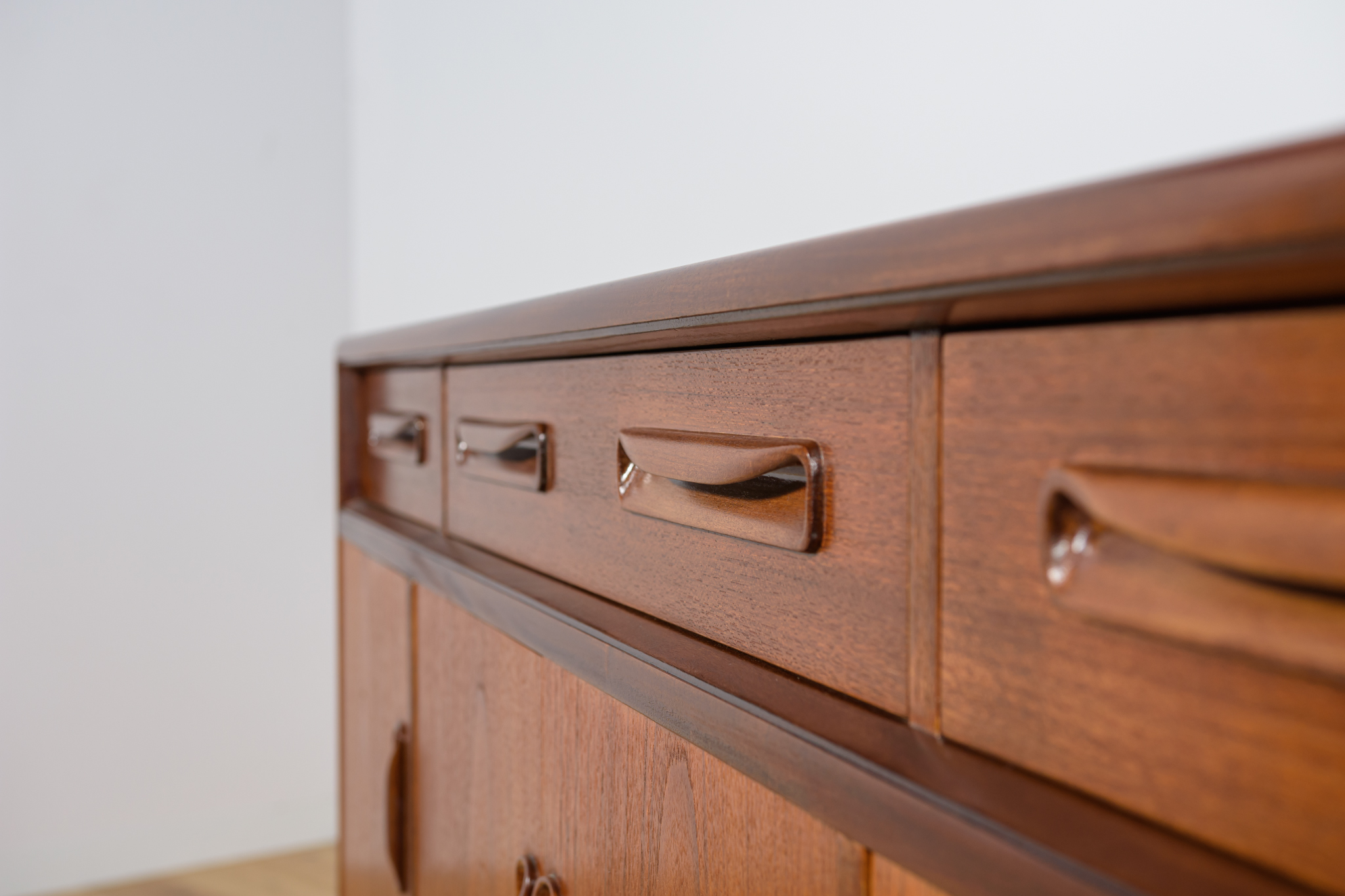 This elegant Scandinavian influenced credenza designed by Victor Wilkins became an instant Classic for G-Plan, it is an exceptionally well-balanced design with dark Afromosia sculpted handles and trim contrasting against the teak veneer. It sits upon an elegantly curved stretcher and tapered legs. Completely restored. Sideboard cleaned from the old surface and painted oak stain and finished with quality Danish oil.
