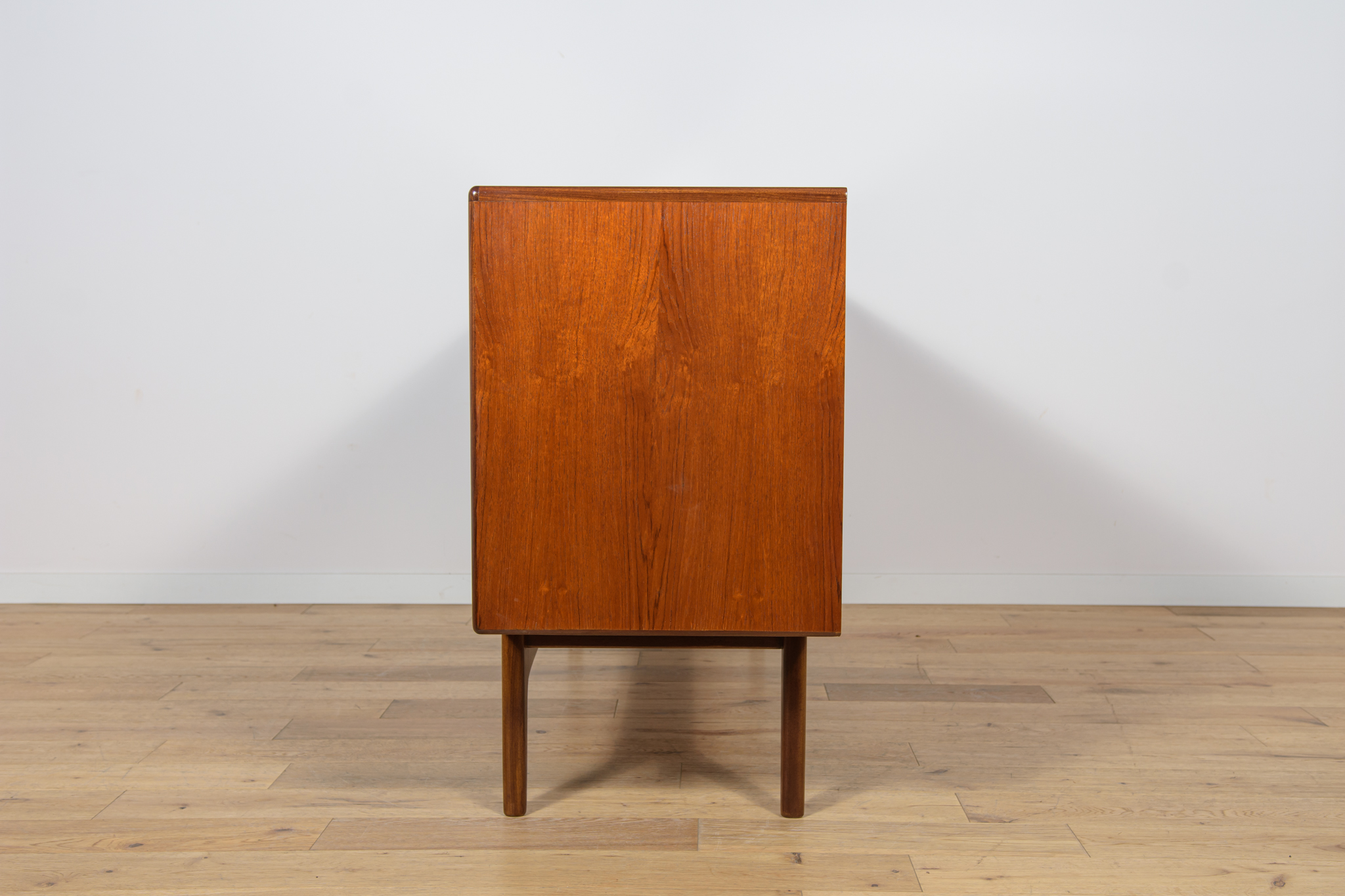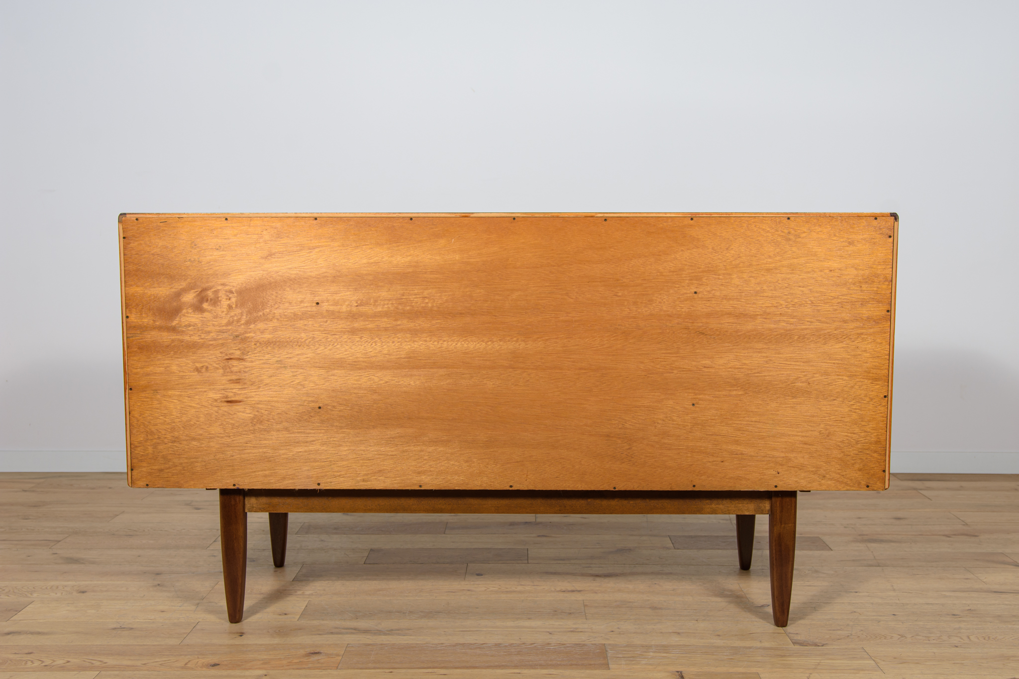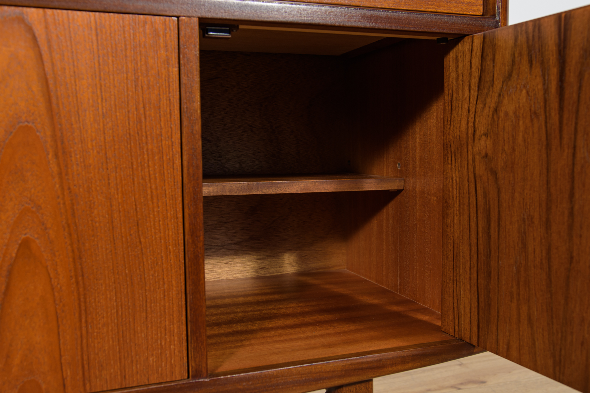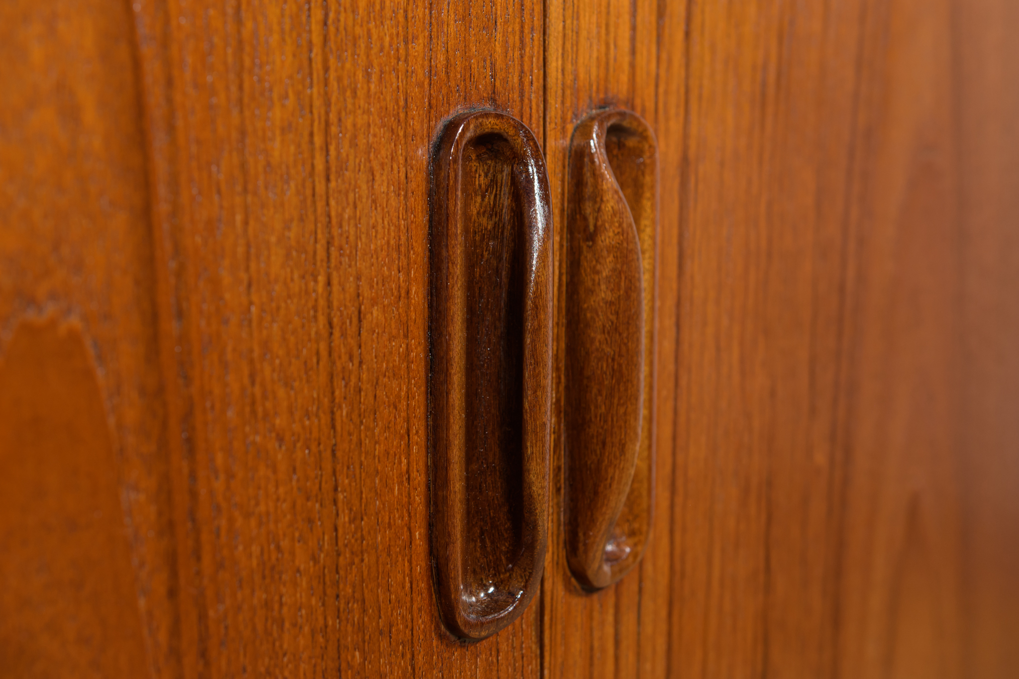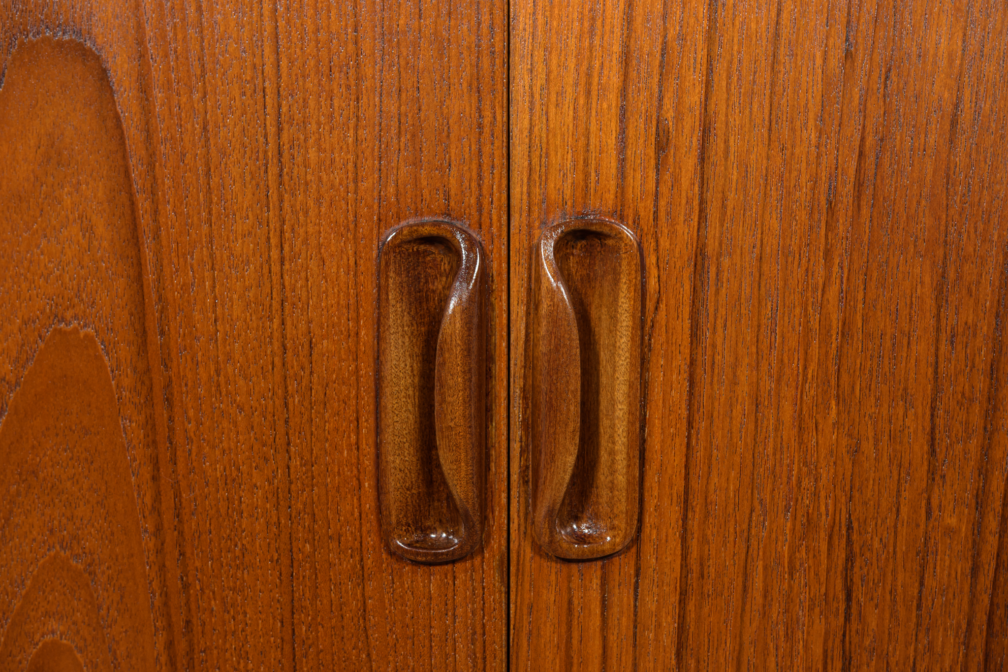 This elegant Scandinavian influenced credenza designed by Victor Wilkins became an instant Classic for G-Plan, it is an exceptionally well-balanced design with dark Afromosia sculpted handles and trim contrasting against the teak veneer. It sits upon an elegantly curved stretcher and tapered legs. Completely restored. Sideboard cleaned from the old surface and painted oak stain and finished with quality Danish oil.