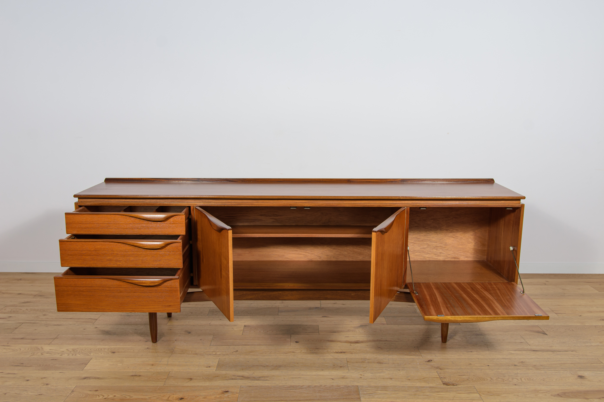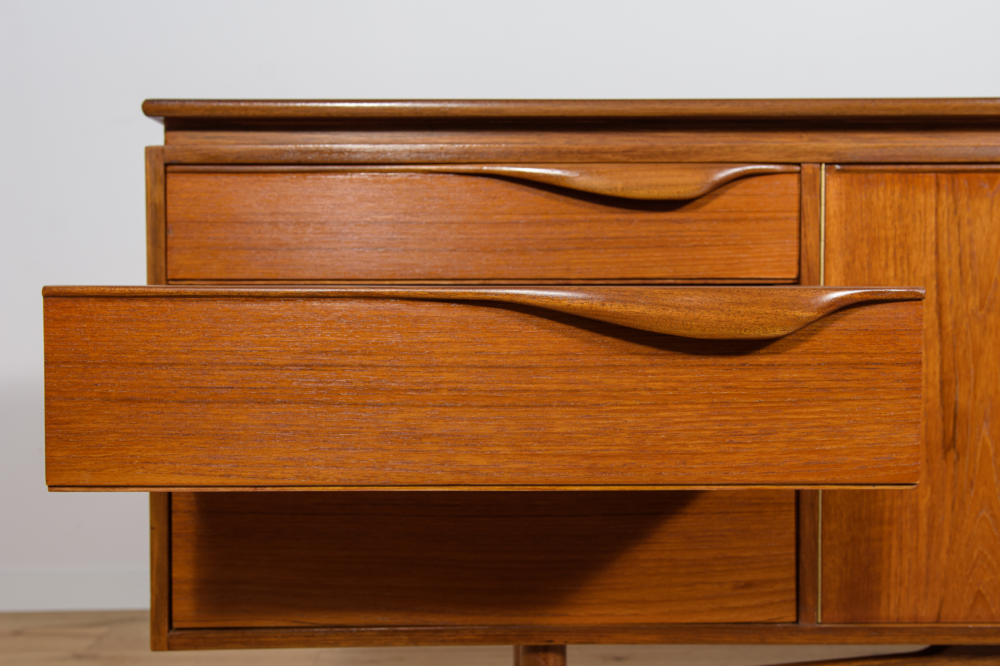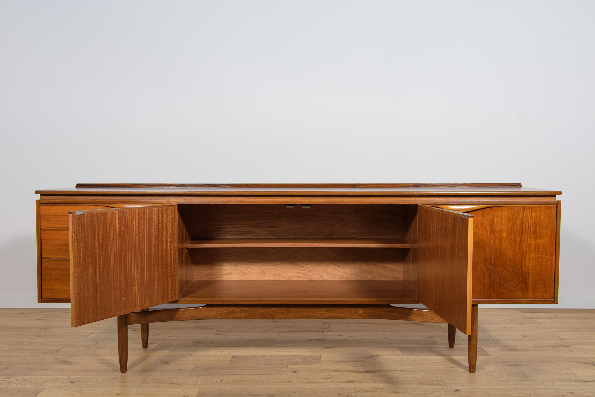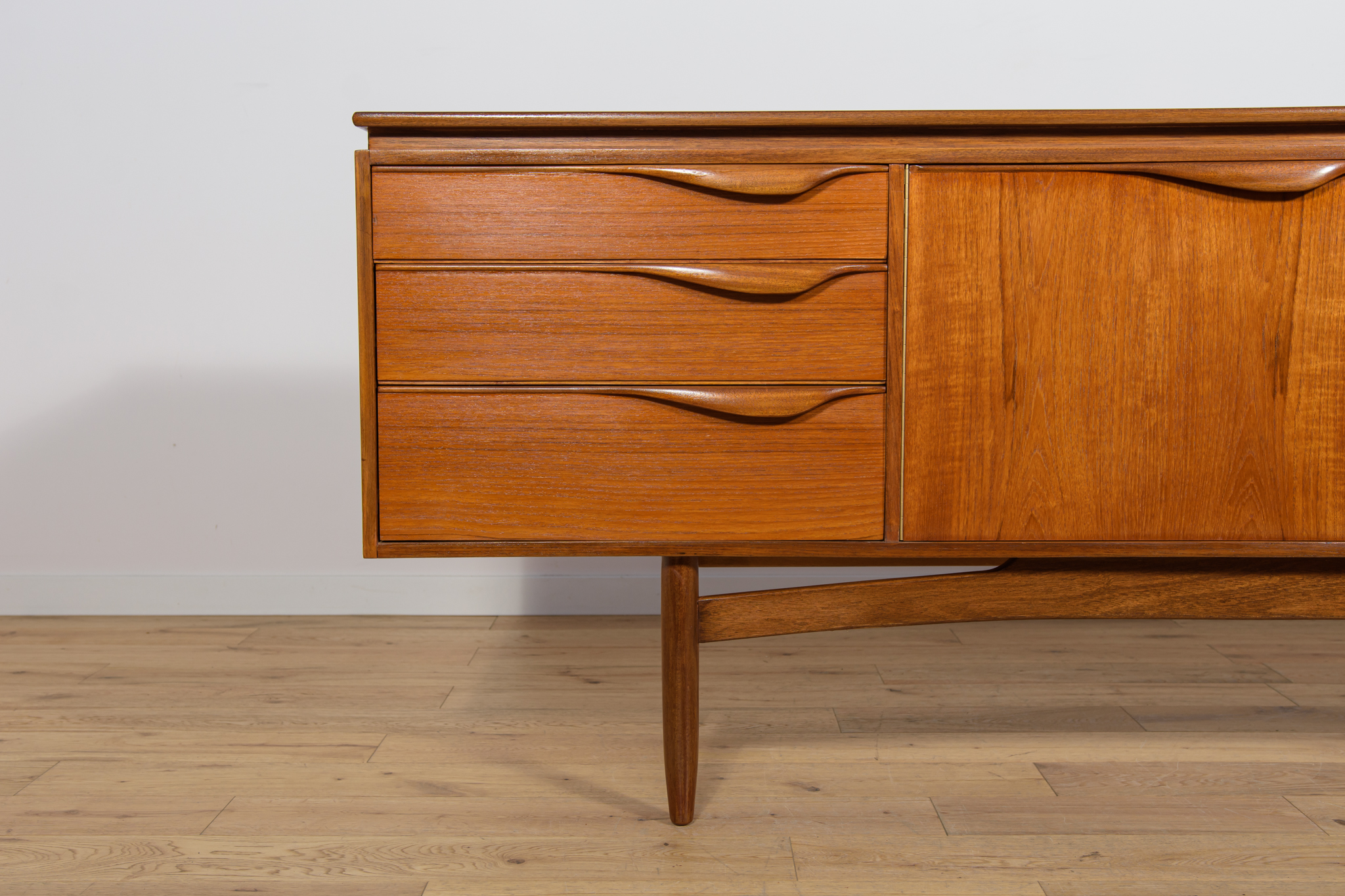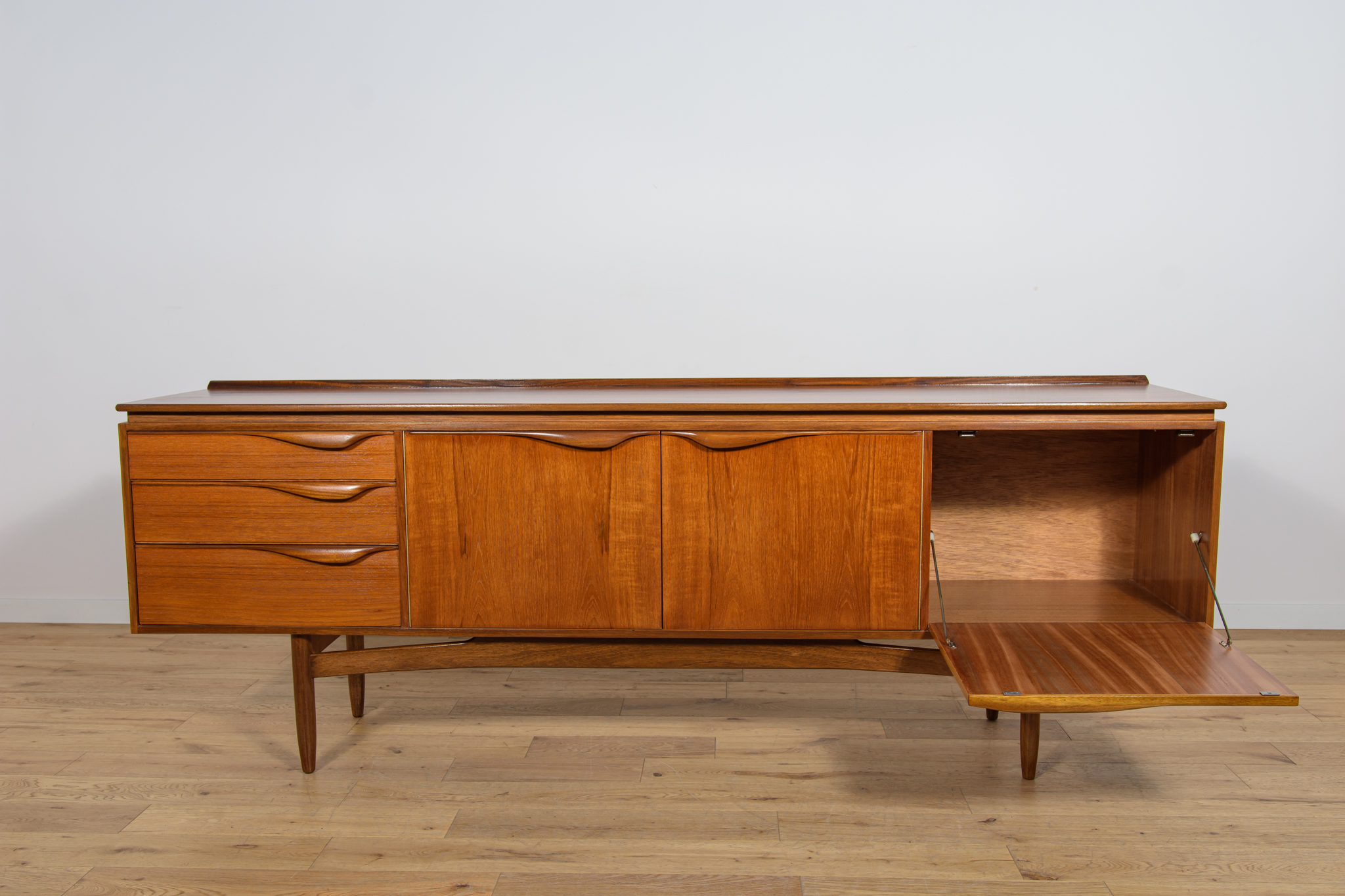 This sideboard was manufactured by William Laurence of Nottingham in the UK in the 1960s. It features contoured handles and a connecting beam, giving it a unique character. The sideboard features three drawers, a two-door cabinet, and a bar. The entire piece has undergone a comprehensive carpentry renovation. The teak wood has been cleared of its old coating and finished with high-quality Danish oil. The sideboard is signed.