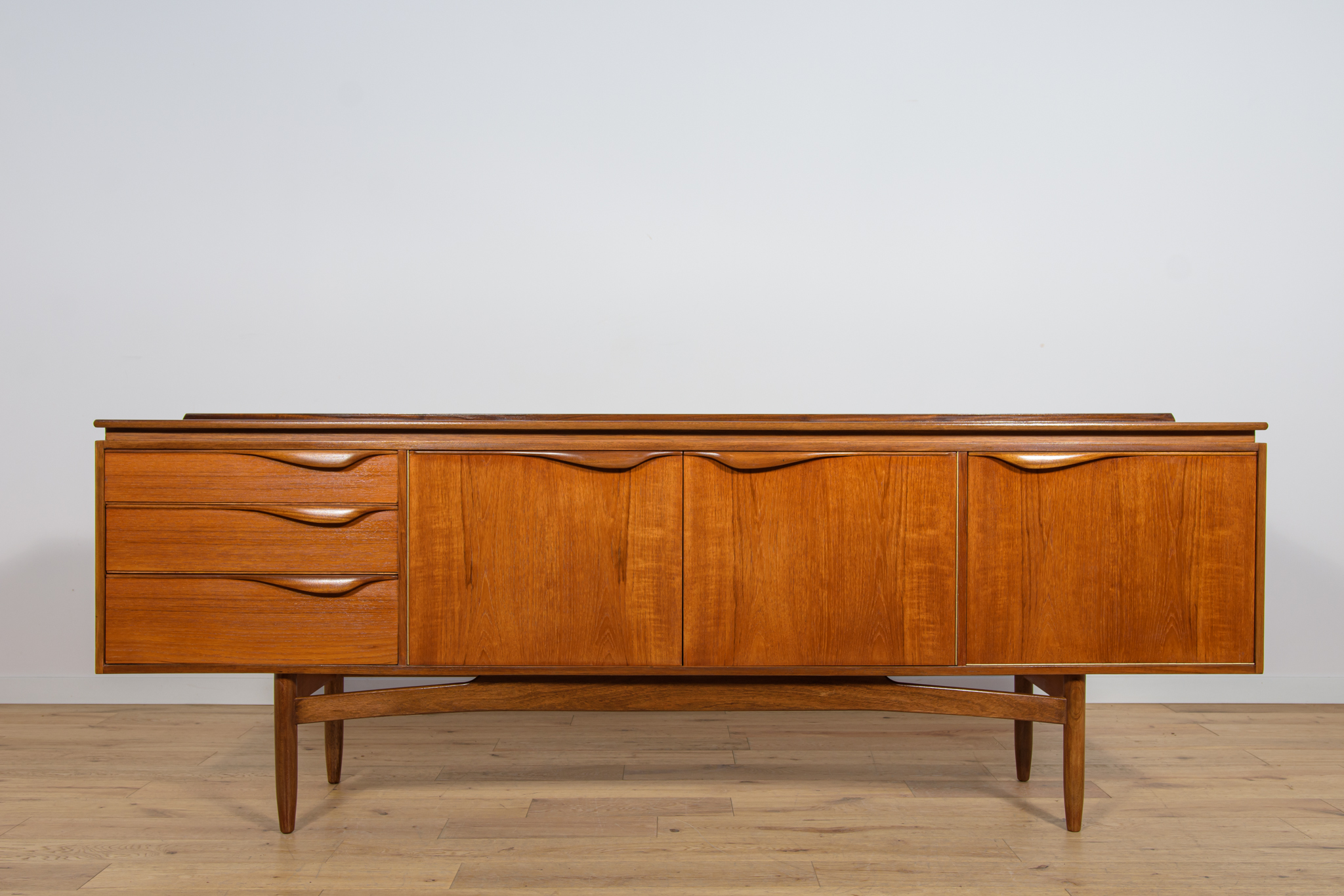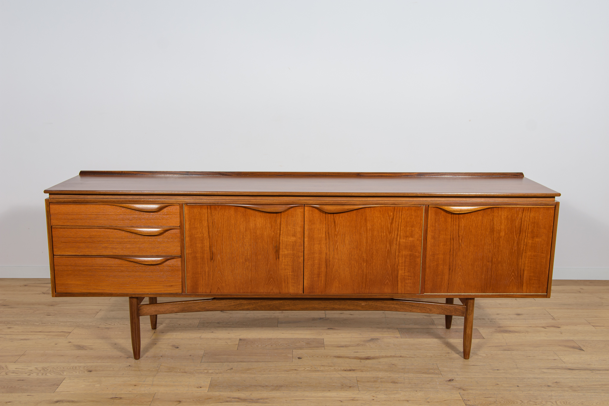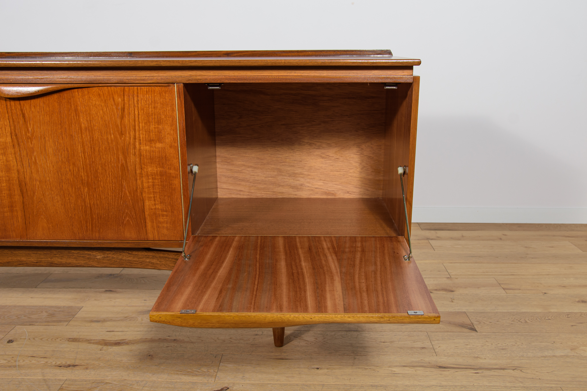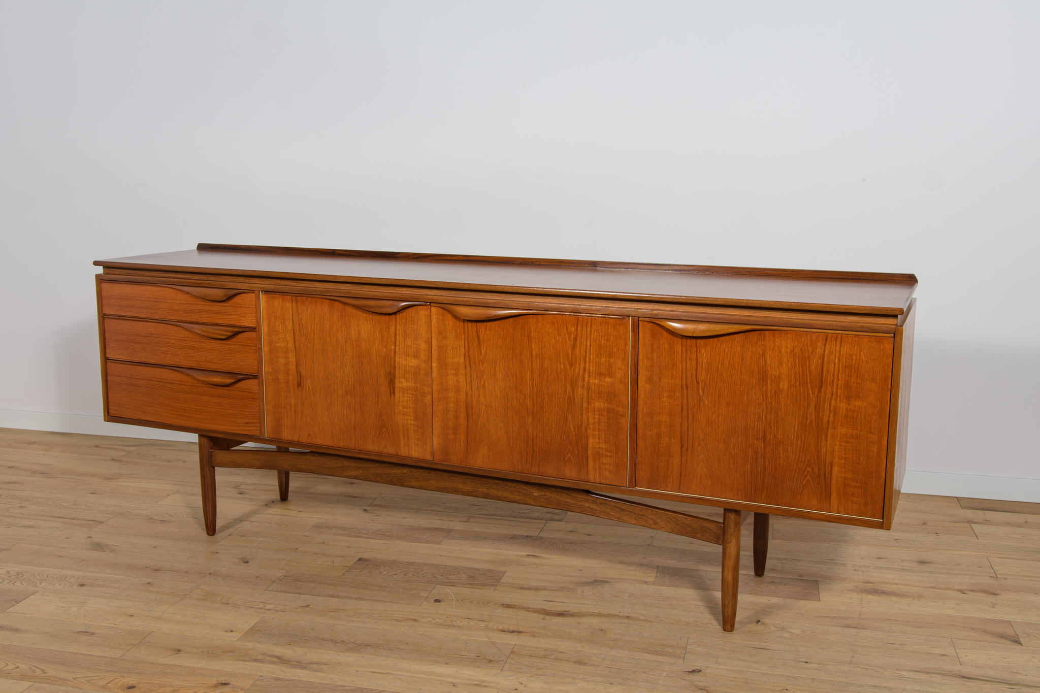 This sideboard was manufactured by William Laurence of Nottingham in the UK in the 1960s. It features contoured handles and a connecting beam, giving it a unique character. The sideboard features three drawers, a two-door cabinet, and a bar. The entire piece has undergone a comprehensive carpentry renovation. The teak wood has been cleared of its old coating and finished with high-quality Danish oil. The sideboard is signed.