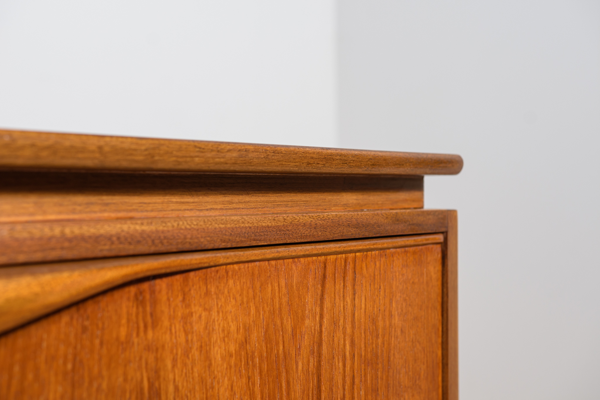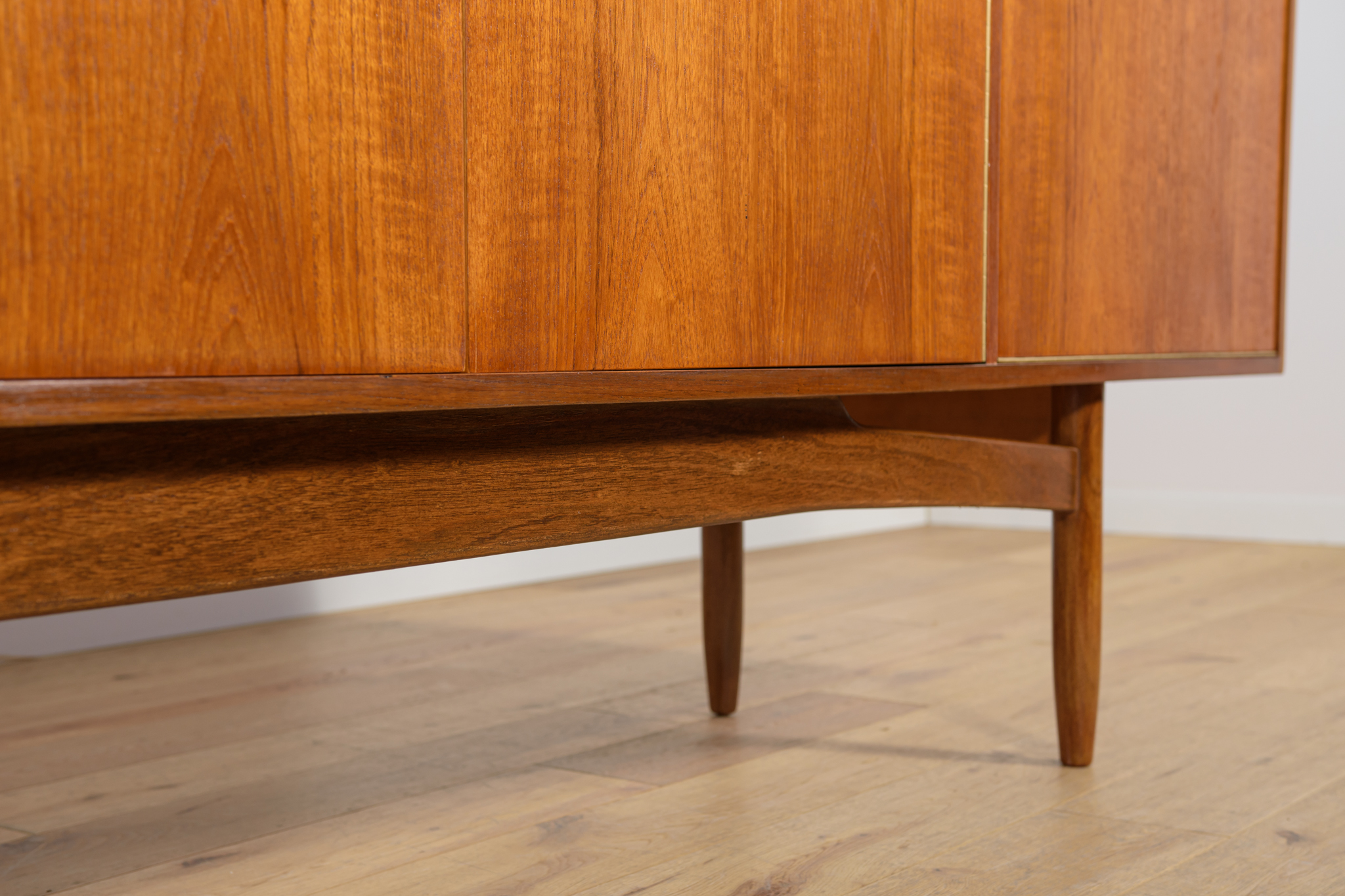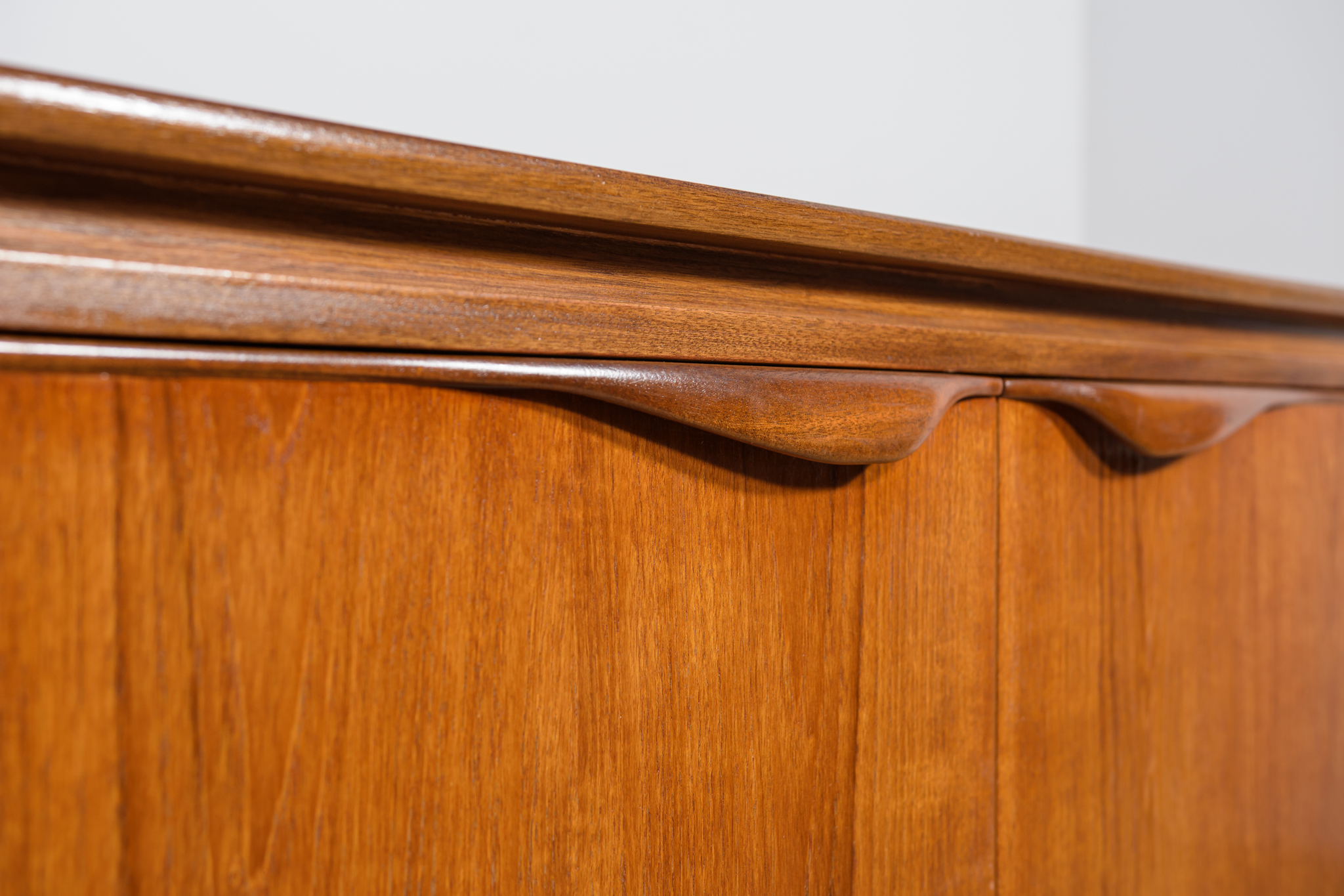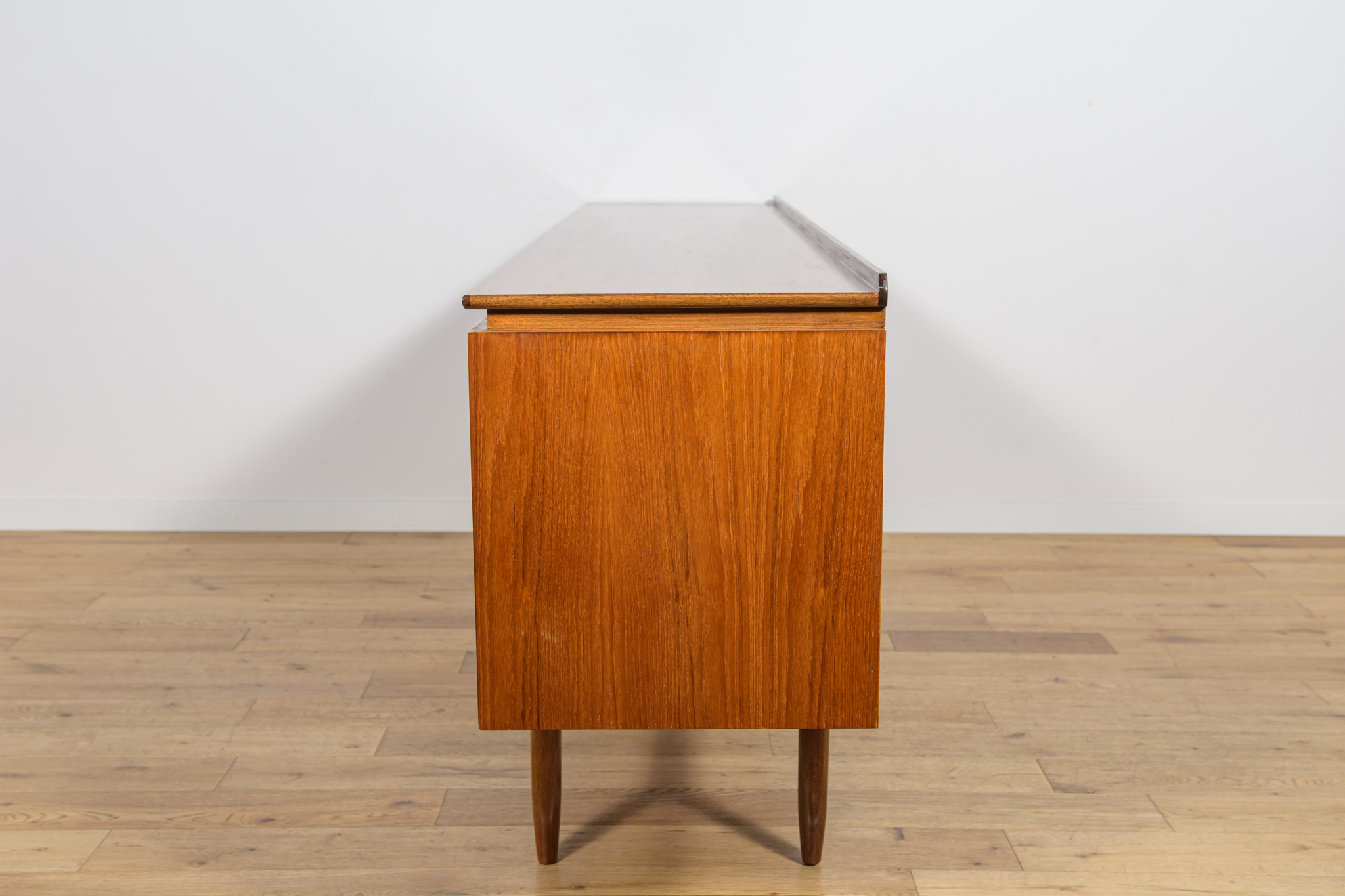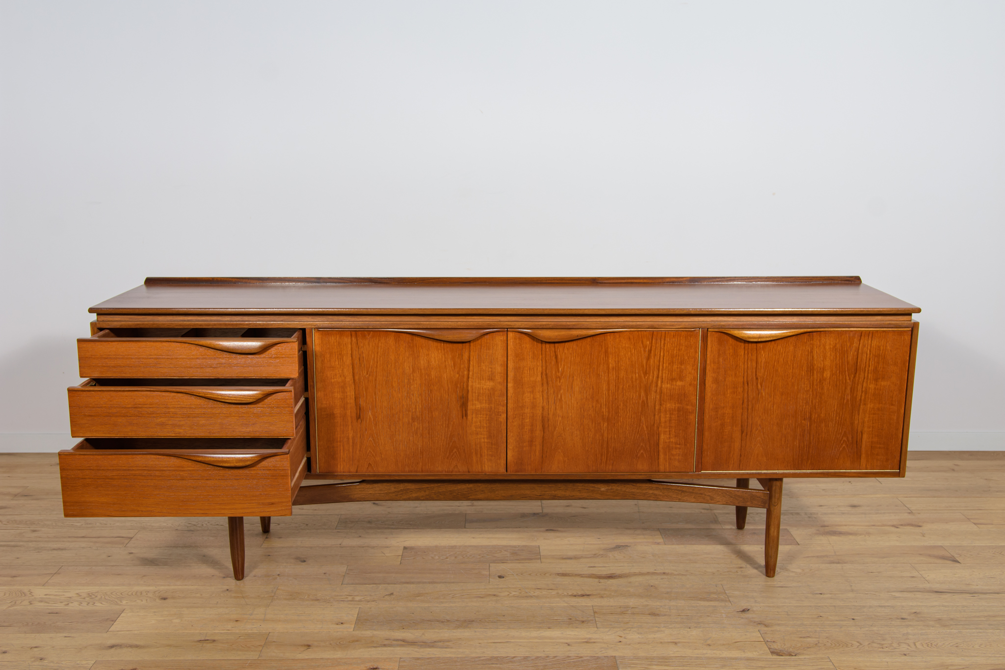 This sideboard was manufactured by William Laurence of Nottingham in the UK in the 1960s. It features contoured handles and a connecting beam, giving it a unique character. The sideboard features three drawers, a two-door cabinet, and a bar. The entire piece has undergone a comprehensive carpentry renovation. The teak wood has been cleared of its old coating and finished with high-quality Danish oil. The sideboard is signed.