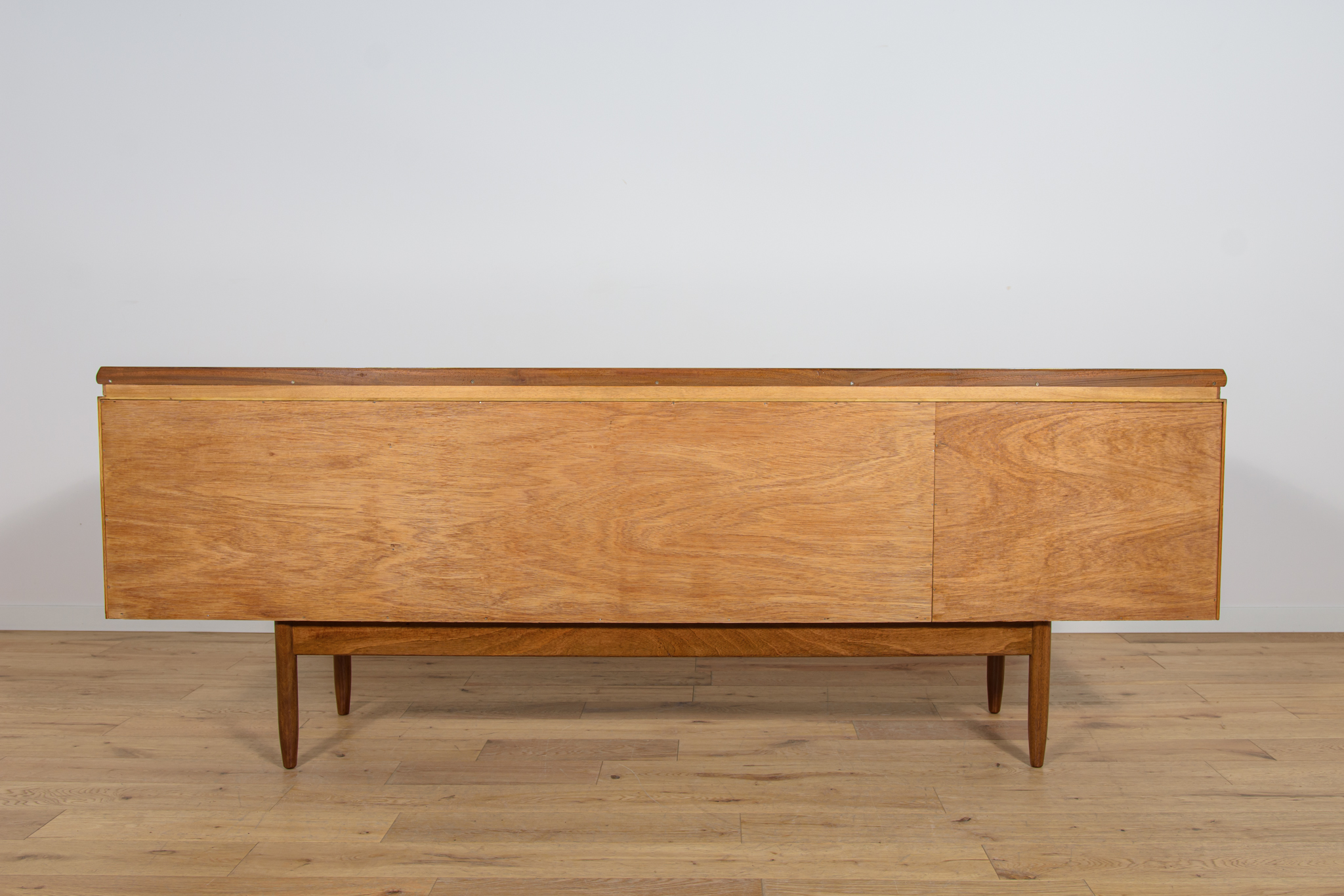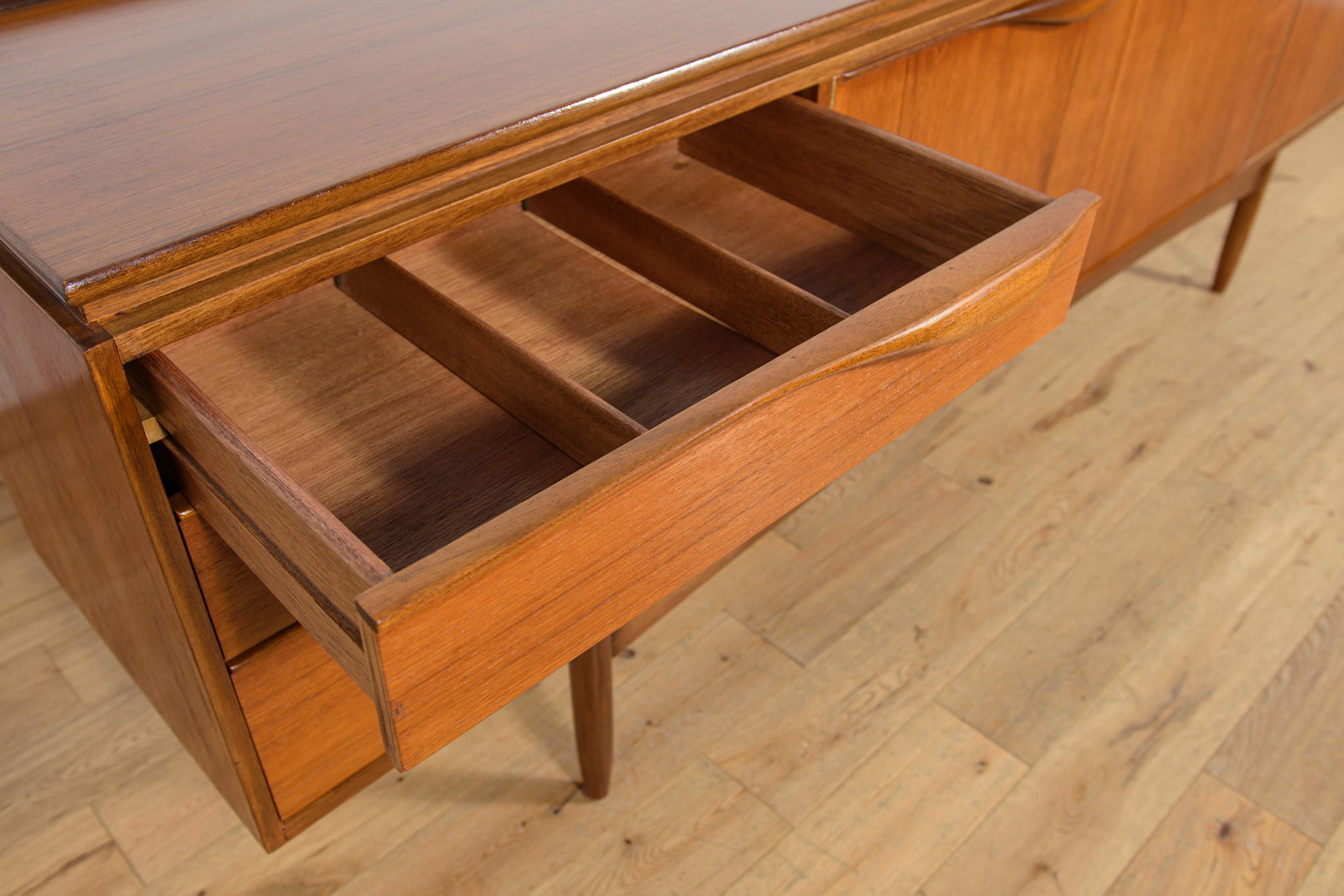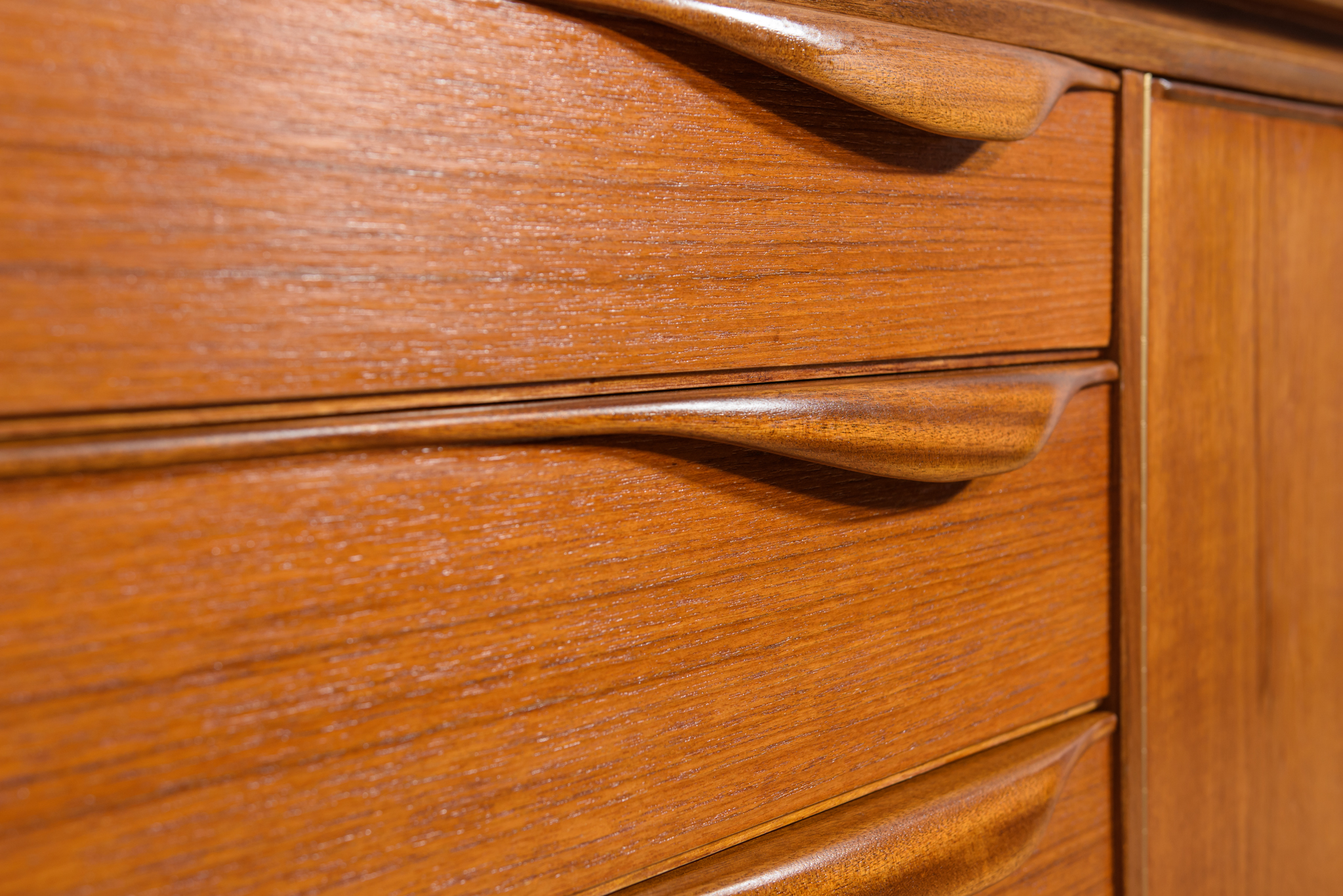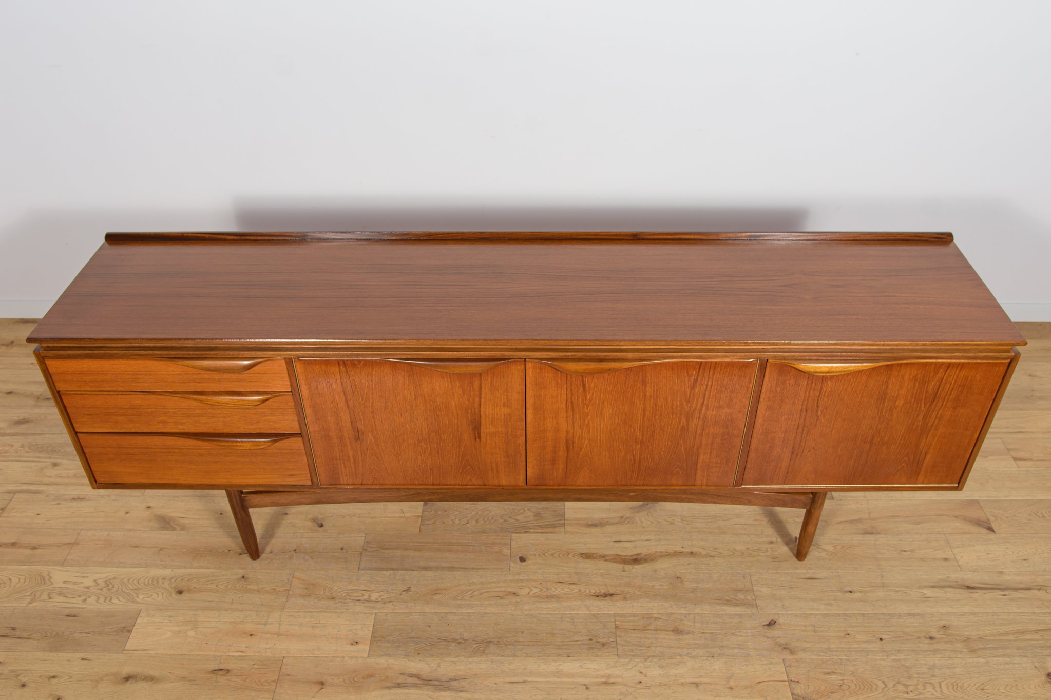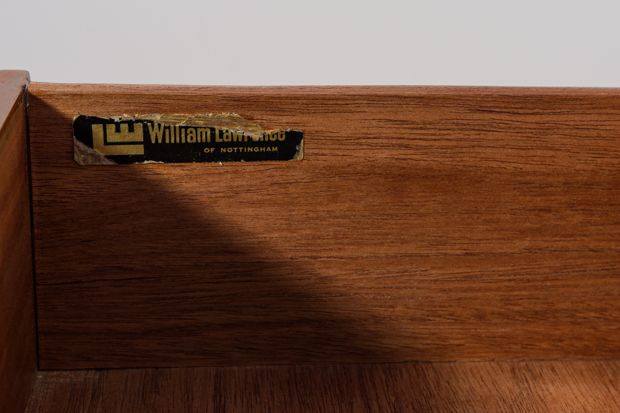 This sideboard was manufactured by William Laurence of Nottingham in the UK in the 1960s. It features contoured handles and a connecting beam, giving it a unique character. The sideboard features three drawers, a two-door cabinet, and a bar. The entire piece has undergone a comprehensive carpentry renovation. The teak wood has been cleared of its old coating and finished with high-quality Danish oil. The sideboard is signed.