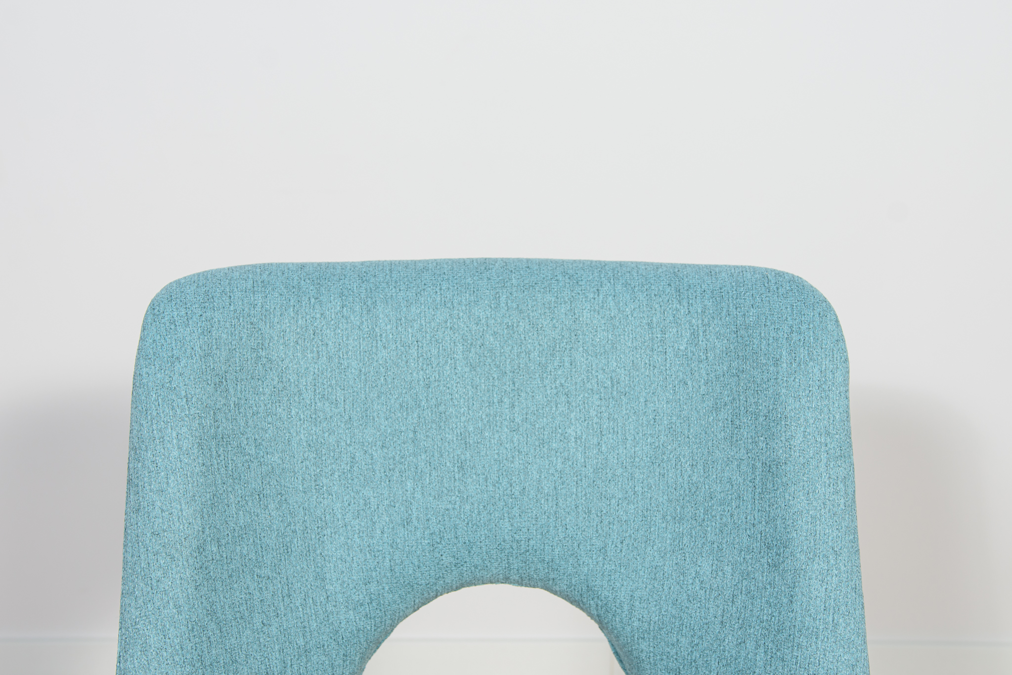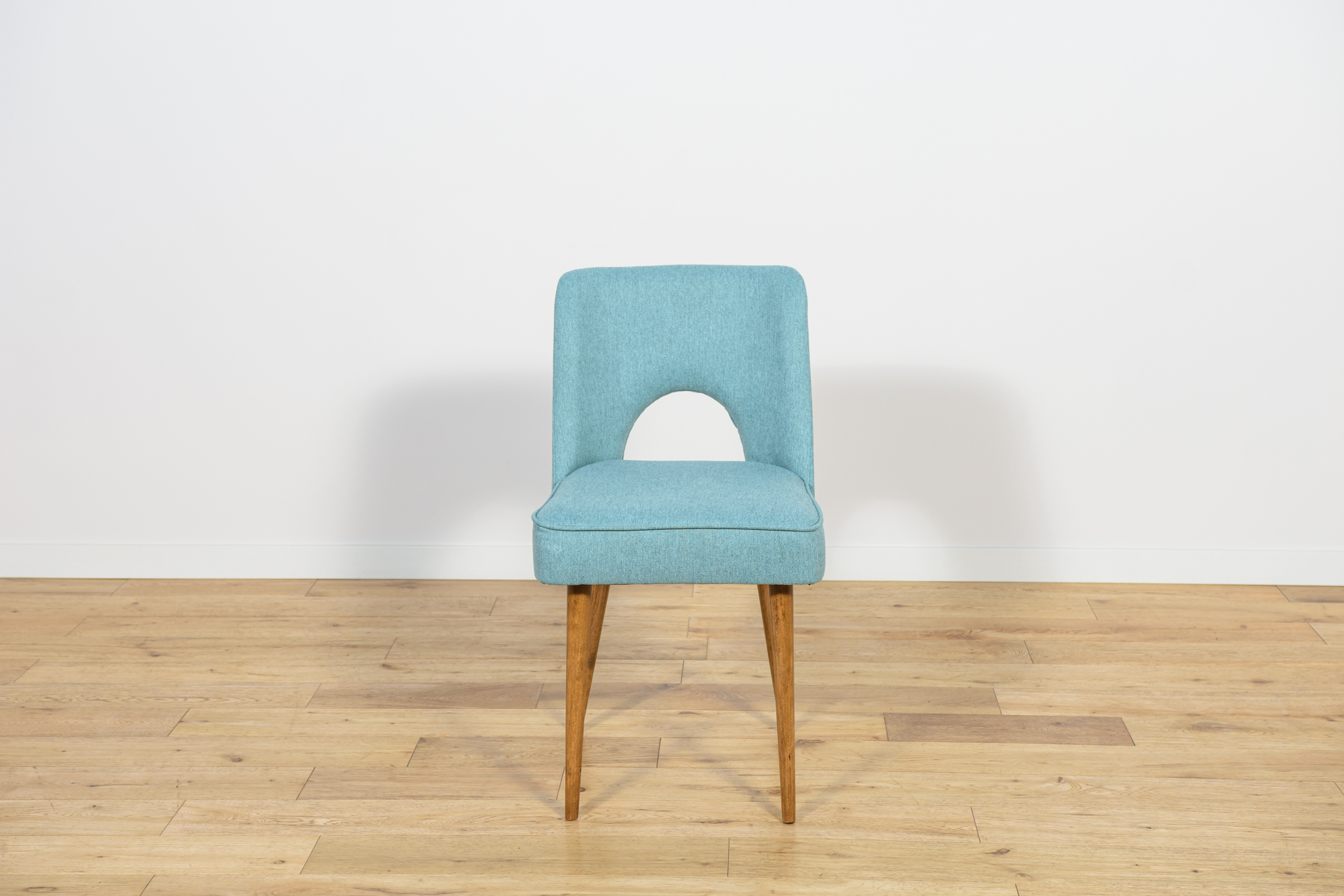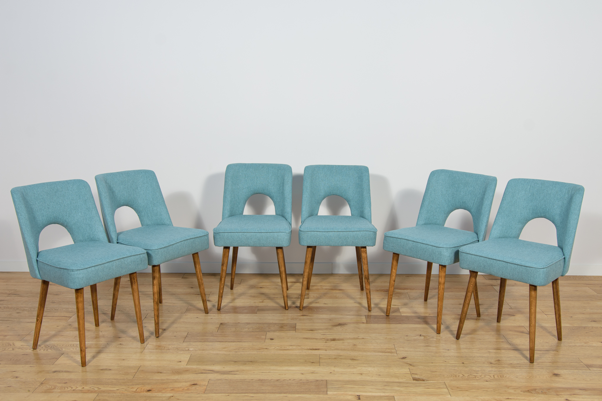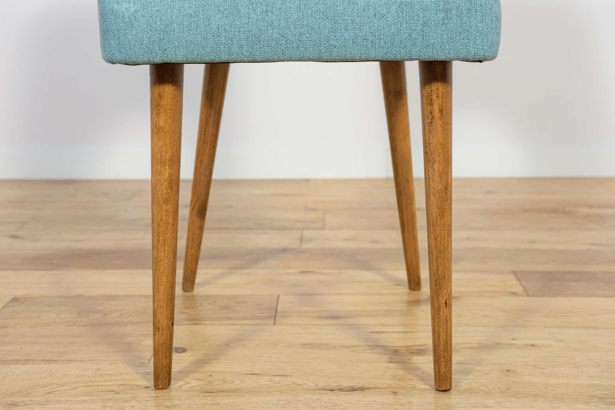 A set of six chairs from a Polish furniture factory in Bydgoszcz, with a unique design from the past. A whole set was professionally renovated by the Carpenter’s Upholstery Workshop. The wood has been cleaned of the old surface. The legs were painted with a walnut colored mordant and polished with a lacquer. The foams have been replaced. The chairs are covered with a high quality light blue material.