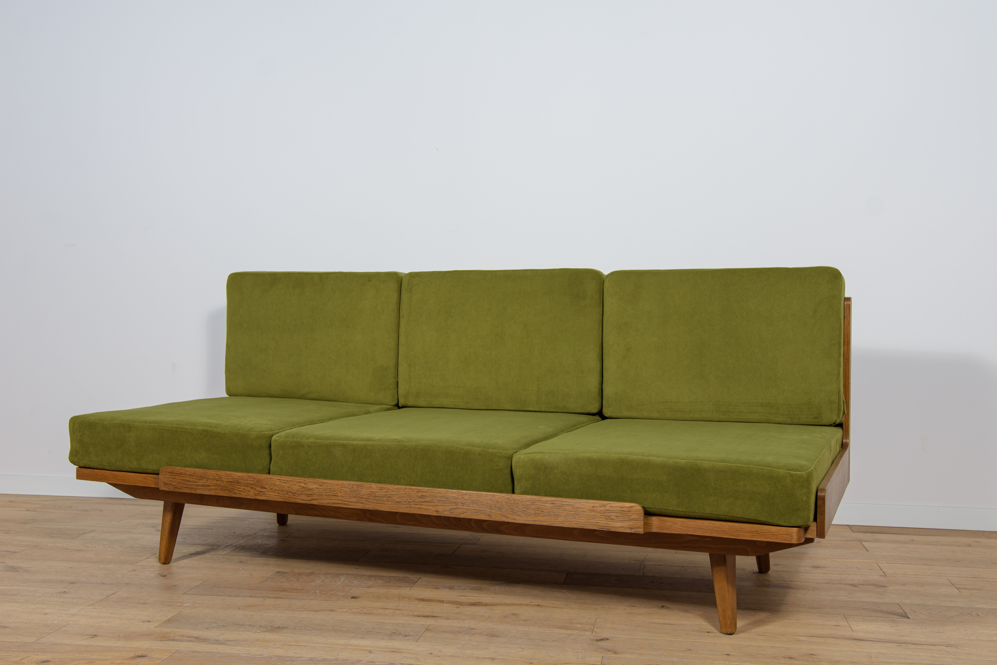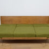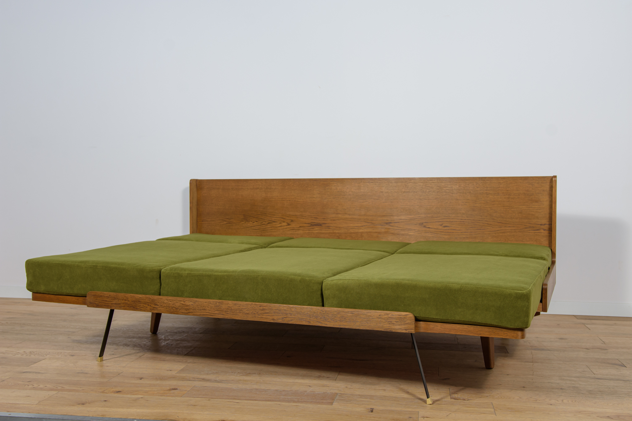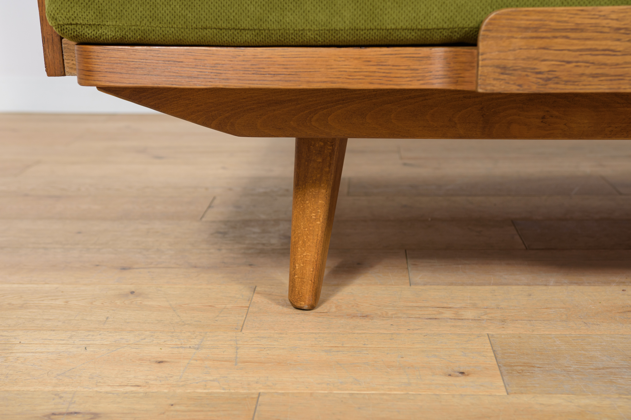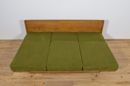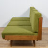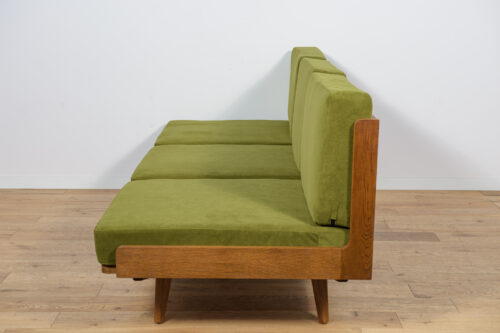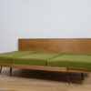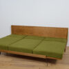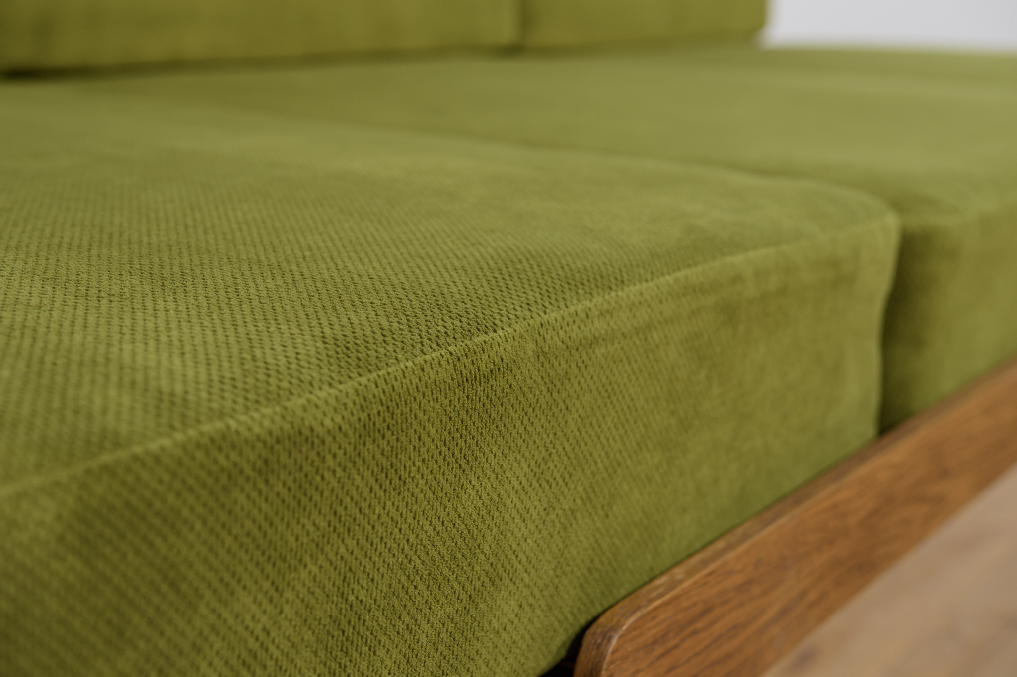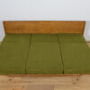 The wooden structure made of oak veneer has been cleaned from the old surface and finished with oak wax. Interior changed and covered with a high quality green fabric upholstery. Depth after unfolded 133 cm.