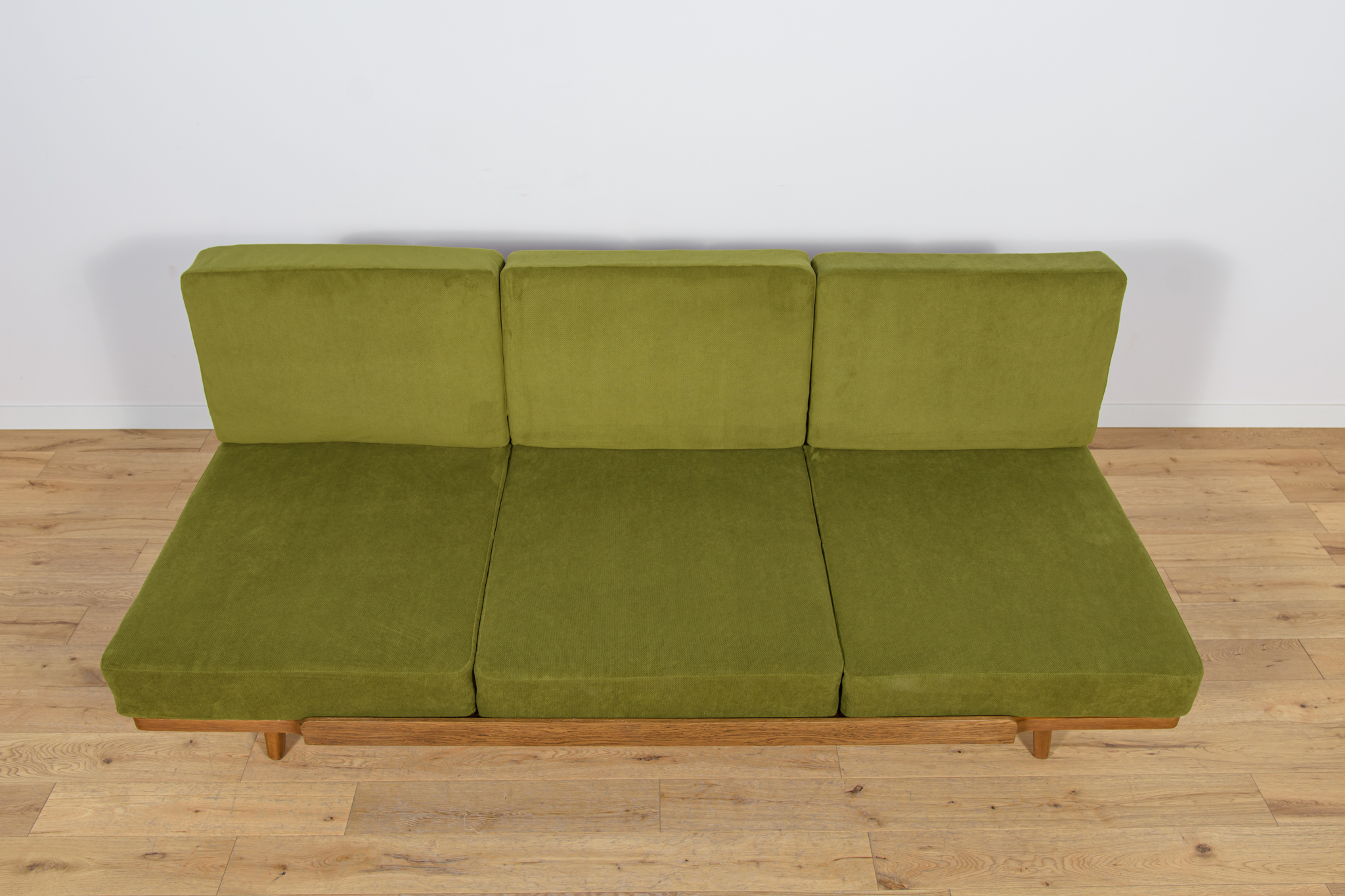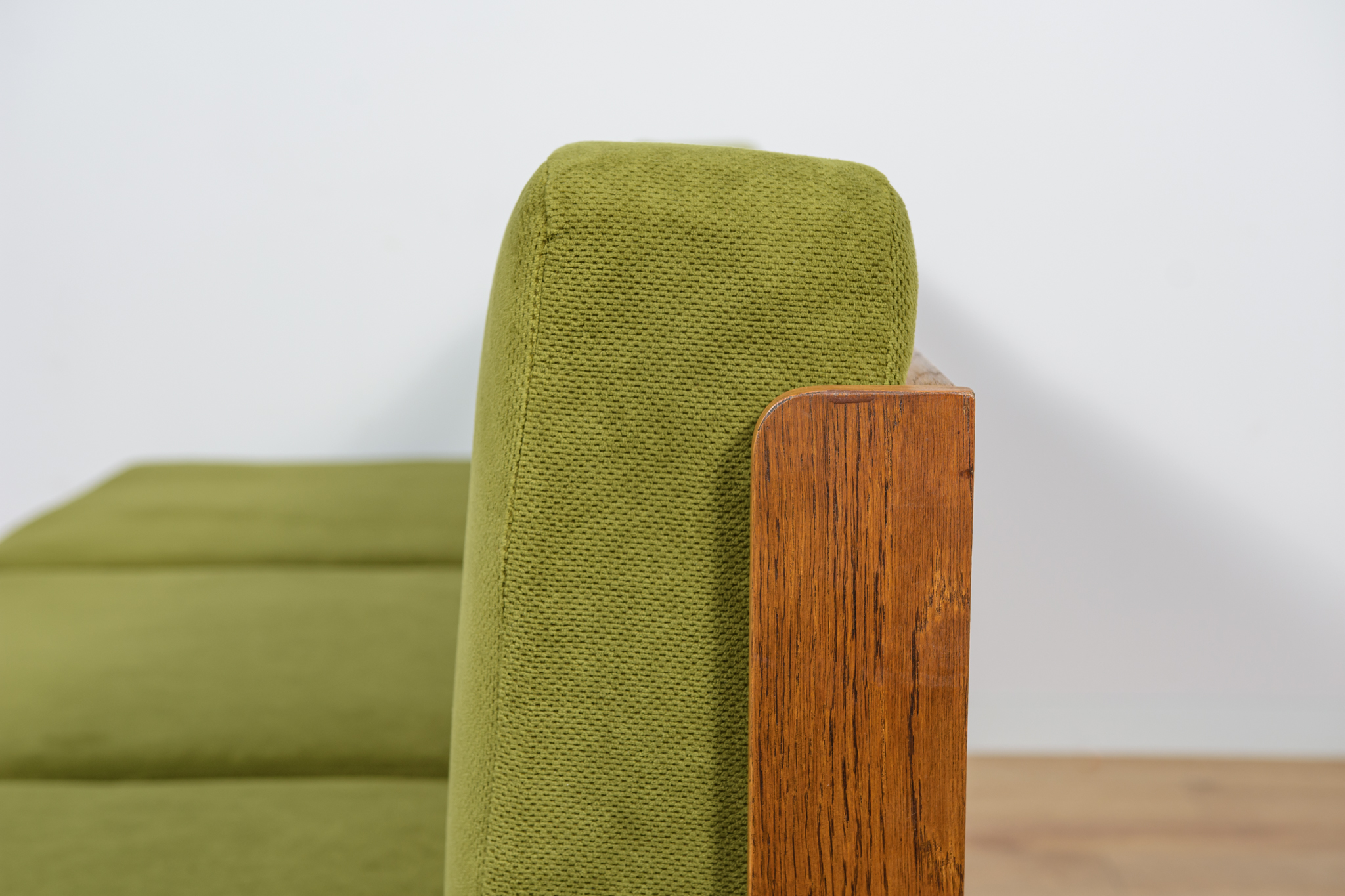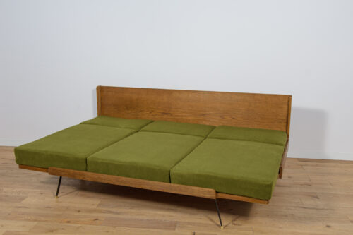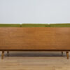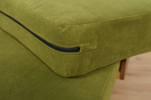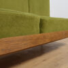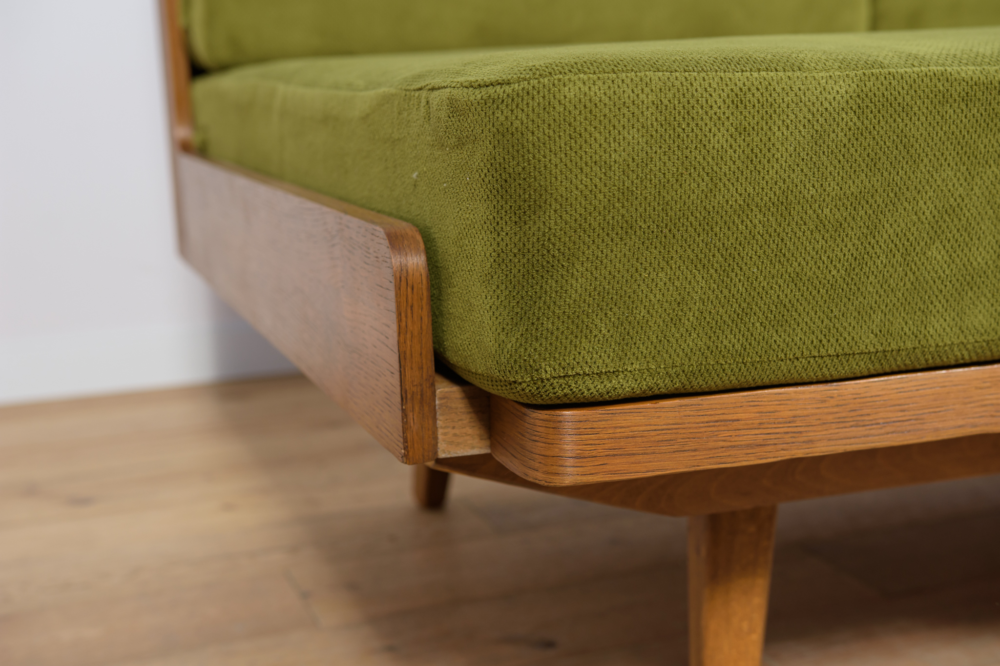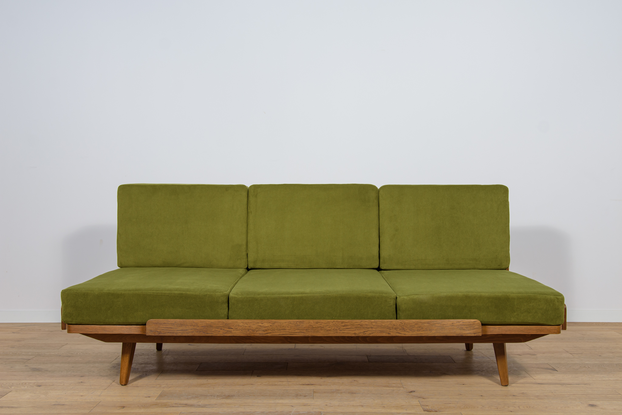 The wooden structure made of oak veneer has been cleaned from the old surface and finished with oak wax. Interior changed and covered with a high quality green fabric upholstery. Depth after unfolded 133 cm.