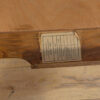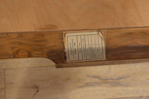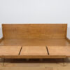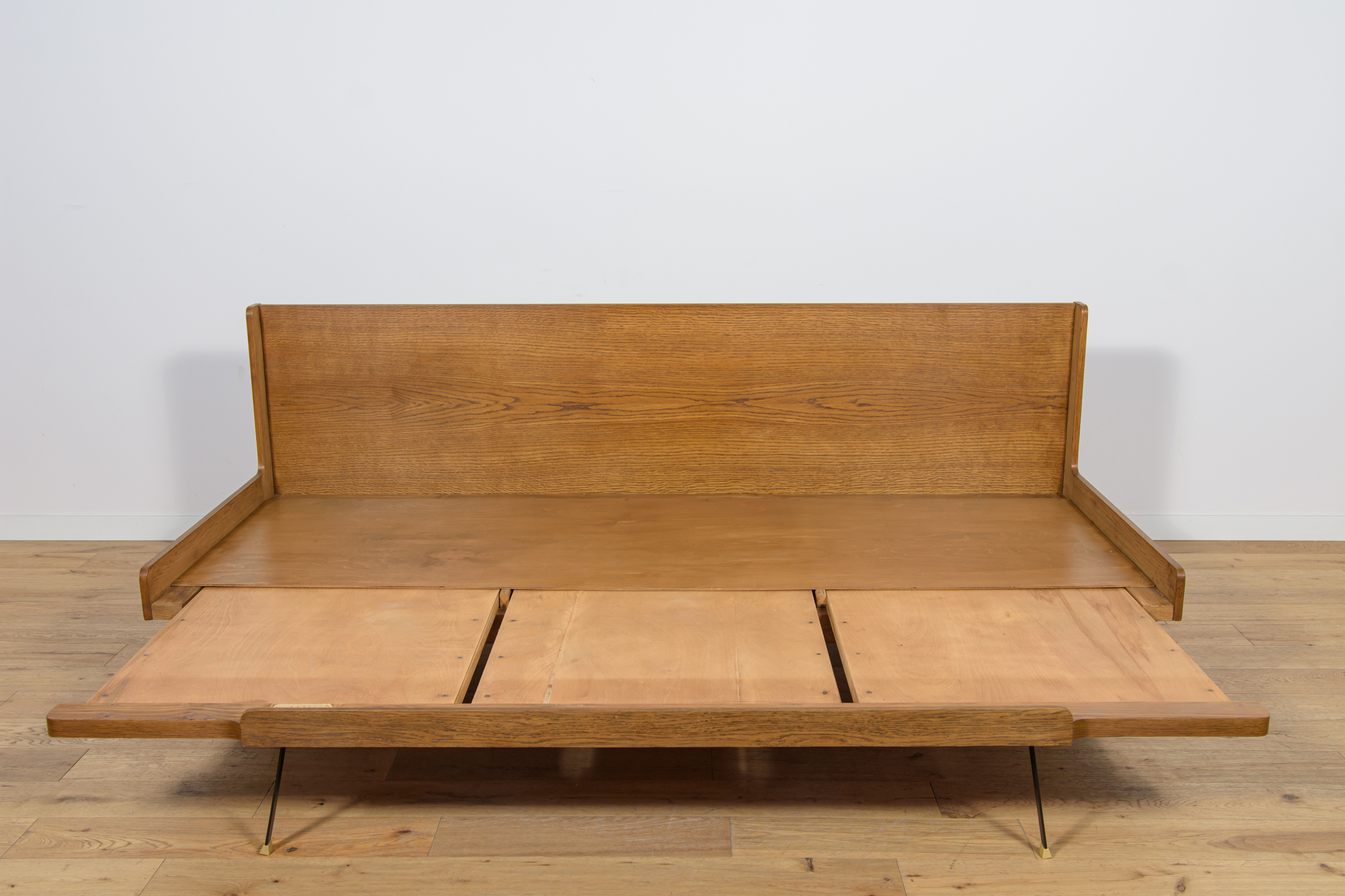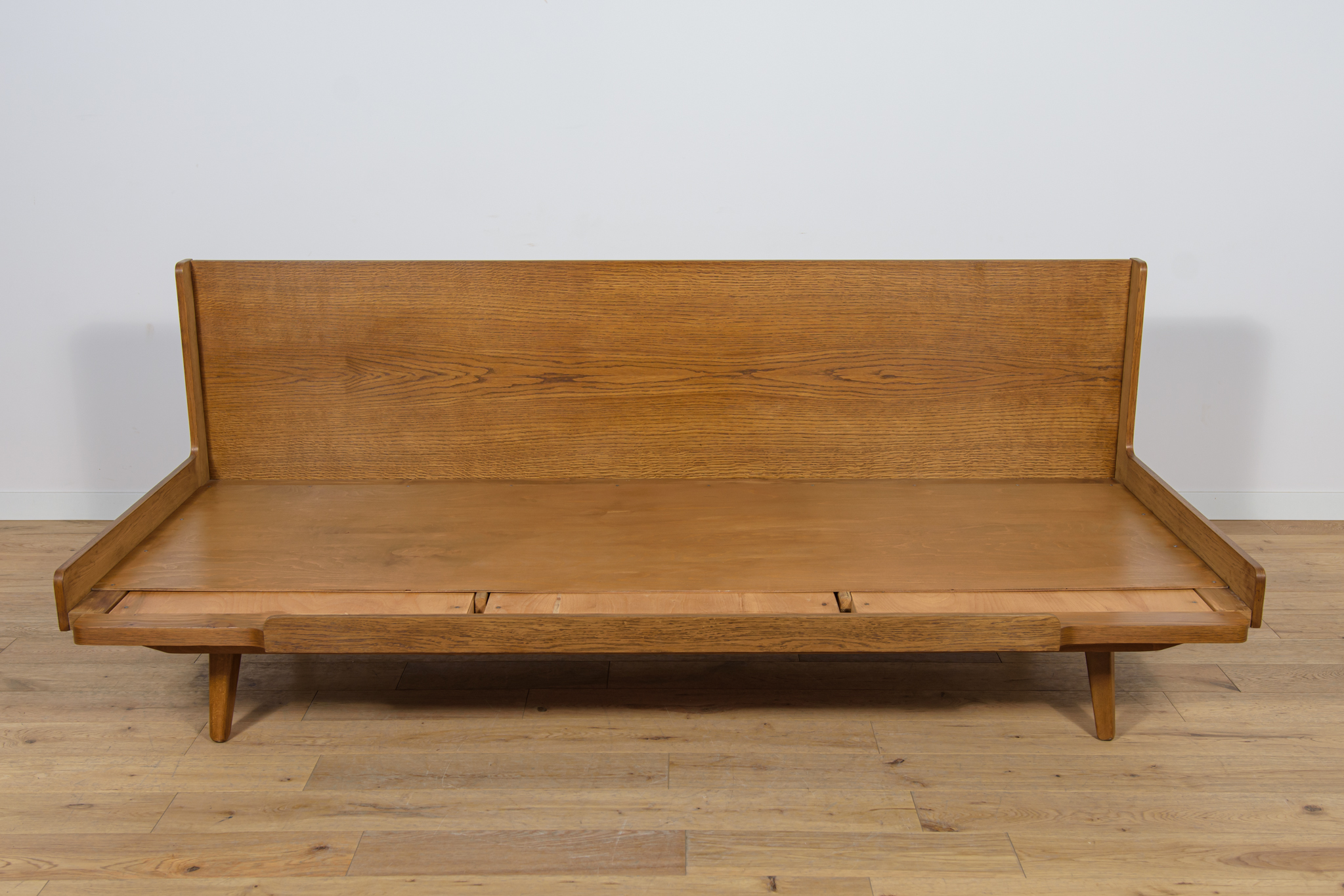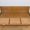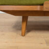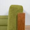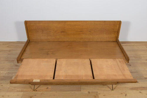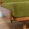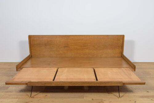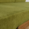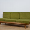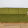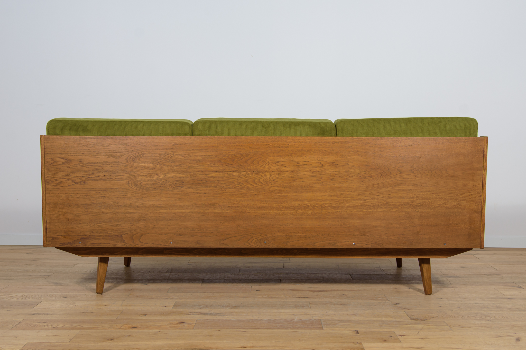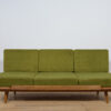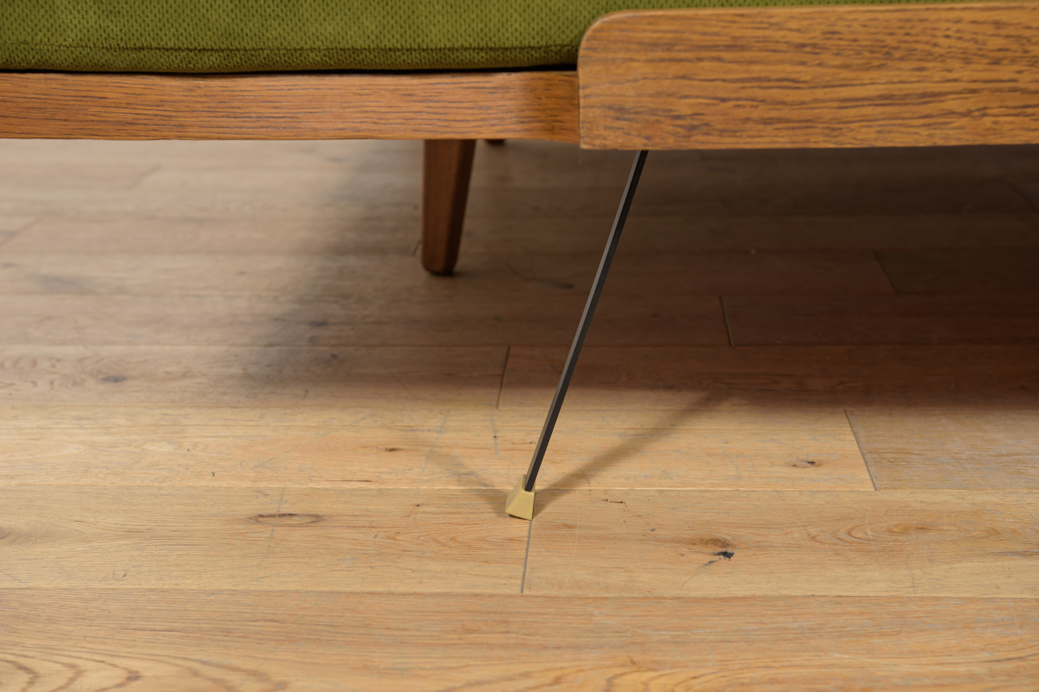 The wooden structure made of oak veneer has been cleaned from the old surface and finished with oak wax. Interior changed and covered with a high quality green fabric upholstery. Depth after unfolded 133 cm.