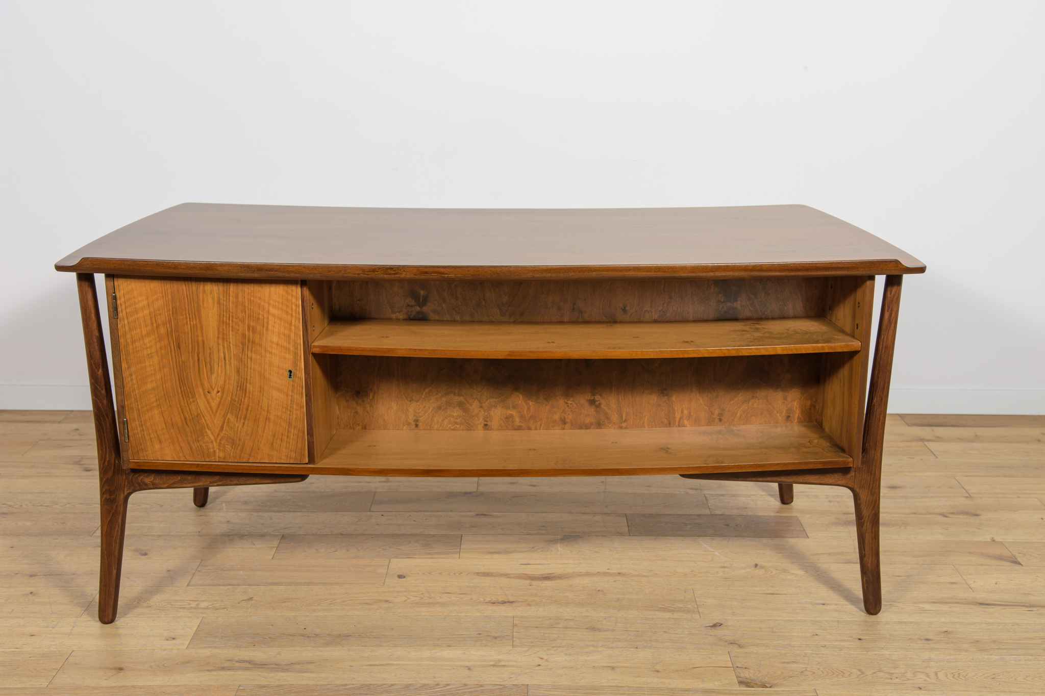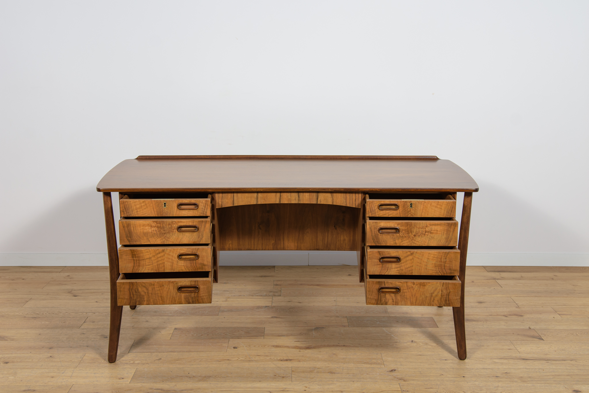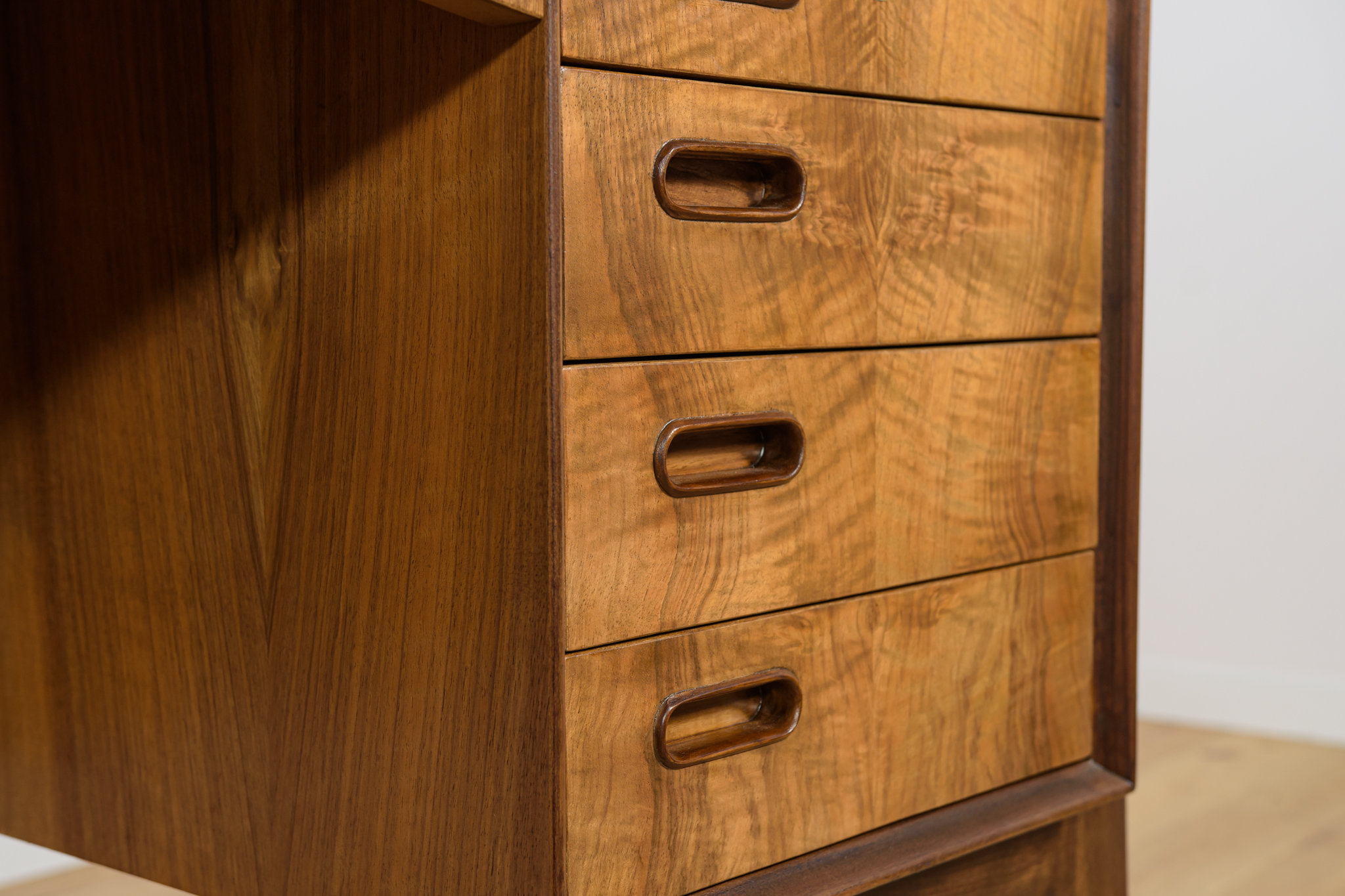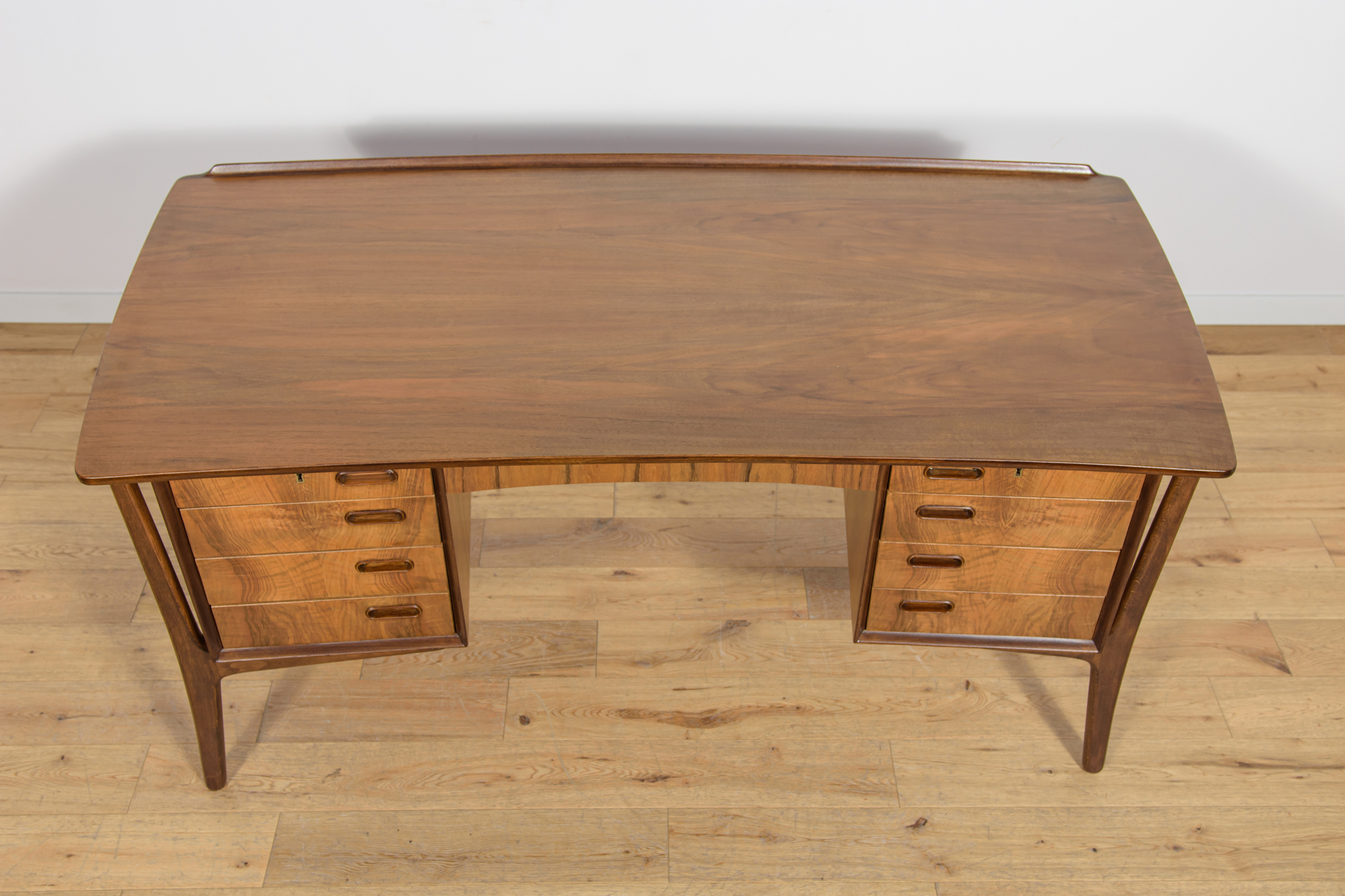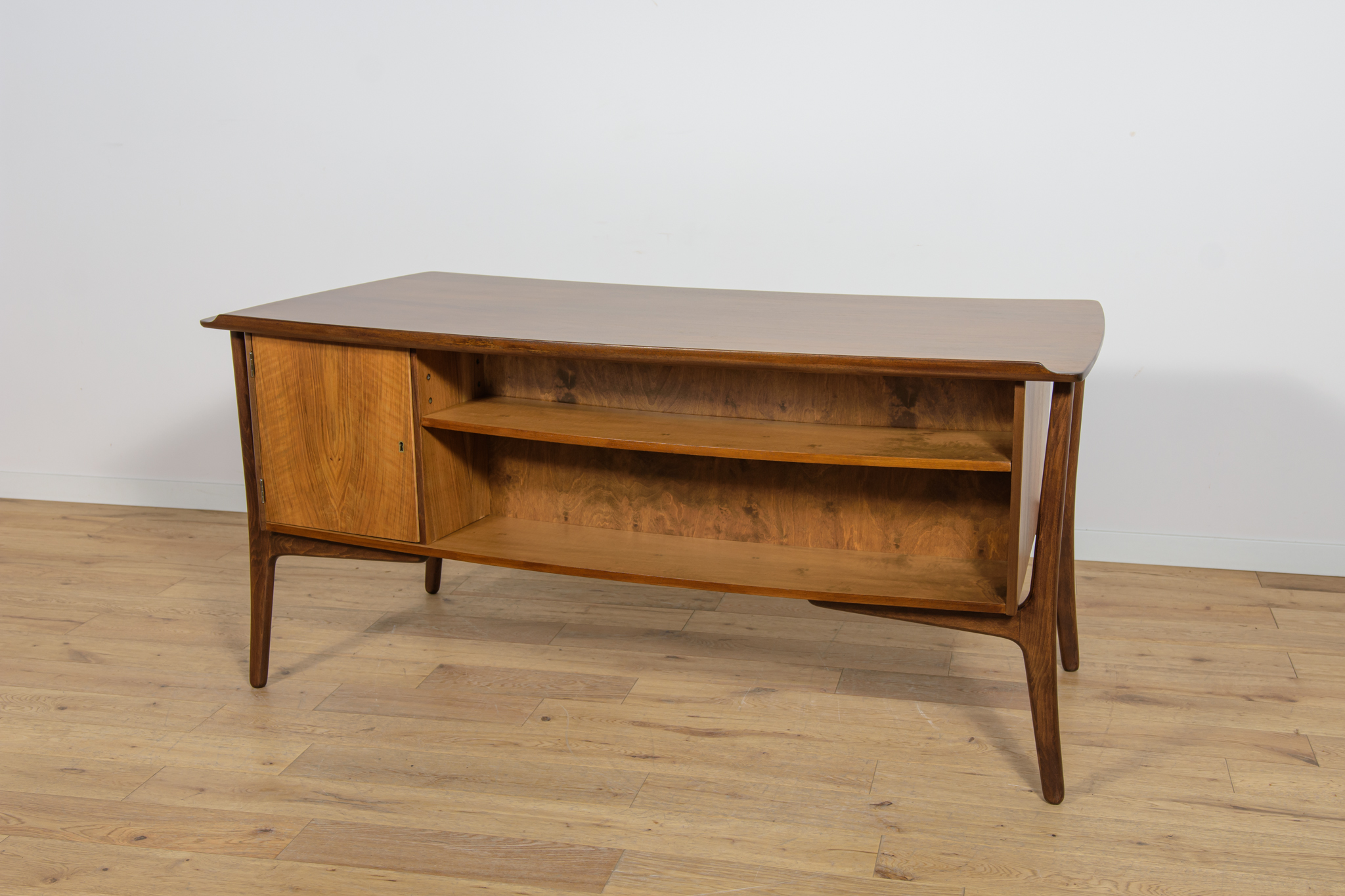 Biurko zaprojektowane przez Svend Aage Madsen dla duńskiej manufaktury H.P. Hansen w latach 60-tych. Biurko o nietuzinkowym designie, wykonane z dbałością o każdy szczegół. Posiada osiem szuflad, rozmieszczonych po cztery z każdej strony. Od frontu znajduje się półka na książki i zamykana na klucz szafka. Biurko jest po profesjonalnej kompleksowej renowacji. Wykonane jest z drewna orzechowego, zostało oczyszczone ze starej powłoki, barwione bejcą w kolorze dąb, wykończone mocnym półmatowym lakierem. W biurku znajduje się jeden klucz.