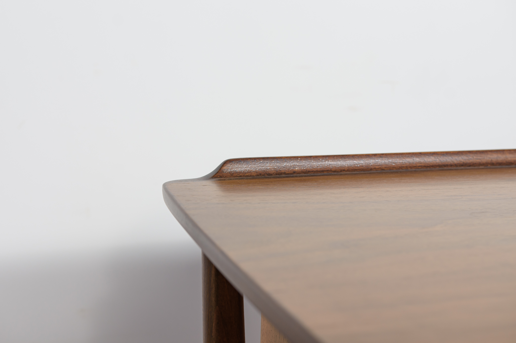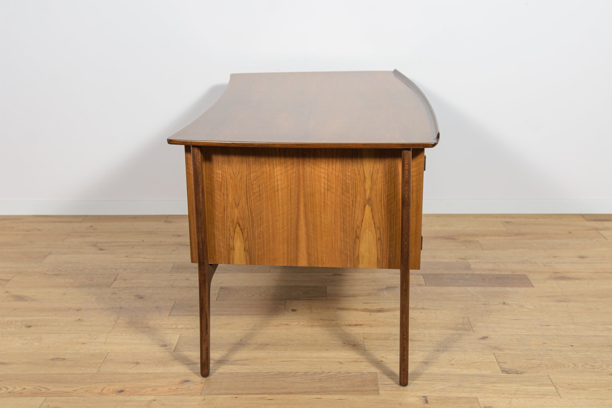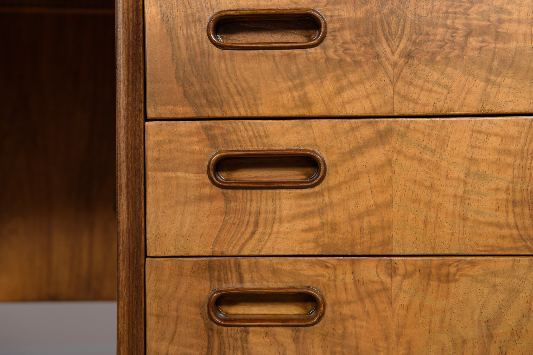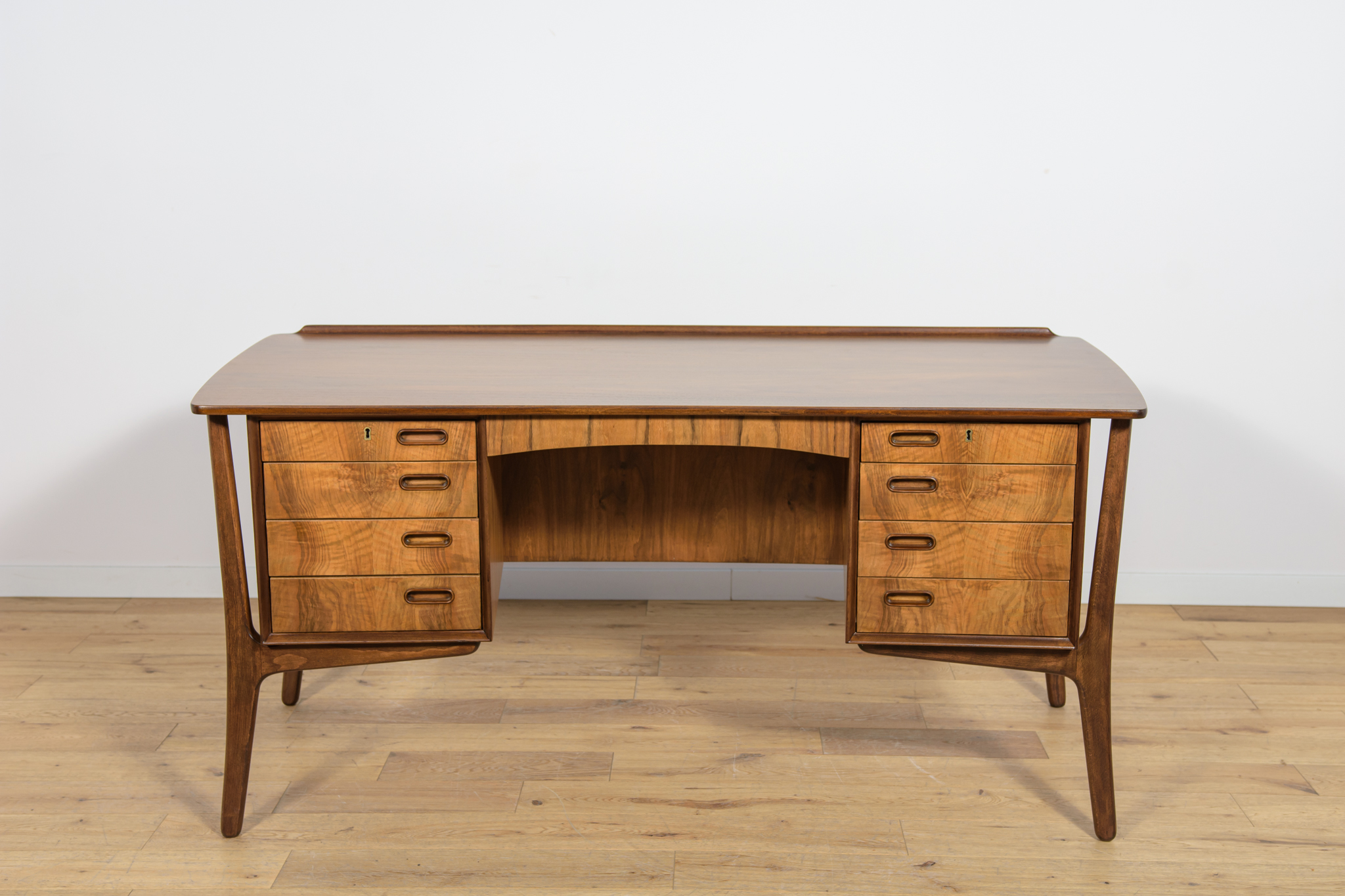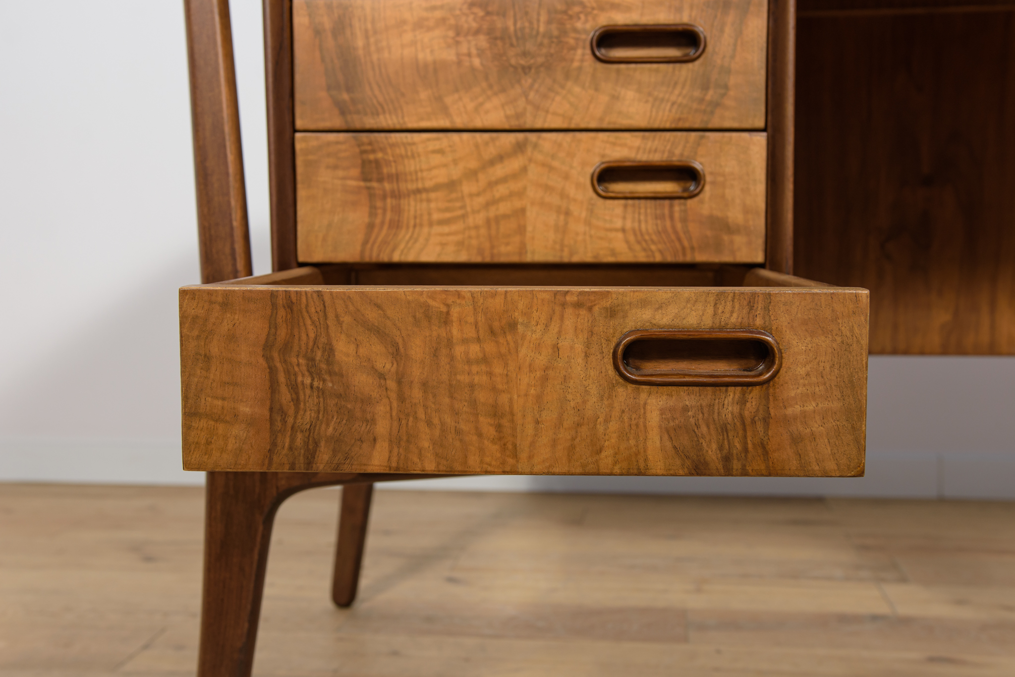 Biurko zaprojektowane przez Svend Aage Madsen dla duńskiej manufaktury H.P. Hansen w latach 60-tych. Biurko o nietuzinkowym designie, wykonane z dbałością o każdy szczegół. Posiada osiem szuflad, rozmieszczonych po cztery z każdej strony. Od frontu znajduje się półka na książki i zamykana na klucz szafka. Biurko jest po profesjonalnej kompleksowej renowacji. Wykonane jest z drewna orzechowego, zostało oczyszczone ze starej powłoki, barwione bejcą w kolorze dąb, wykończone mocnym półmatowym lakierem. W biurku znajduje się jeden klucz.