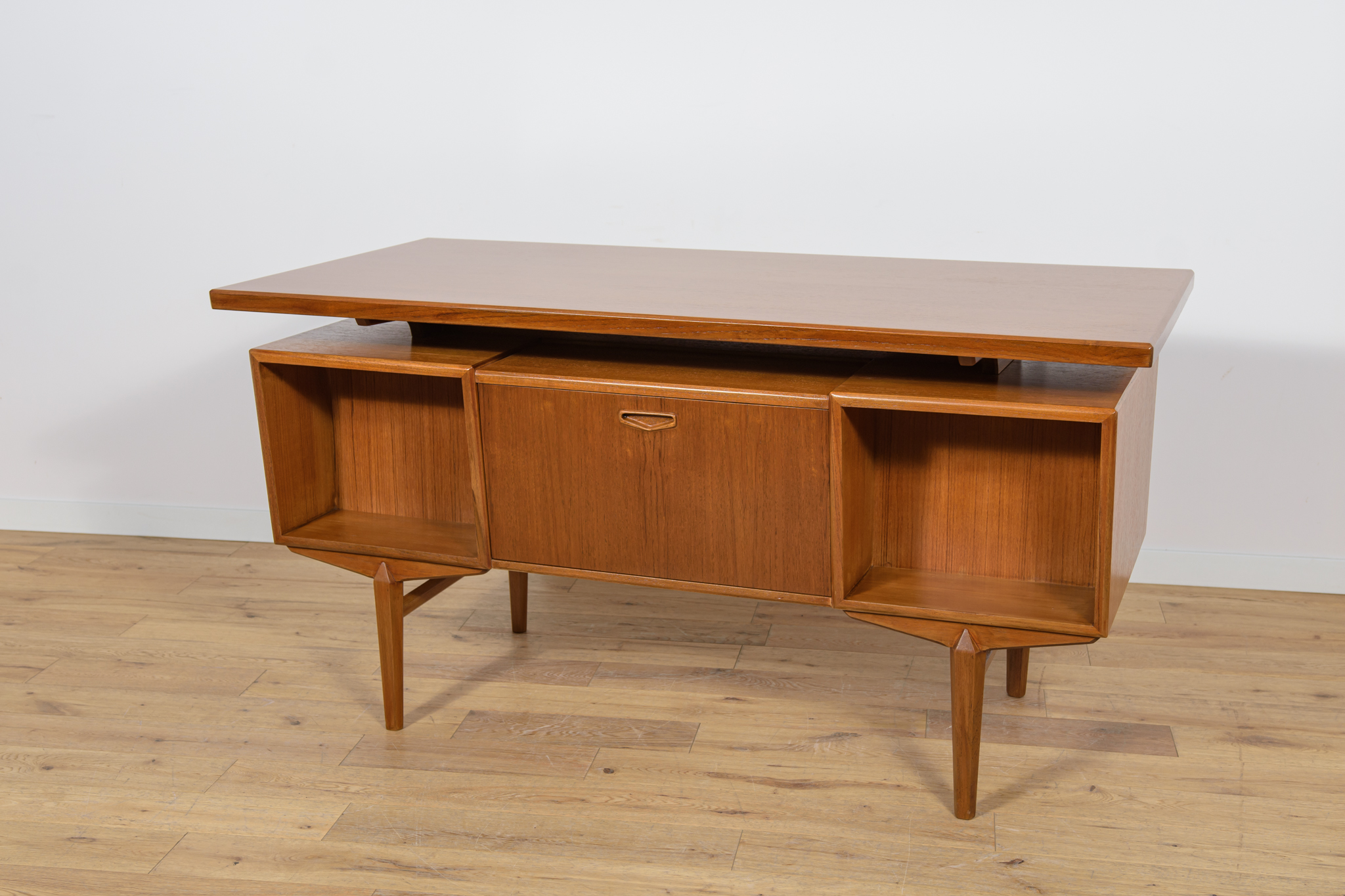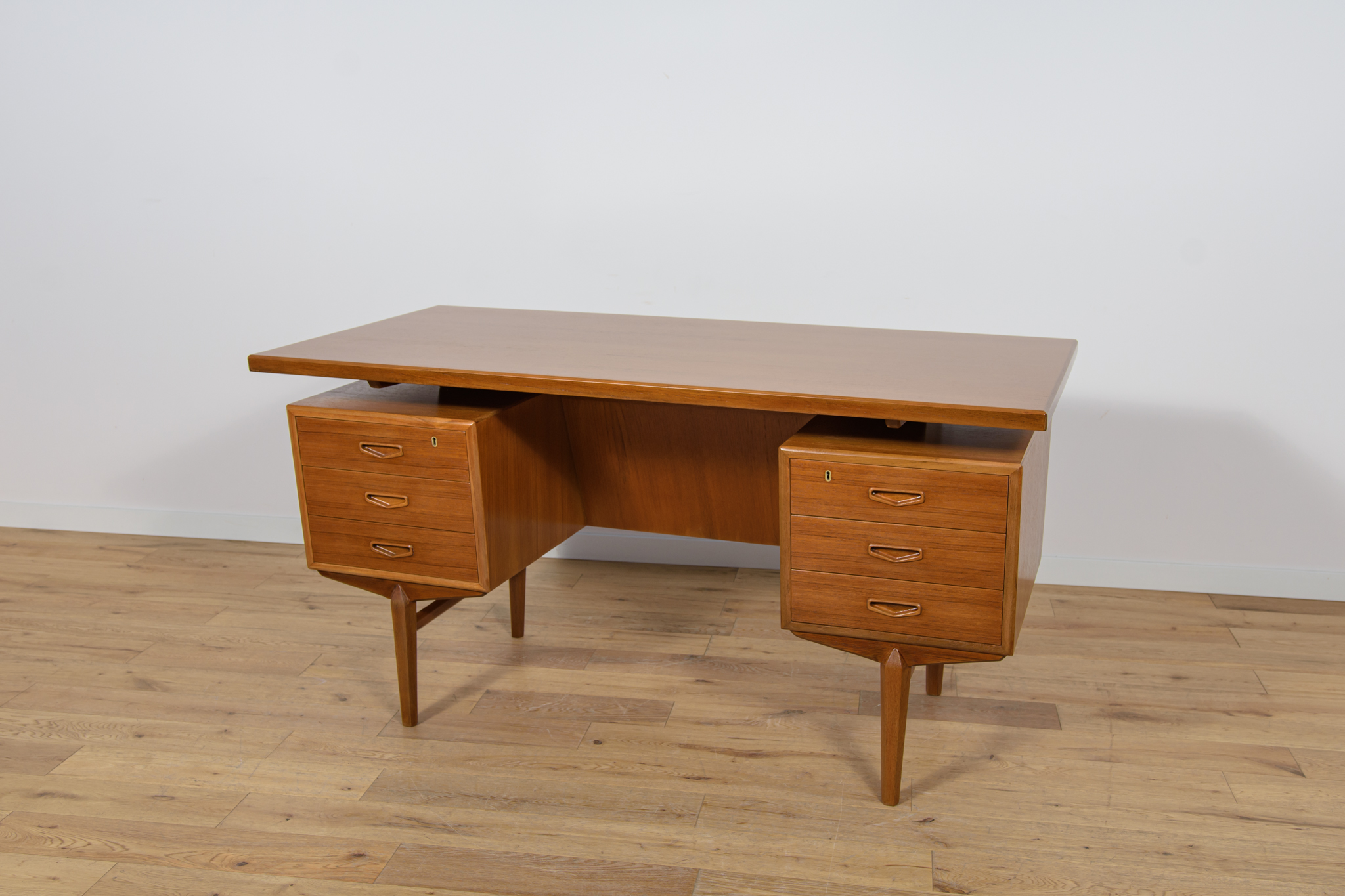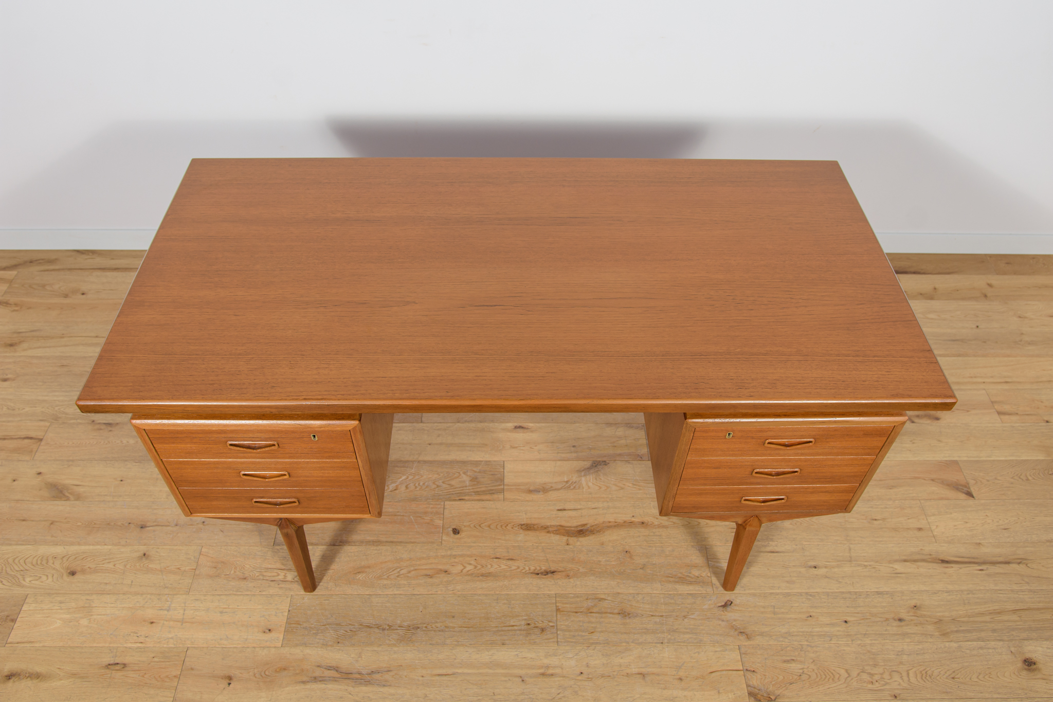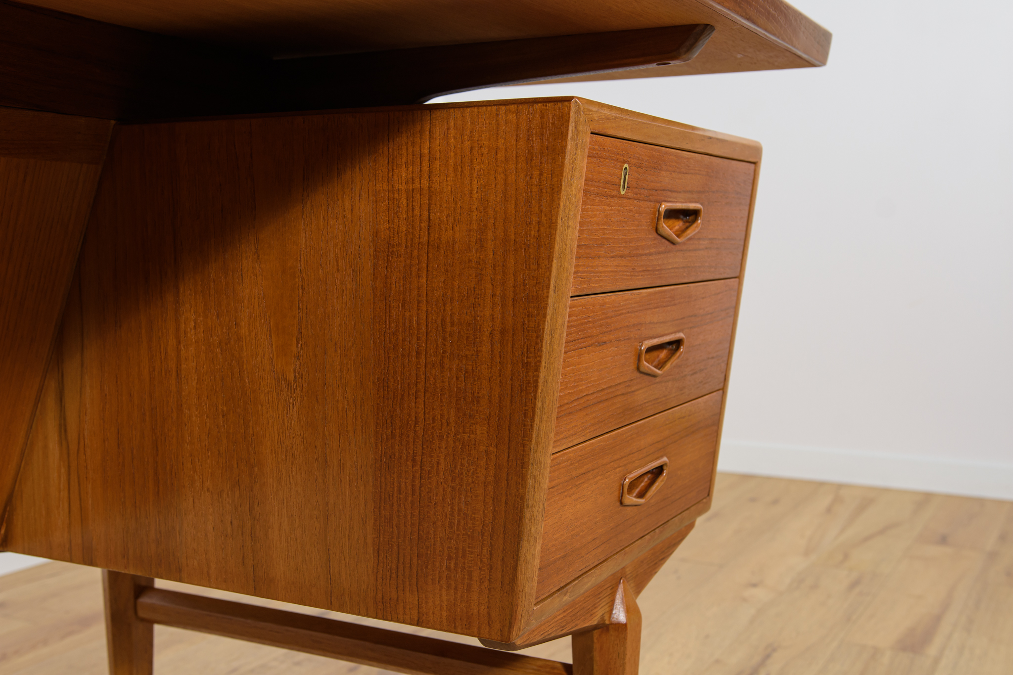 Wolnostojące biurko zostało wyprodukowane w Danii w latach 60. Zostało wykonane z drewna tekowego z wyprofilowanymi uchwytami. Biurko posiada unikatową modernistyczną bryłę i kształty. Składa się z sześciu szuflad, po trzy szuflady z każdej strony. Po przeciwnej stronie, znajduje się półka na książki. Mebel jest po kompleksowej renowacji stolarskiej. Oczyszczone zostało ze starej powłoki, barwiony bejcą w kolorze dębu, wykończony półmatowym lakierem. Posiada klucz do szuflad.
