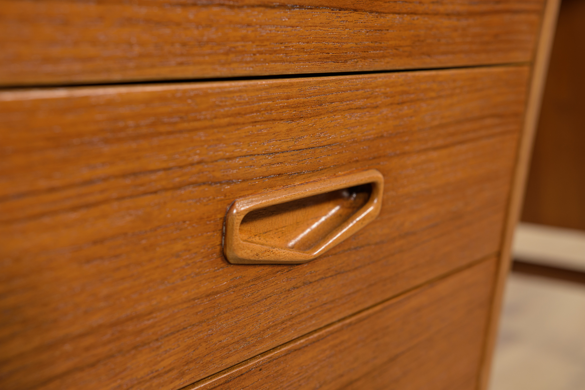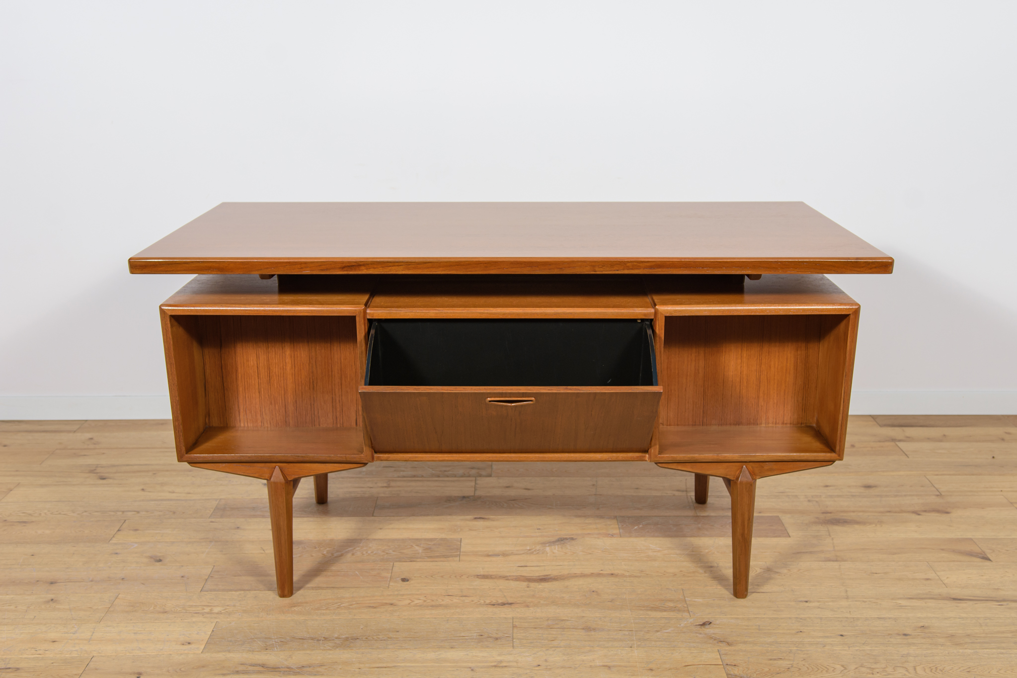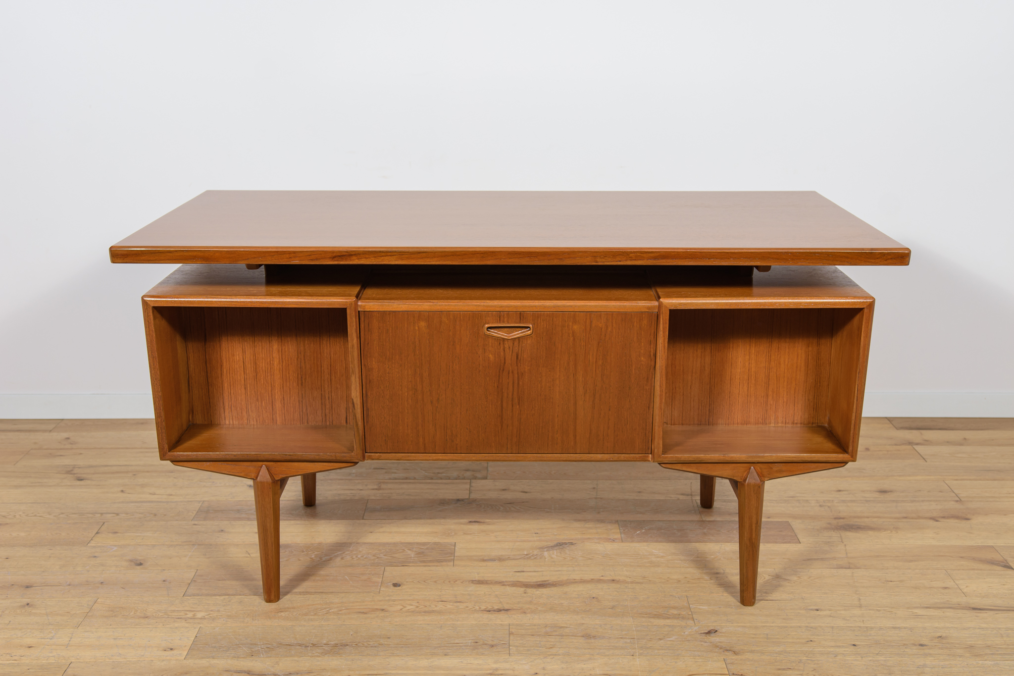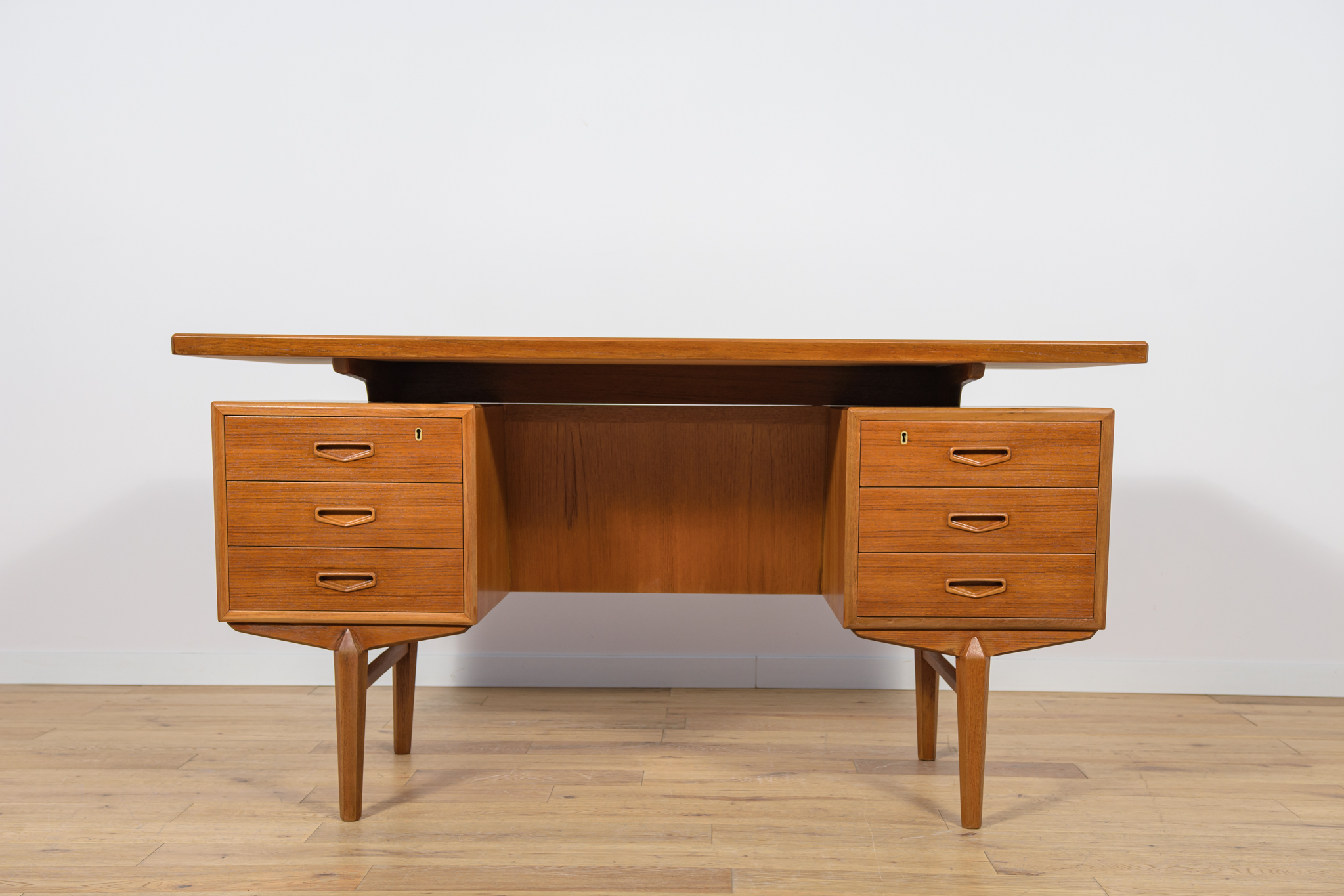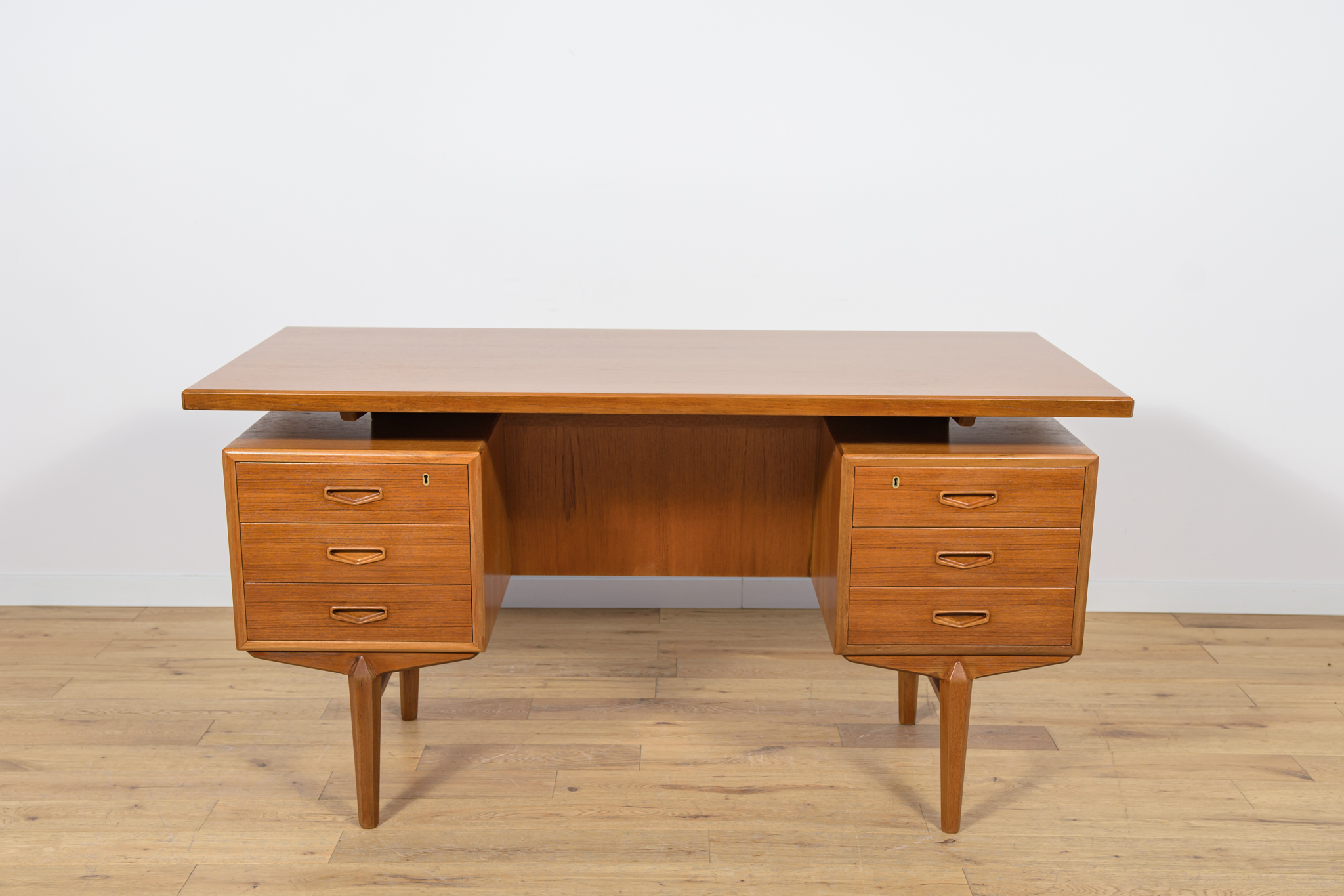 Wolnostojące biurko zostało wyprodukowane w Danii w latach 60. Zostało wykonane z drewna tekowego z wyprofilowanymi uchwytami. Biurko posiada unikatową modernistyczną bryłę i kształty. Składa się z sześciu szuflad, po trzy szuflady z każdej strony. Po przeciwnej stronie, znajduje się półka na książki. Mebel jest po kompleksowej renowacji stolarskiej. Oczyszczone zostało ze starej powłoki, barwiony bejcą w kolorze dębu, wykończony półmatowym lakierem. Posiada klucz do szuflad.
