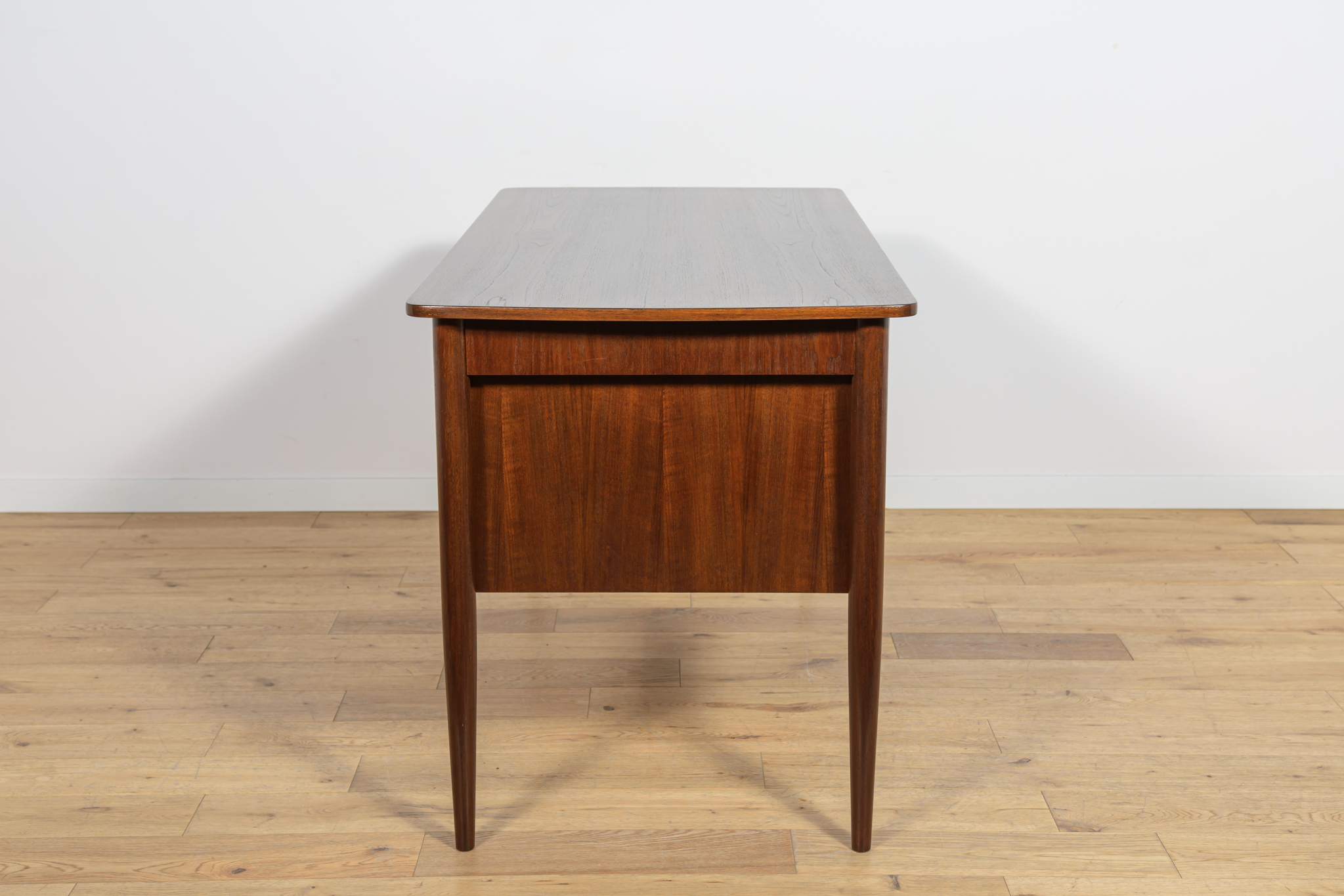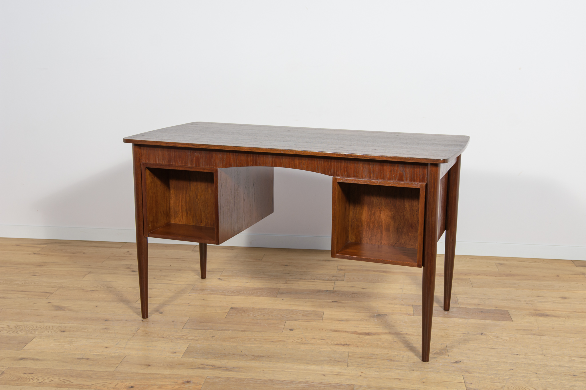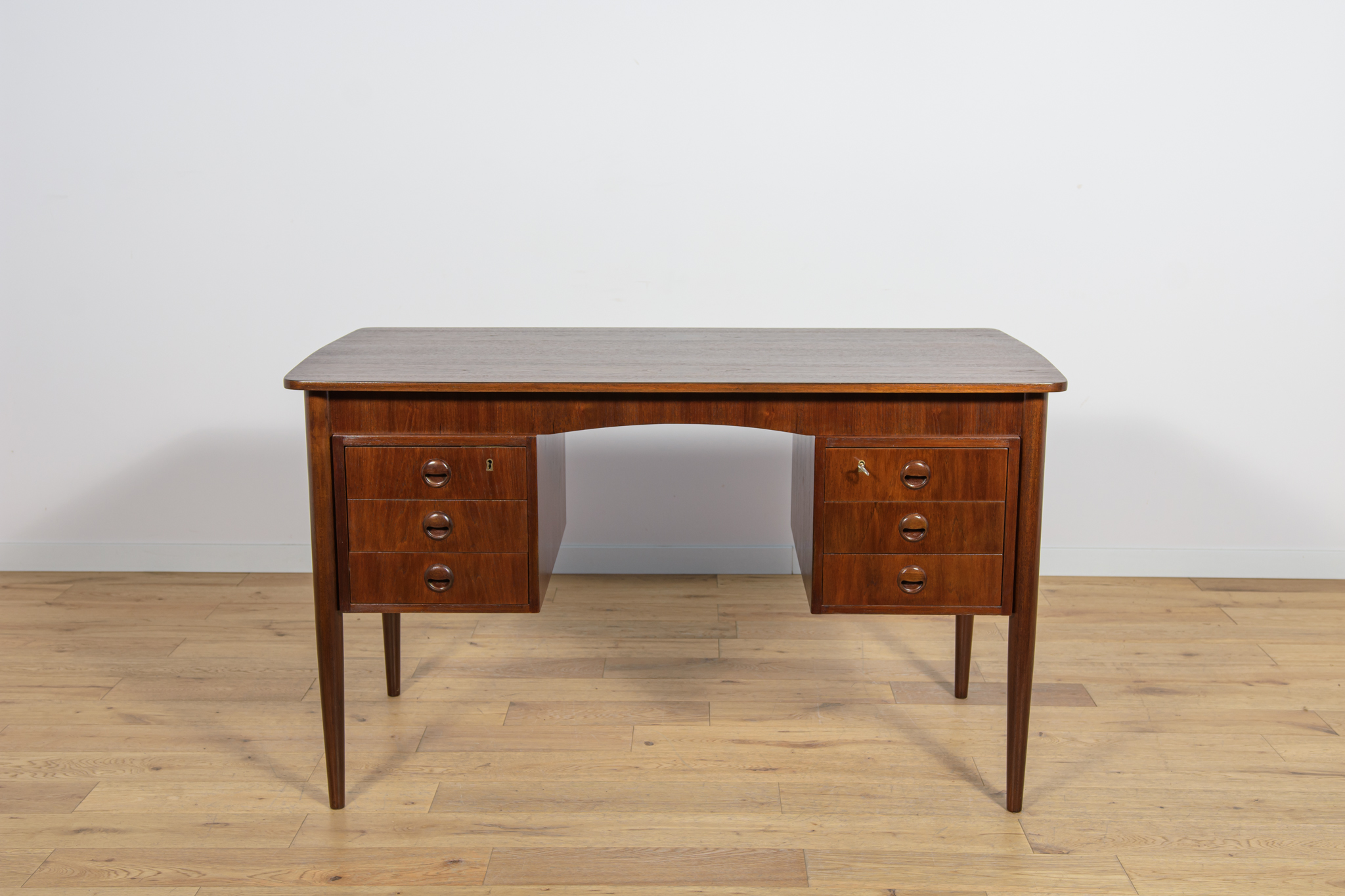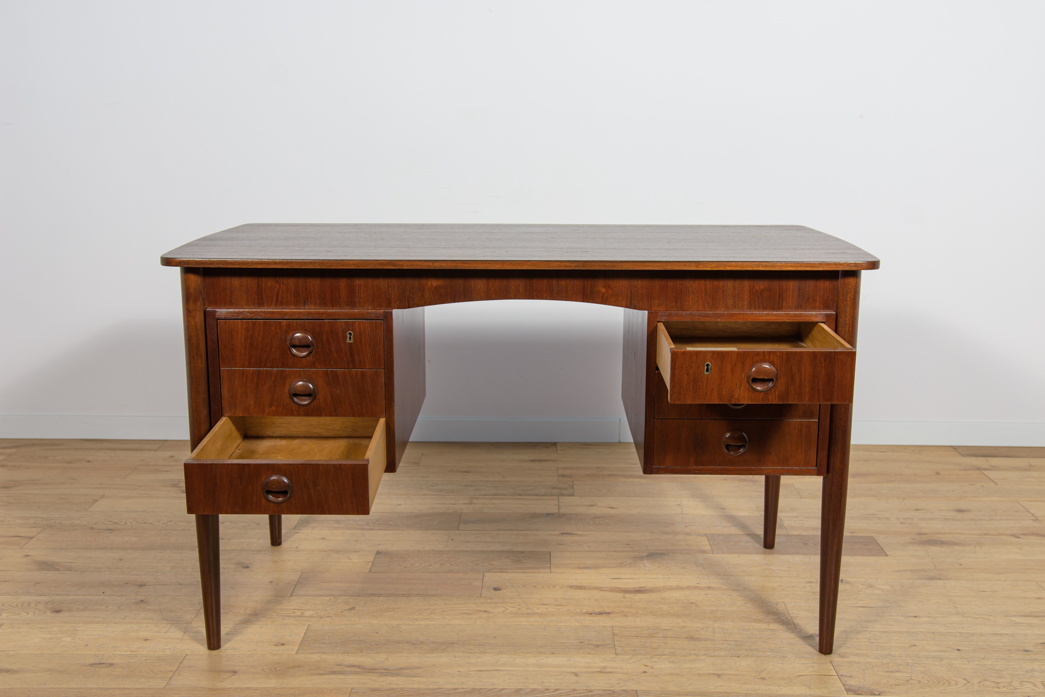 Wolnostojące biurko zostało wyprodukowane w Danii w latach 60. Zostało wykonane z drewna tekowego z wyprofilowanymi uchwytami. Składa się z sześciu szuflad, po trzy szuflady z każdej strony. Po przeciwnej stronie, znajdują się dwie półki na książki. Mebel jest po kompleksowej renowacji stolarskiej. Oczyszczony został ze starej powłoki, barwiony bejcą w kolorze palisandru, wykończony wysokogatunkowym duńskim olejem. Posiada klucz do szuflad.