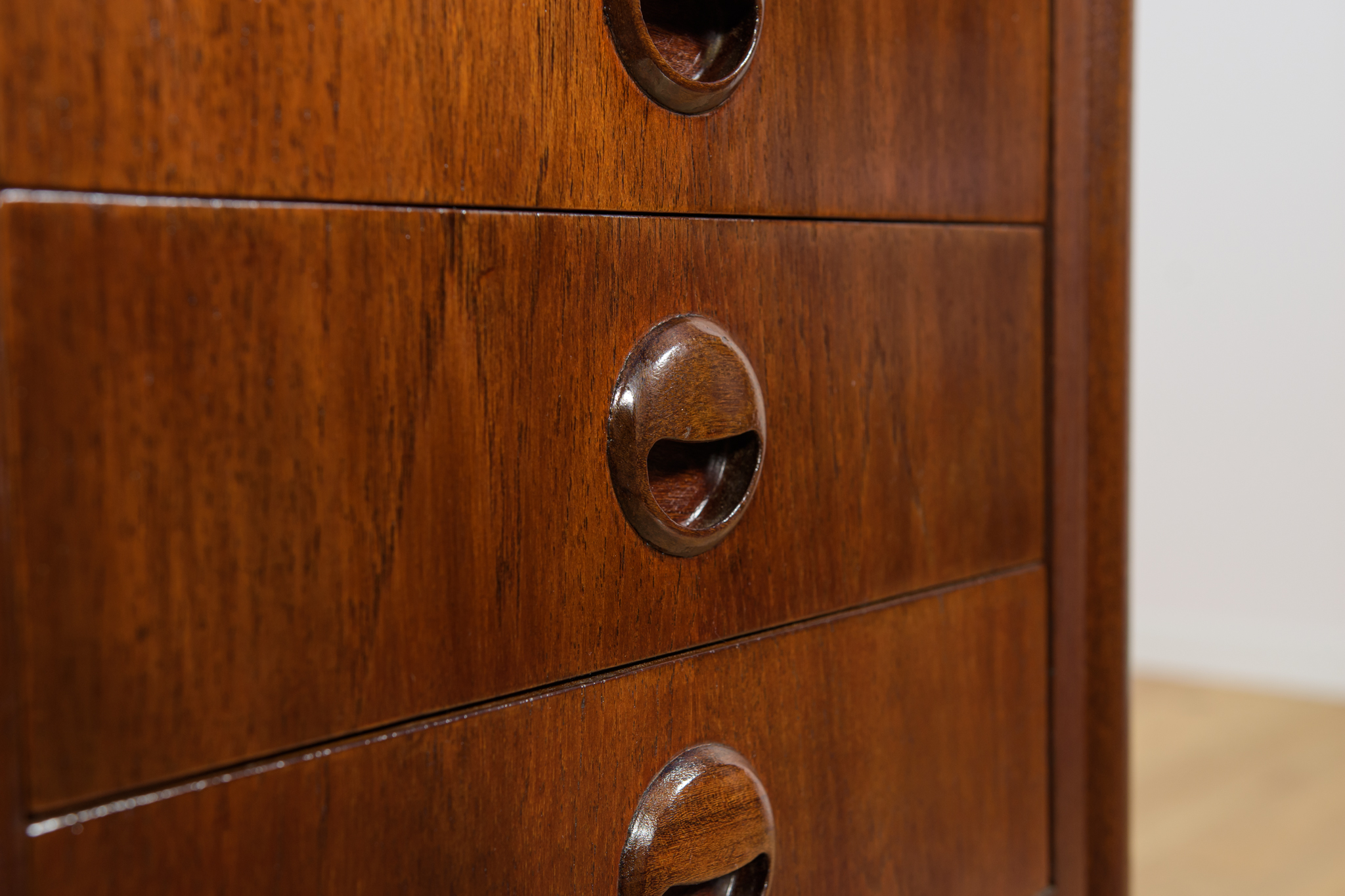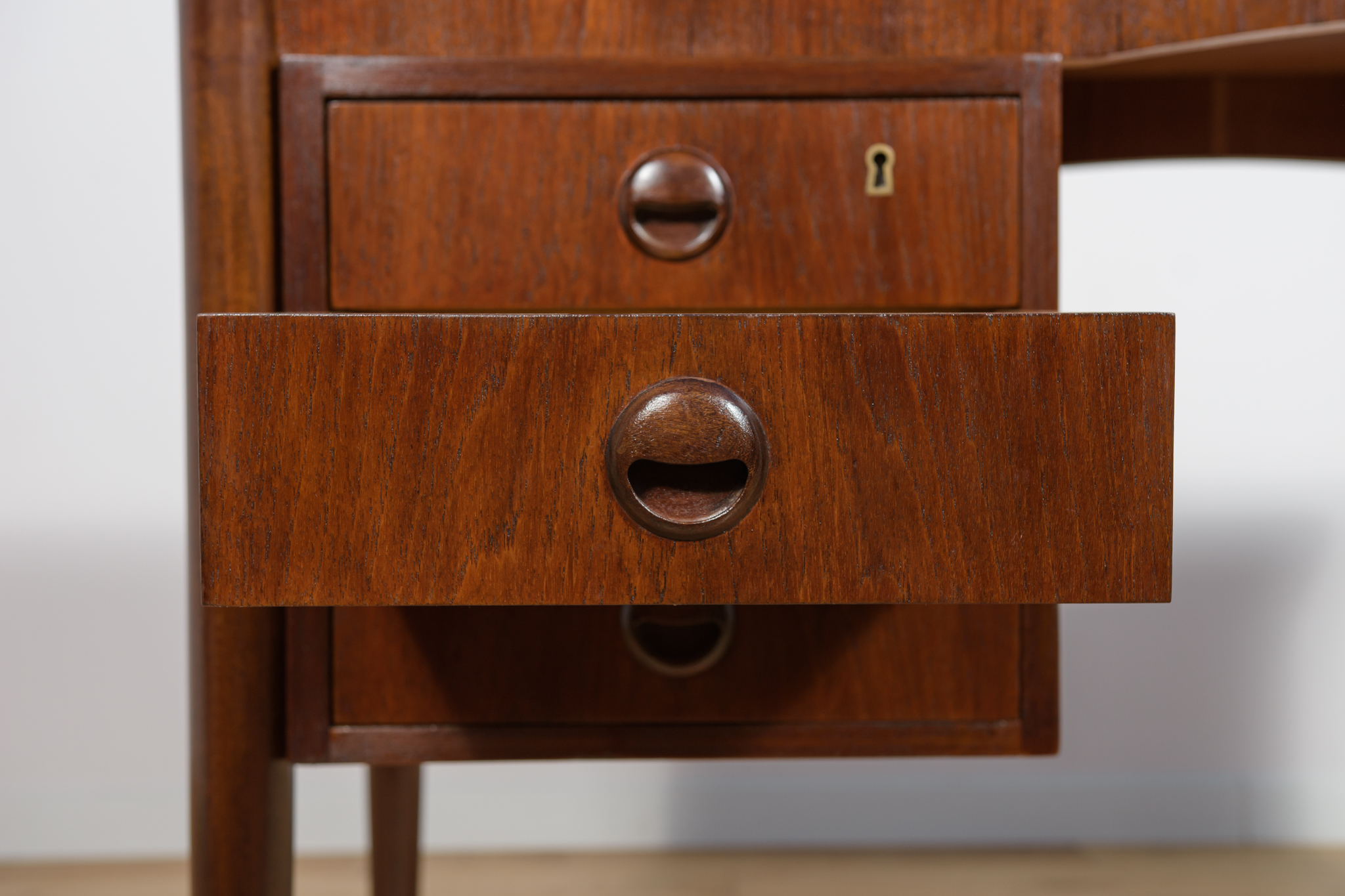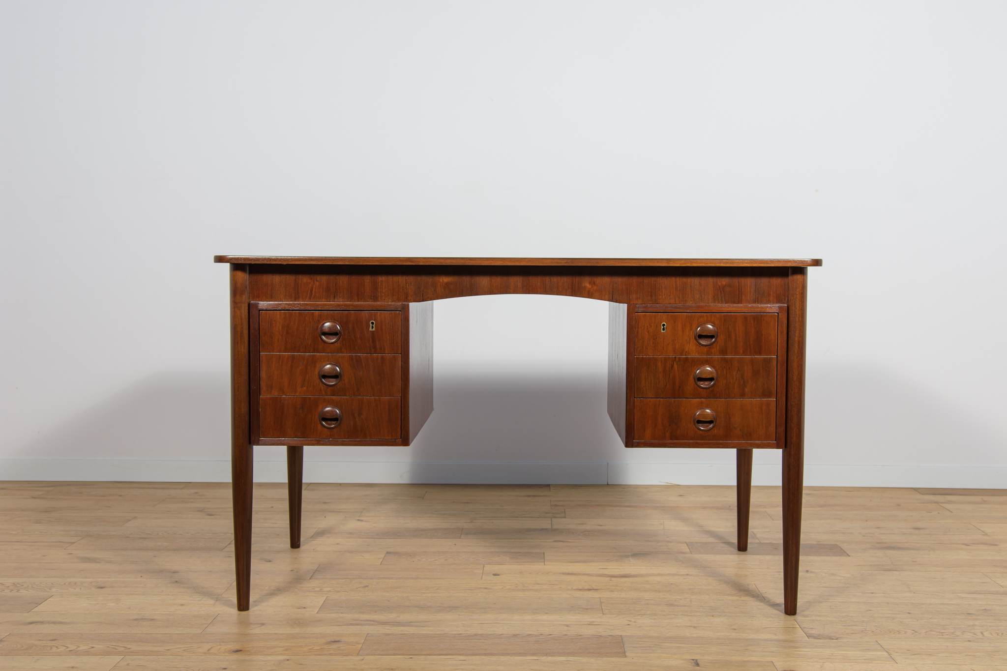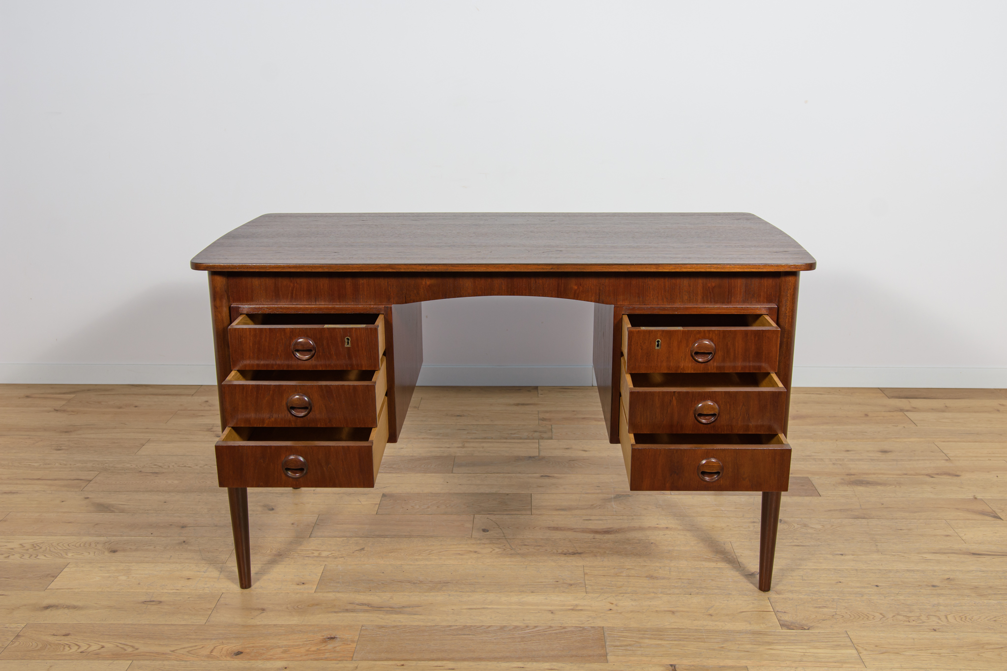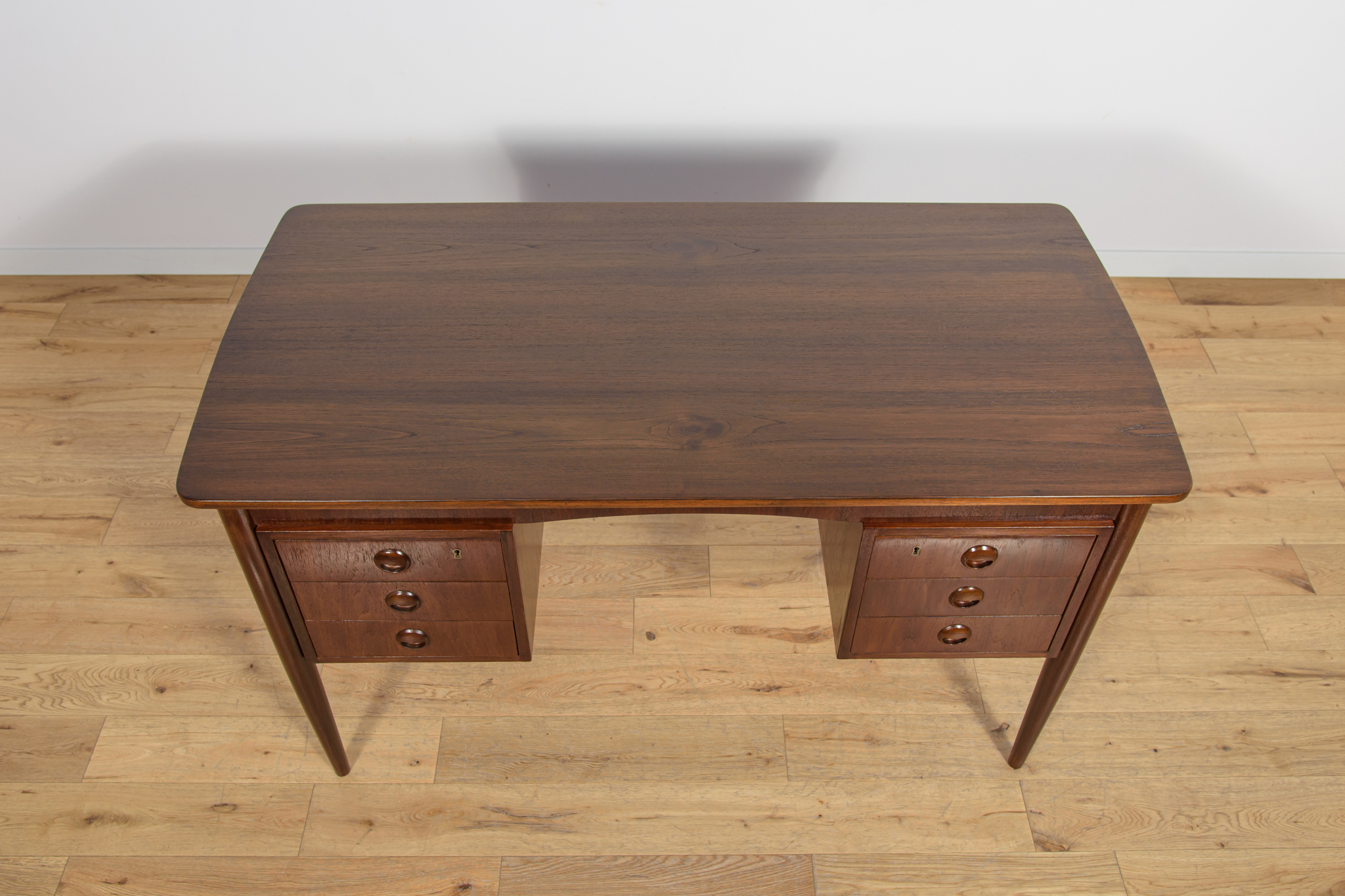 Wolnostojące biurko zostało wyprodukowane w Danii w latach 60. Zostało wykonane z drewna tekowego z wyprofilowanymi uchwytami. Składa się z sześciu szuflad, po trzy szuflady z każdej strony. Po przeciwnej stronie, znajdują się dwie półki na książki. Mebel jest po kompleksowej renowacji stolarskiej. Oczyszczony został ze starej powłoki, barwiony bejcą w kolorze palisandru, wykończony wysokogatunkowym duńskim olejem. Posiada klucz do szuflad.