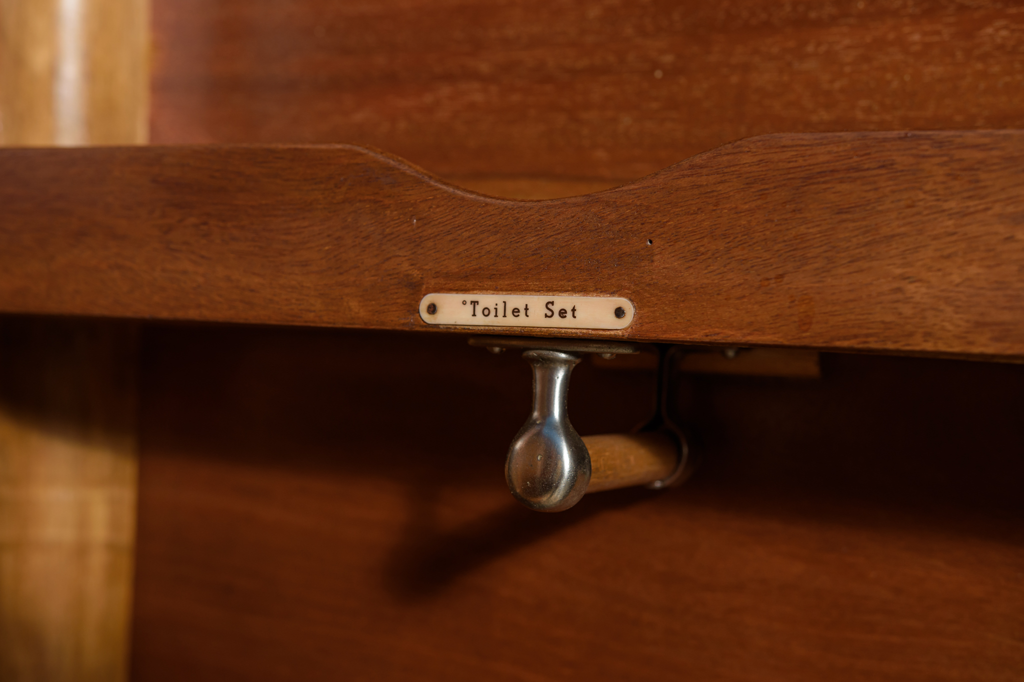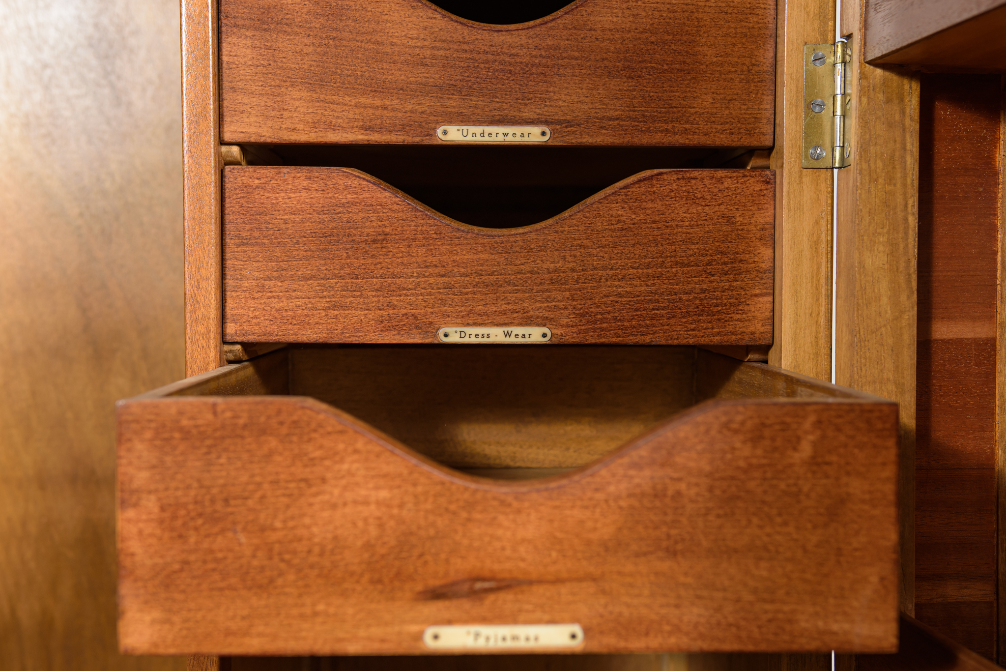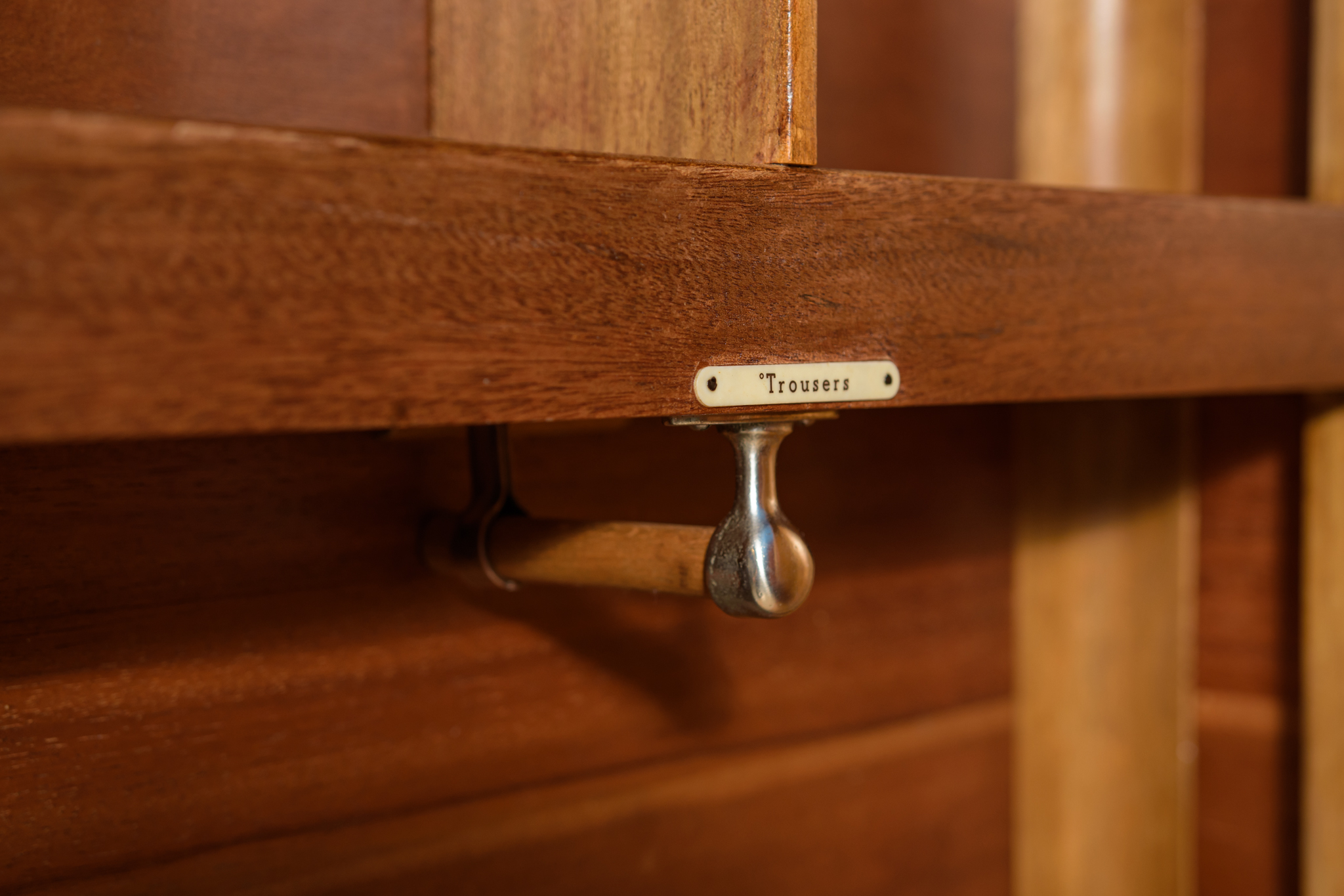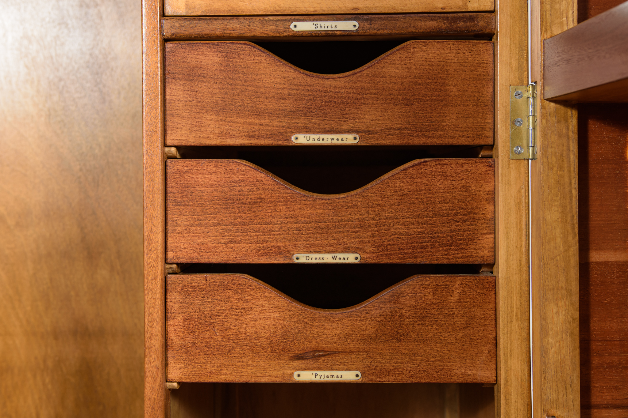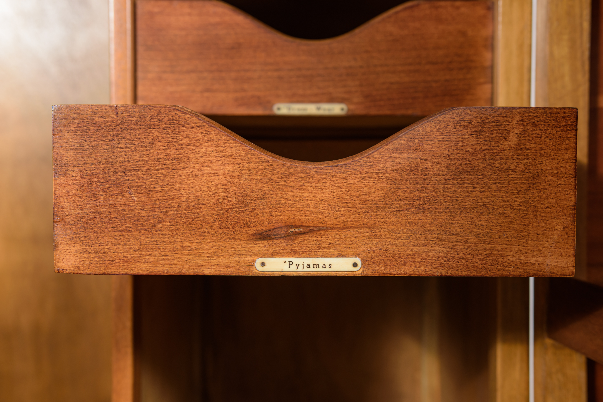 Dębowa szafa w stylu art deco, wyprodukowana przez brytyjską manufakturę Fitrobe około lat 30. XX wieku. Szafa o eleganckich obłych kształtach, posiada piękne, funkcjonalne wnętrza z angielskimi oznaczeniami z epoki. Mebel przeszedł kompleksową renowację. Drewno dębowe zostało wyczyszczony ze starej powierzchni, barwione bejcą dębową, wykończona wysokogatunkowym olejem duńskim.