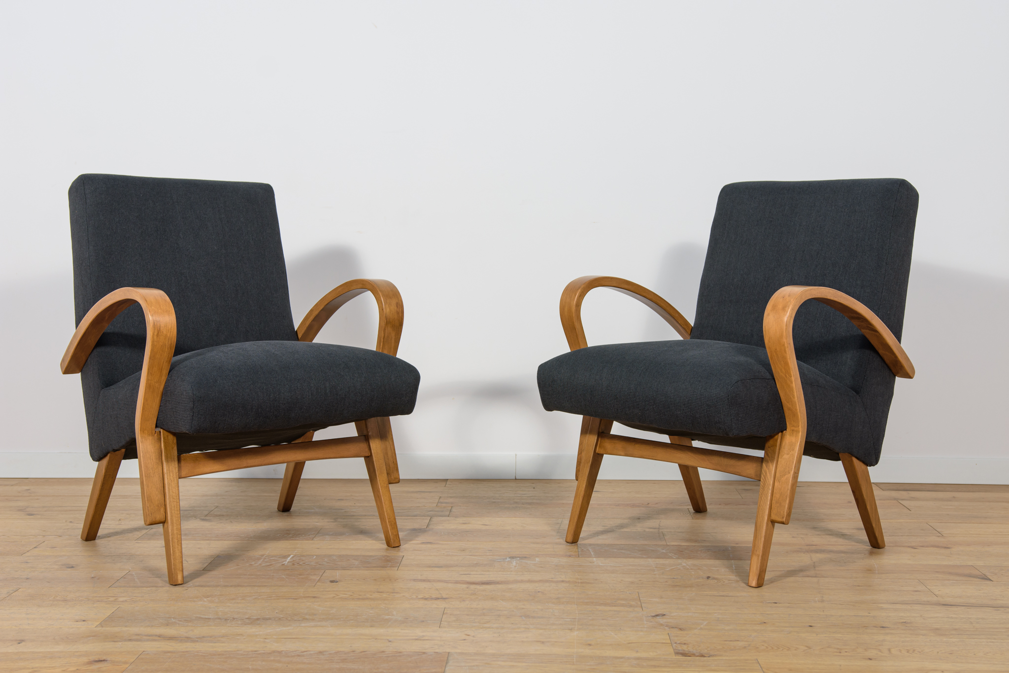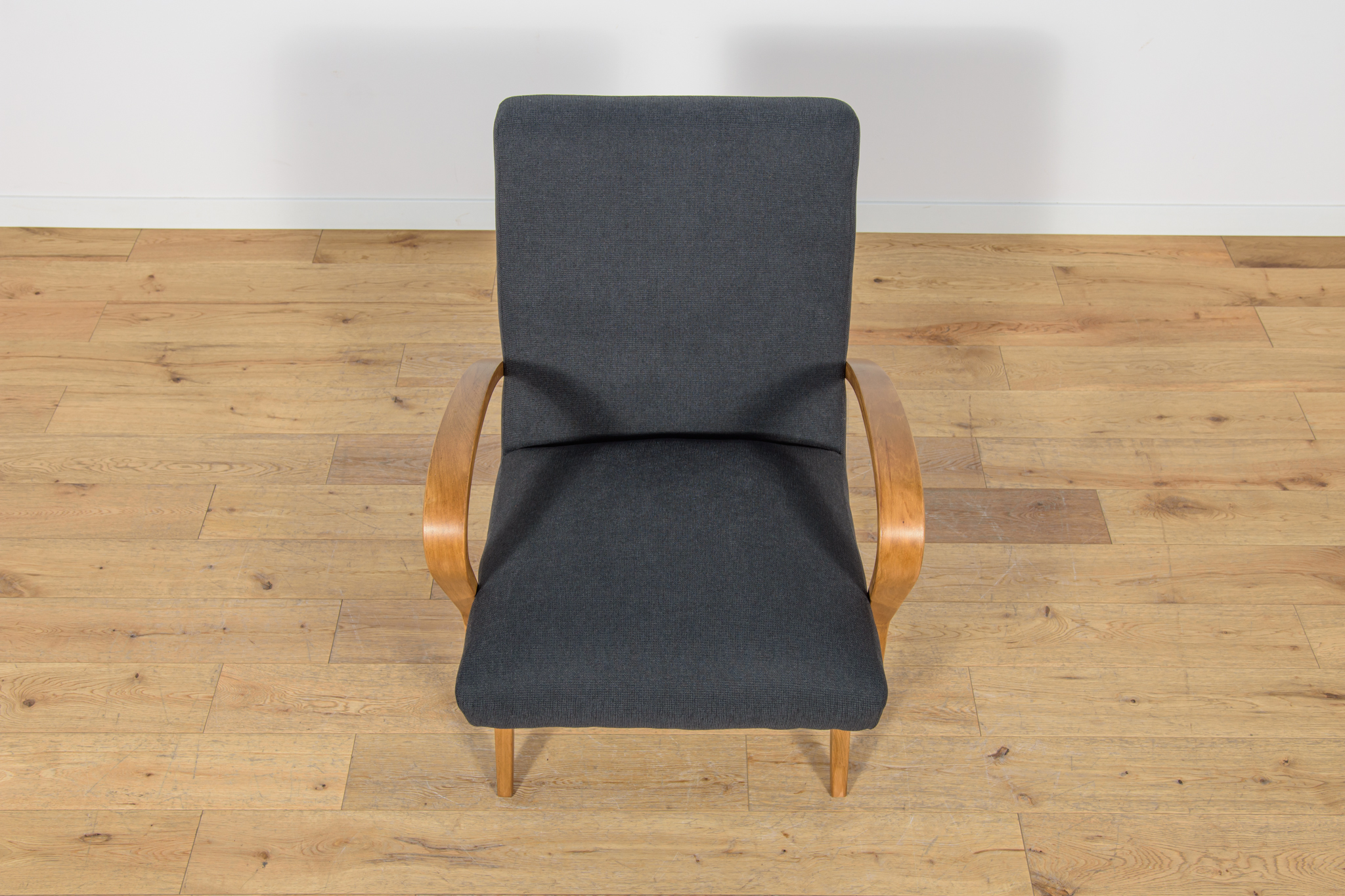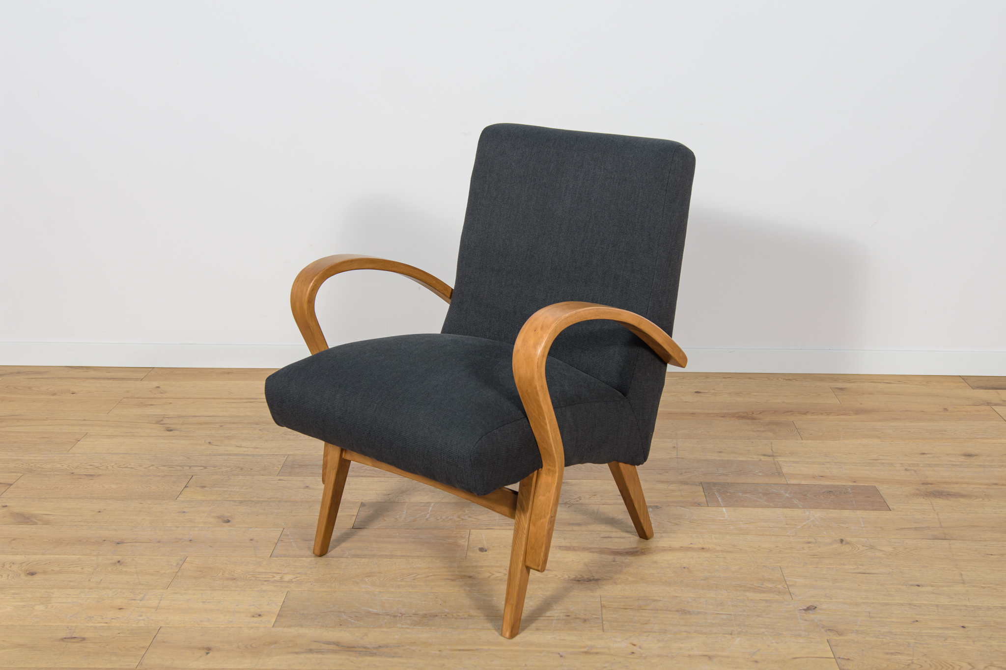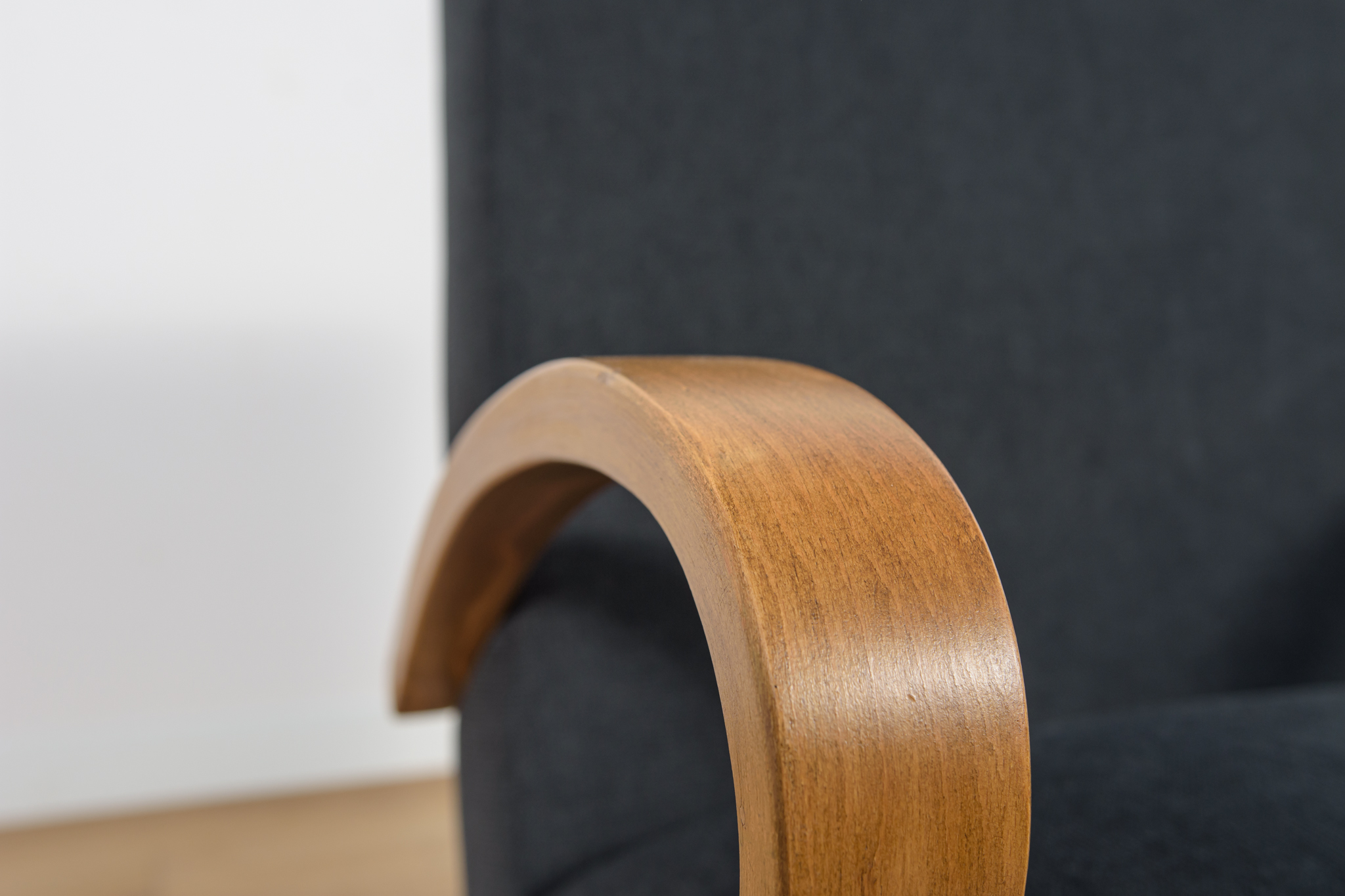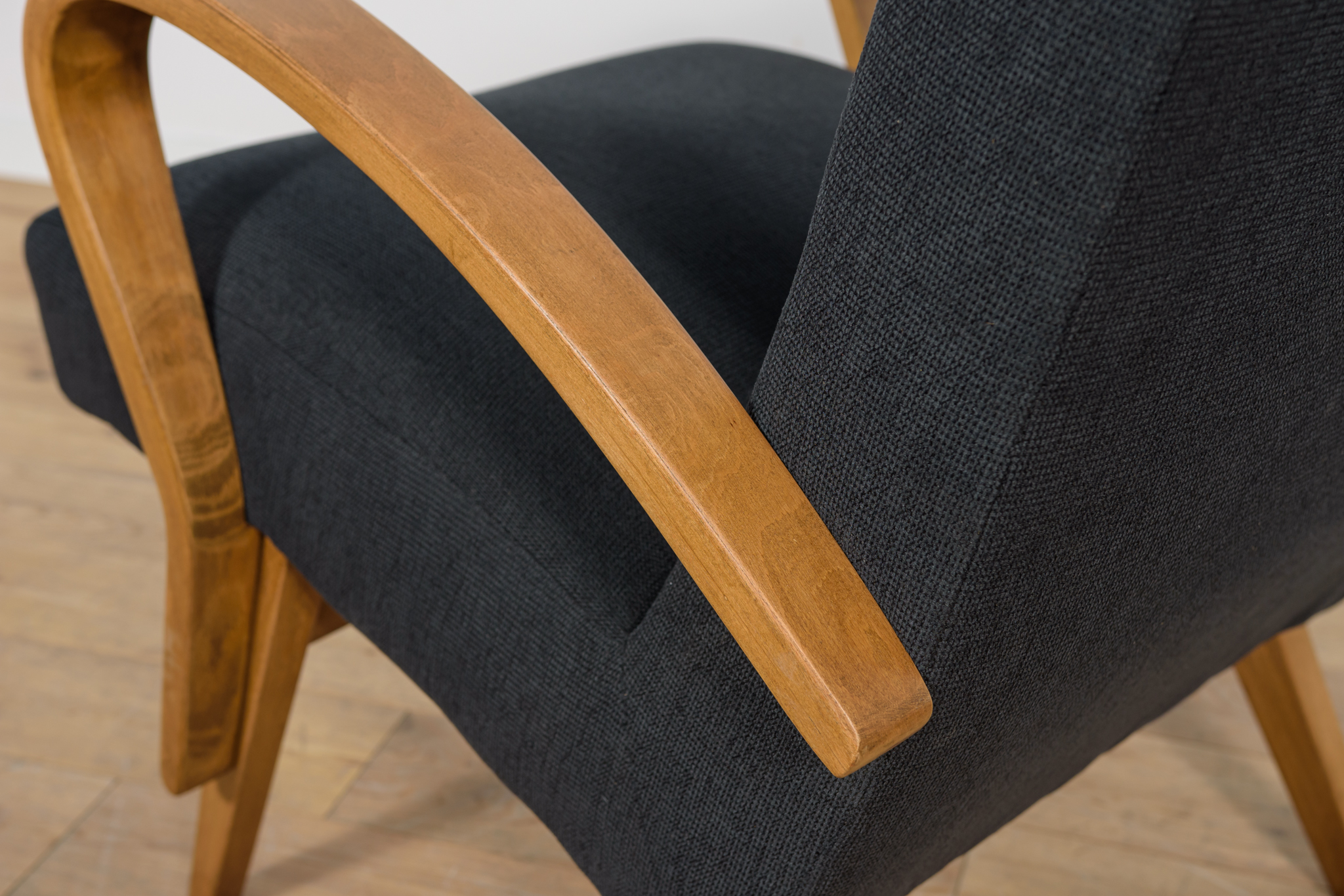 Fotel wyprodukowany w latach 60-tych w Czechosłowacji. Fotel przeszedł profesjonalną renowacje stolarsko-tapicerską. Posiada unikatowe gięte poręcze, pomalowane bejcą w kolorze dębu, wykończone lakierem. W fotelu wymieniono pianki. Zostały obity wysokogatunkowym materiałem w kolorze czarnym.