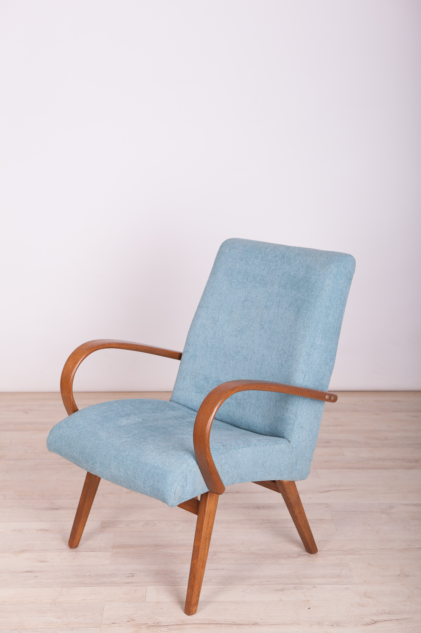 Fotel typu 53 zaprojektowanych przez Jaroslava Šmidka, wyprodukowanych w latach 60. przez fabrykę TON. Fotel zostały poddany profesjonalnej renowacji stolarsko–tapicerskiej. Wnętrze zostały wymienione i obite wysokogatunkowym materiałem w kolorze błekitnym. Podłokietniki zostały wykonane z giętego drewna bukowego. Wraz z nóżkami zostały oczyszczone, pomalowane bejcą w kolorze dębowym oraz wykończone półmatowym lakierem.