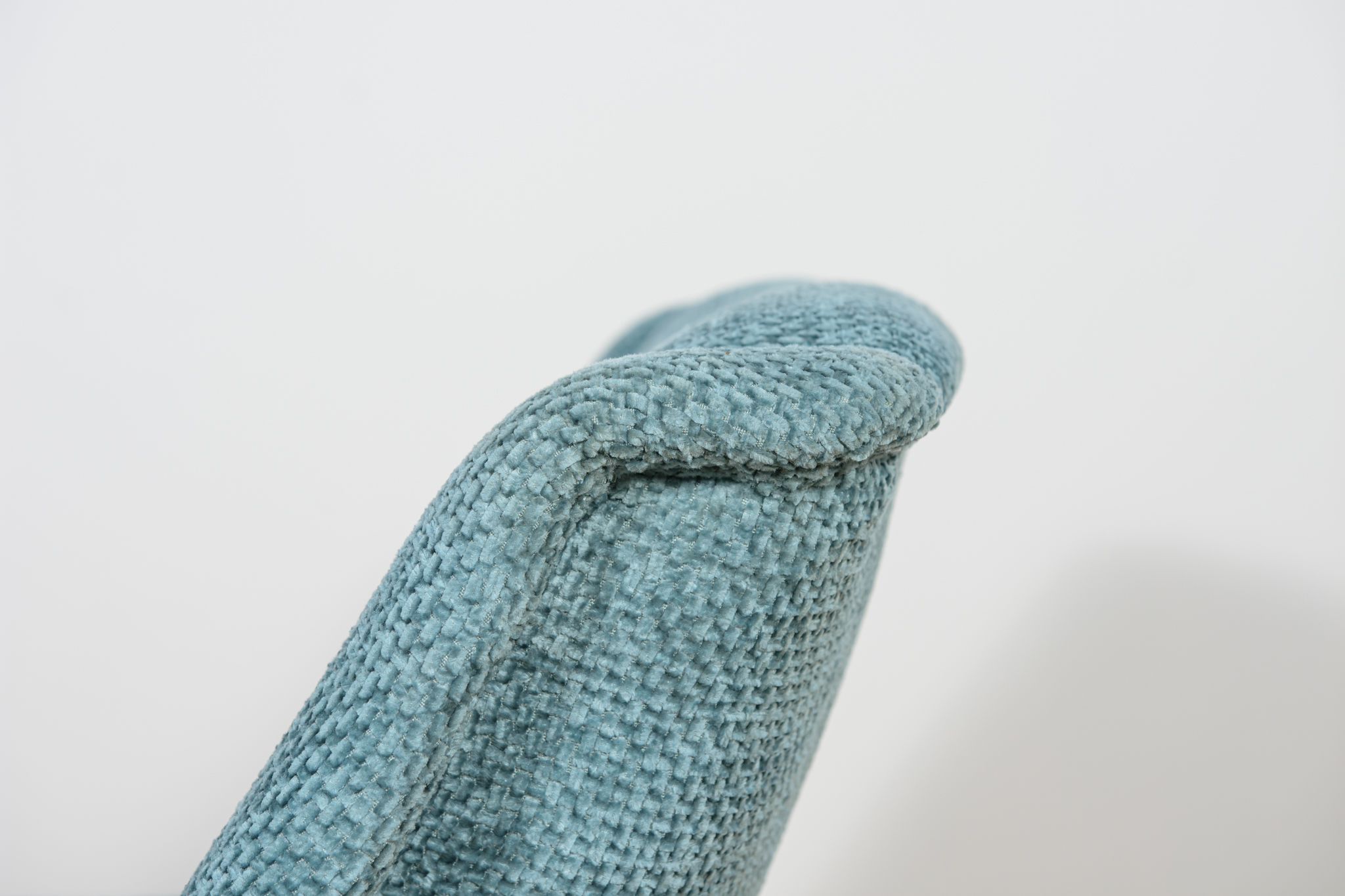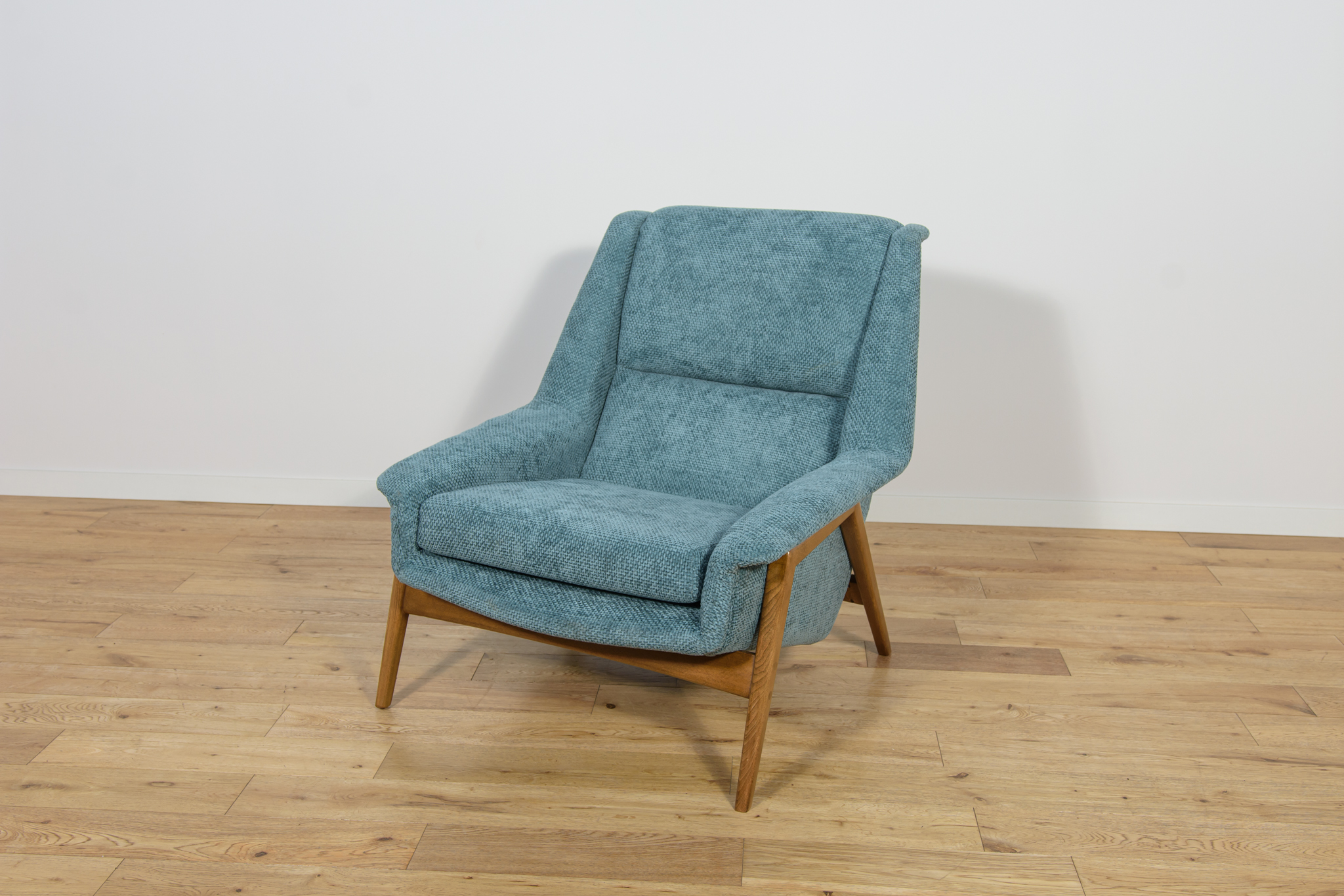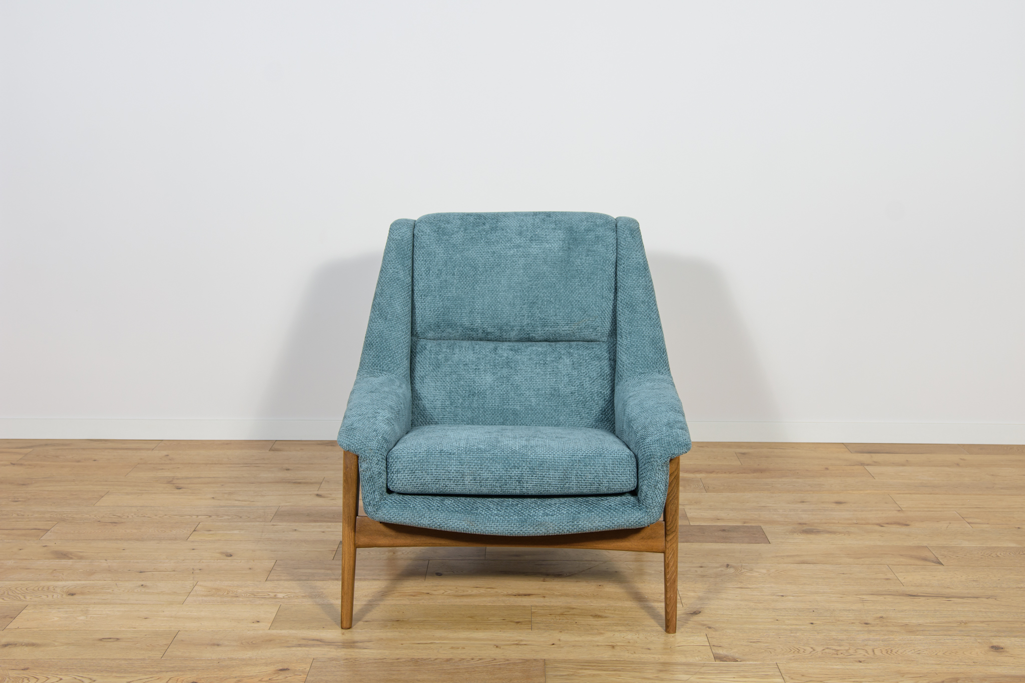 Fotel zaprojektowany przez Folke Ohlsson dla szwedzkiej manufaktury Dux w latach 60. Duży, wygodny fotel, przeszedł kompleksową renowację tapicerską i stolarską. Wnętrza tapicerskie zostały wymienione, obite wysokogatunkowym materiałem w kolorze błękitnym. Drewniana rama z drewna bukowego, została oczyszczona ze starej nawierzchni, barwiony bejcą dębową, wykończony mocnym półmatowym lakierem.