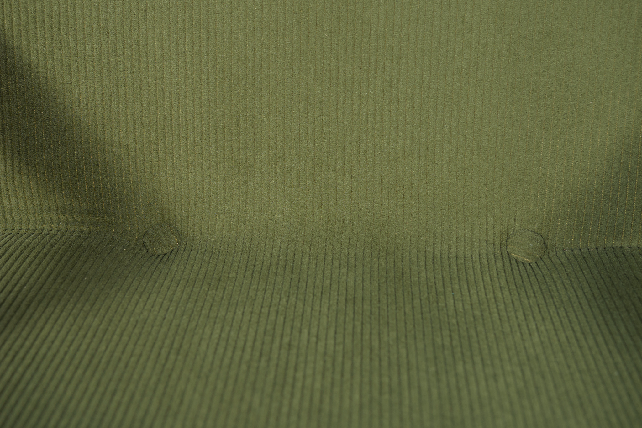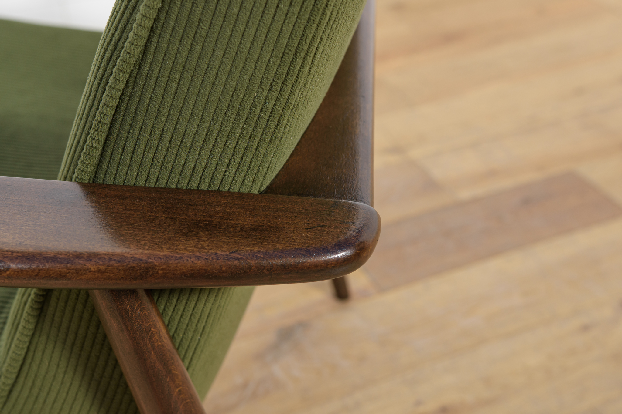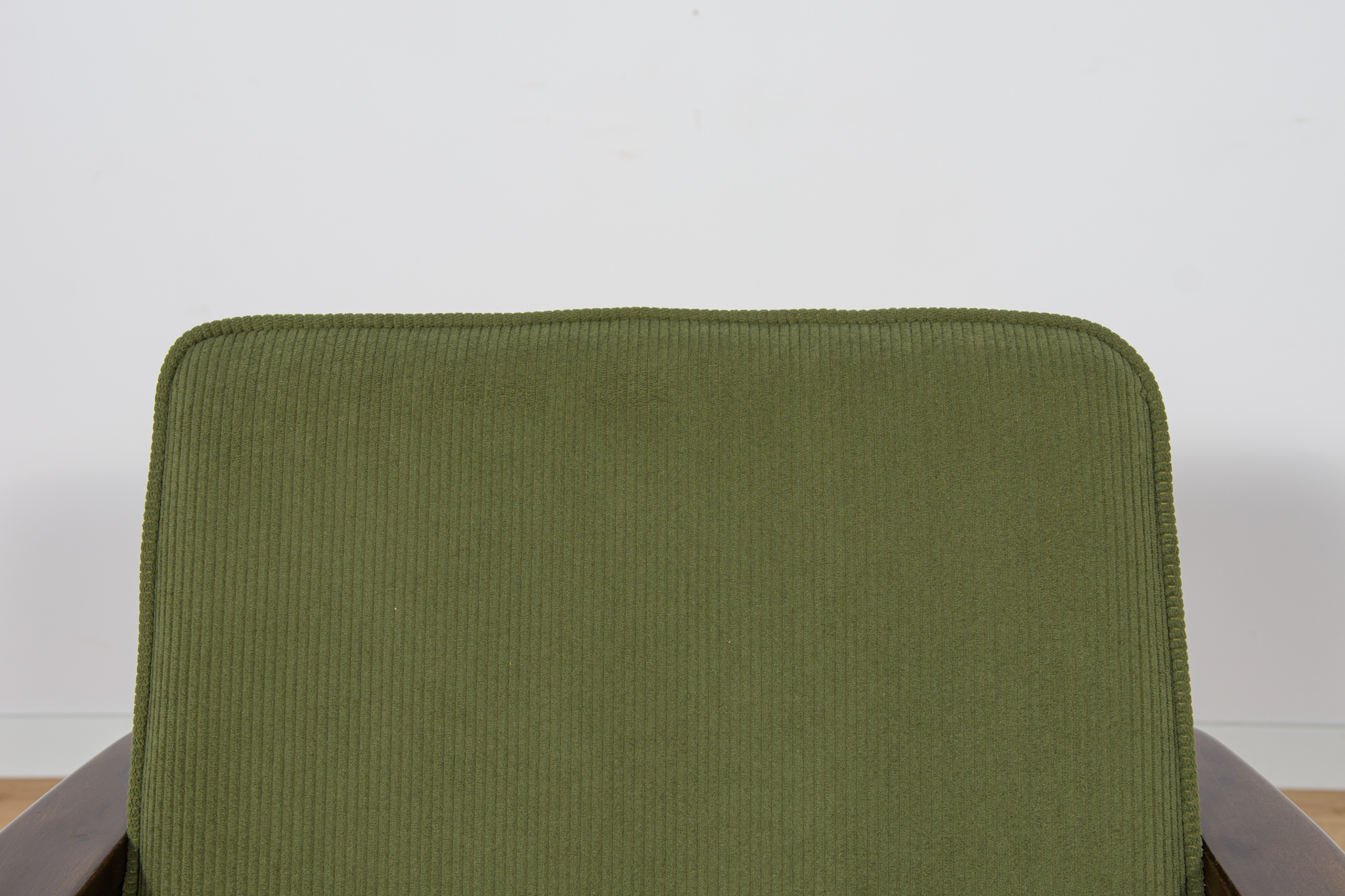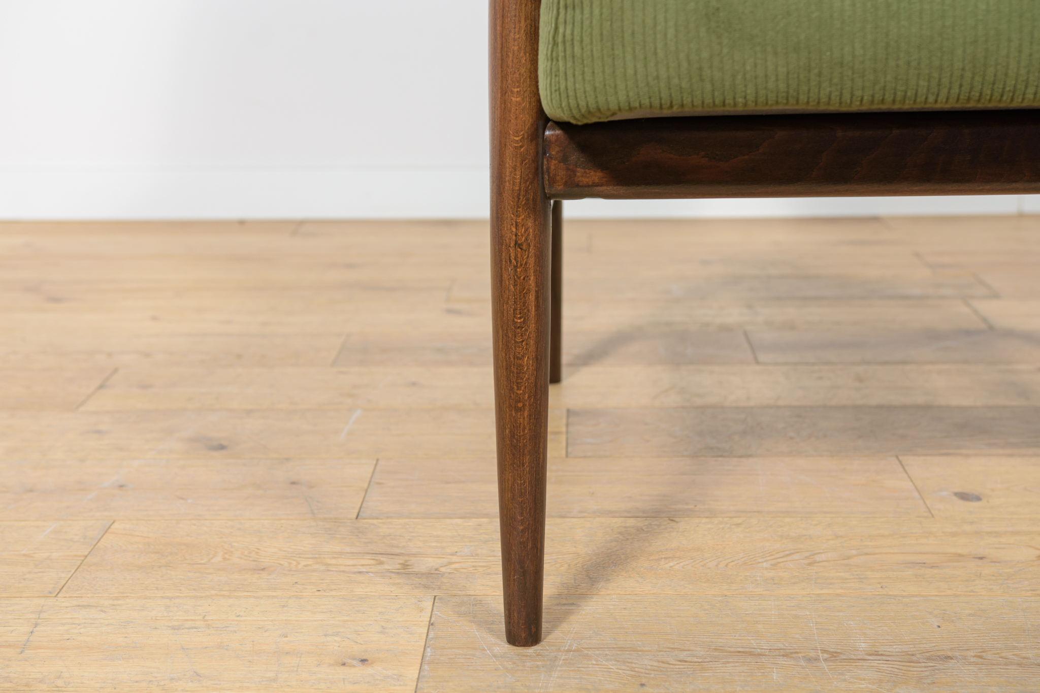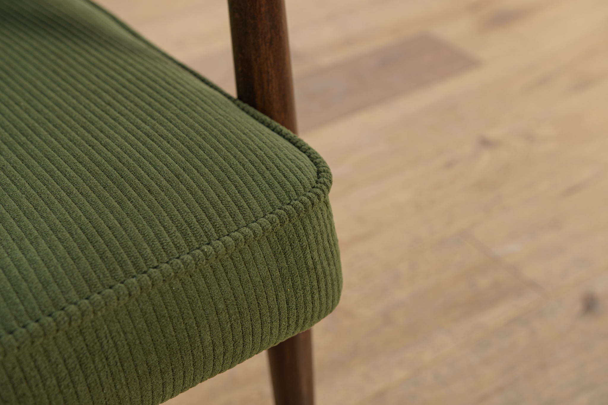 Fotel przeszedł profesjonalną renowację stolarską i tapicerską. Drewno bukowe zostało oczyszczone ze starej powierzchni, pomalowane bejcą w kolorze palisandrowym, wykończone mocnym półmatowym lakierem. Wewnętrzne elementy tapicerskie zostały wymienione, obite wysokogatunkową tkaniną typu sztruks w kolorze zielonym.