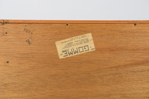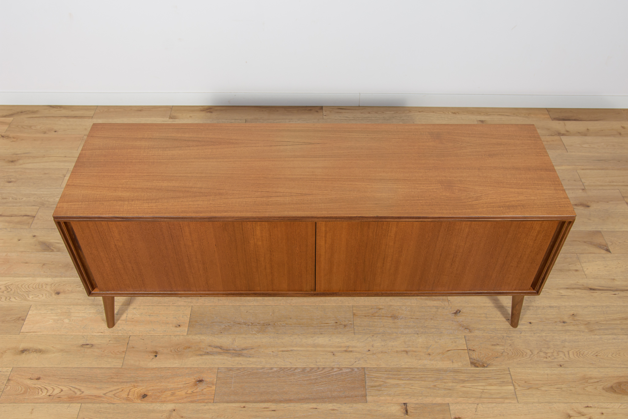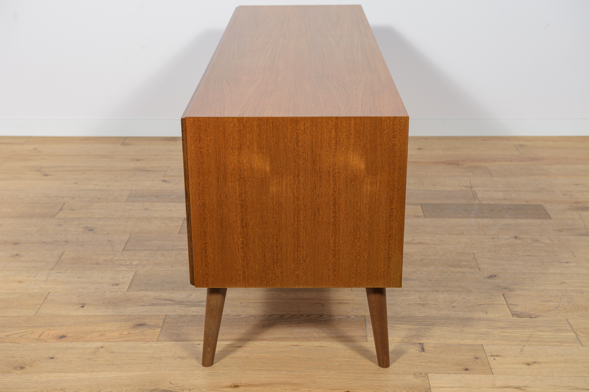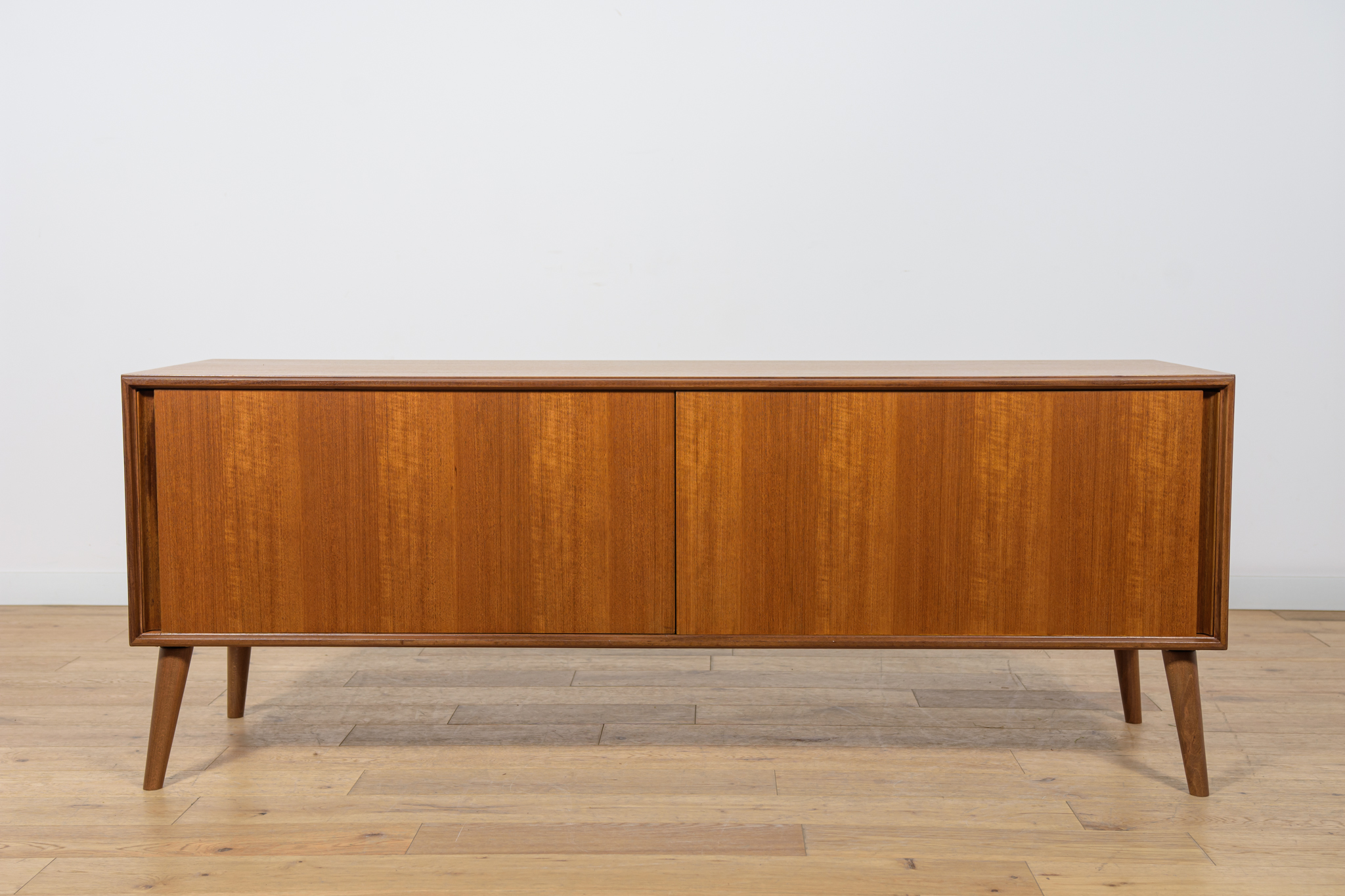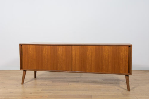 Sideboard wyprodukowany w brytyjskiej manufakturze G-Plan w latach 60. Wykonany z drewna teakowego. Komoda składa się z dwóch przesuwnych drzwi. Całość jest po kompleksowej renowacji stolarskiej. Drewno zostało oczyszczone ze starej powierzchni, barwiony bejcą dębową, wykończona mocnym półmatowym lakierem.