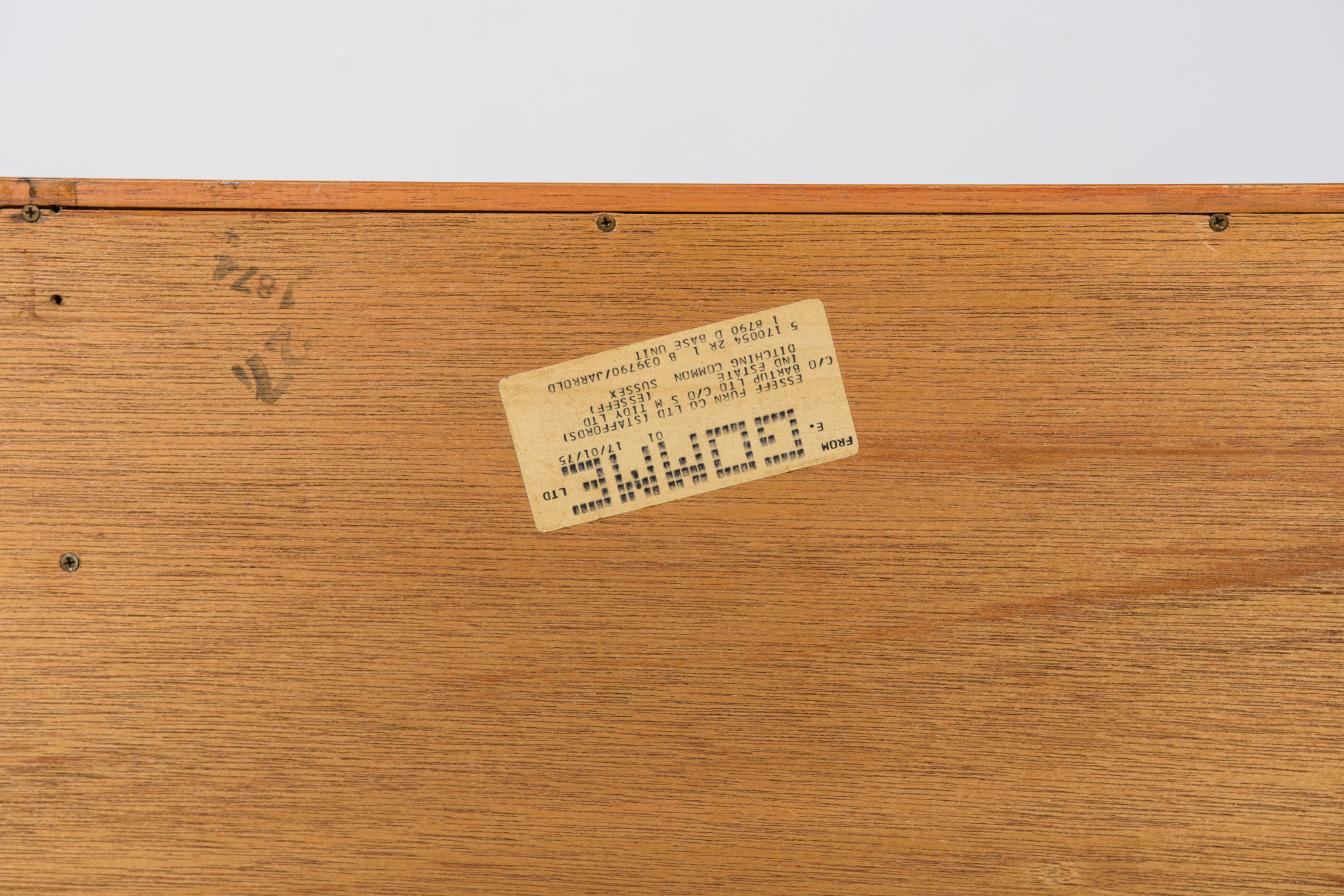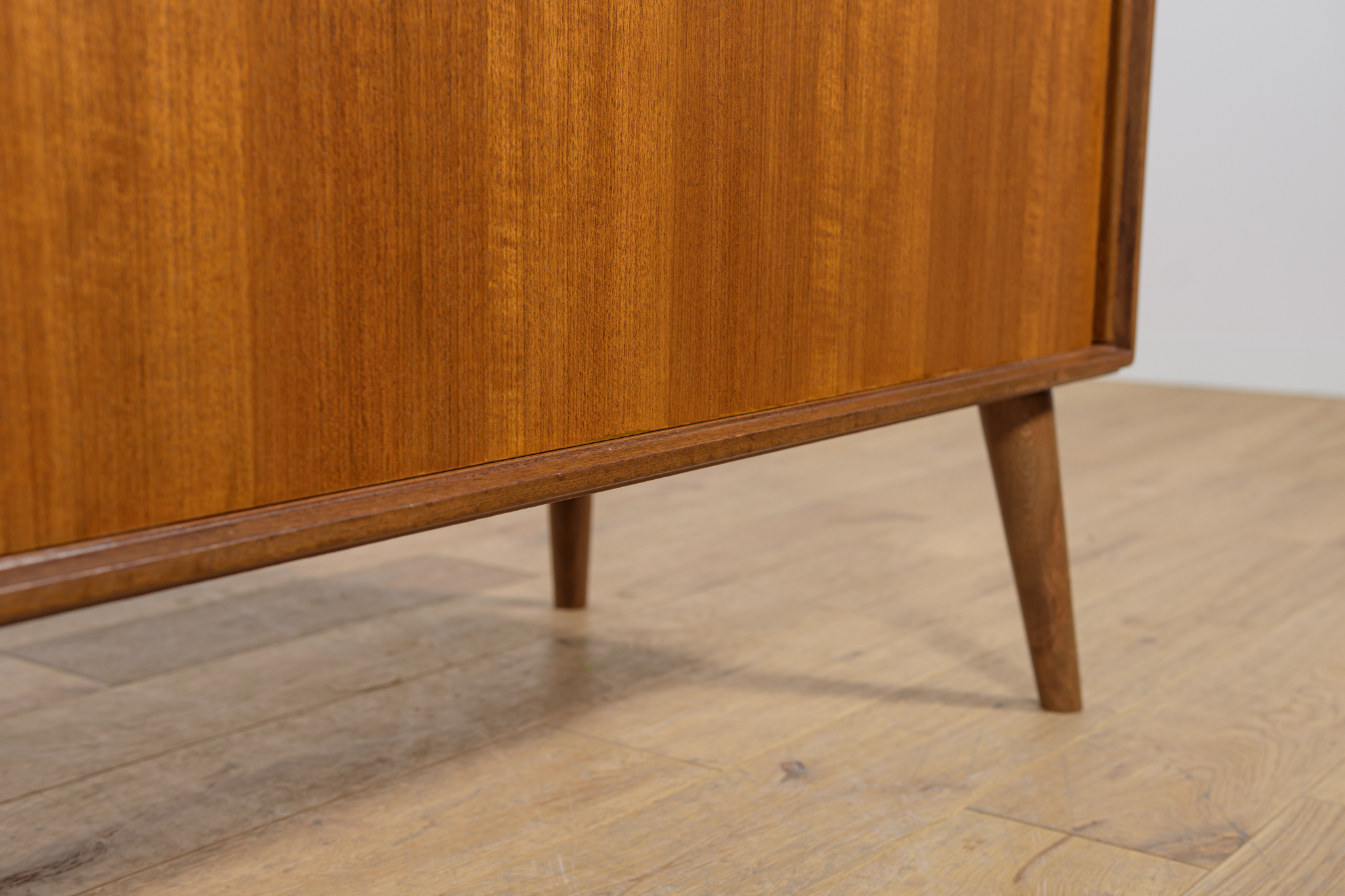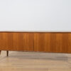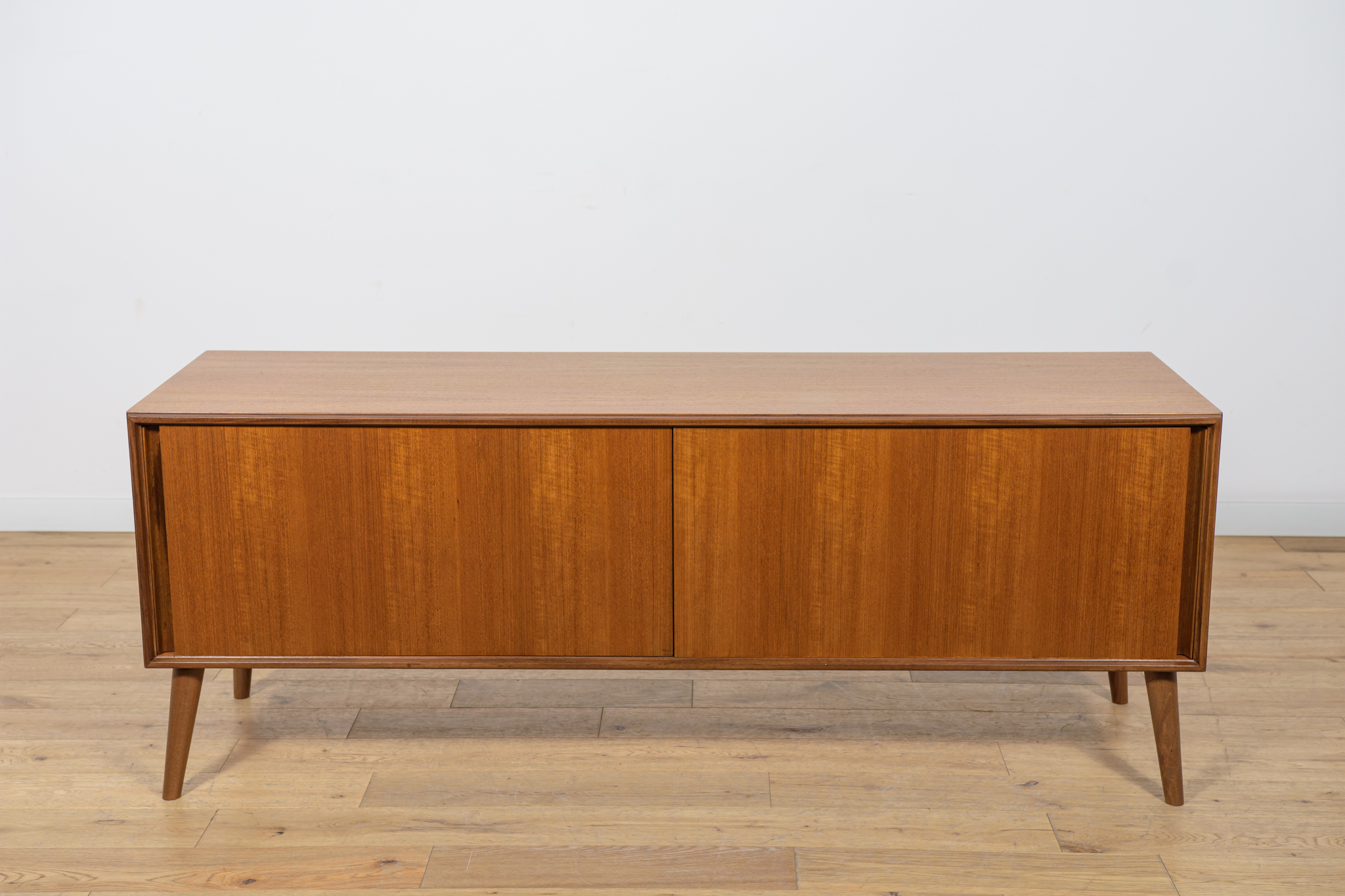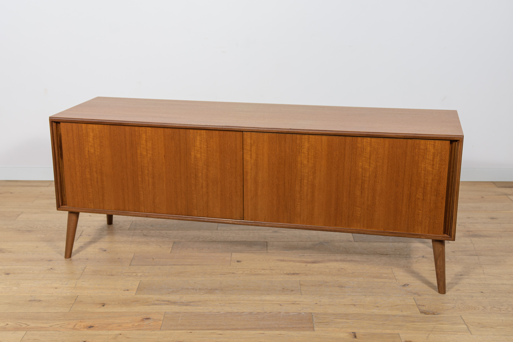 Sideboard wyprodukowany w brytyjskiej manufakturze G-Plan w latach 60. Wykonany z drewna teakowego. Komoda składa się z dwóch przesuwnych drzwi. Całość jest po kompleksowej renowacji stolarskiej. Drewno zostało oczyszczone ze starej powierzchni, barwiony bejcą dębową, wykończona mocnym półmatowym lakierem.