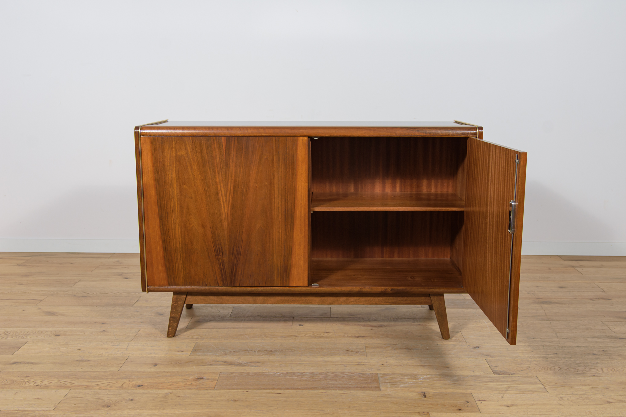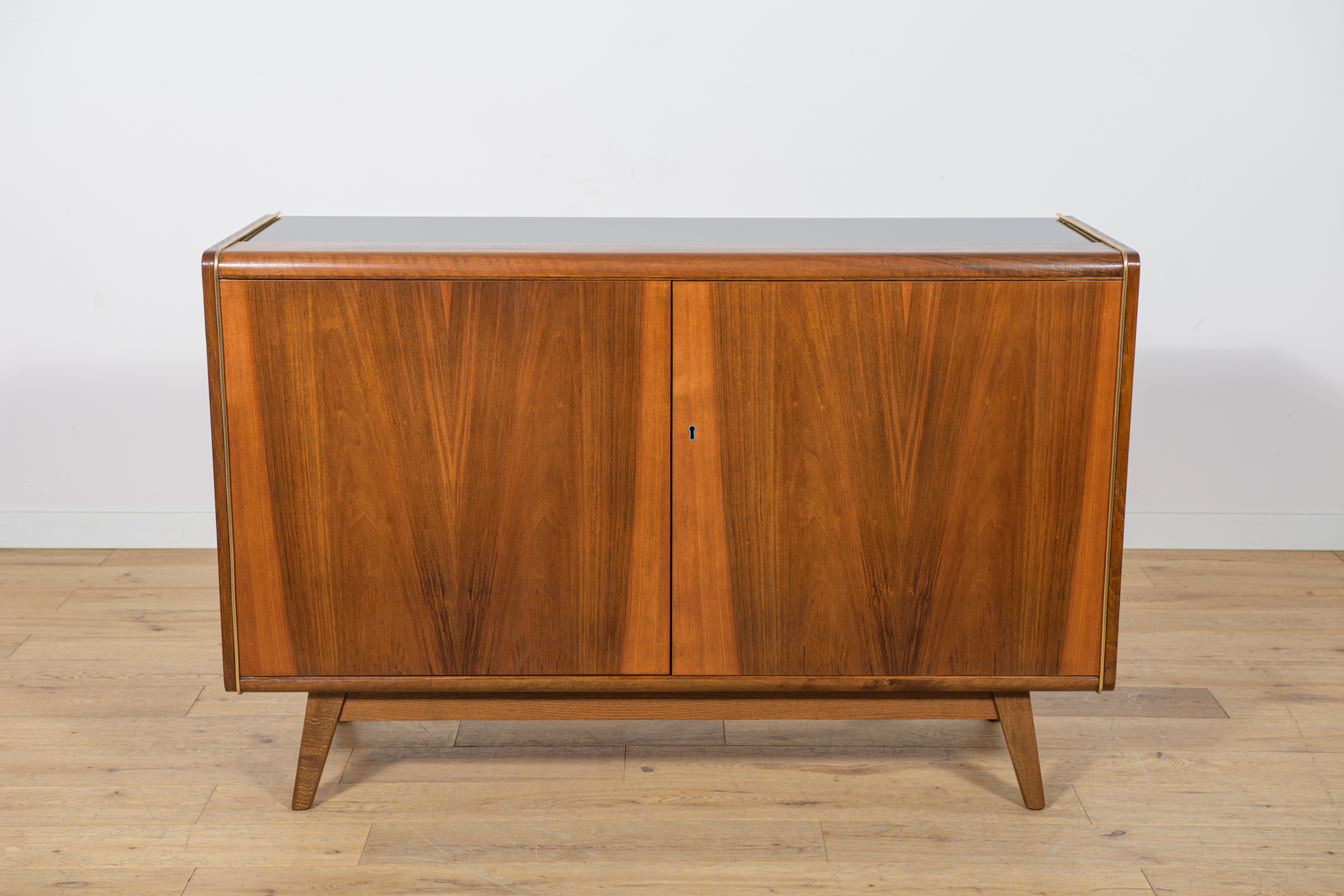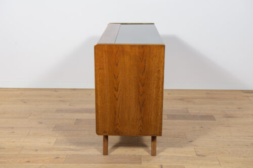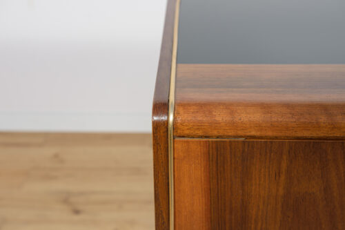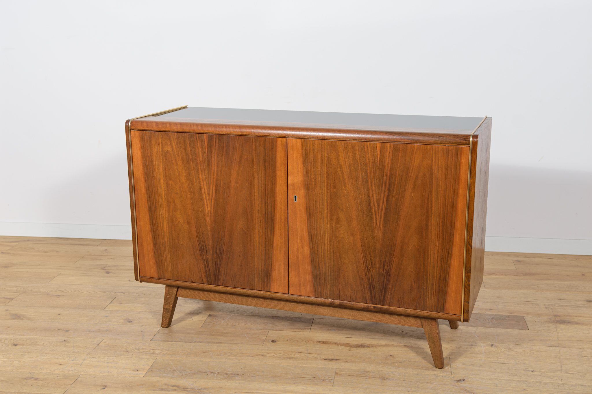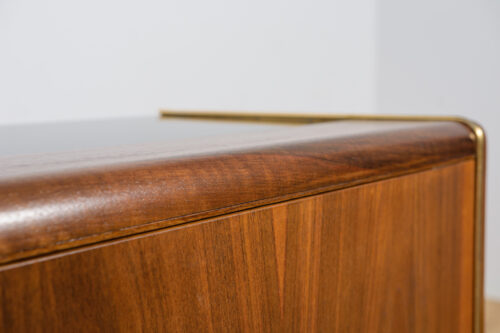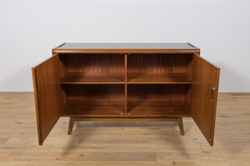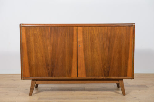 Komoda została zaprojektowana przez Bohumila Landsmana i Huberta Nepoziteka w latach 60. Została wyprodukowana przez fabrykę mebli Jitona Soběslav w Czechosłowacji. Komoda wyprodukowana z drewna bukowego, fornirowana orzechem (front i góra) i dębem (boki). Komoda z dwoma drzwiczkami, w środku znajdują się dwie półki. Mebel posiada złote, aluminiowe ozdobne ukucia. Komoda po kompleksowej renowacji stolarskiej, oczyszczona ze starej powierzchni, wykończona wysokogatunkowym duńskim olejem. Szyba została wymieniona na nową.