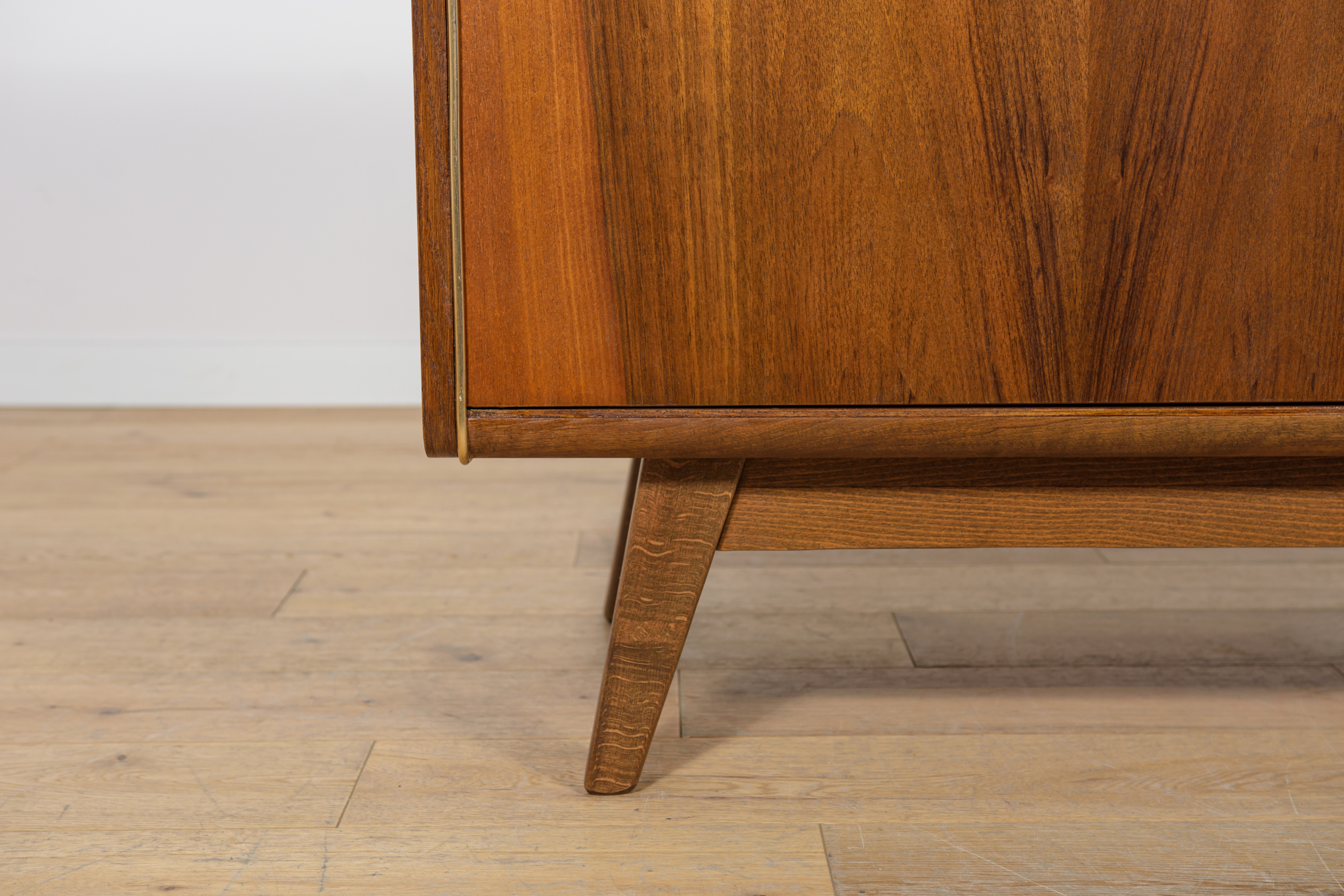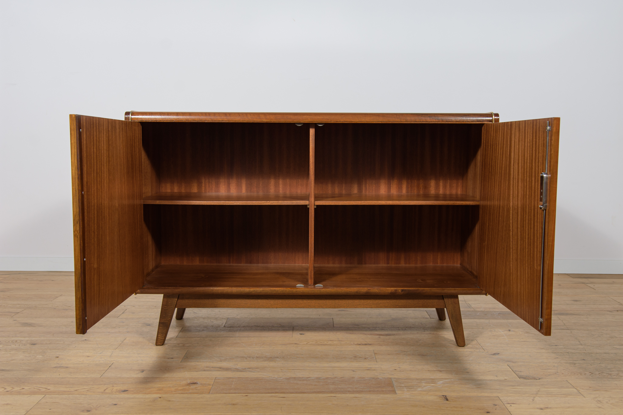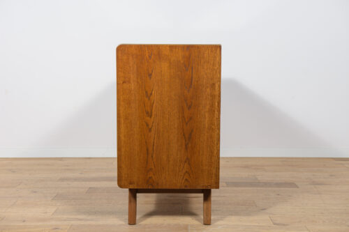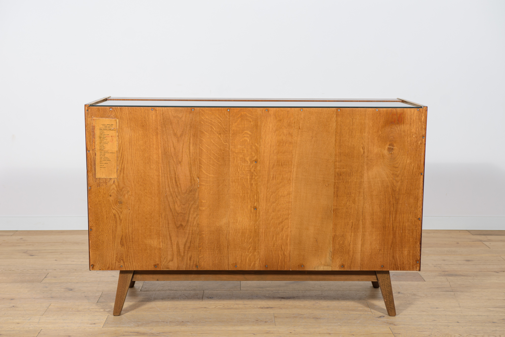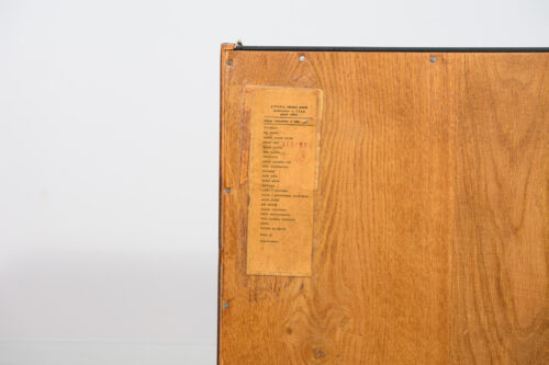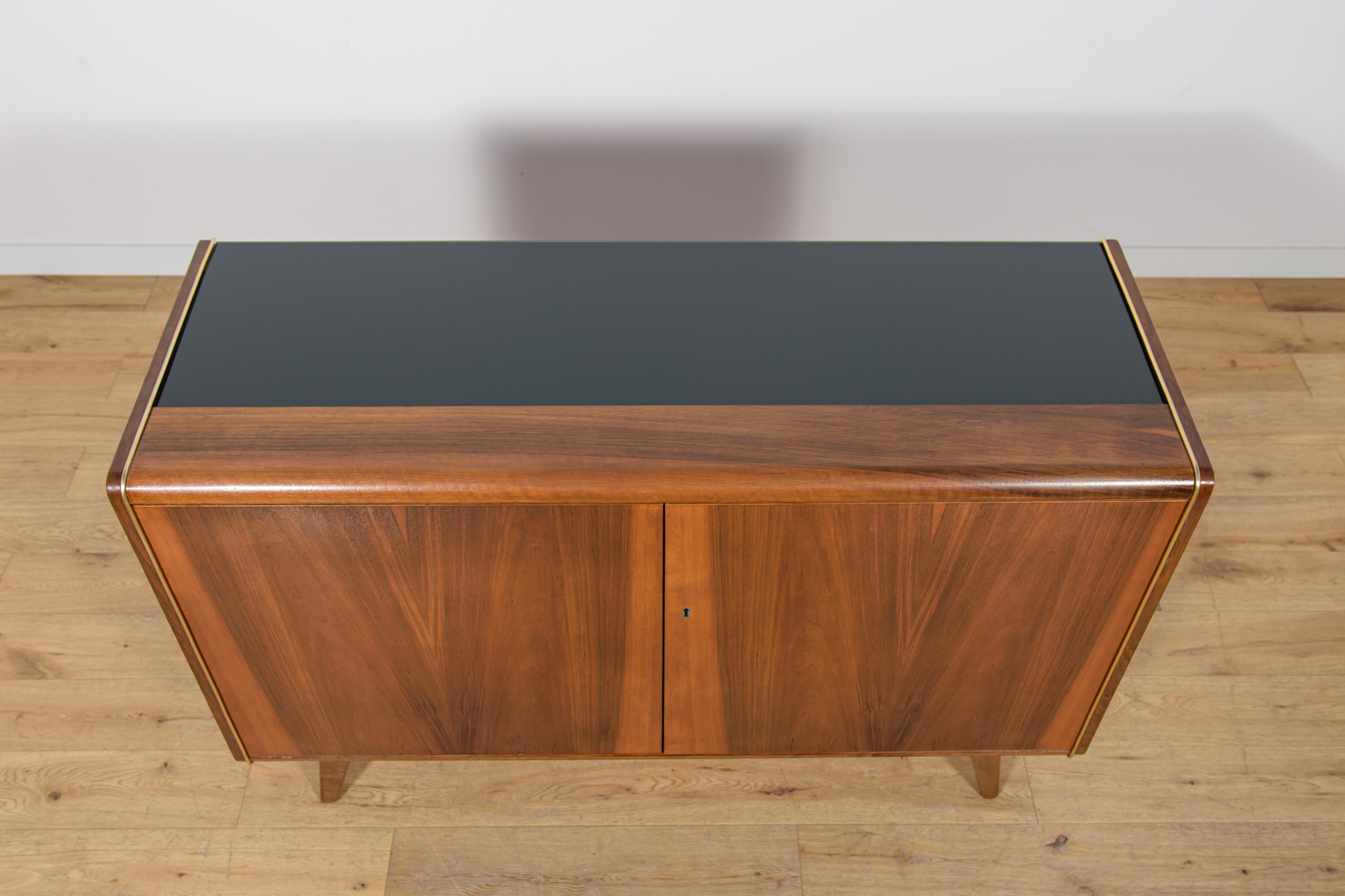 Komoda została zaprojektowana przez Bohumila Landsmana i Huberta Nepoziteka w latach 60. Została wyprodukowana przez fabrykę mebli Jitona Soběslav w Czechosłowacji. Komoda wyprodukowana z drewna bukowego, fornirowana orzechem (front i góra) i dębem (boki). Komoda z dwoma drzwiczkami, w środku znajdują się dwie półki. Mebel posiada złote, aluminiowe ozdobne ukucia. Komoda po kompleksowej renowacji stolarskiej, oczyszczona ze starej powierzchni, wykończona wysokogatunkowym duńskim olejem. Szyba została wymieniona na nową.