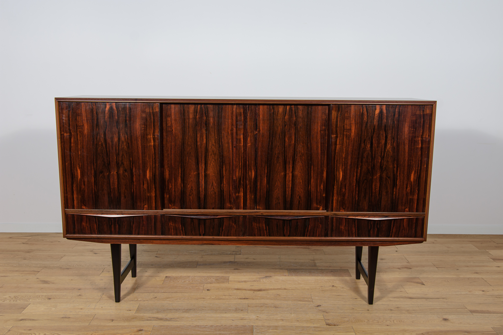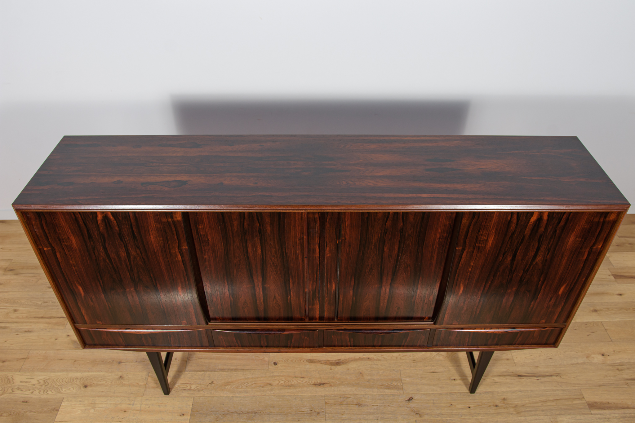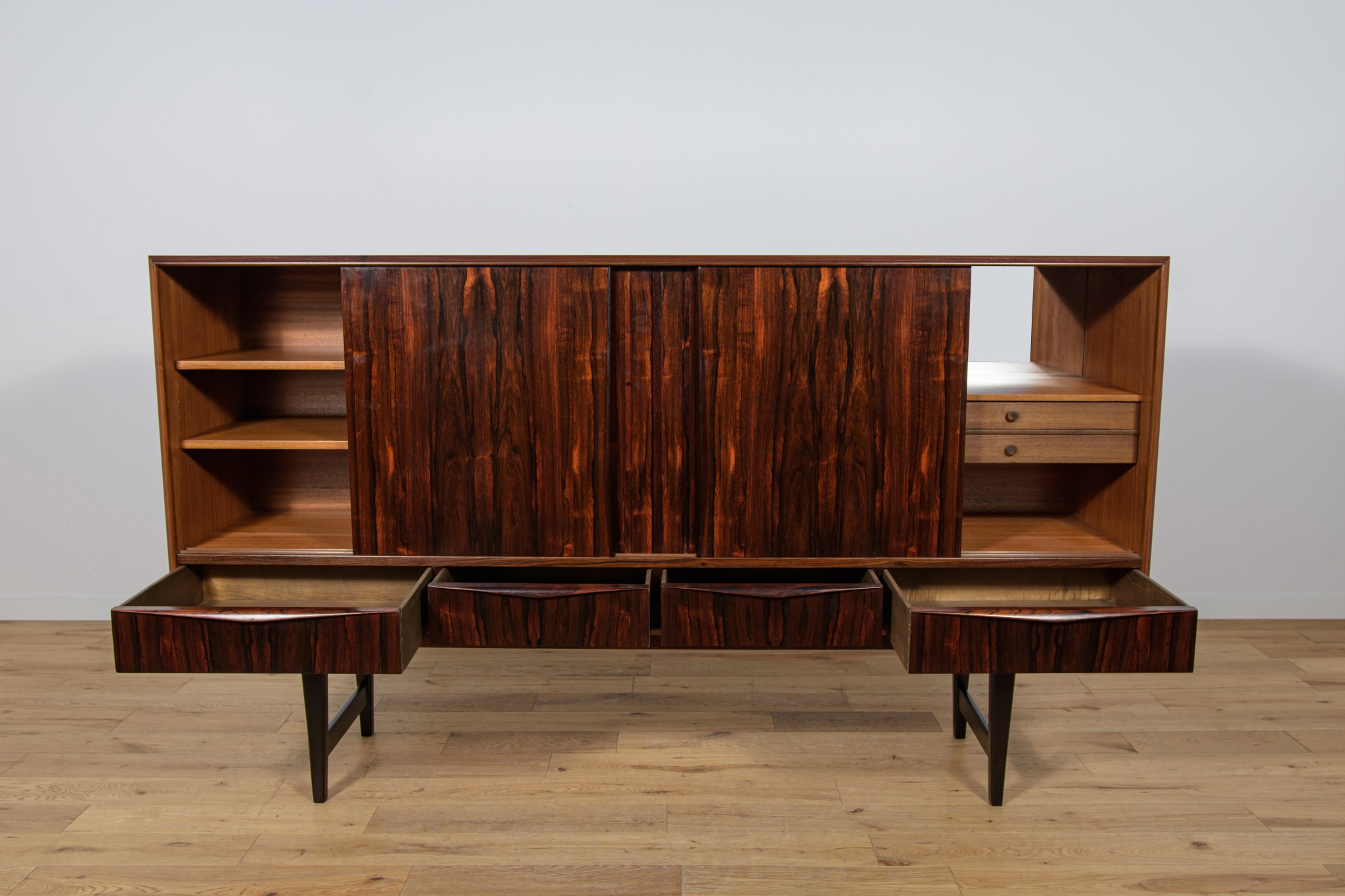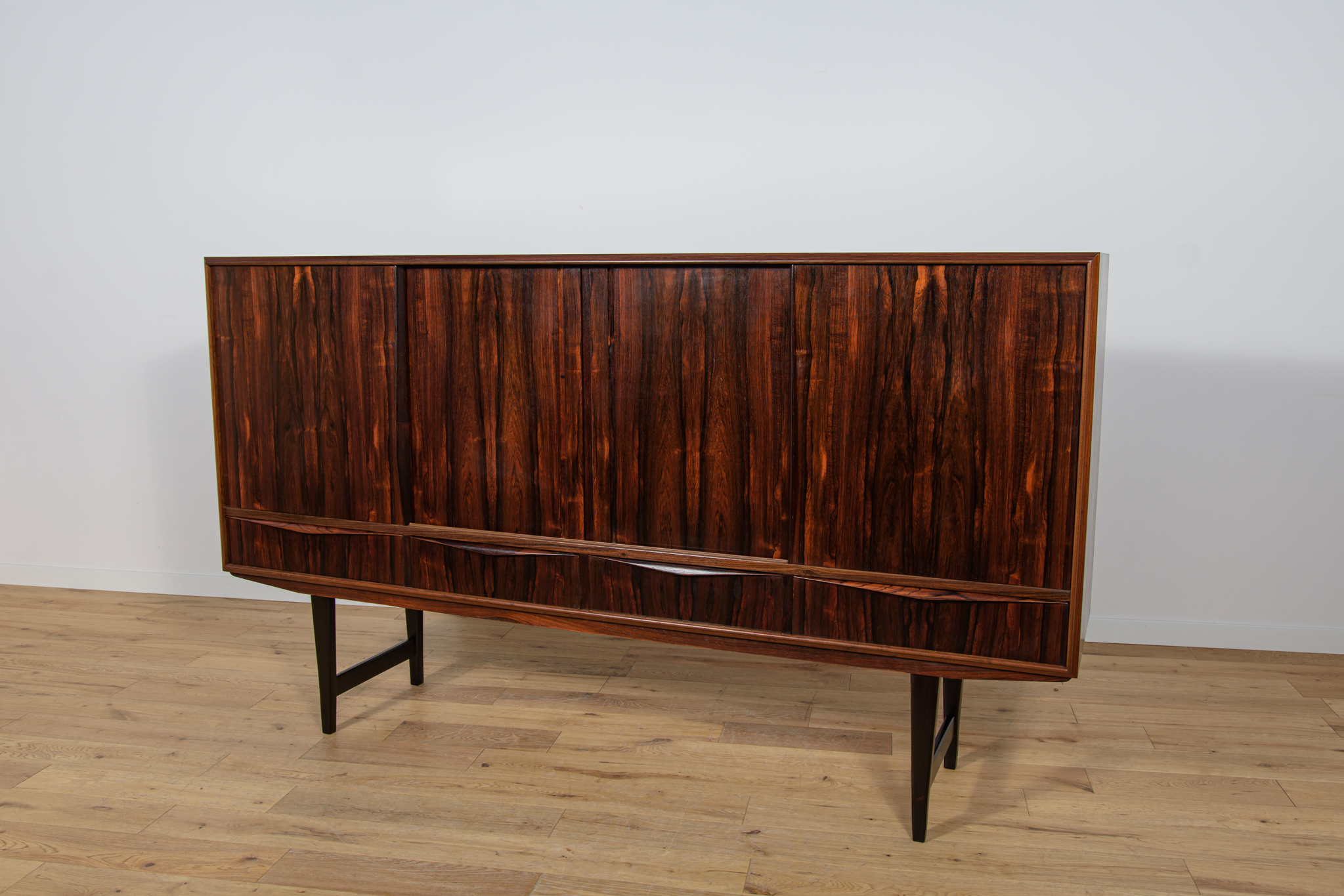 Highboard został zaprojektowany przez E. W. Bach dla duńskiej manufaktury Sejling Skabe w latach 60. Komoda wykonana z drewna palisandrowego, z wyprofilowanymi uchwytami. Komoda składa się z czterech szuflad umieszczonych na dole i czterech przesuwnych drzwi u góry. W górnej części znajdują się półki, barek i dwie szuflady. Całość jest po kompleksowej renowacji stolarskiej. Mebel został oczyszczony ze starej powłoki, wykończony olejem Danish Oil