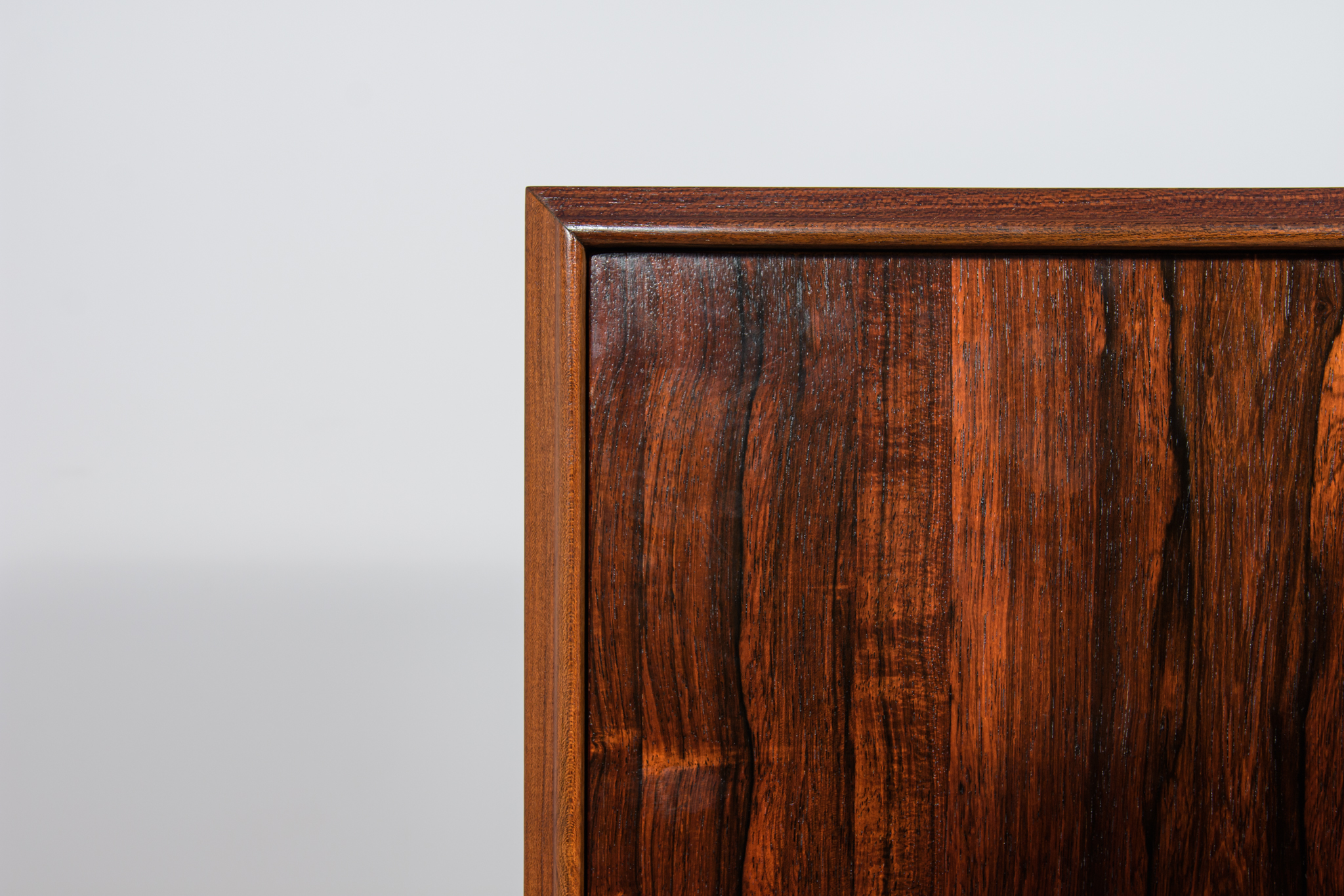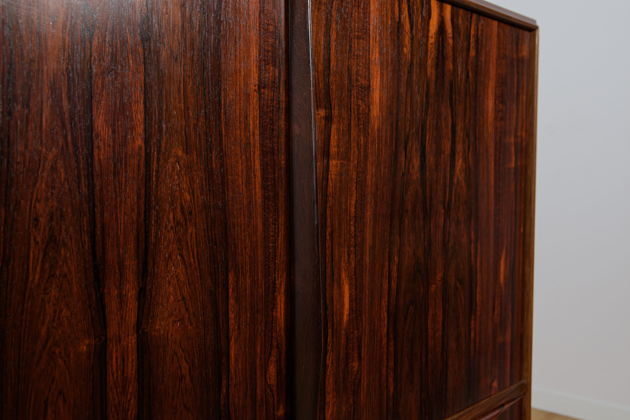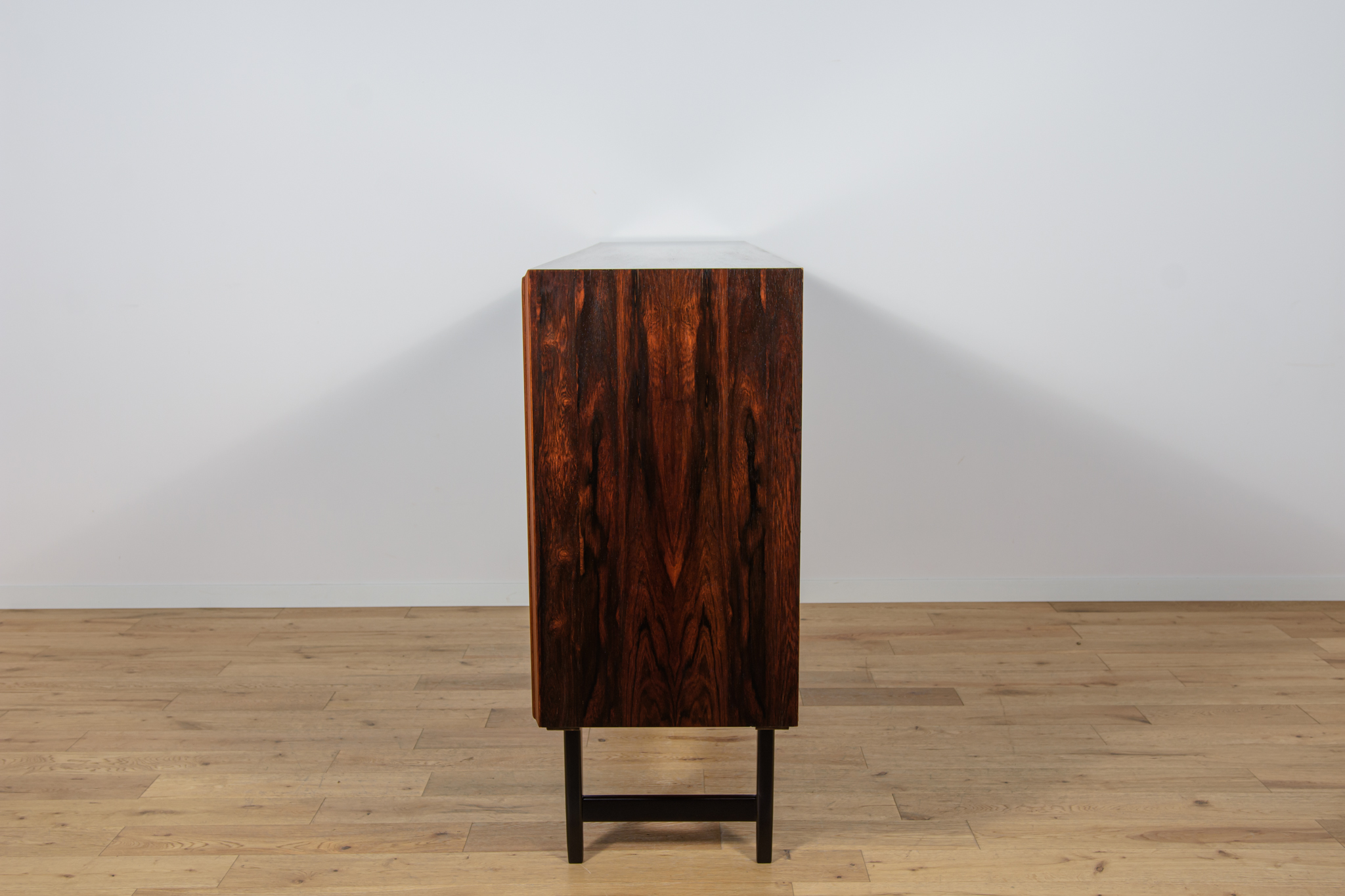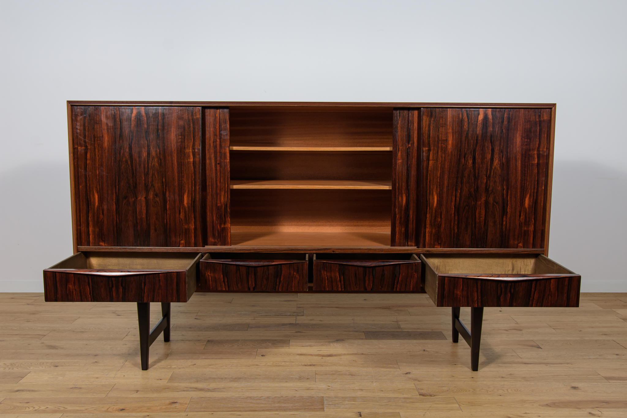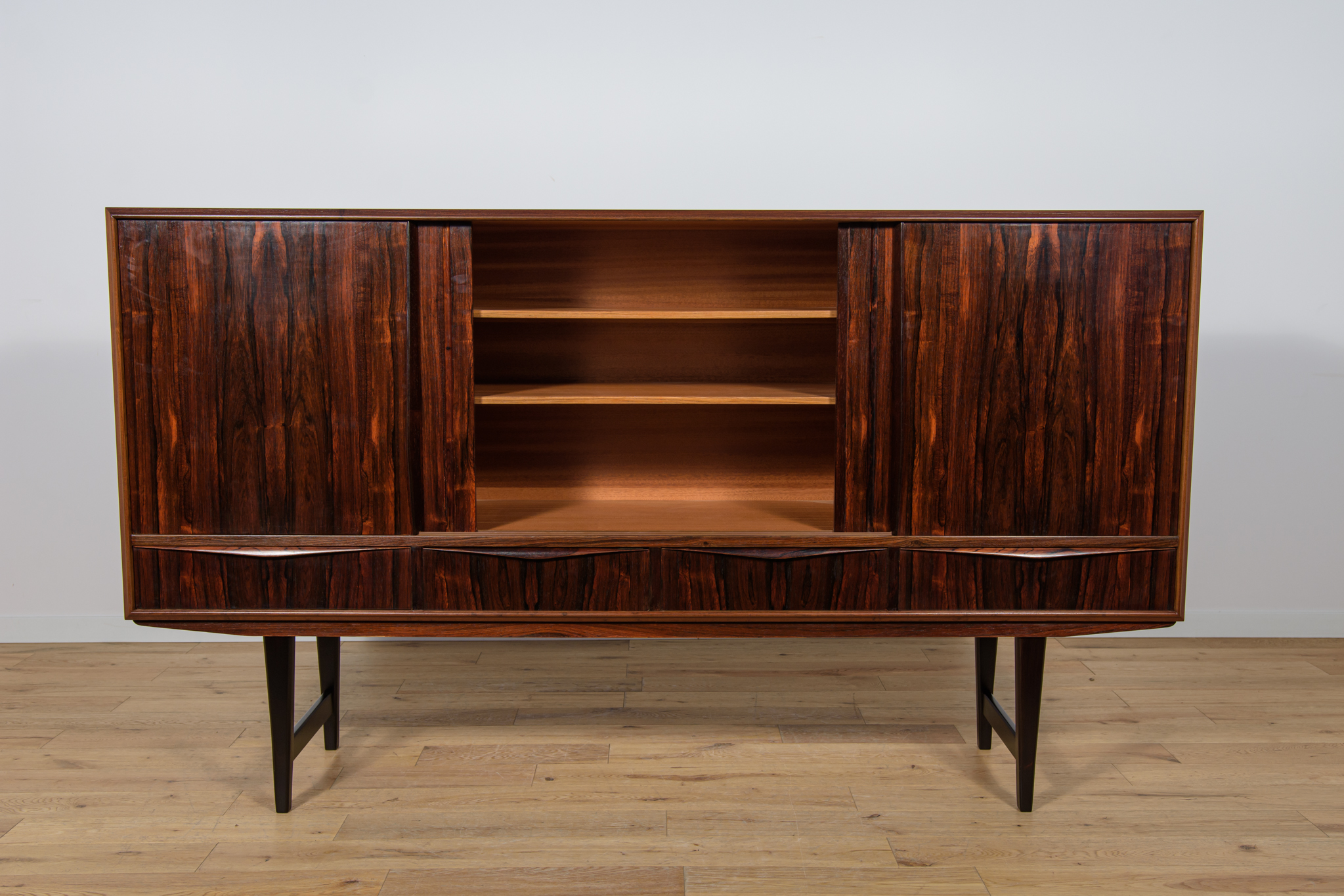 Highboard został zaprojektowany przez E. W. Bach dla duńskiej manufaktury Sejling Skabe w latach 60. Komoda wykonana z drewna palisandrowego, z wyprofilowanymi uchwytami. Komoda składa się z czterech szuflad umieszczonych na dole i czterech przesuwnych drzwi u góry. W górnej części znajdują się półki, barek i dwie szuflady. Całość jest po kompleksowej renowacji stolarskiej. Mebel został oczyszczony ze starej powłoki, wykończony olejem Danish Oil