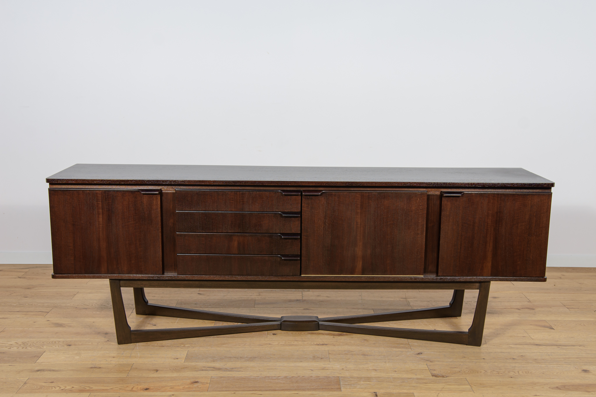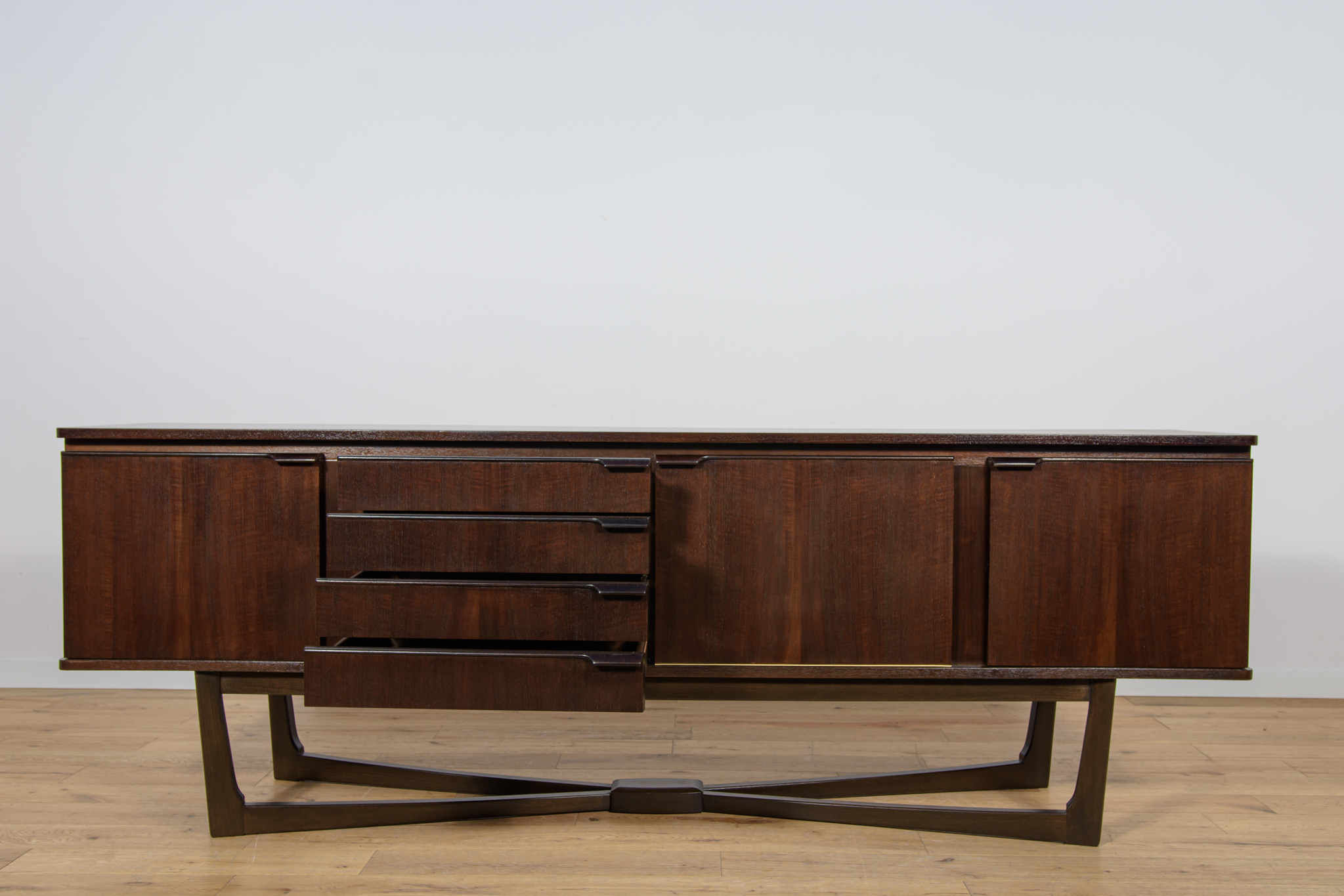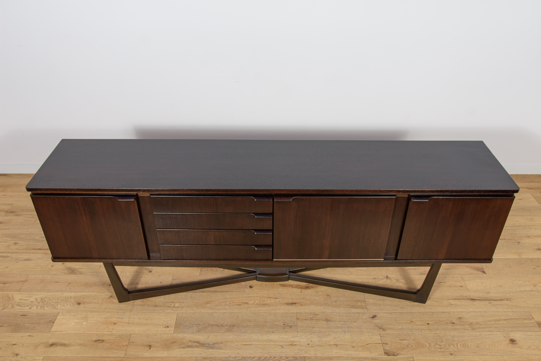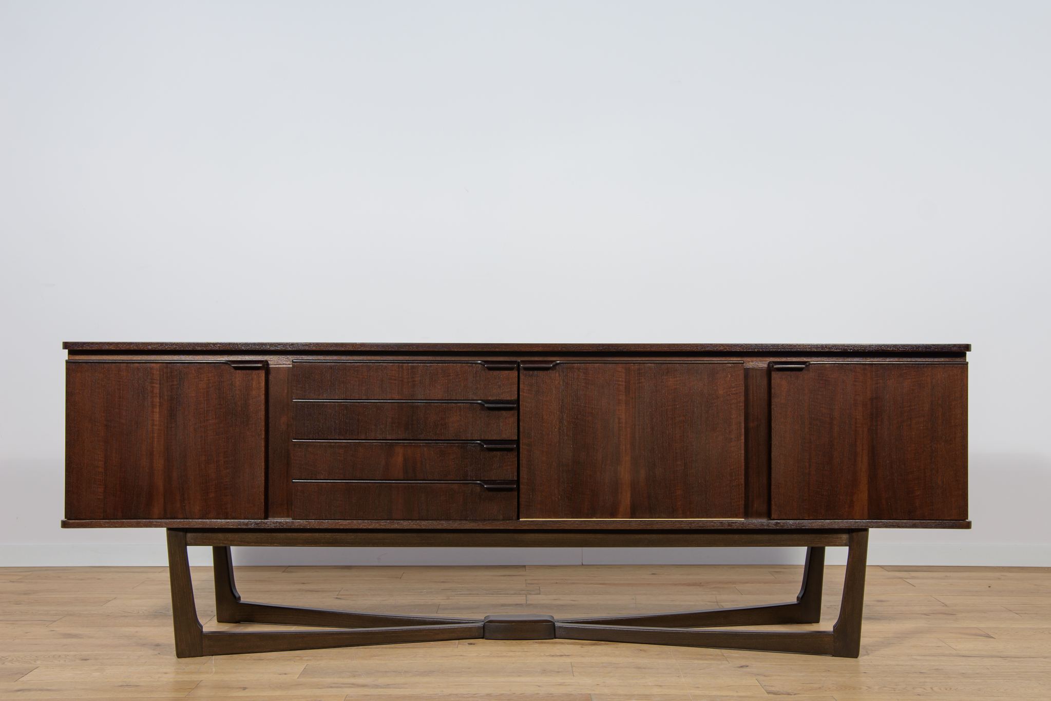 Sideboard wyprodukowany w brytyjskiej manufakturze Stonehill w latach 60. Uniktowy mebel z drewna teakowego z wyprofilowanymi uchwytami, osadzony na charakterystycznych płozach. Komoda posiada cztery szuflady oraz dwie szafki i barek. Całość jest po kompleksowej renowacji stolarskiej. Mebel wyprodukowany z drewna teak został oczyszczony ze starej powłoki, barwiony bejcą palisandrową, wykończony mocnym półmatowym lakierem.