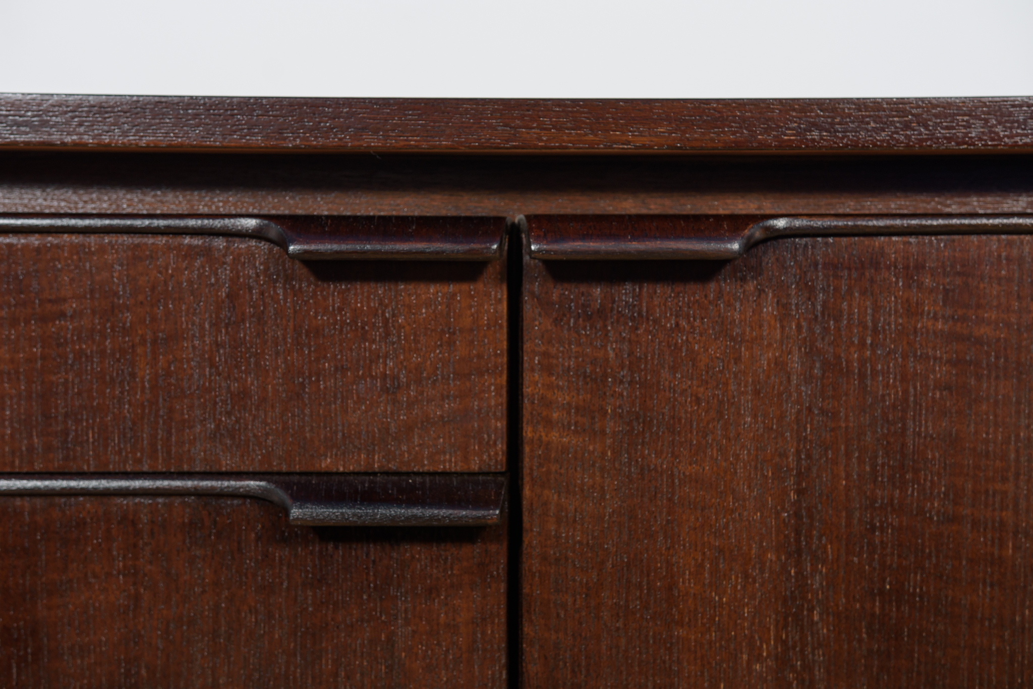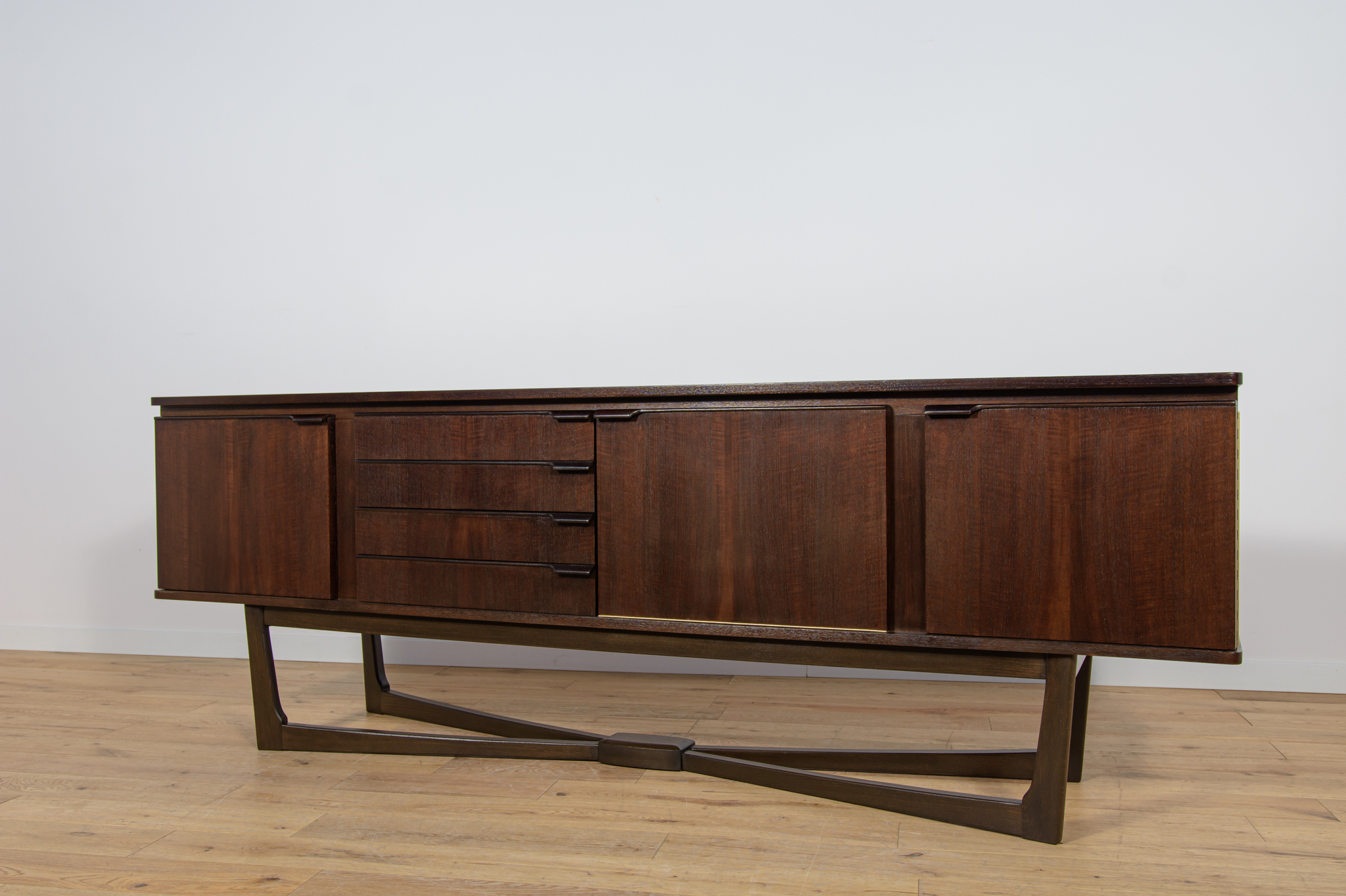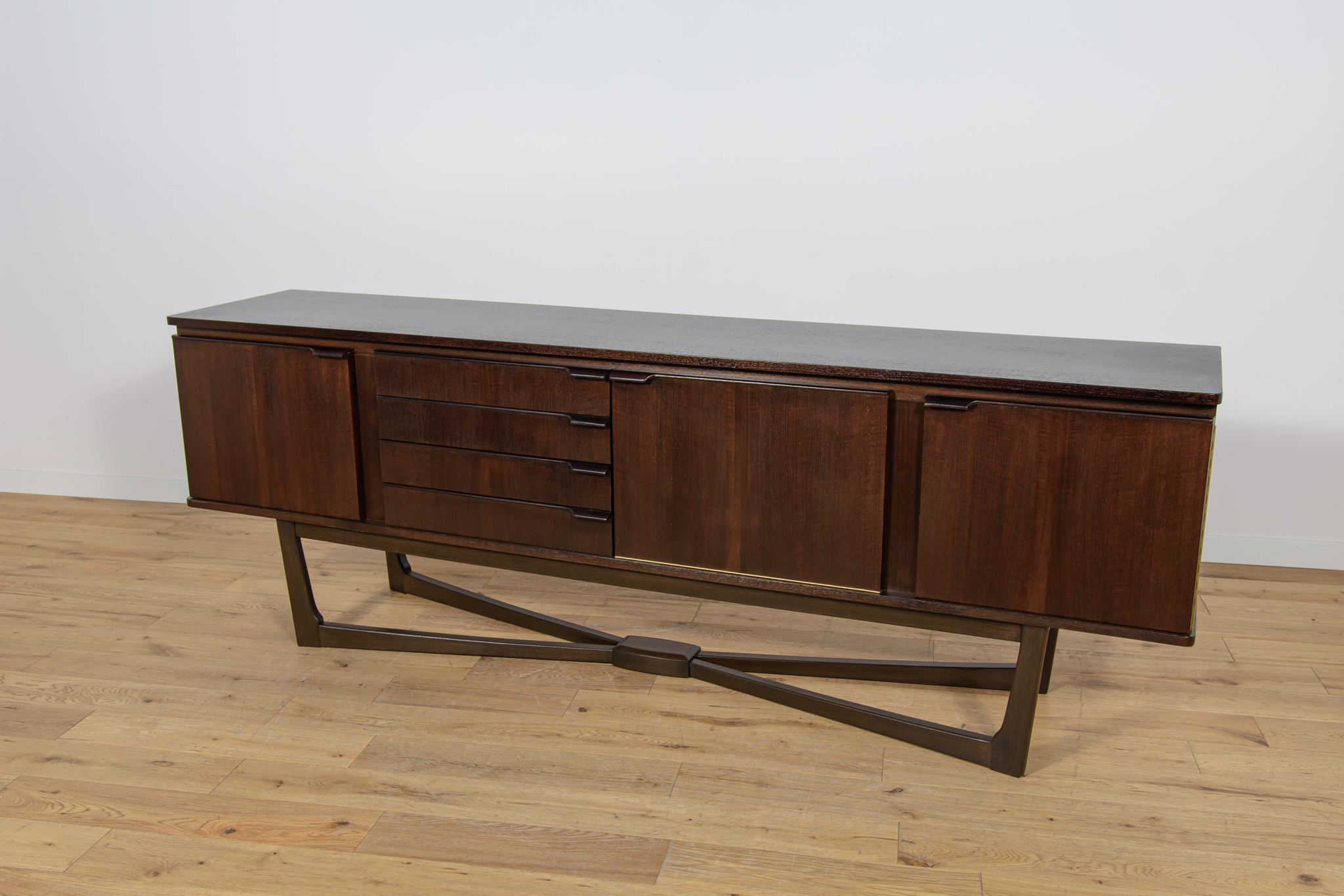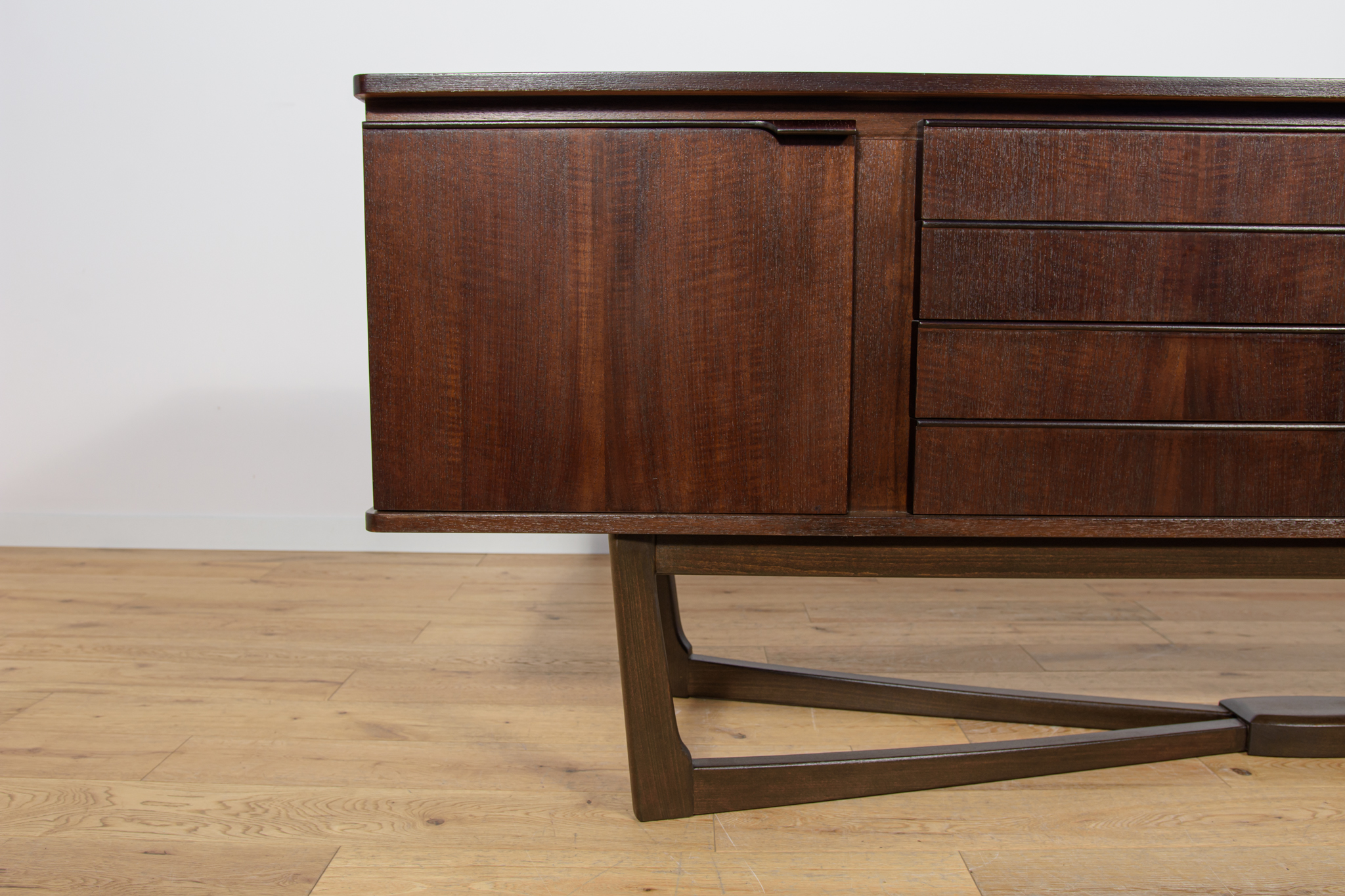 Sideboard wyprodukowany w brytyjskiej manufakturze Stonehill w latach 60. Uniktowy mebel z drewna teakowego z wyprofilowanymi uchwytami, osadzony na charakterystycznych płozach. Komoda posiada cztery szuflady oraz dwie szafki i barek. Całość jest po kompleksowej renowacji stolarskiej. Mebel wyprodukowany z drewna teak został oczyszczony ze starej powłoki, barwiony bejcą palisandrową, wykończony mocnym półmatowym lakierem.