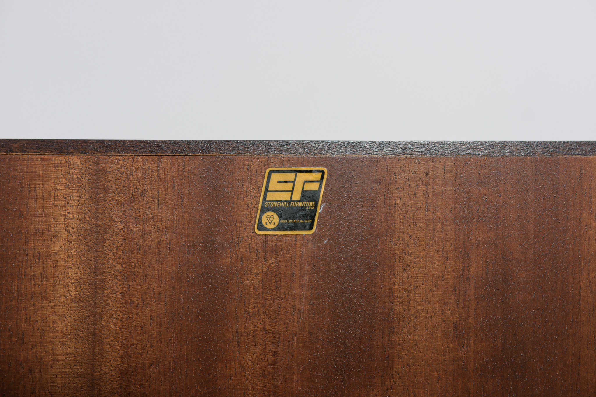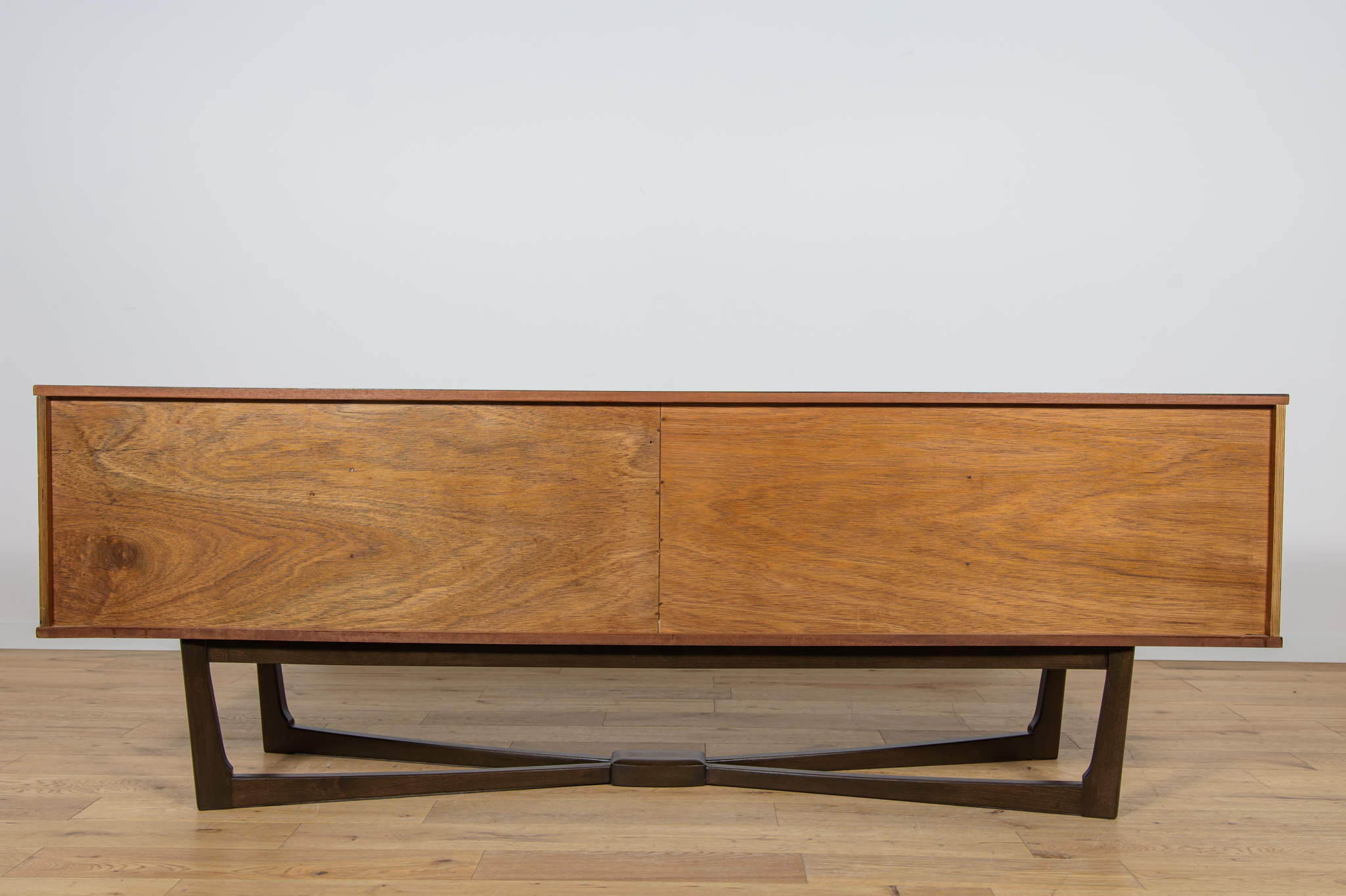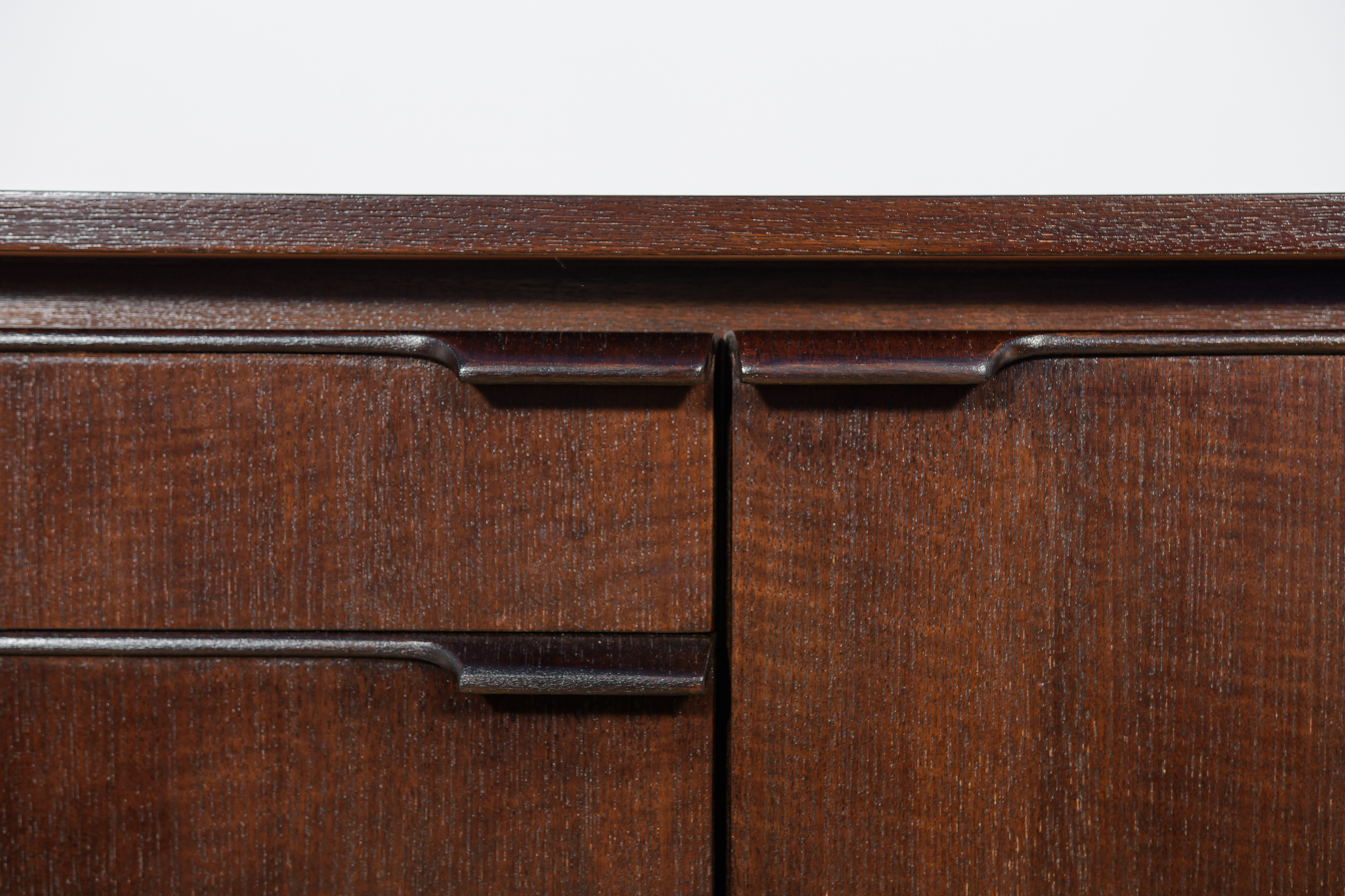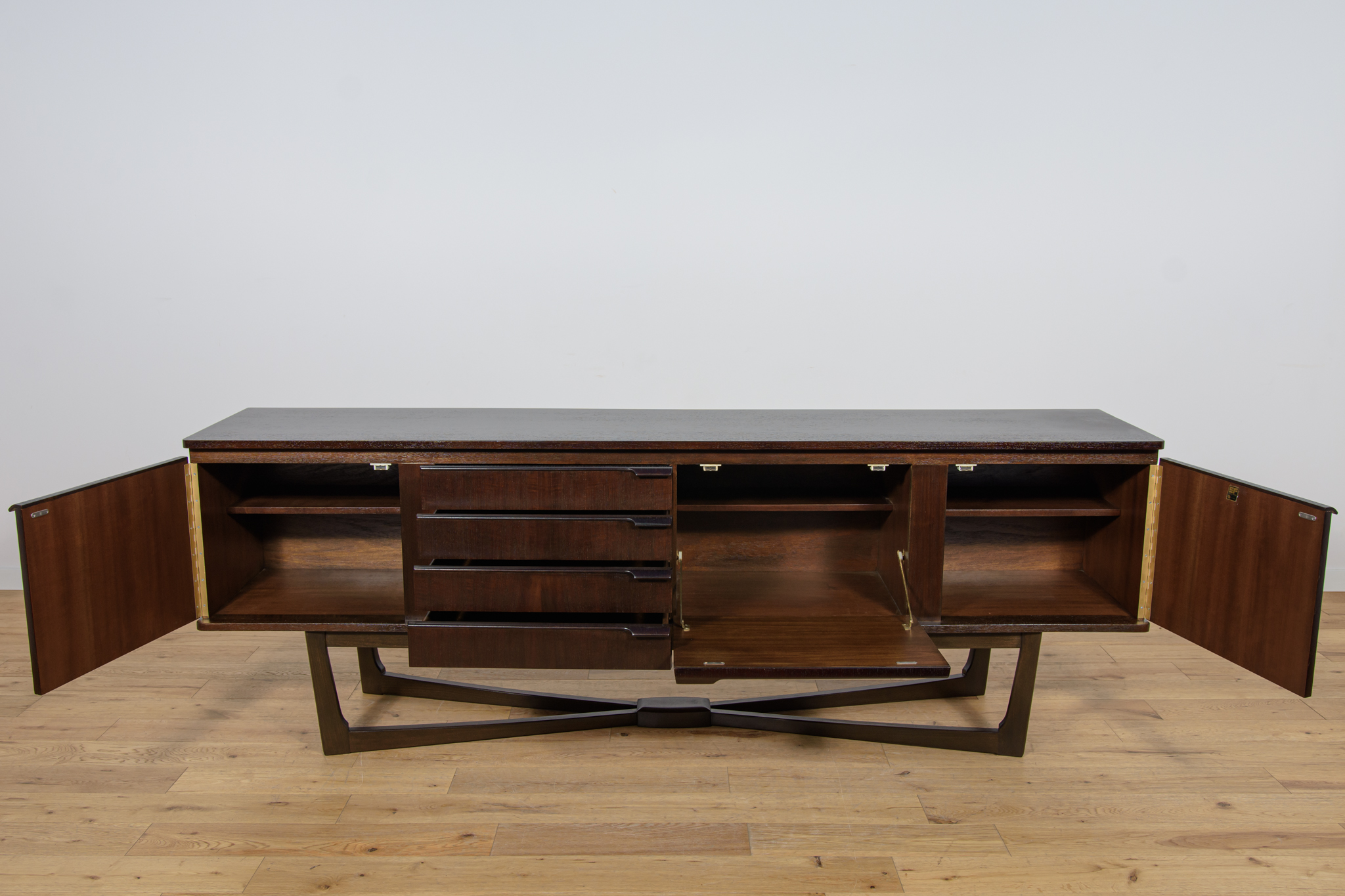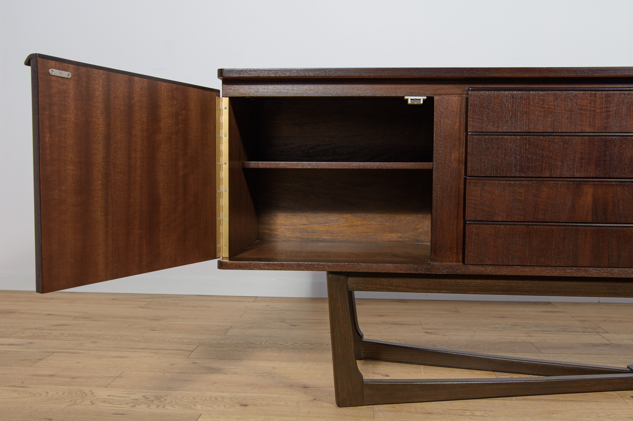 Sideboard wyprodukowany w brytyjskiej manufakturze Stonehill w latach 60. Uniktowy mebel z drewna teakowego z wyprofilowanymi uchwytami, osadzony na charakterystycznych płozach. Komoda posiada cztery szuflady oraz dwie szafki i barek. Całość jest po kompleksowej renowacji stolarskiej. Mebel wyprodukowany z drewna teak został oczyszczony ze starej powłoki, barwiony bejcą palisandrową, wykończony mocnym półmatowym lakierem.