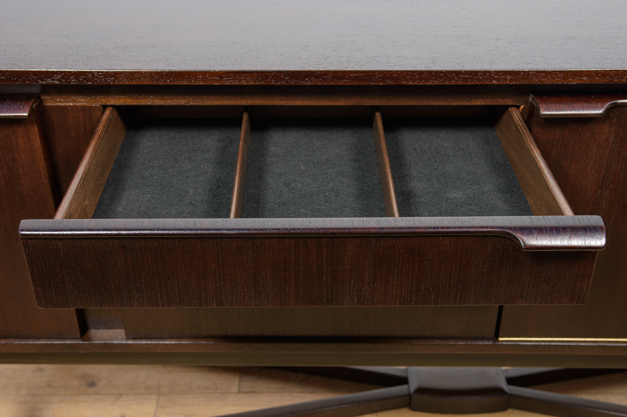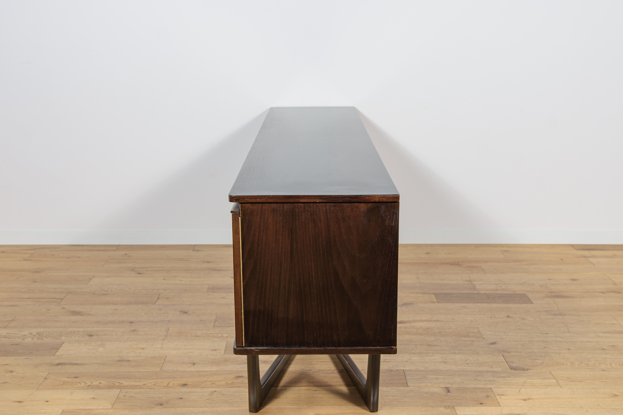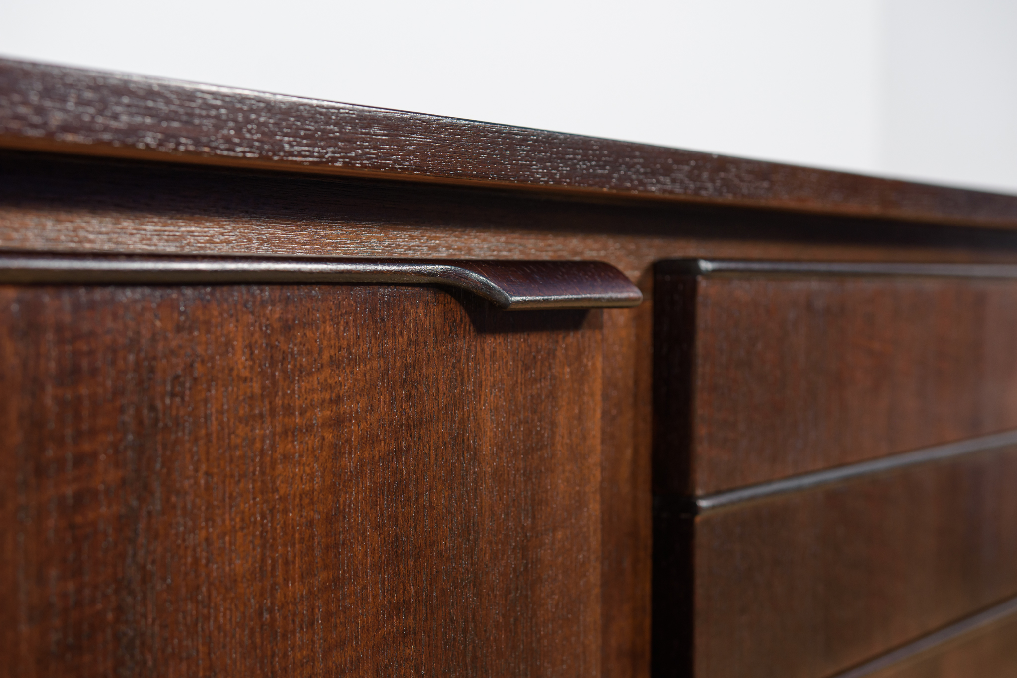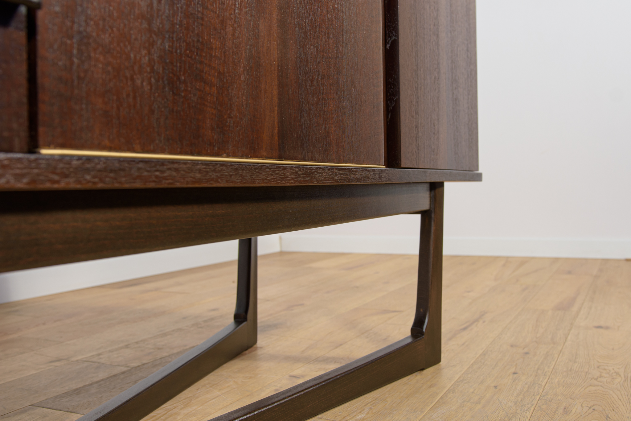 Sideboard wyprodukowany w brytyjskiej manufakturze Stonehill w latach 60. Uniktowy mebel z drewna teakowego z wyprofilowanymi uchwytami, osadzony na charakterystycznych płozach. Komoda posiada cztery szuflady oraz dwie szafki i barek. Całość jest po kompleksowej renowacji stolarskiej. Mebel wyprodukowany z drewna teak został oczyszczony ze starej powłoki, barwiony bejcą palisandrową, wykończony mocnym półmatowym lakierem.