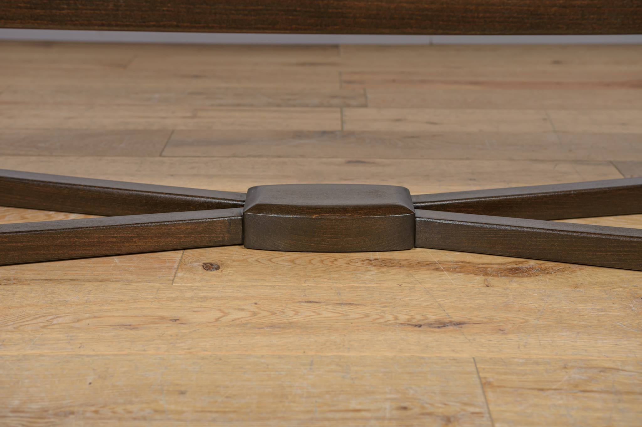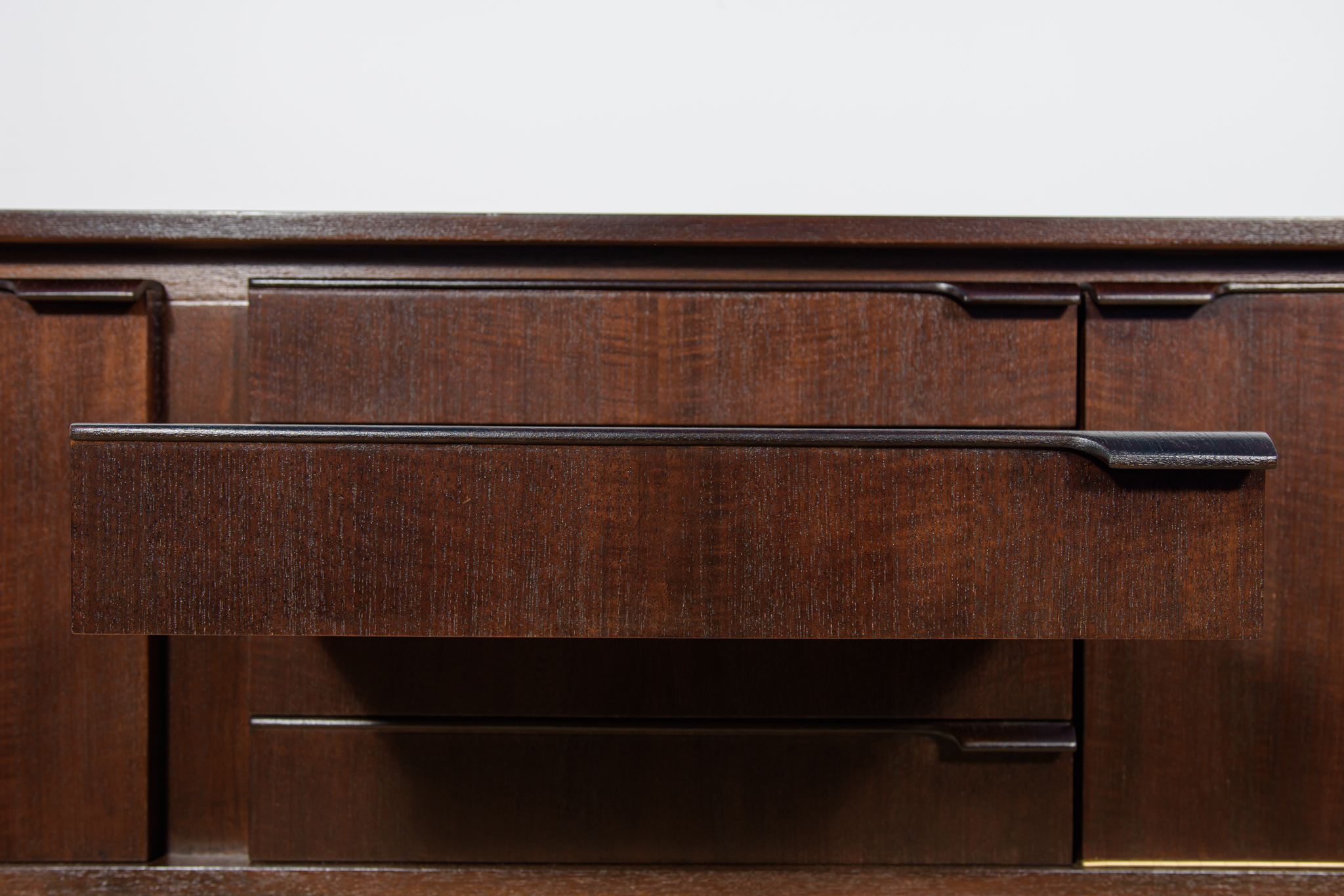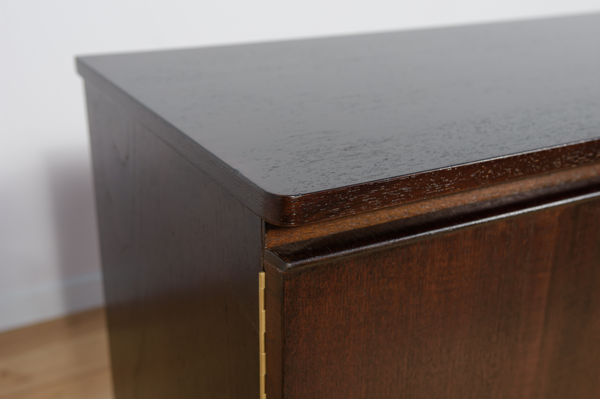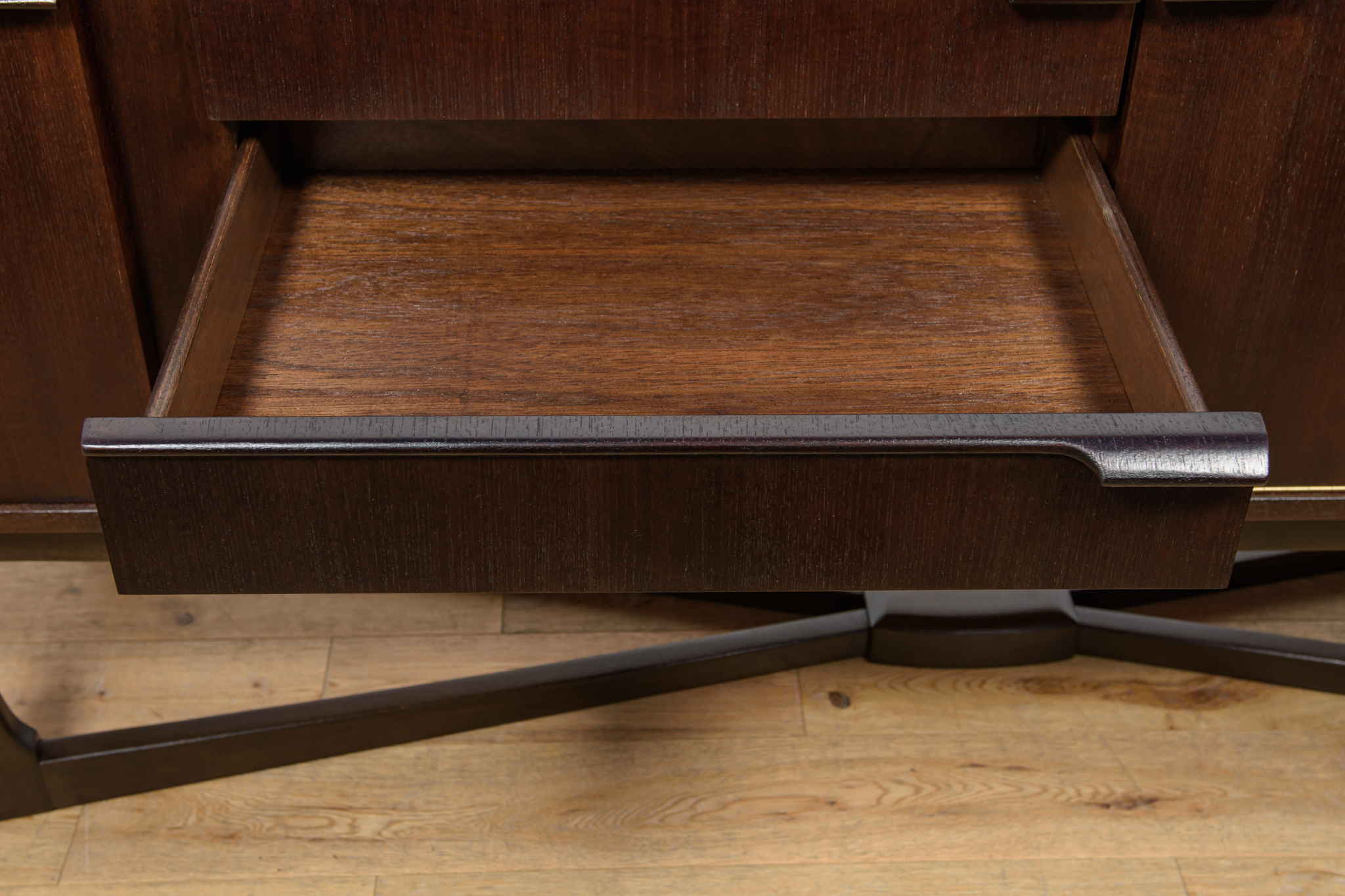 Sideboard wyprodukowany w brytyjskiej manufakturze Stonehill w latach 60. Uniktowy mebel z drewna teakowego z wyprofilowanymi uchwytami, osadzony na charakterystycznych płozach. Komoda posiada cztery szuflady oraz dwie szafki i barek. Całość jest po kompleksowej renowacji stolarskiej. Mebel wyprodukowany z drewna teak został oczyszczony ze starej powłoki, barwiony bejcą palisandrową, wykończony mocnym półmatowym lakierem.