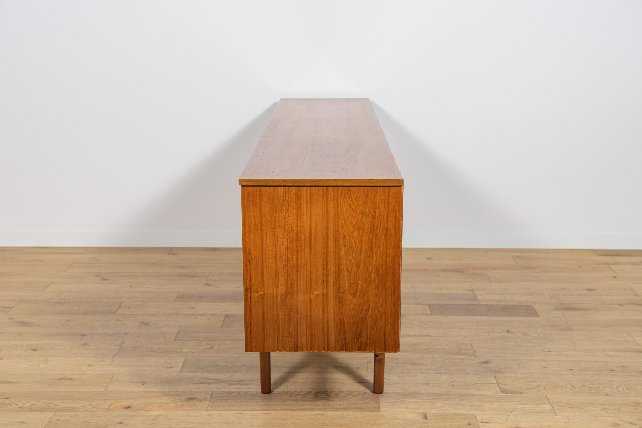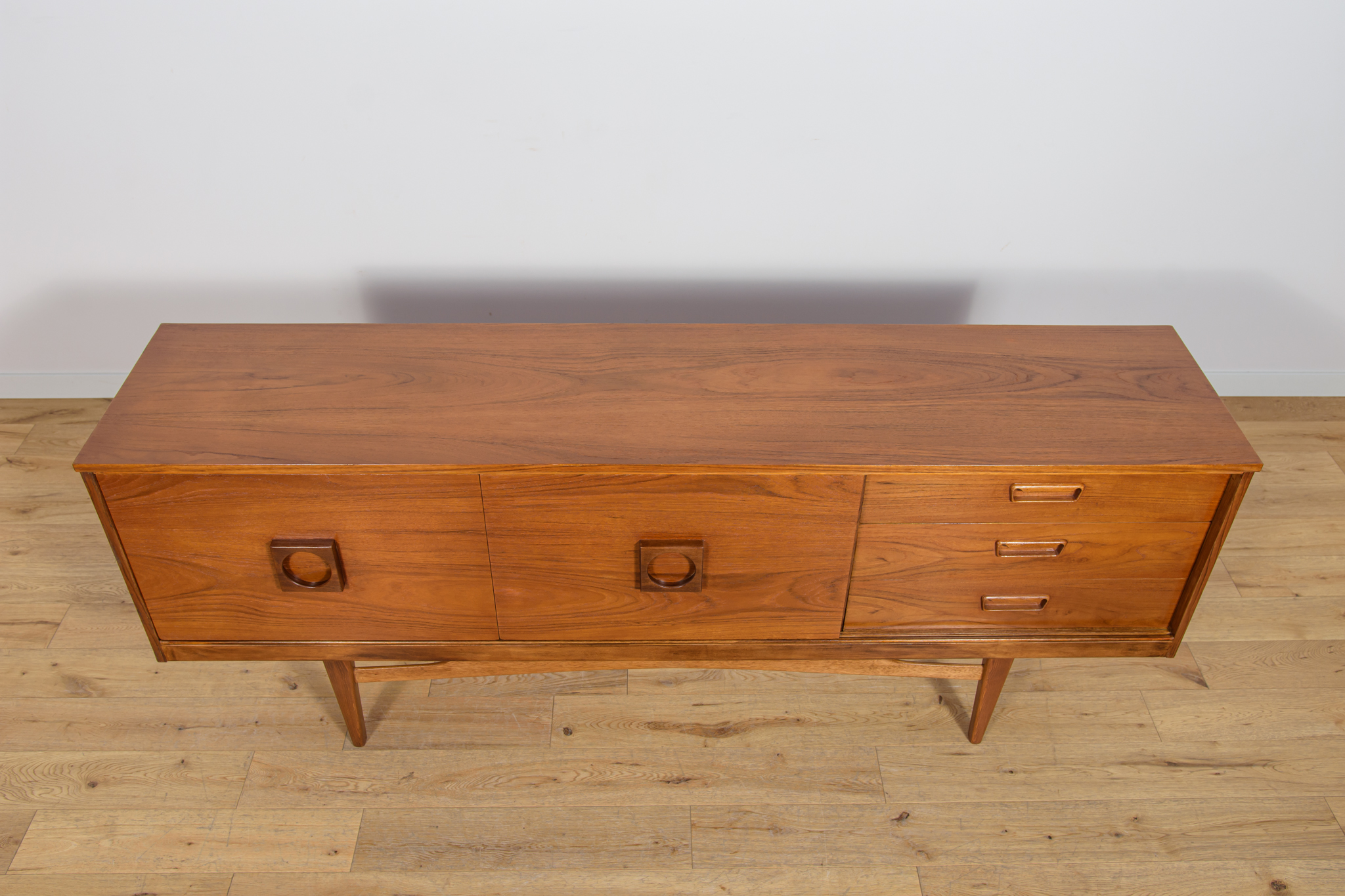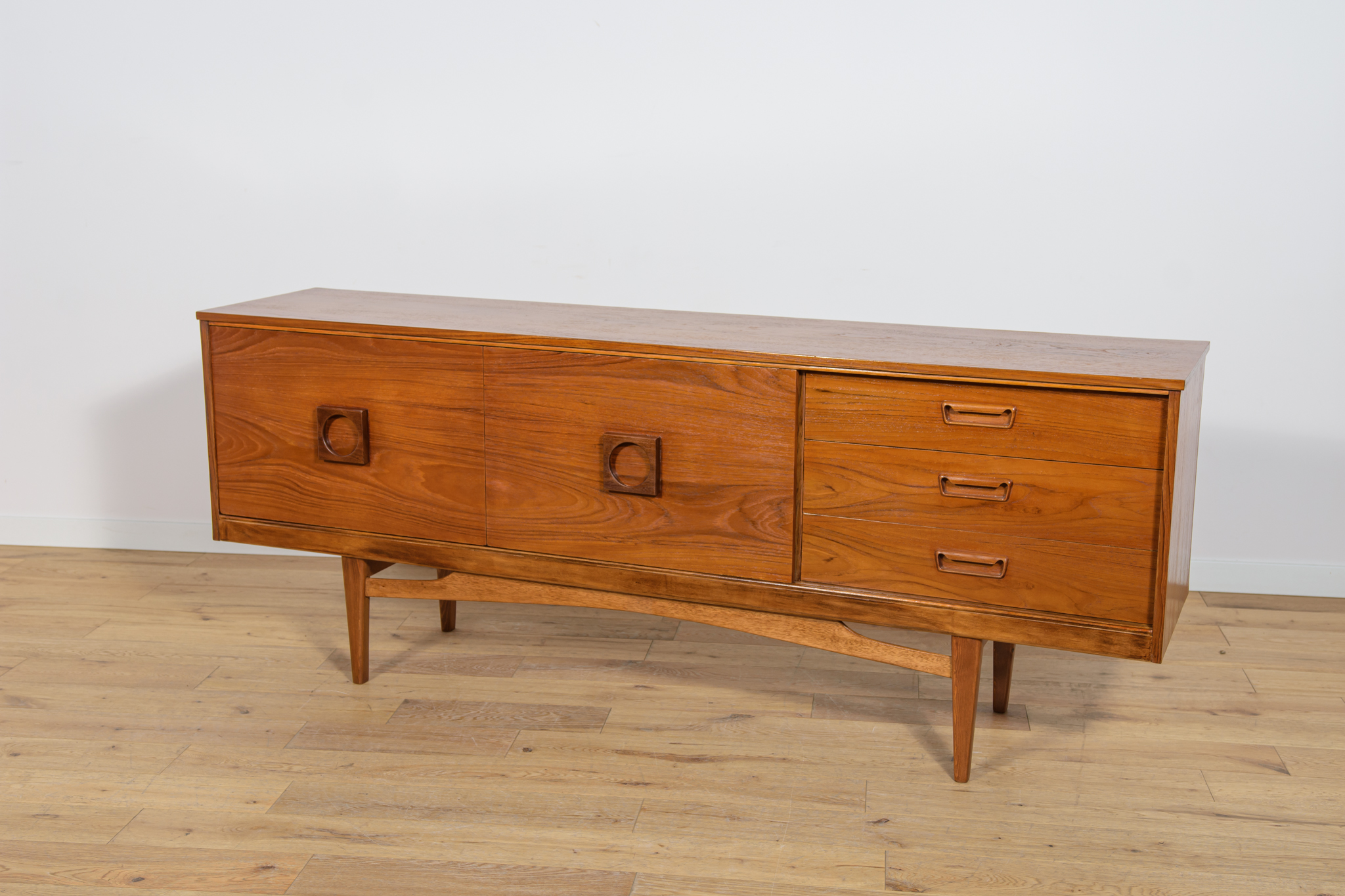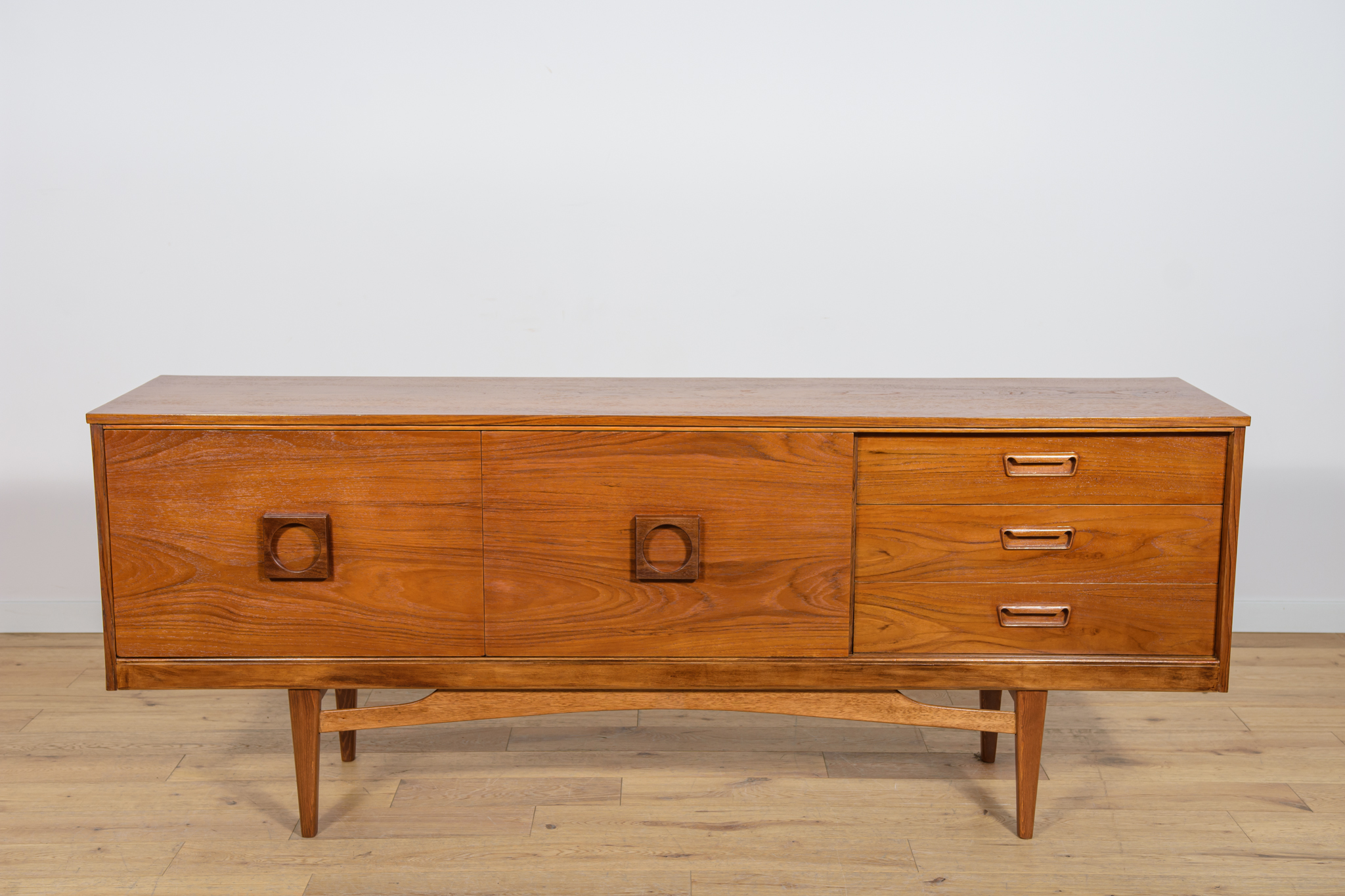Sideboard tekowy został wyprodukowany w Wielkiej Brytanii w latach 60. Komoda o unikatowym designie z wyprofilowanymi uchwytami z litego teaku. Posiada trzy szuflady po prawej stronie oraz dwie szafki po lewej zamykane przesuwnymi drzwiami. Całość jest po kompleksowej renowacji stolarskiej, wykończony wysokogatunkowym olejem duńskim.