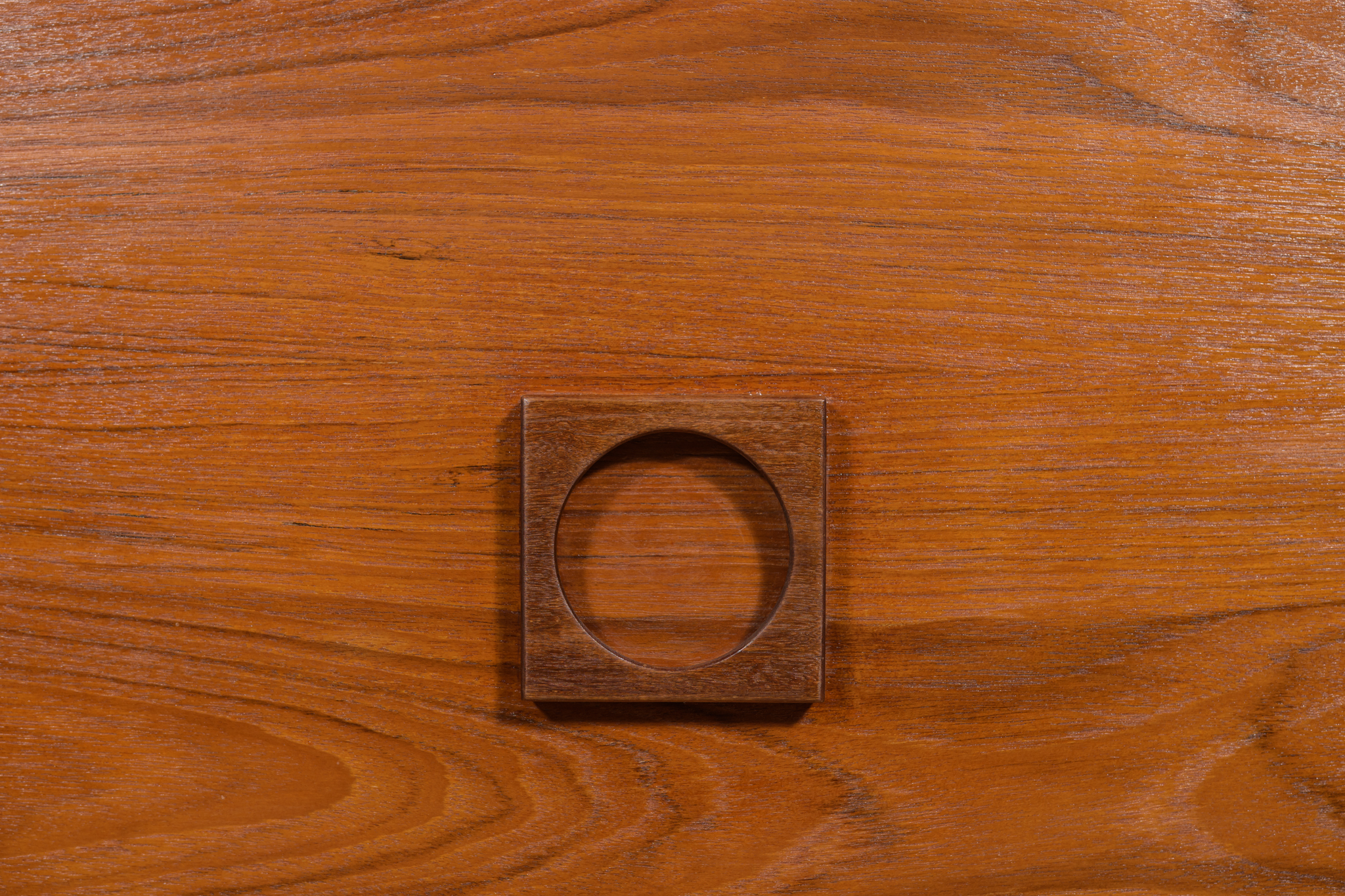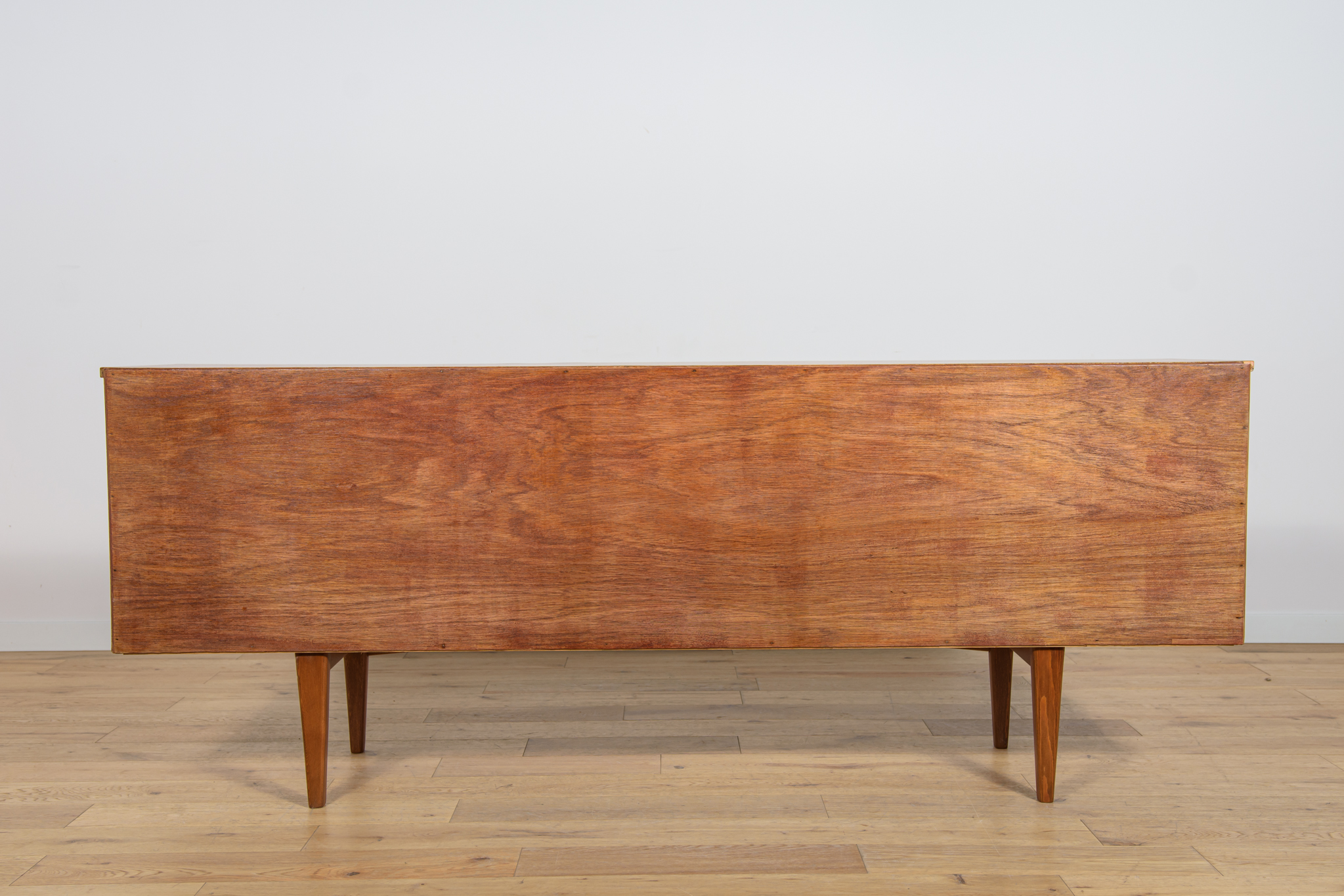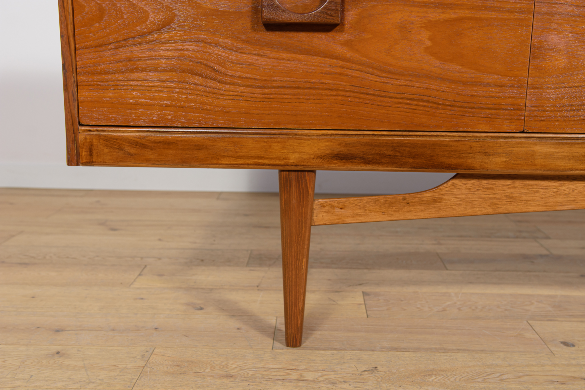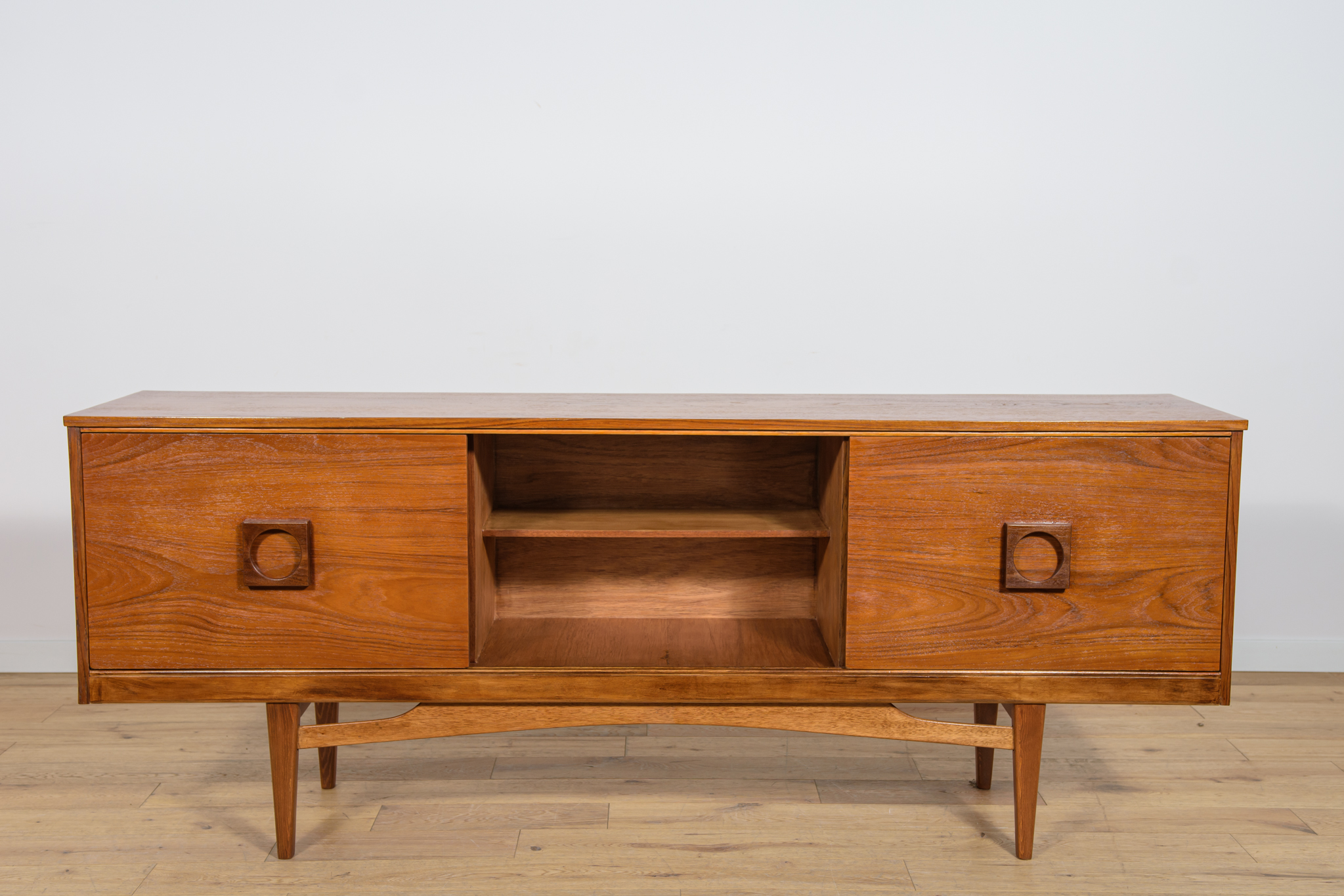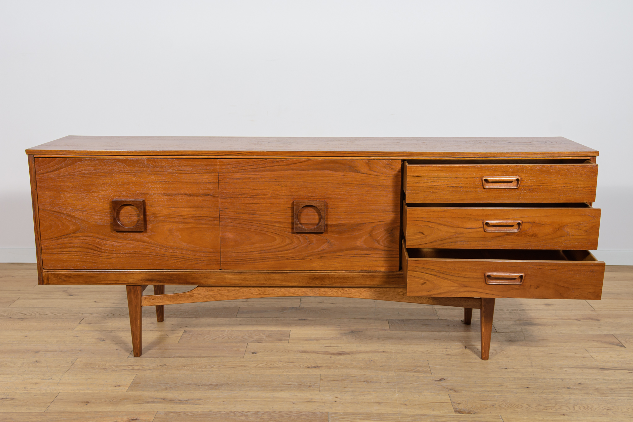 Sideboard tekowy został wyprodukowany w Wielkiej Brytanii w latach 60. Komoda o unikatowym designie z wyprofilowanymi uchwytami z litego teaku. Posiada trzy szuflady po prawej stronie oraz dwie szafki po lewej zamykane przesuwnymi drzwiami. Całość jest po kompleksowej renowacji stolarskiej, wykończony wysokogatunkowym olejem duńskim.