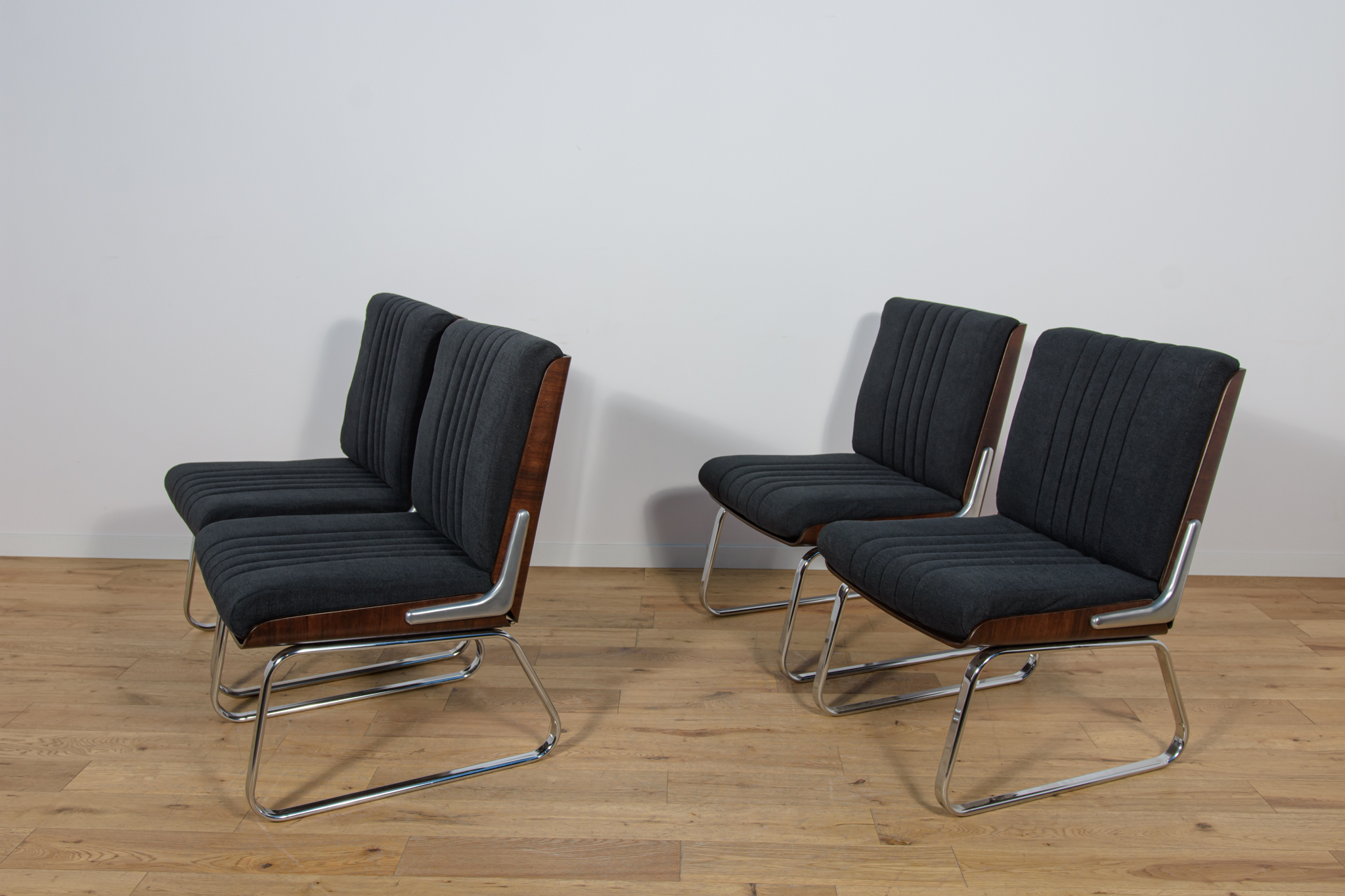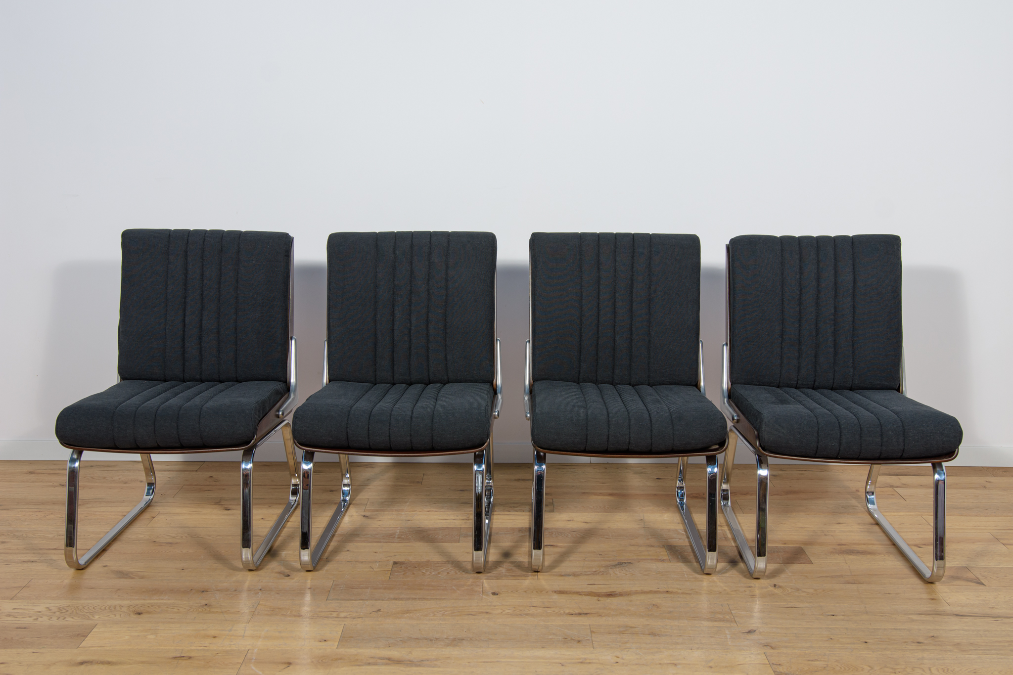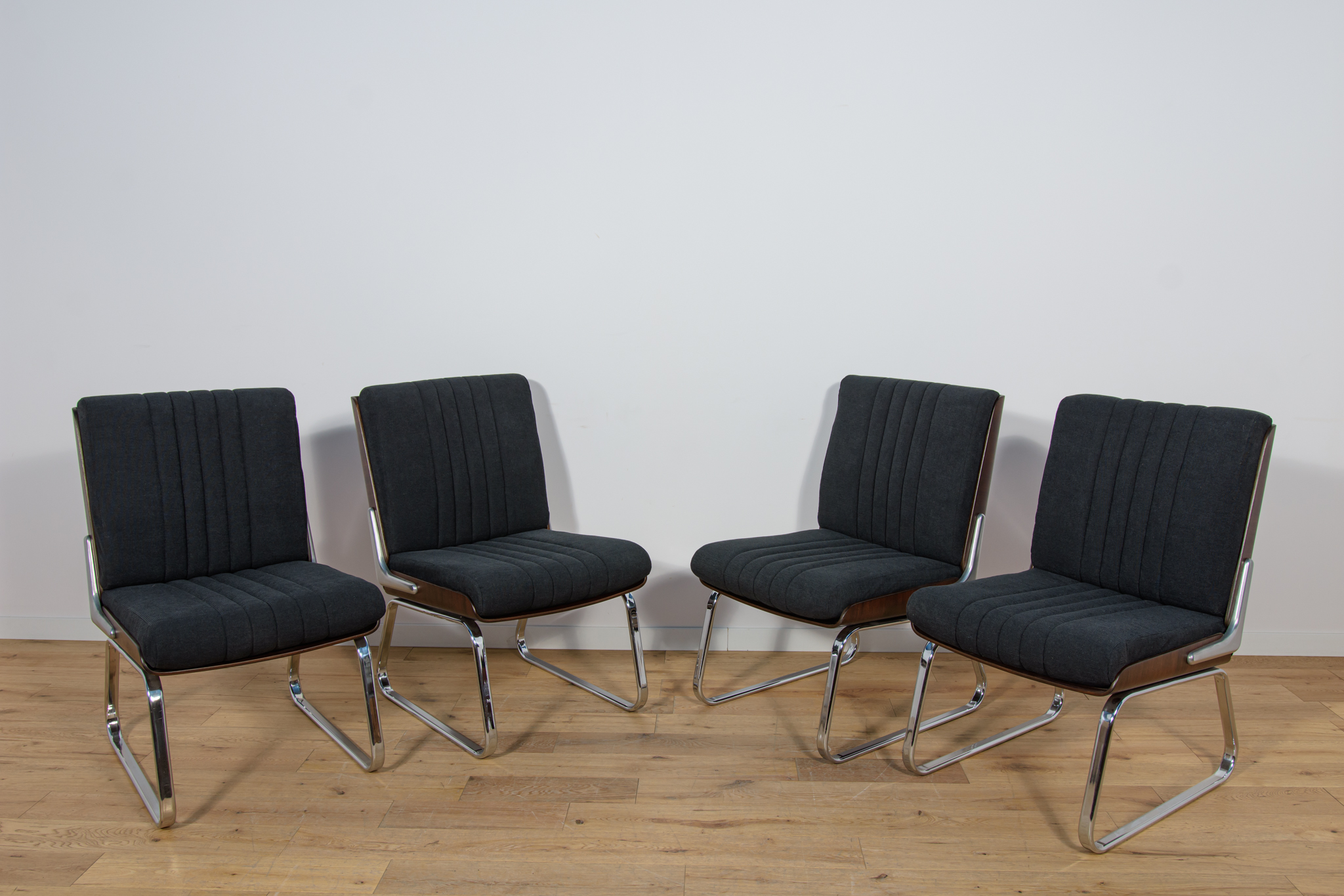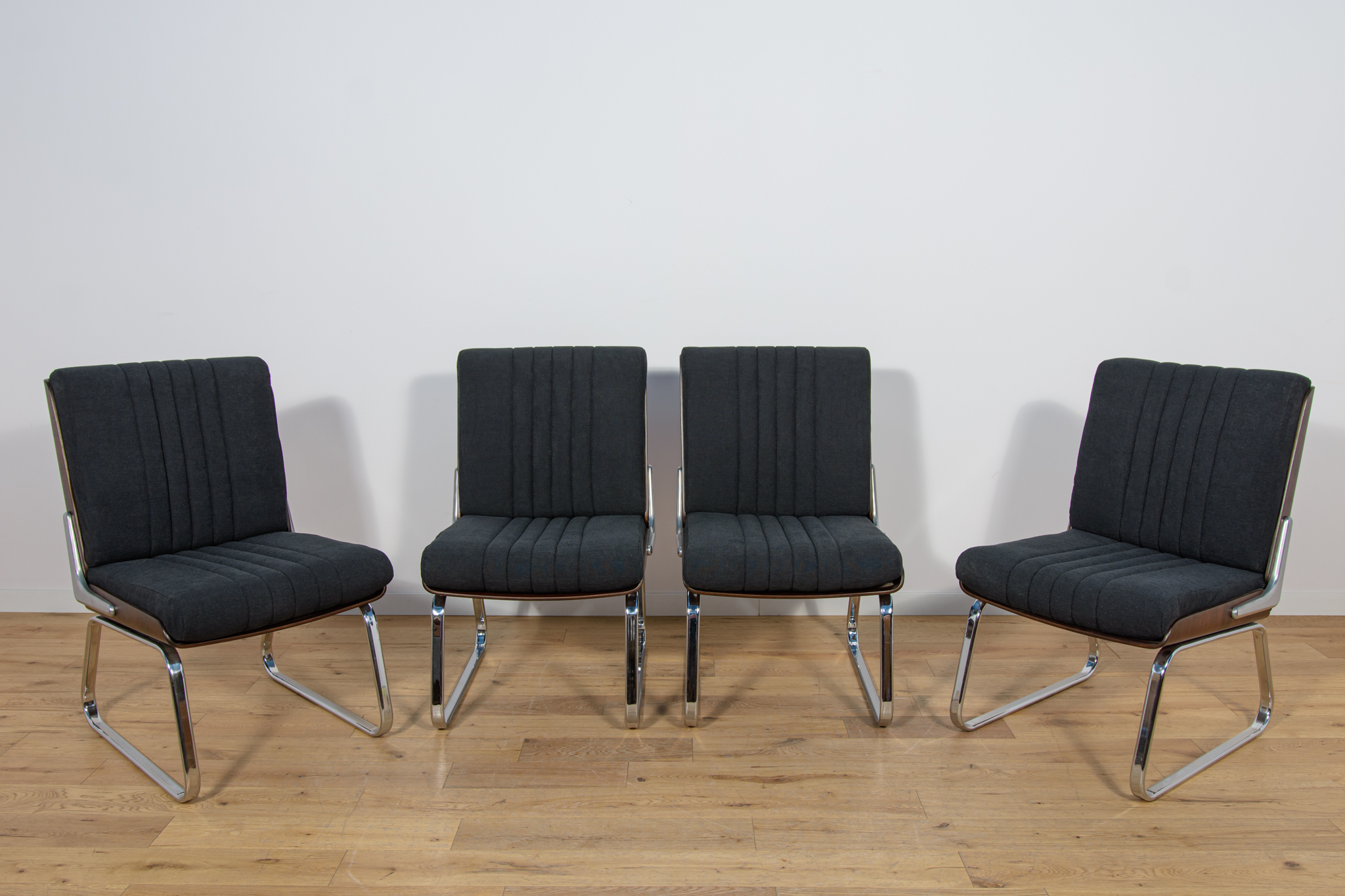 Zestaw czterech krzeseł biurowych Gordon Russell z połowy XX wieku pochodzi z lat 70. i 80. XX wieku. To klasyczny element wzornictwa brytyjskiego z oparciami z drewna palisandrowego i polerowanymi chromowanymi nogami. Fotele przeszły kompleksową renowacje. Elementy drewniane zostały oczyszczone ze starej powierzchni, barwione bejcą palisandrową, wykończone mocnym półmatowym lakierem. Wnętrza tapicerskie zostały wymienione na nowe, obite wysokogatunkową tkaniną w kolorze czarnym