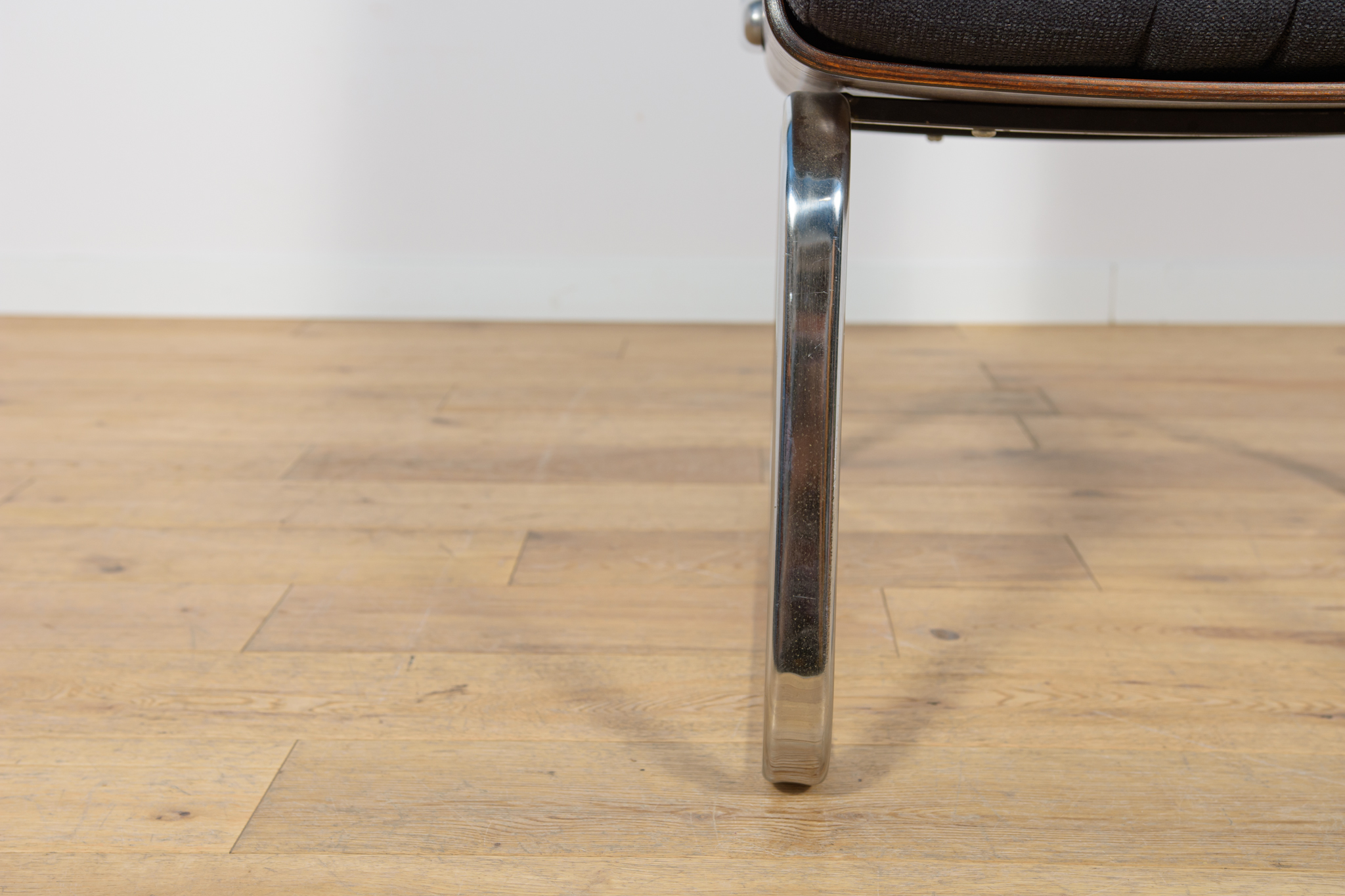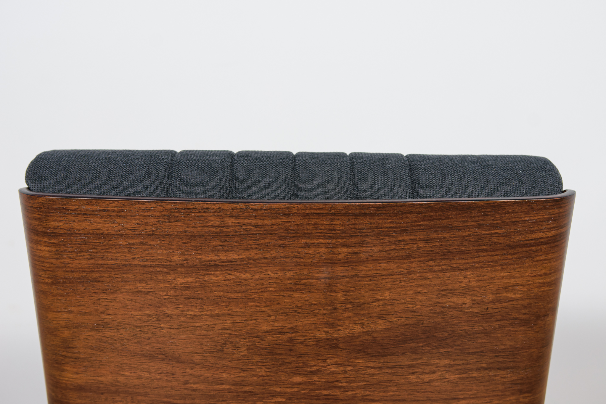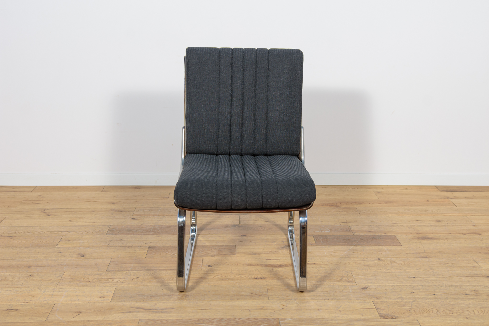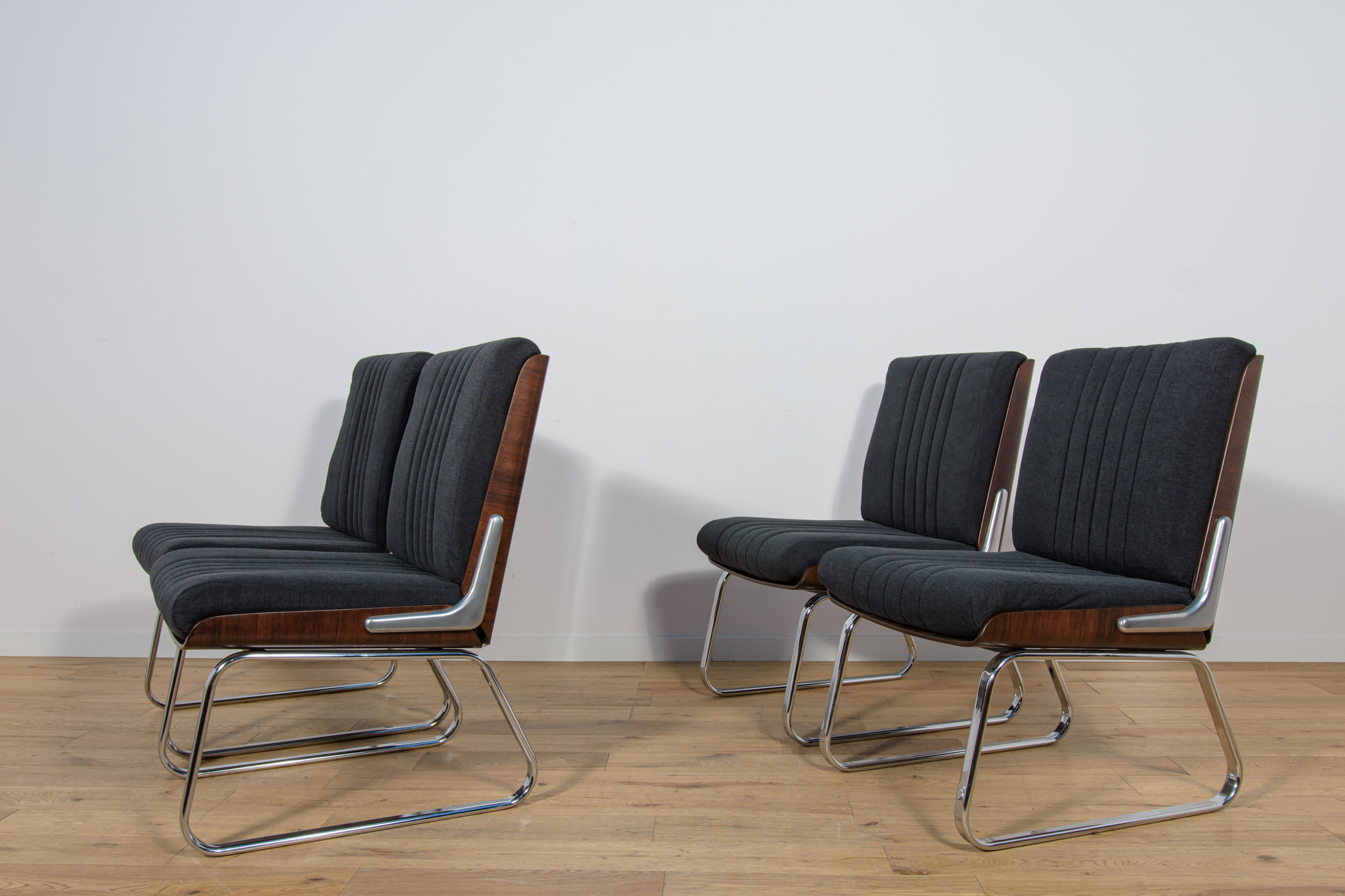 Zestaw czterech krzeseł biurowych Gordon Russell z połowy XX wieku pochodzi z lat 70. i 80. XX wieku. To klasyczny element wzornictwa brytyjskiego z oparciami z drewna palisandrowego i polerowanymi chromowanymi nogami. Fotele przeszły kompleksową renowacje. Elementy drewniane zostały oczyszczone ze starej powierzchni, barwione bejcą palisandrową, wykończone mocnym półmatowym lakierem. Wnętrza tapicerskie zostały wymienione na nowe, obite wysokogatunkową tkaniną w kolorze czarnym