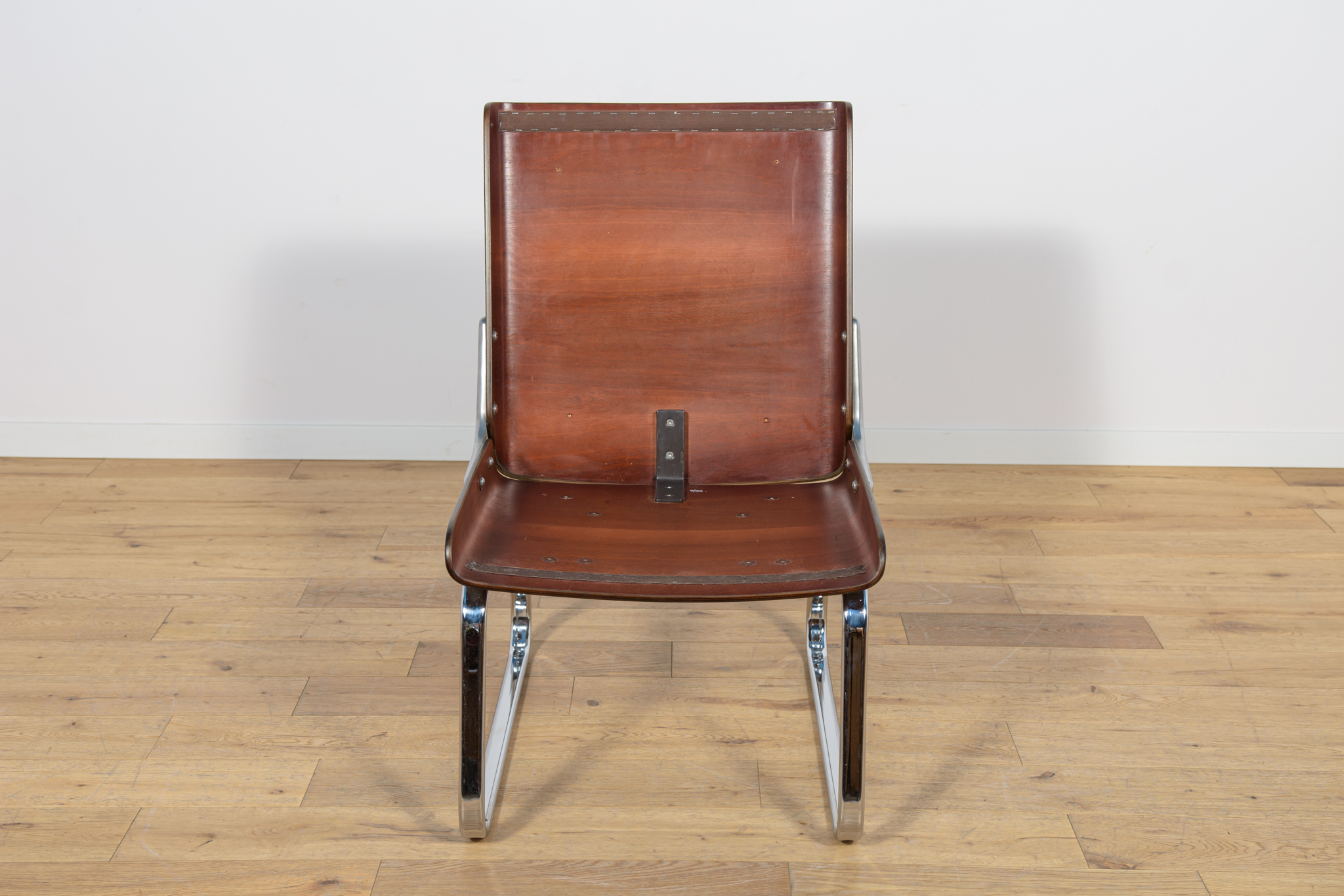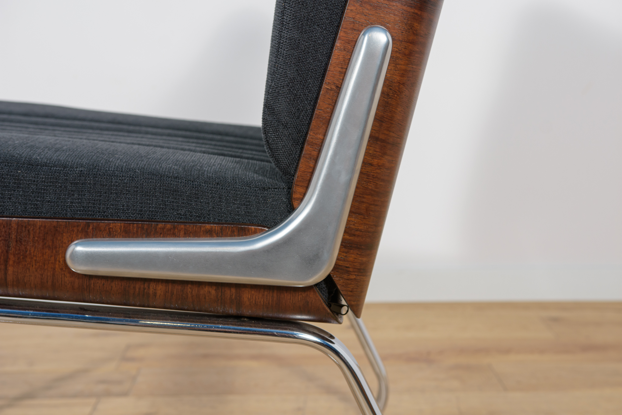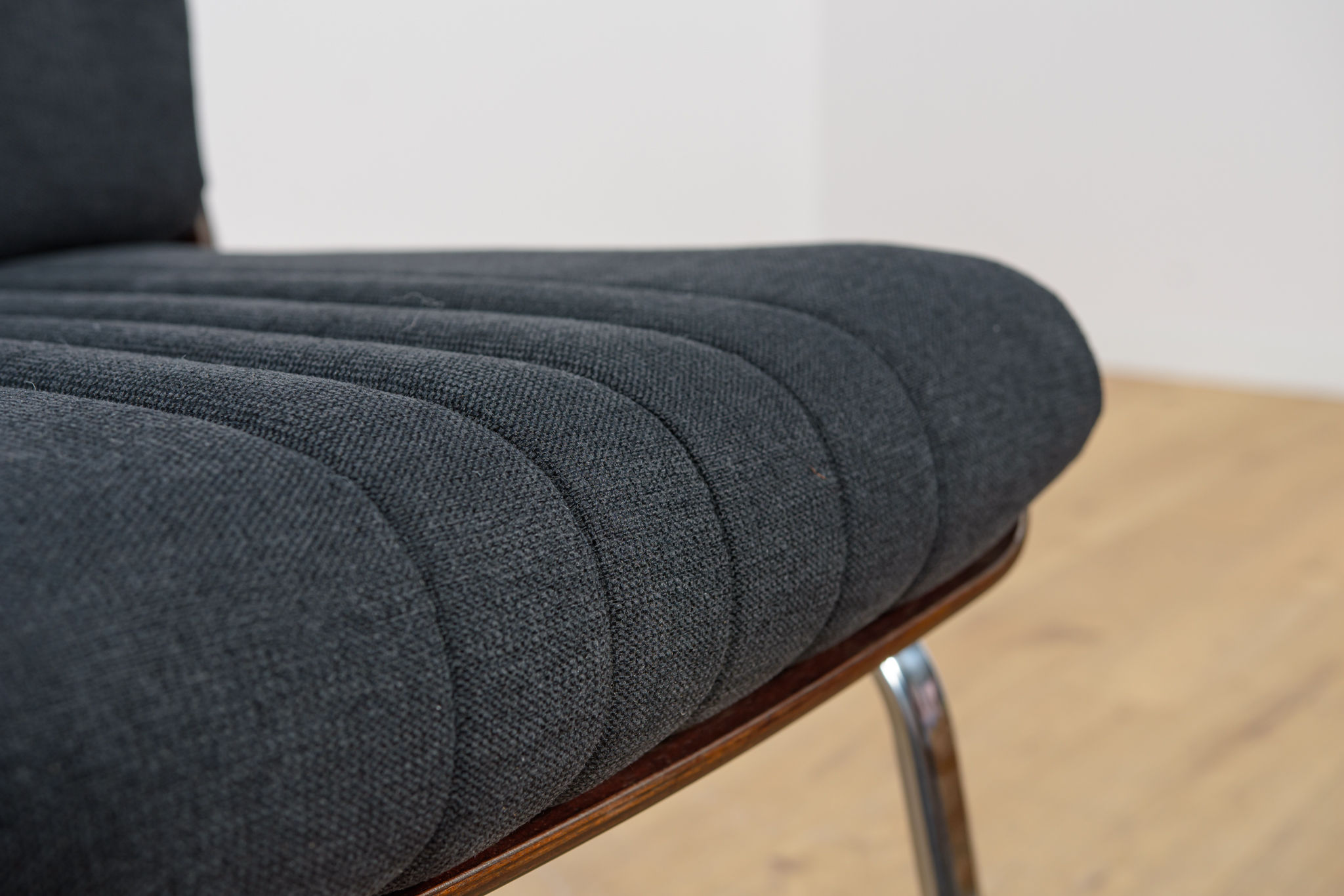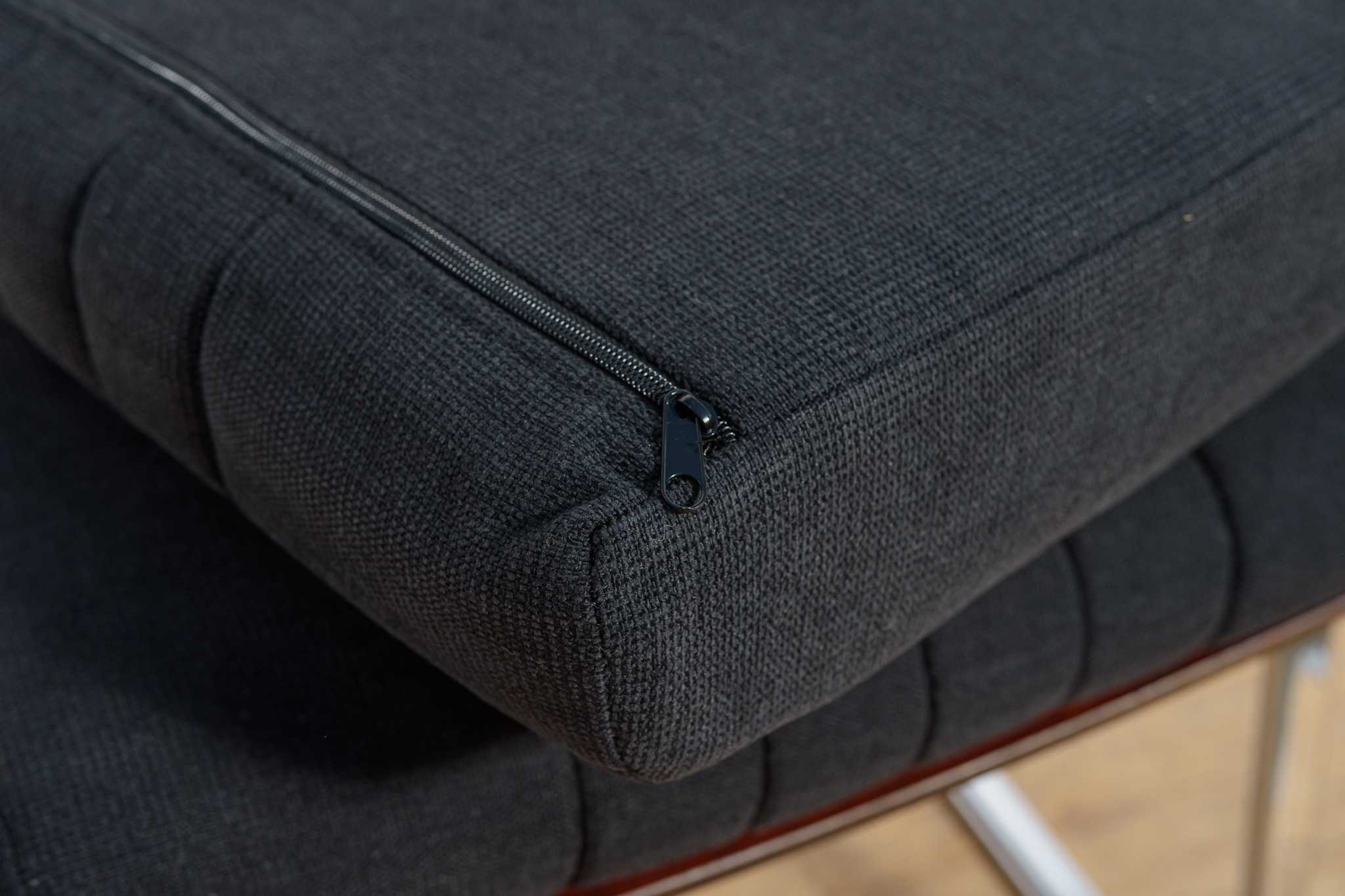 Zestaw czterech krzeseł biurowych Gordon Russell z połowy XX wieku pochodzi z lat 70. i 80. XX wieku. To klasyczny element wzornictwa brytyjskiego z oparciami z drewna palisandrowego i polerowanymi chromowanymi nogami. Fotele przeszły kompleksową renowacje. Elementy drewniane zostały oczyszczone ze starej powierzchni, barwione bejcą palisandrową, wykończone mocnym półmatowym lakierem. Wnętrza tapicerskie zostały wymienione na nowe, obite wysokogatunkową tkaniną w kolorze czarnym