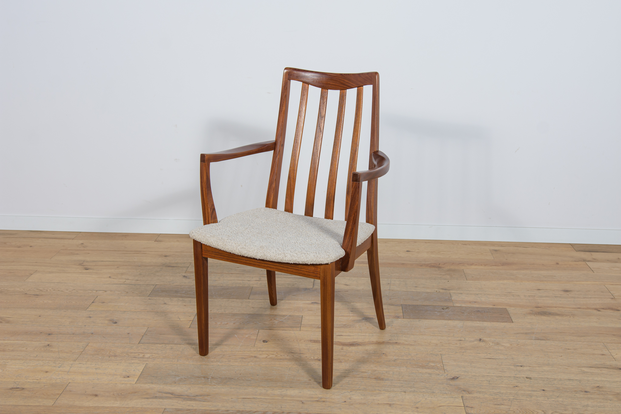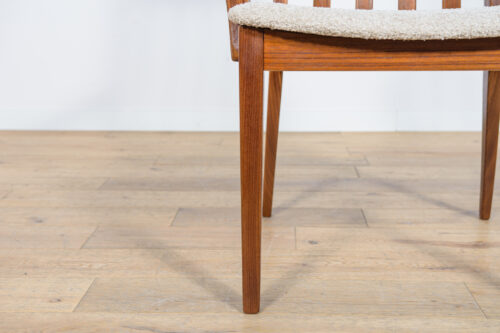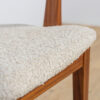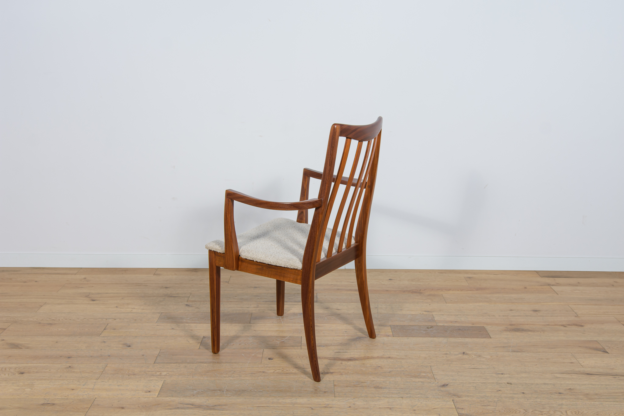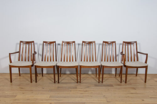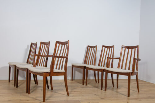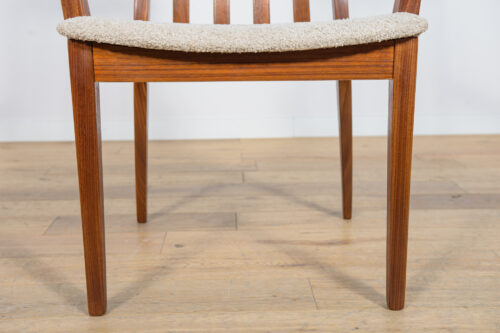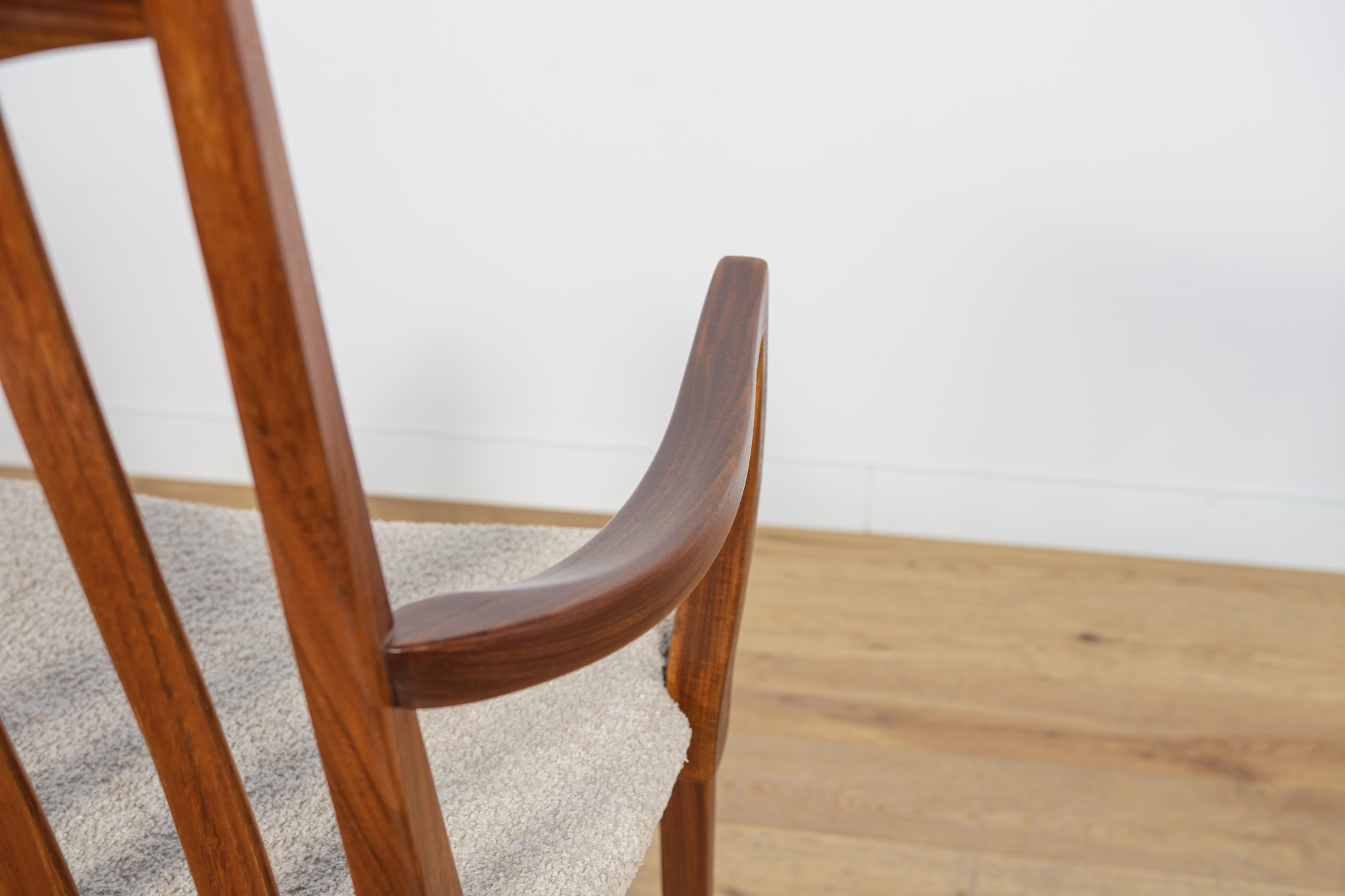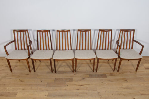 Komplet czterech krzeseł i dwóch foteli zaprojektowanych przez Lesliego Dandy’ego wyprodukowanych przez brytyjską manufakturę G-Plan pochodzi z lat 60. Krzesła zostały wykonane z drewna tekowego, poddane kompleksowej renowacji. Elementy drewniane zostały oczyszczone, wykończone duńskim olejem Rustins. Wnętrza tapicerskie są wymienione, obite nową wysokogatunkową tkaniną typu boucle w kolorze kremowym.