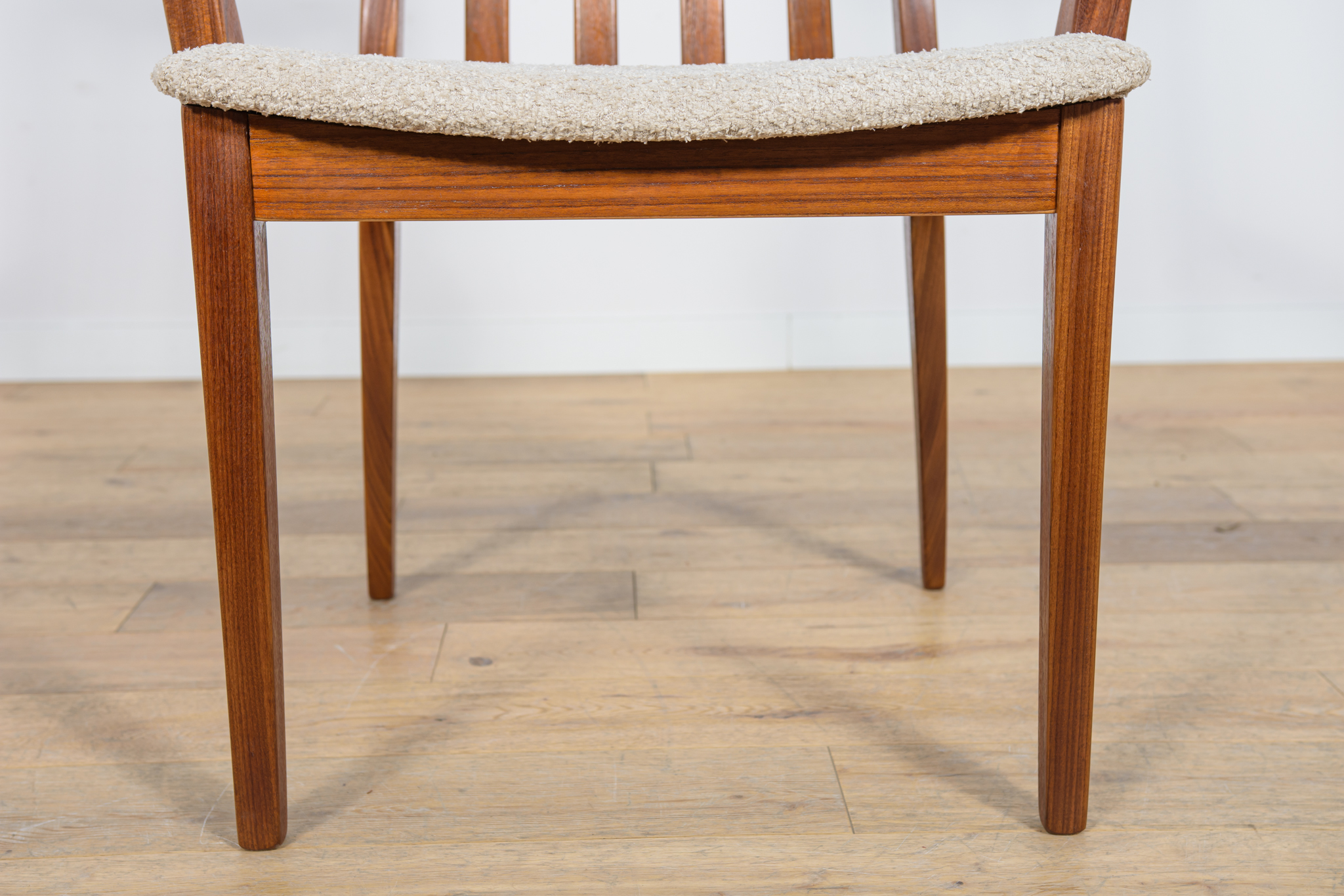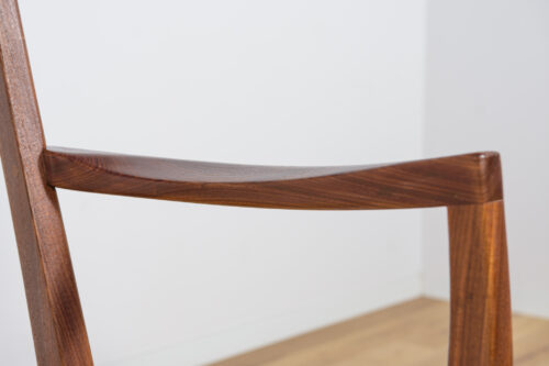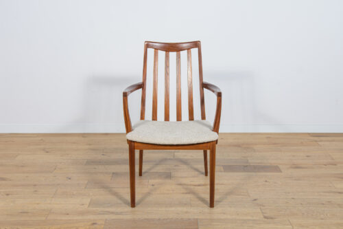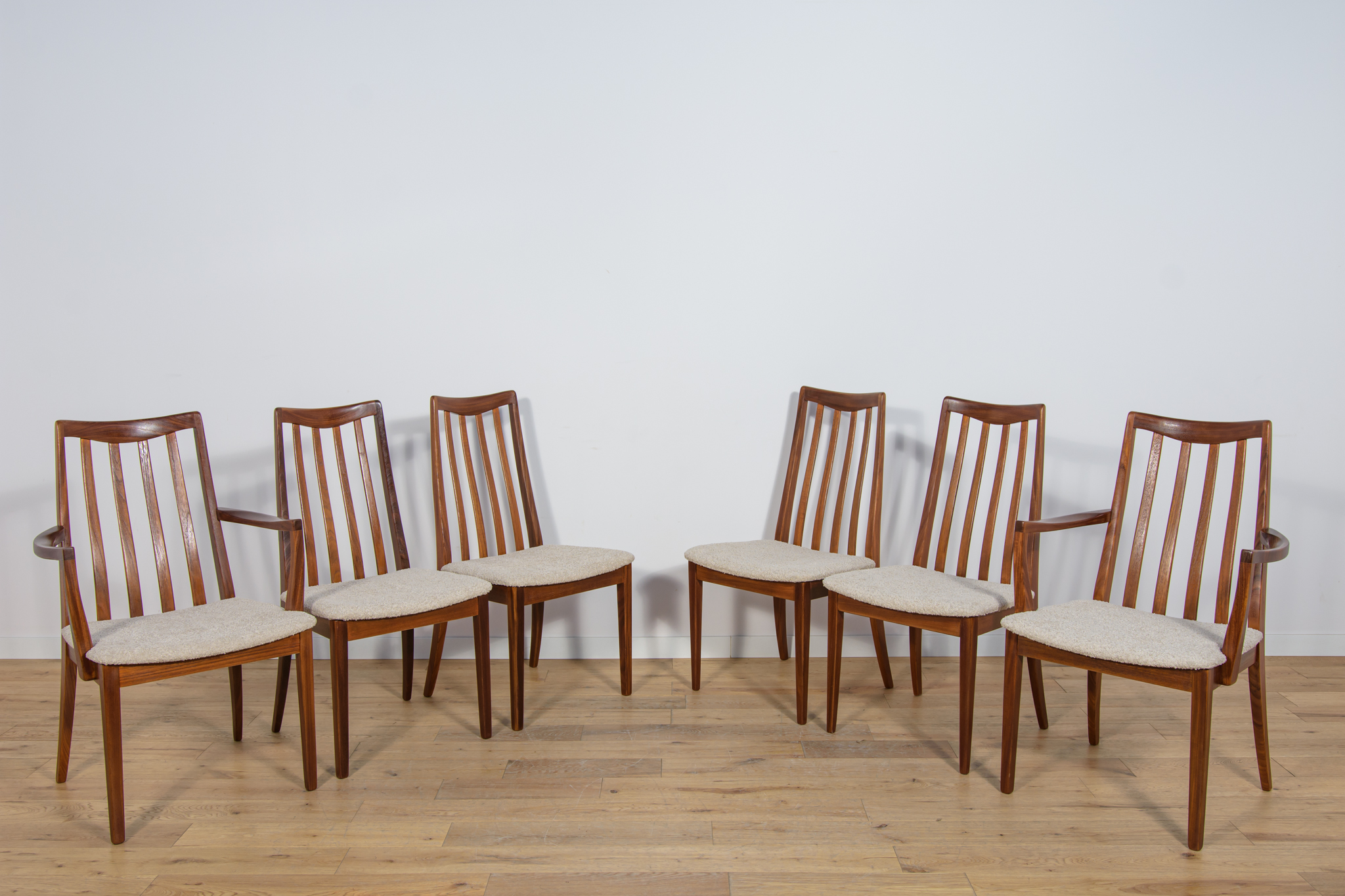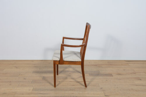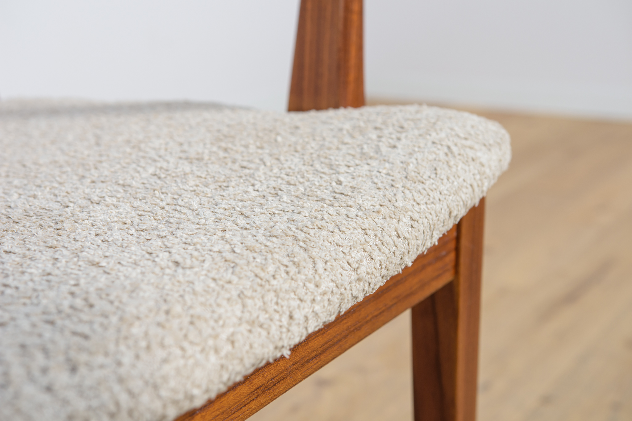 Komplet czterech krzeseł i dwóch foteli zaprojektowanych przez Lesliego Dandy’ego wyprodukowanych przez brytyjską manufakturę G-Plan pochodzi z lat 60. Krzesła zostały wykonane z drewna tekowego, poddane kompleksowej renowacji. Elementy drewniane zostały oczyszczone, wykończone duńskim olejem Rustins. Wnętrza tapicerskie są wymienione, obite nową wysokogatunkową tkaniną typu boucle w kolorze kremowym.