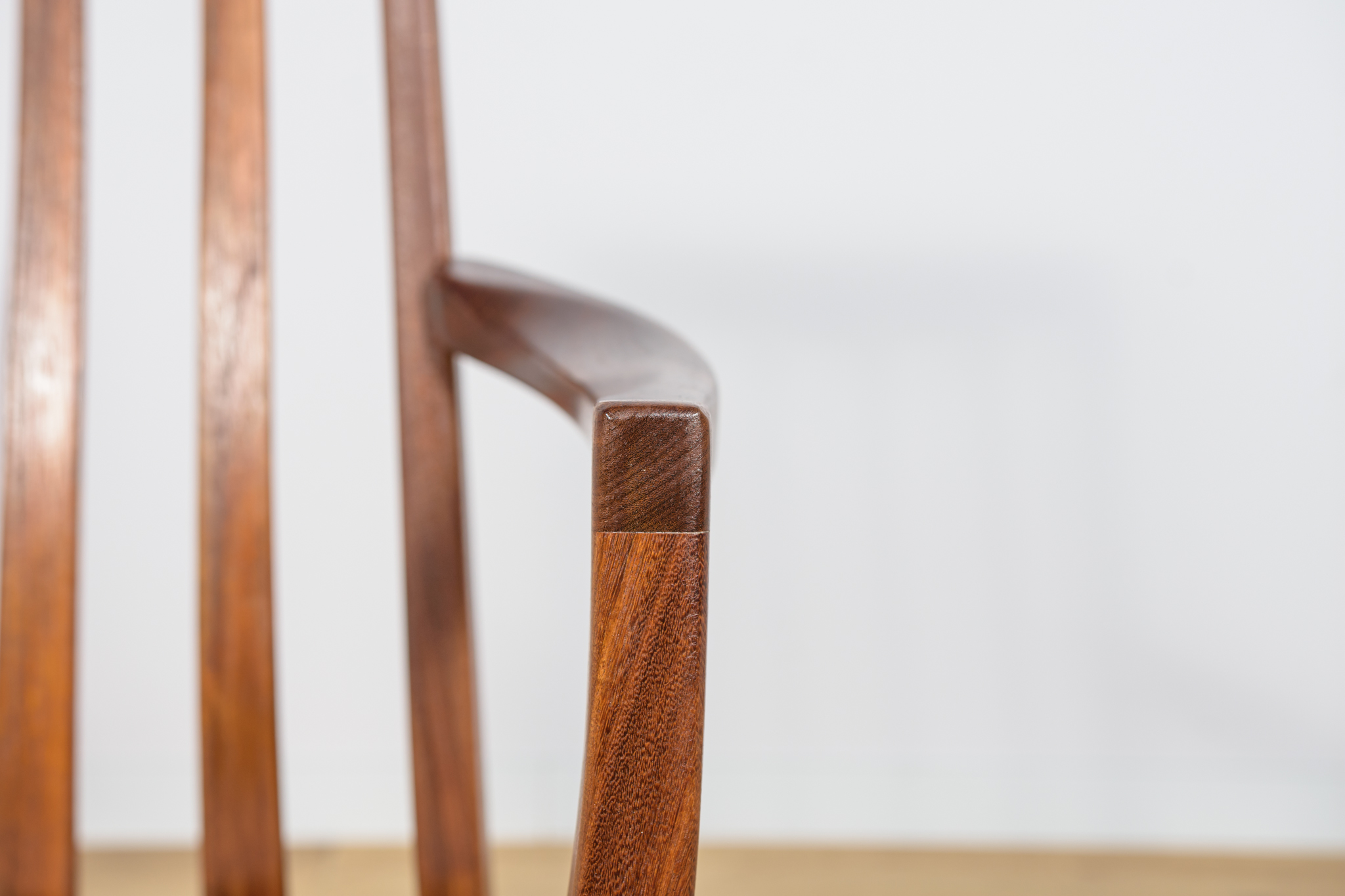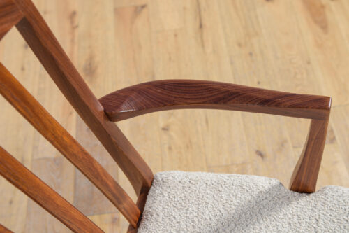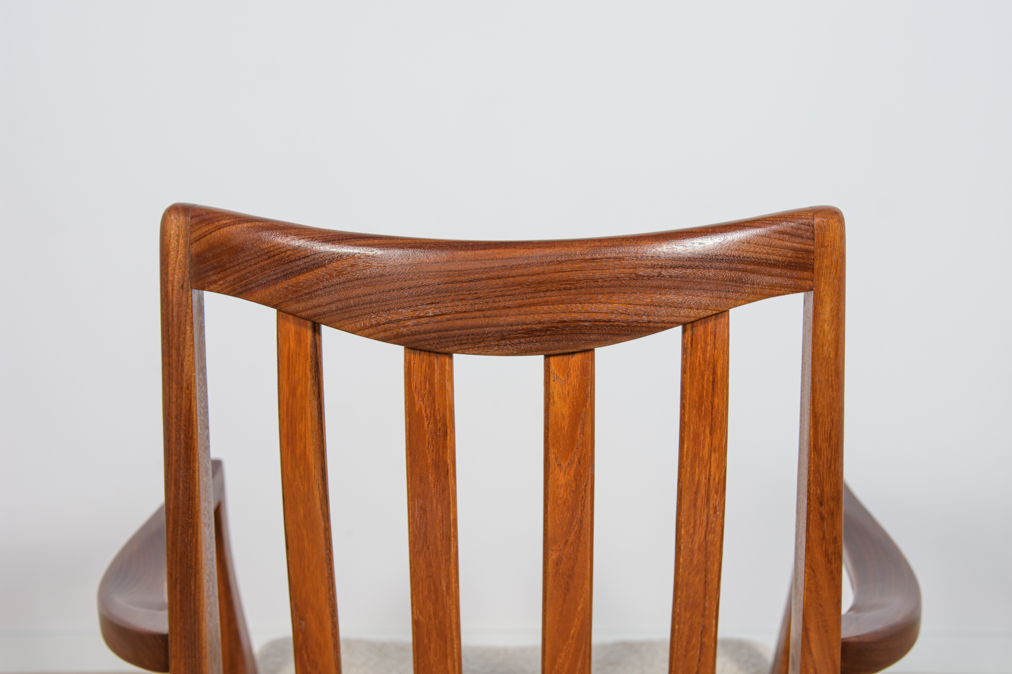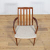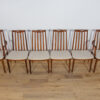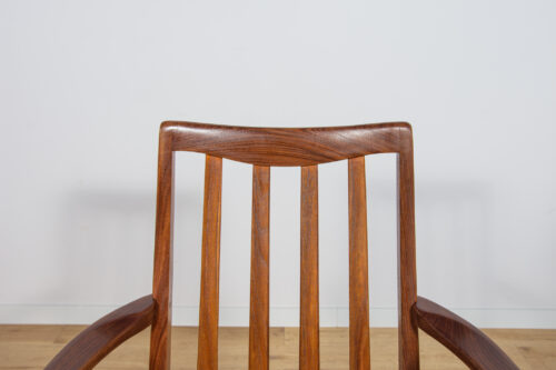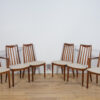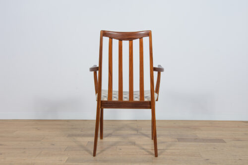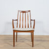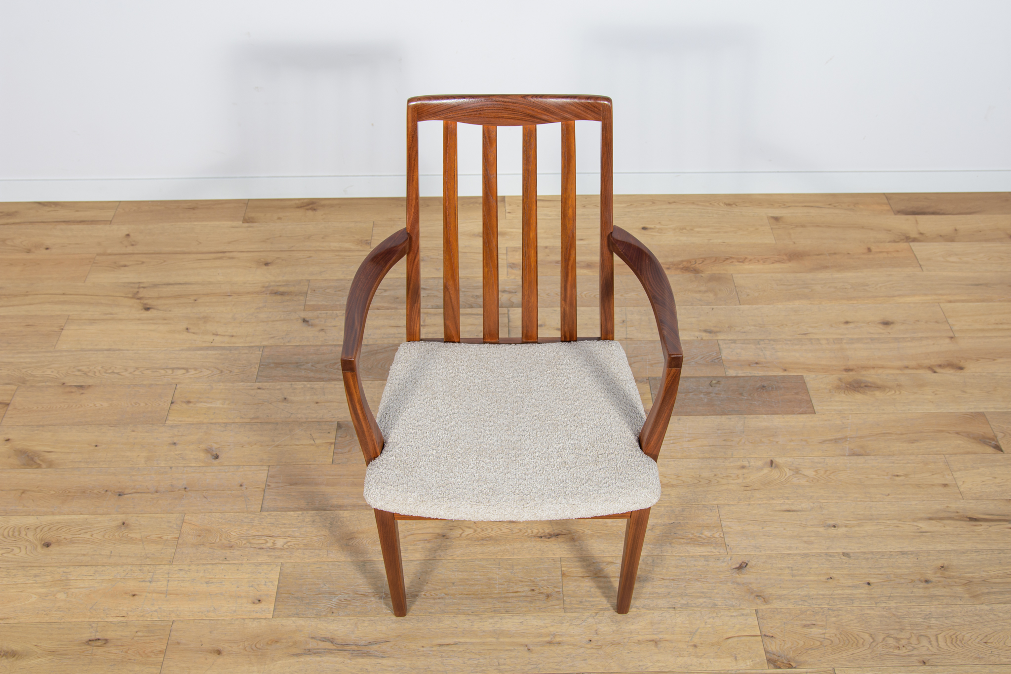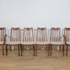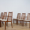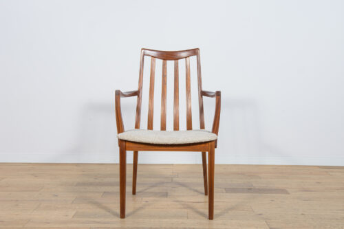 Komplet czterech krzeseł i dwóch foteli zaprojektowanych przez Lesliego Dandy’ego wyprodukowanych przez brytyjską manufakturę G-Plan pochodzi z lat 60. Krzesła zostały wykonane z drewna tekowego, poddane kompleksowej renowacji. Elementy drewniane zostały oczyszczone, wykończone duńskim olejem Rustins. Wnętrza tapicerskie są wymienione, obite nową wysokogatunkową tkaniną typu boucle w kolorze kremowym.