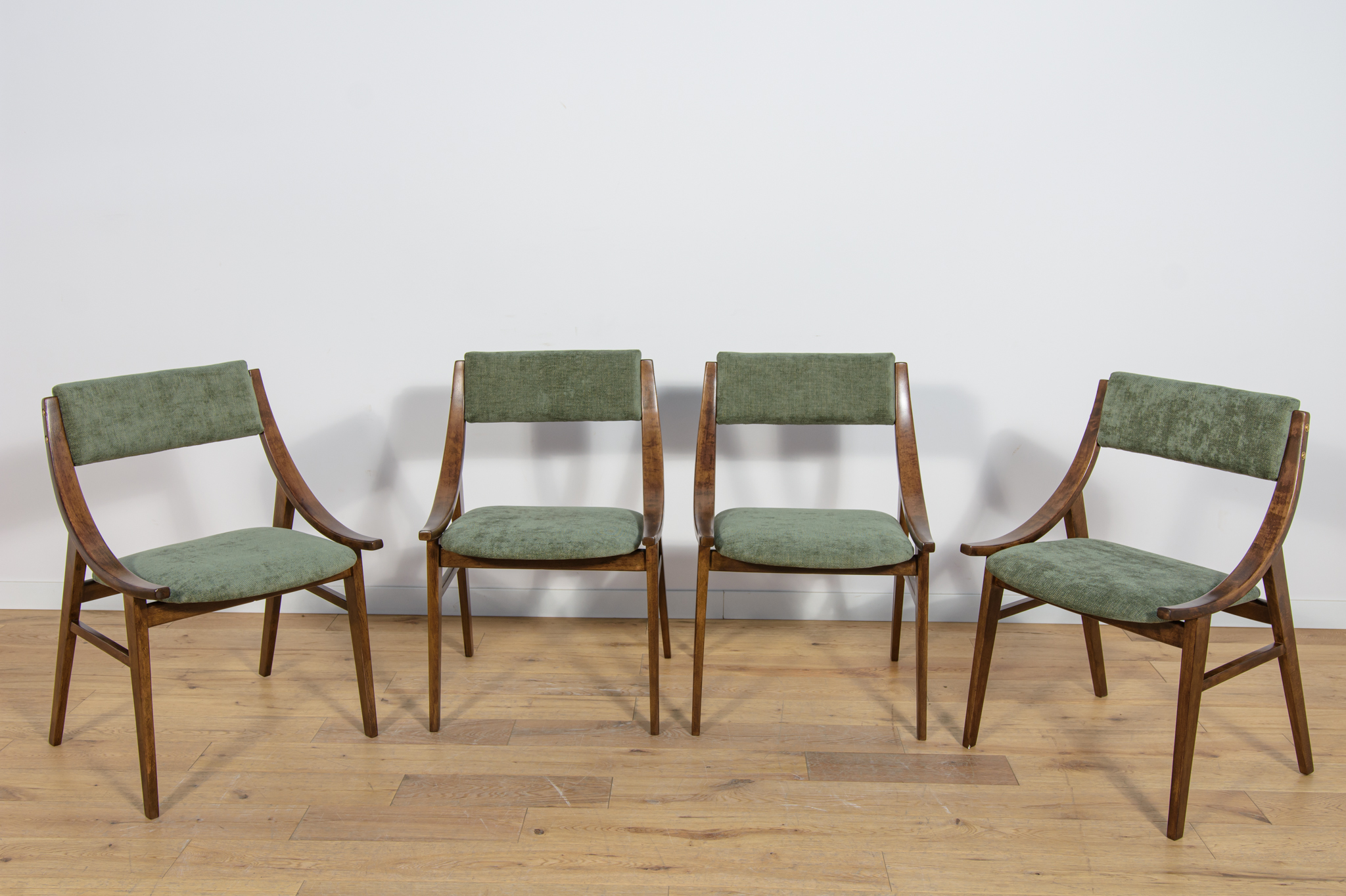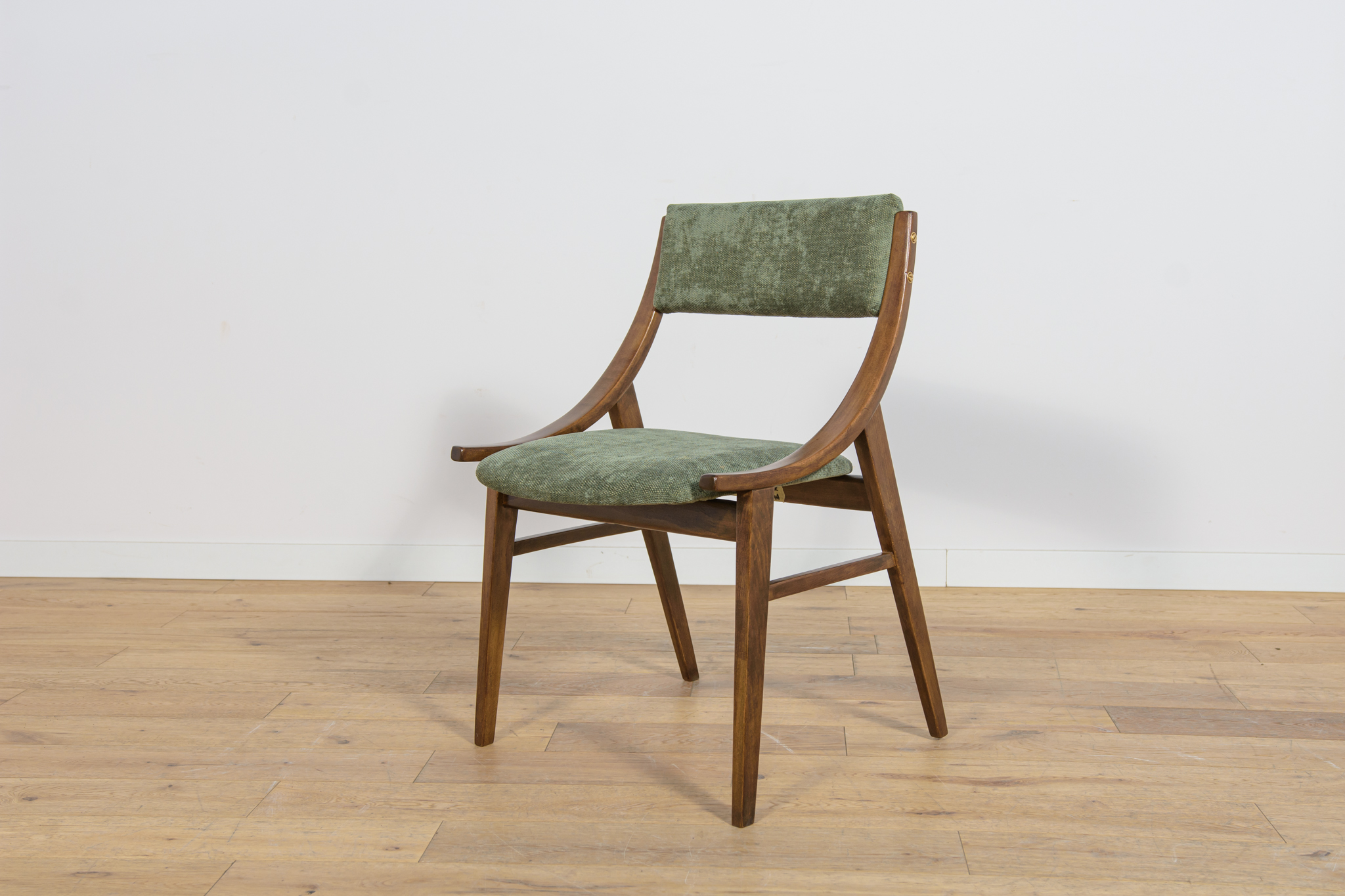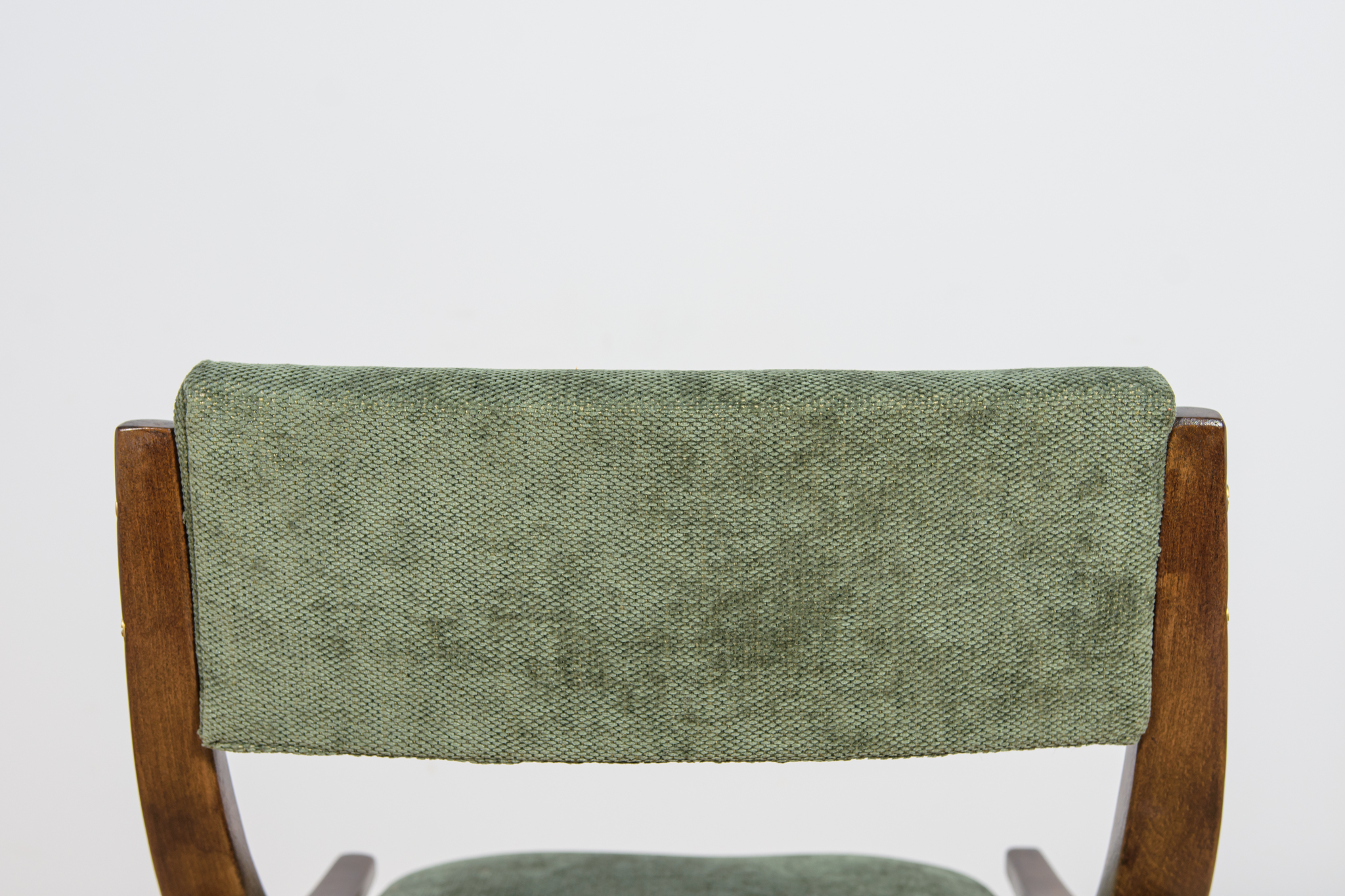 Komplet czterech krzeseł, popularnie nazwanych Skoczkami. Wyprodukowane w latach 70. w Zamojskiej Fabryce Mebli. Fotele przeszły gruntowną renowacje stolarsko-tapicerską. Drewno zostały oczyszczone ze starej powierzchni, barwione bejcą w kolorze ciemnego orzechu i wykończone mocnym półmatowym lakierem. Wnętrze tapicerskie zostało wymienione, obite wysokogatunkową tkaniną w kolorze leśnej zieleni.