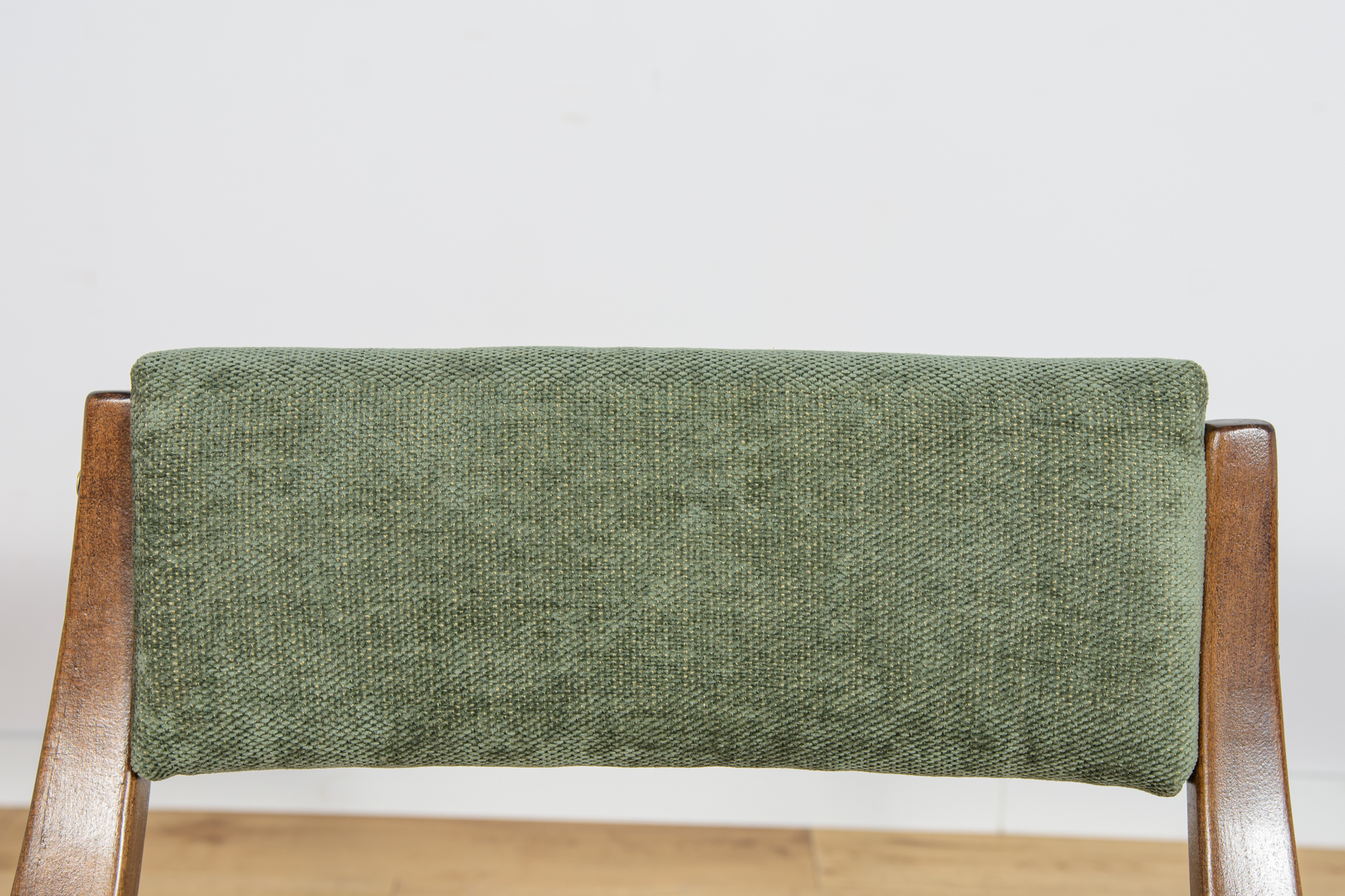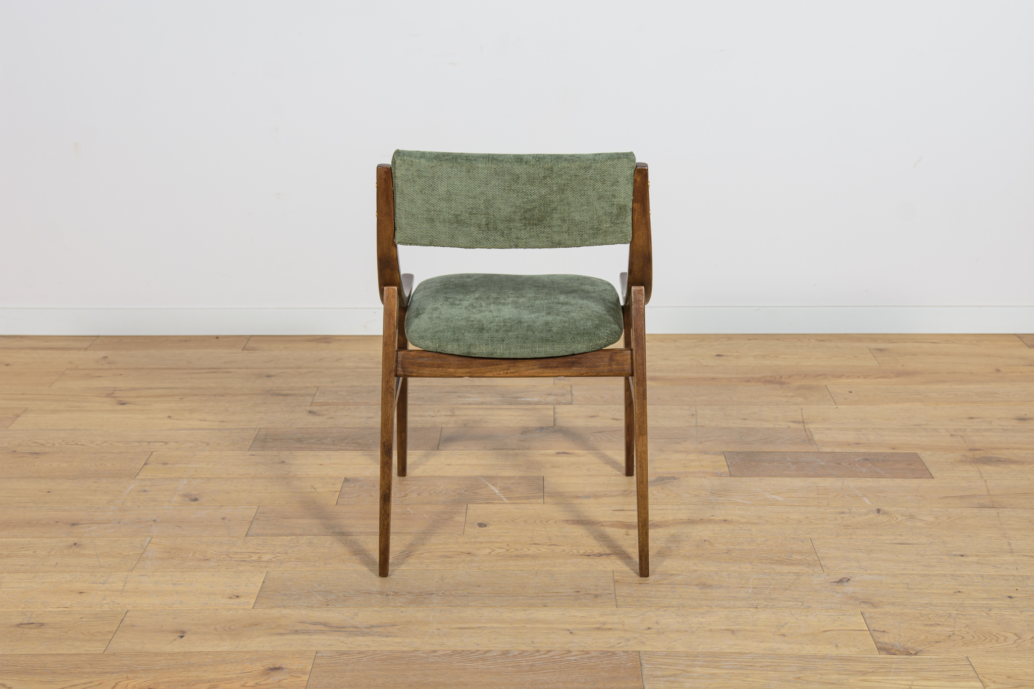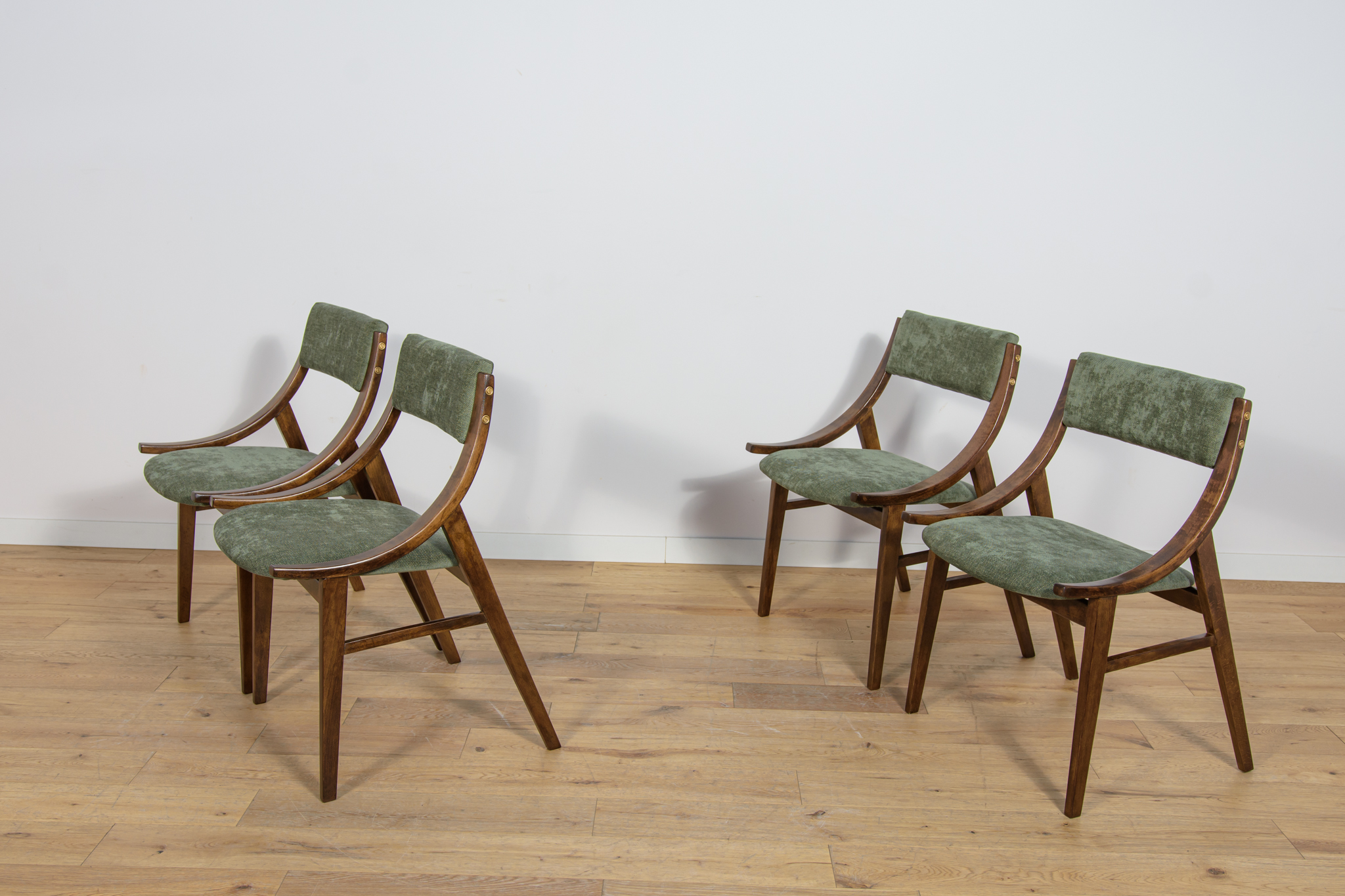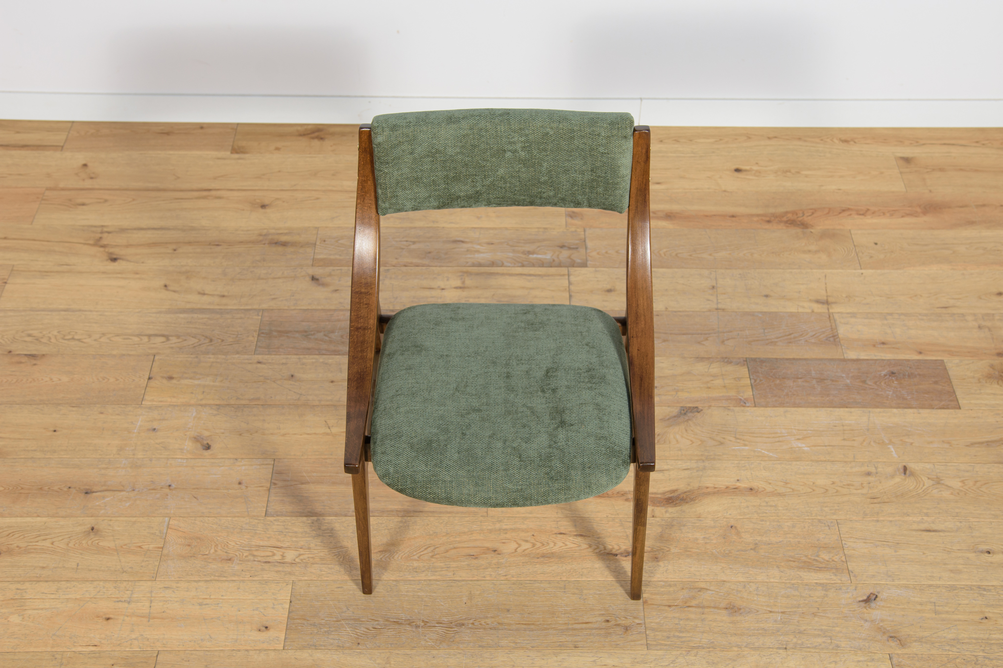 Komplet czterech krzeseł, popularnie nazwanych Skoczkami. Wyprodukowane w latach 70. w Zamojskiej Fabryce Mebli. Fotele przeszły gruntowną renowacje stolarsko-tapicerską. Drewno zostały oczyszczone ze starej powierzchni, barwione bejcą w kolorze ciemnego orzechu i wykończone mocnym półmatowym lakierem. Wnętrze tapicerskie zostało wymienione, obite wysokogatunkową tkaniną w kolorze leśnej zieleni.