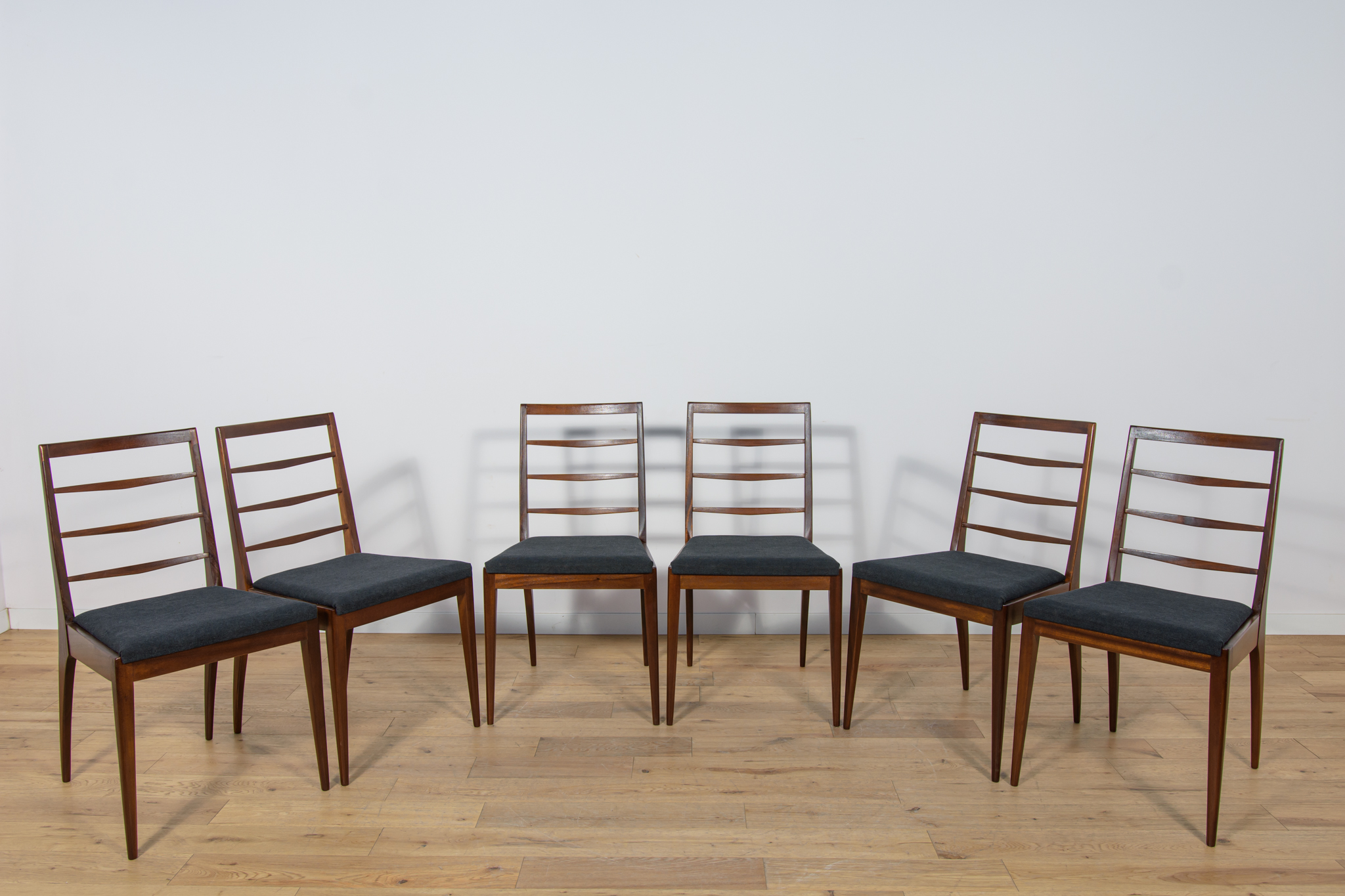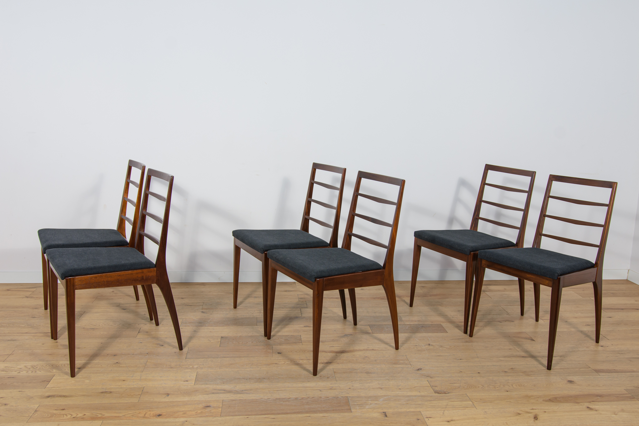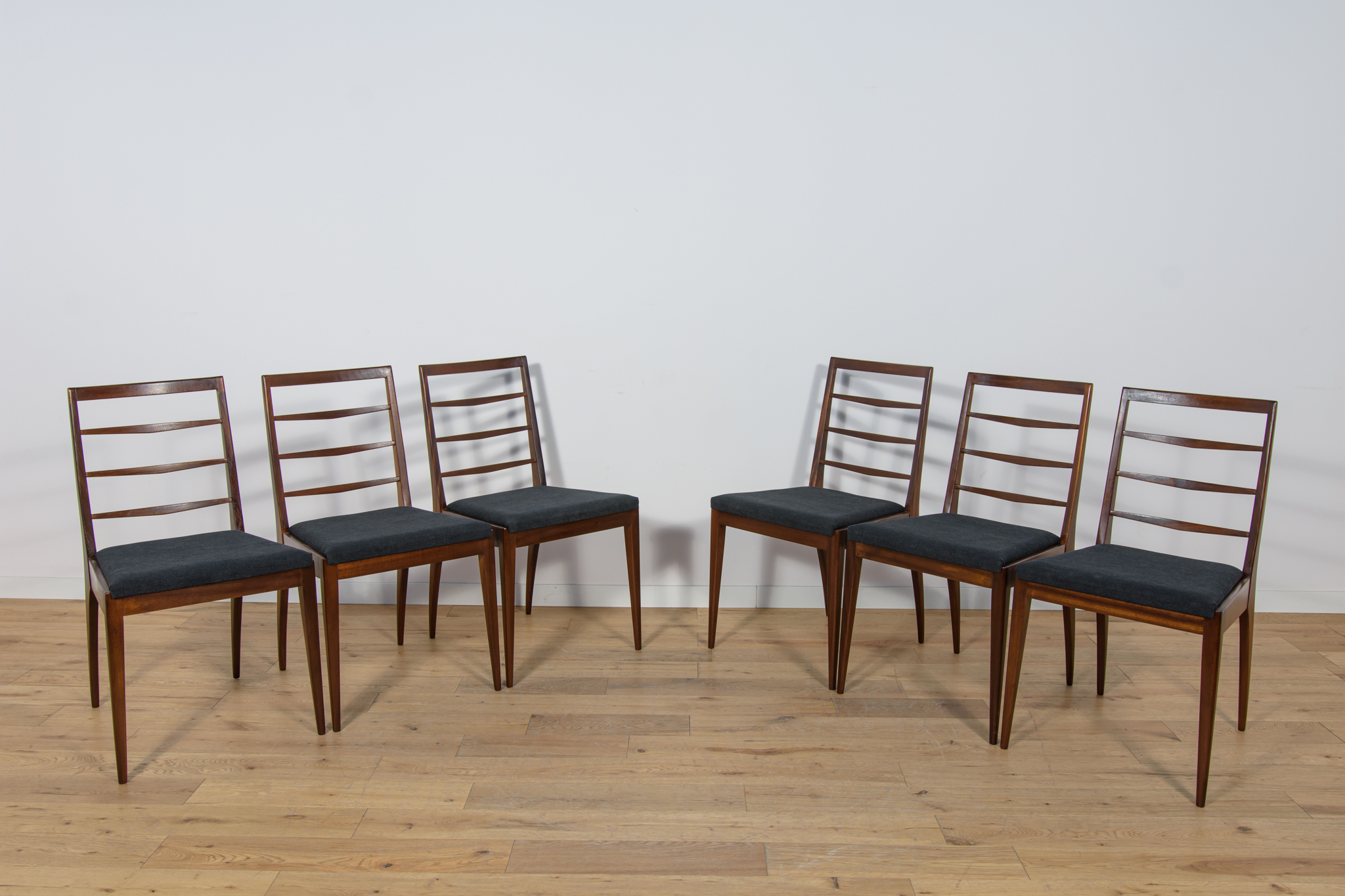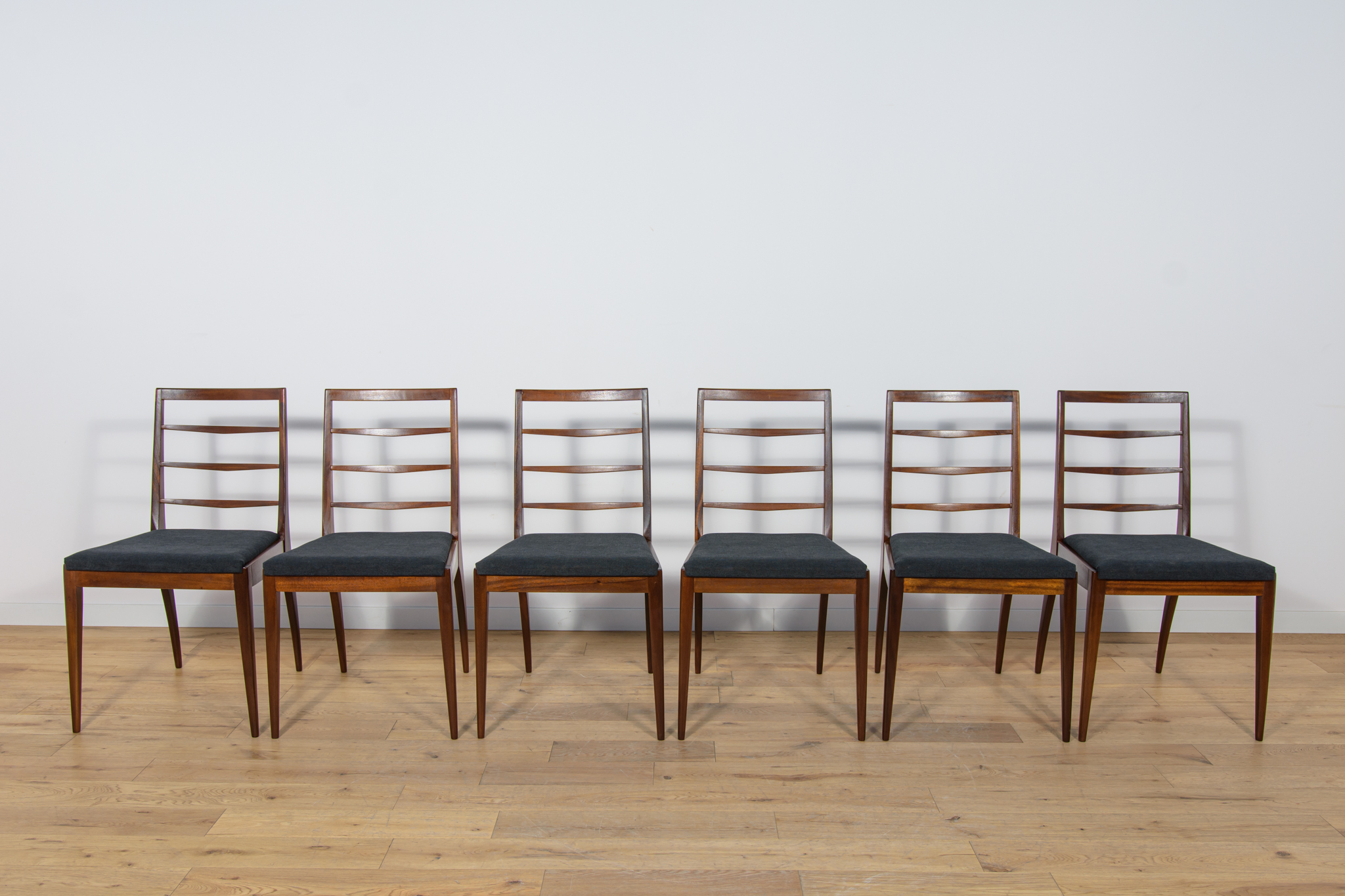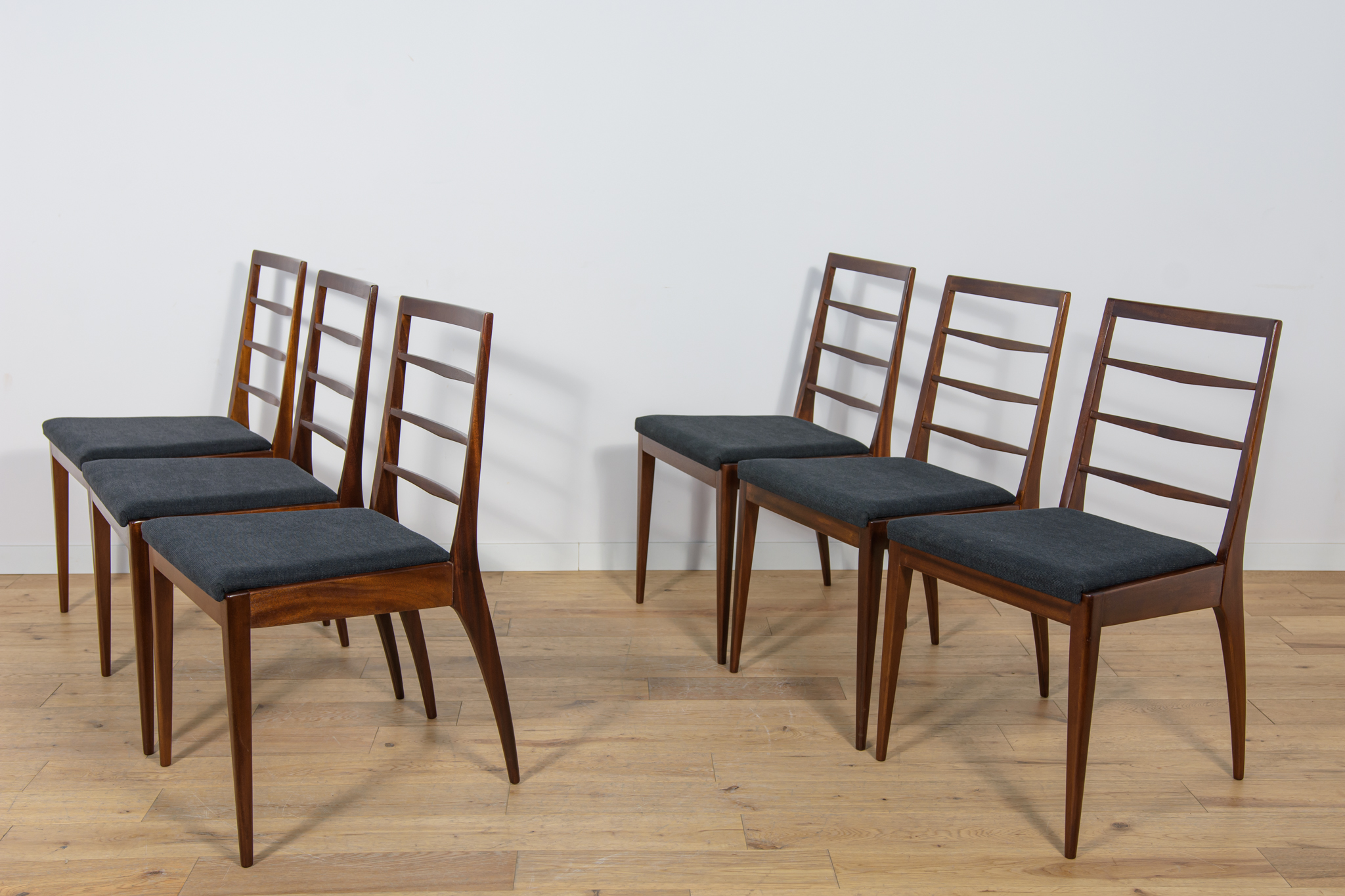 Komplet sześciu krzeseł wyprodukowanych w brytyjskiej manufakturze McIntosh w latach 60. Eleganckie krzesła o ciekawej formie. Drewno tekowe zostało oczyszczone, wykończone olejem Danish Oil. Wnętrza tapicerskie wymienione, obite nową wysokogatunkową tkaniną w kolorze czarnym.