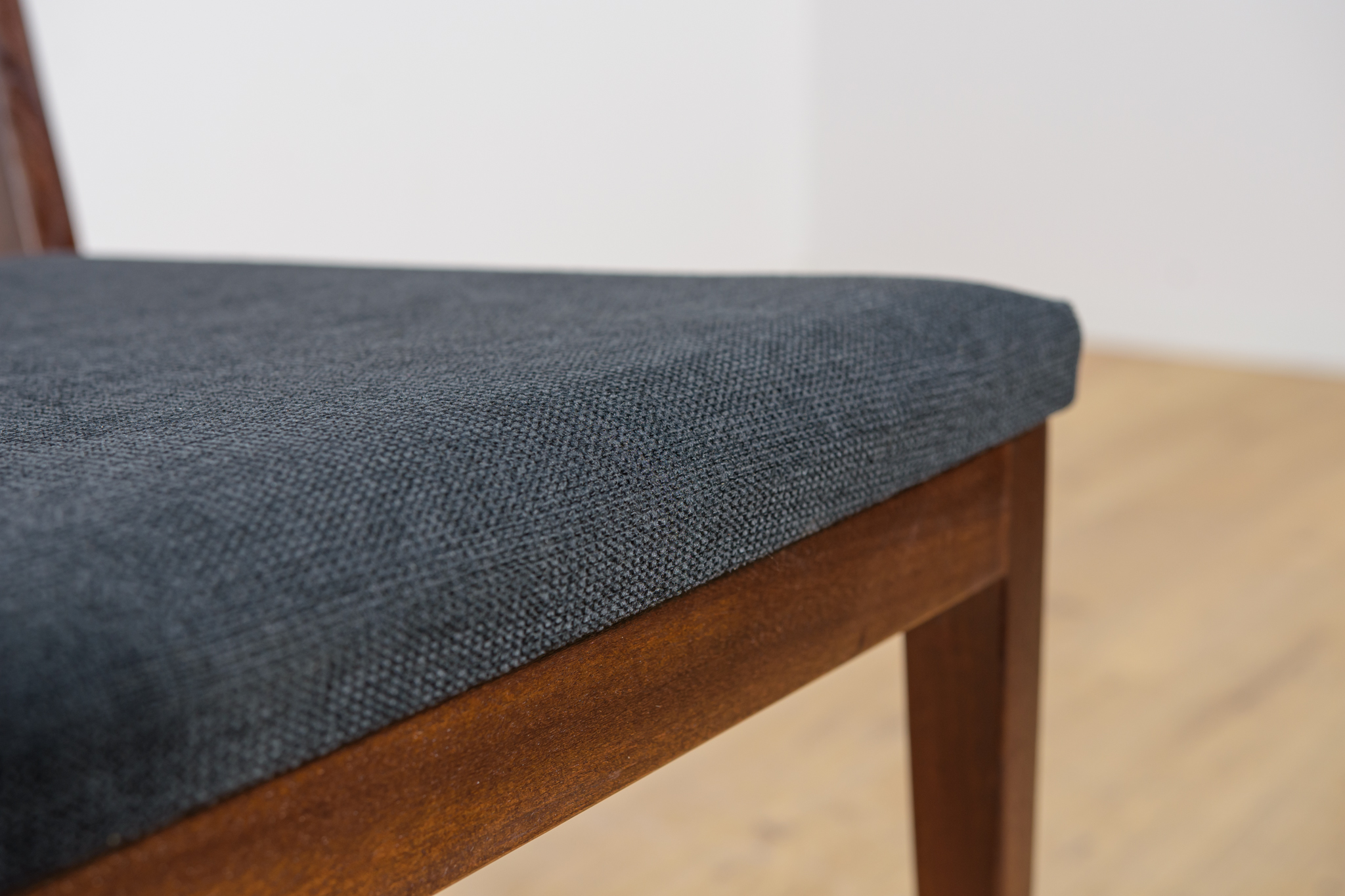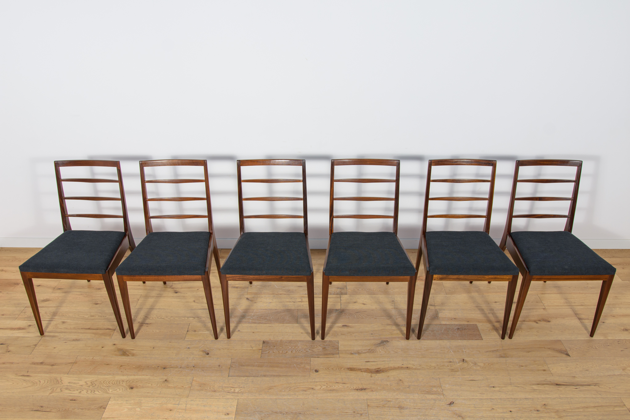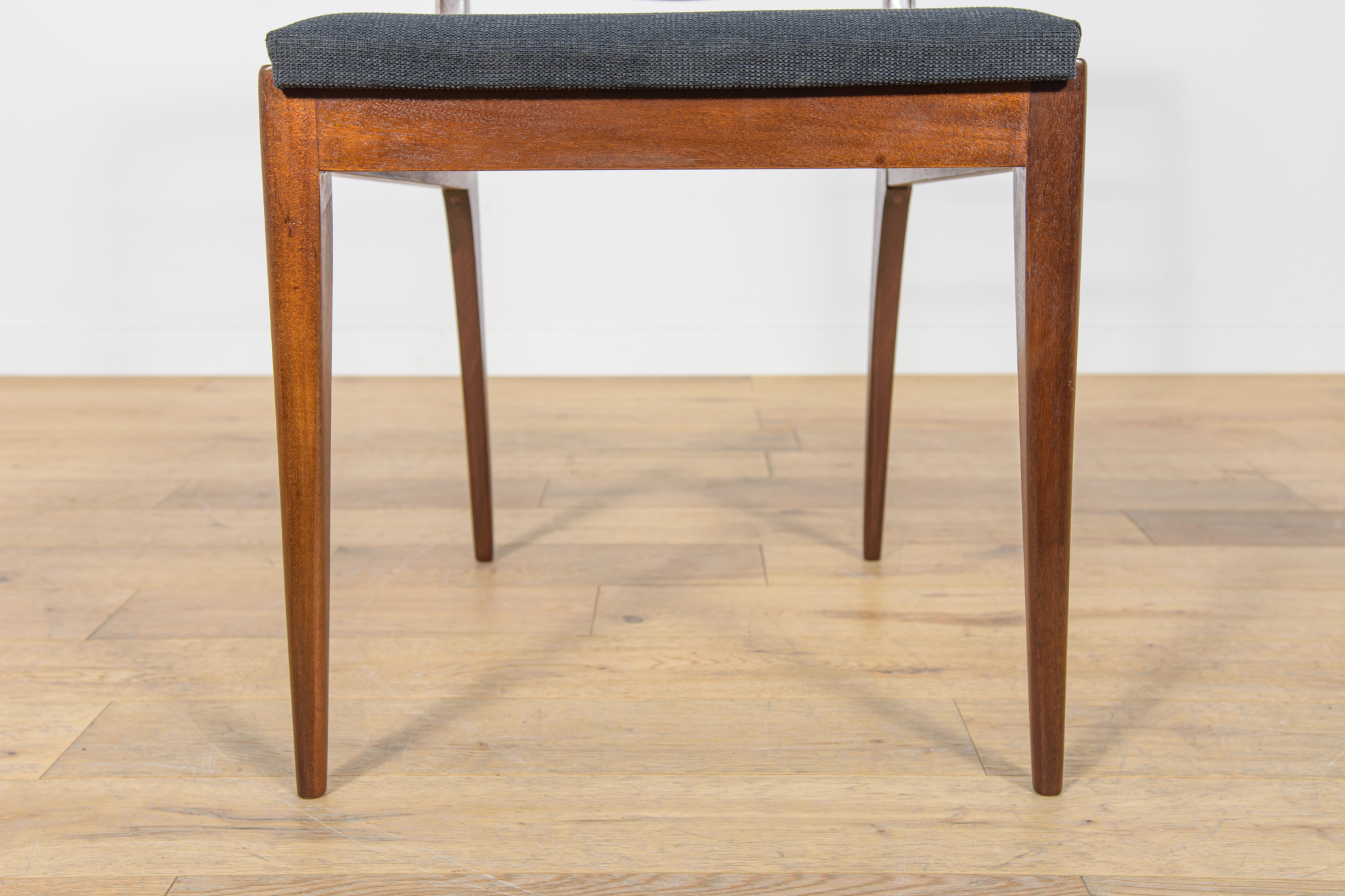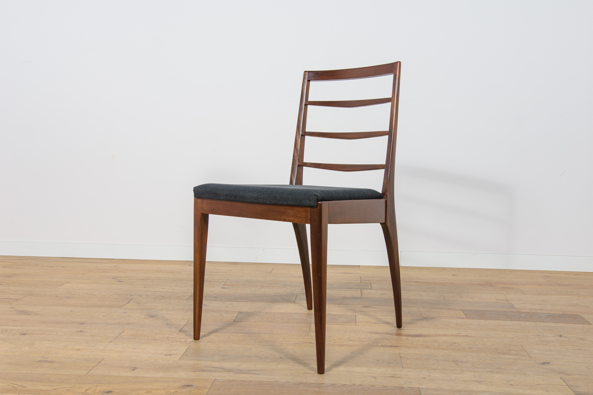 Komplet sześciu krzeseł wyprodukowanych w brytyjskiej manufakturze McIntosh w latach 60. Eleganckie krzesła o ciekawej formie. Drewno tekowe zostało oczyszczone, wykończone olejem Danish Oil. Wnętrza tapicerskie wymienione, obite nową wysokogatunkową tkaniną w kolorze czarnym.
