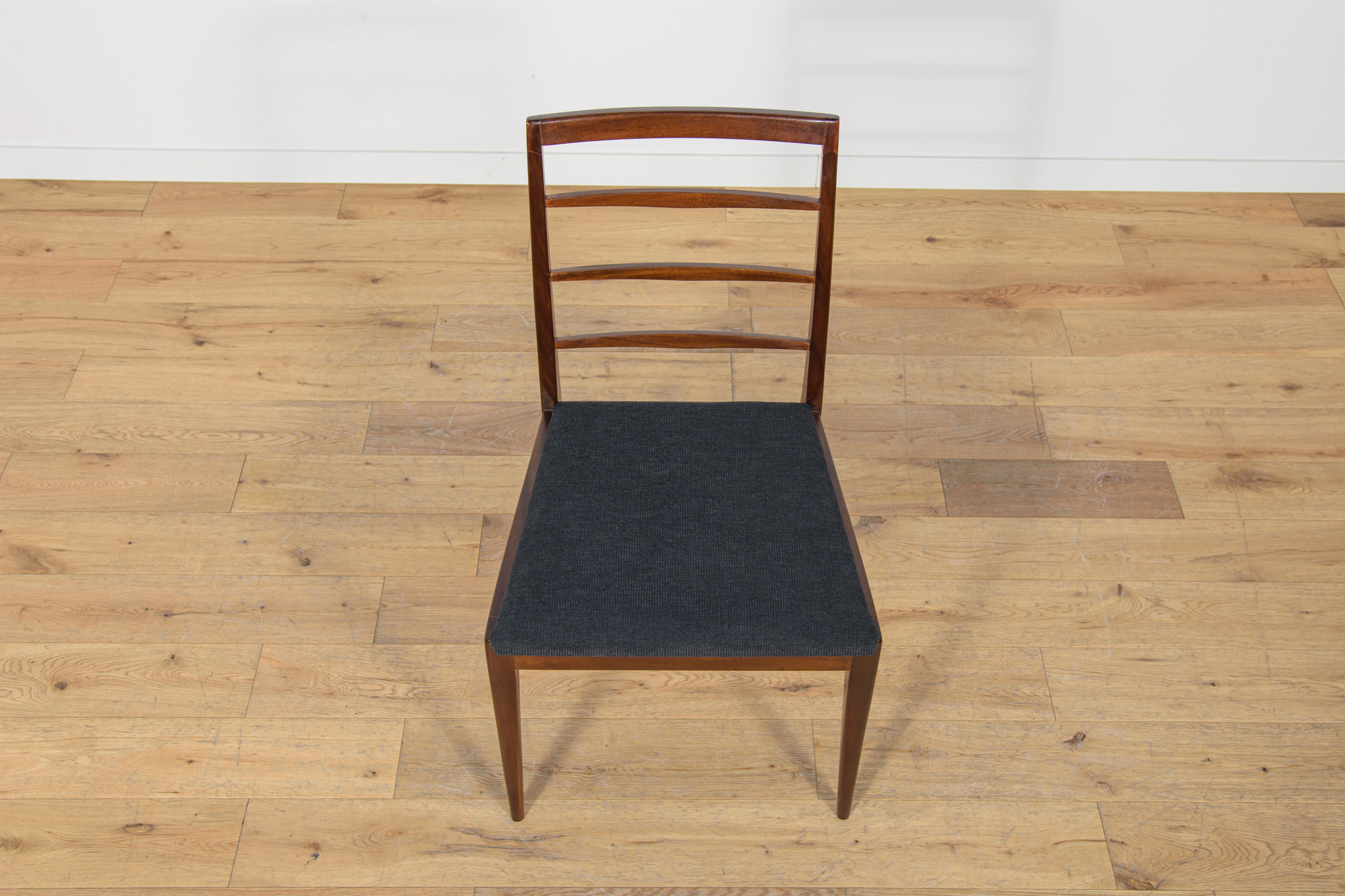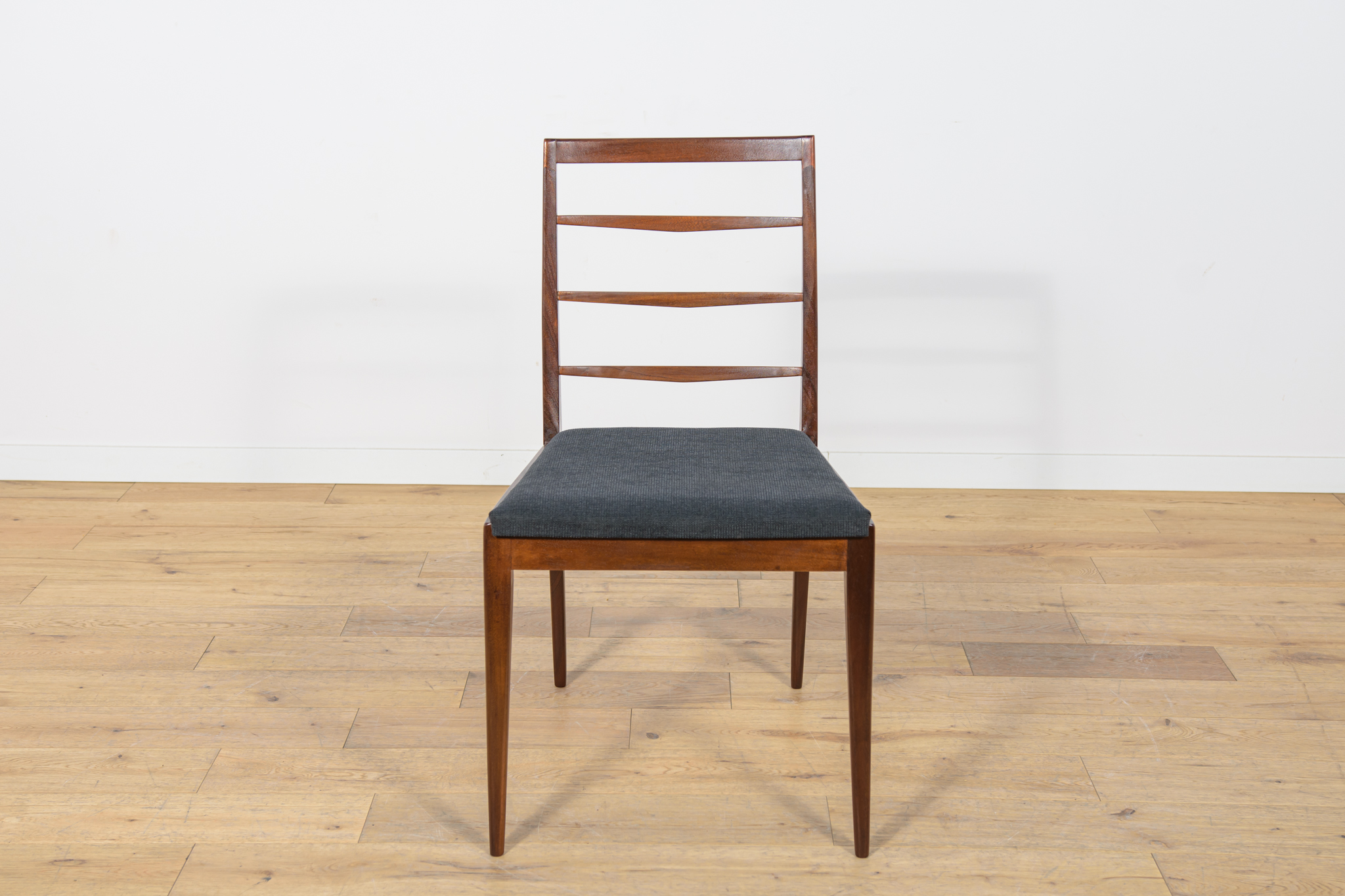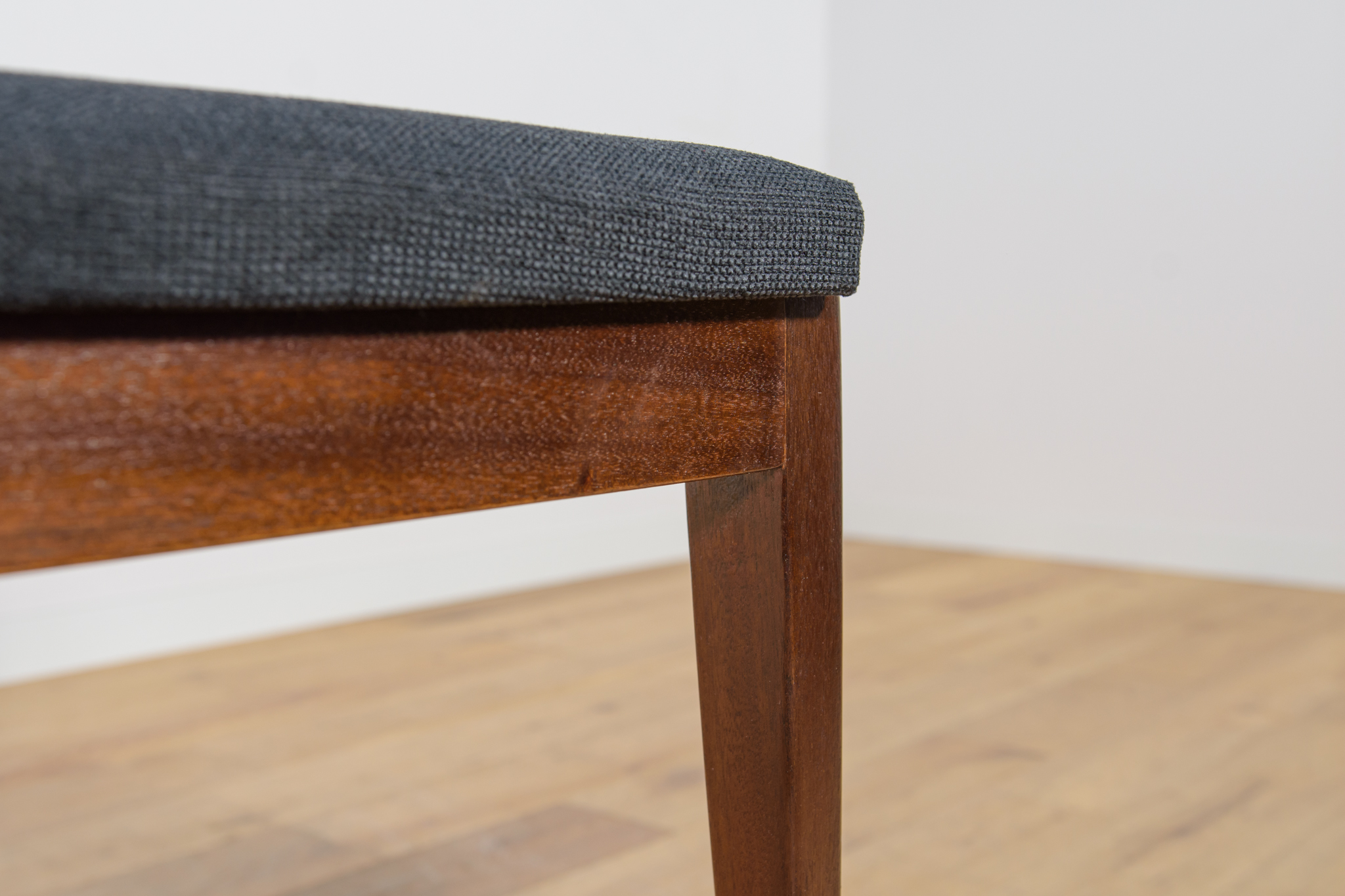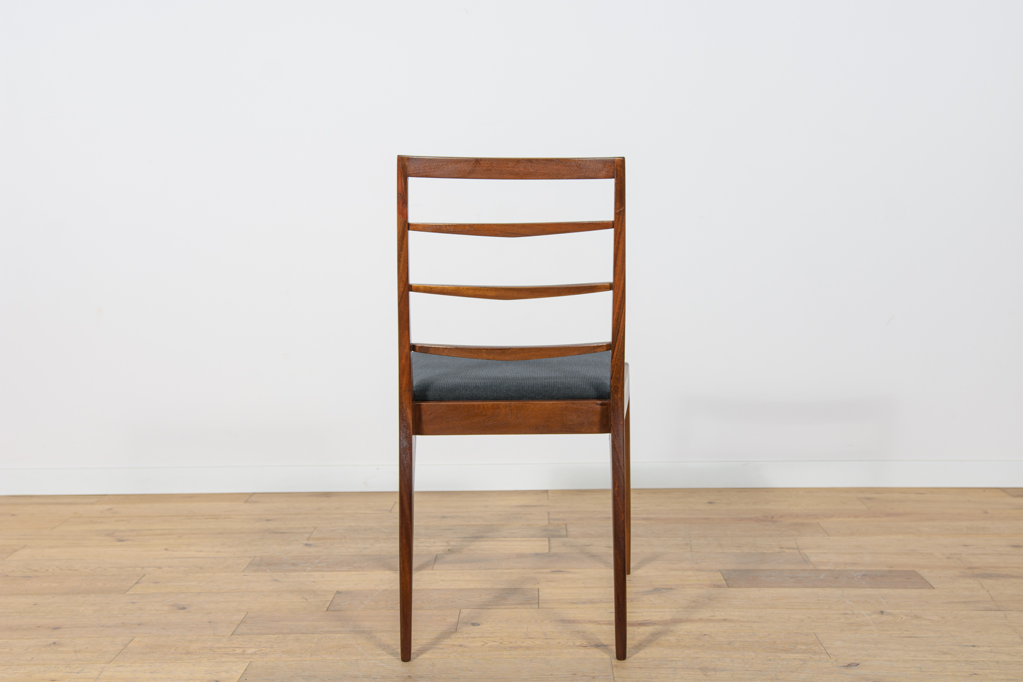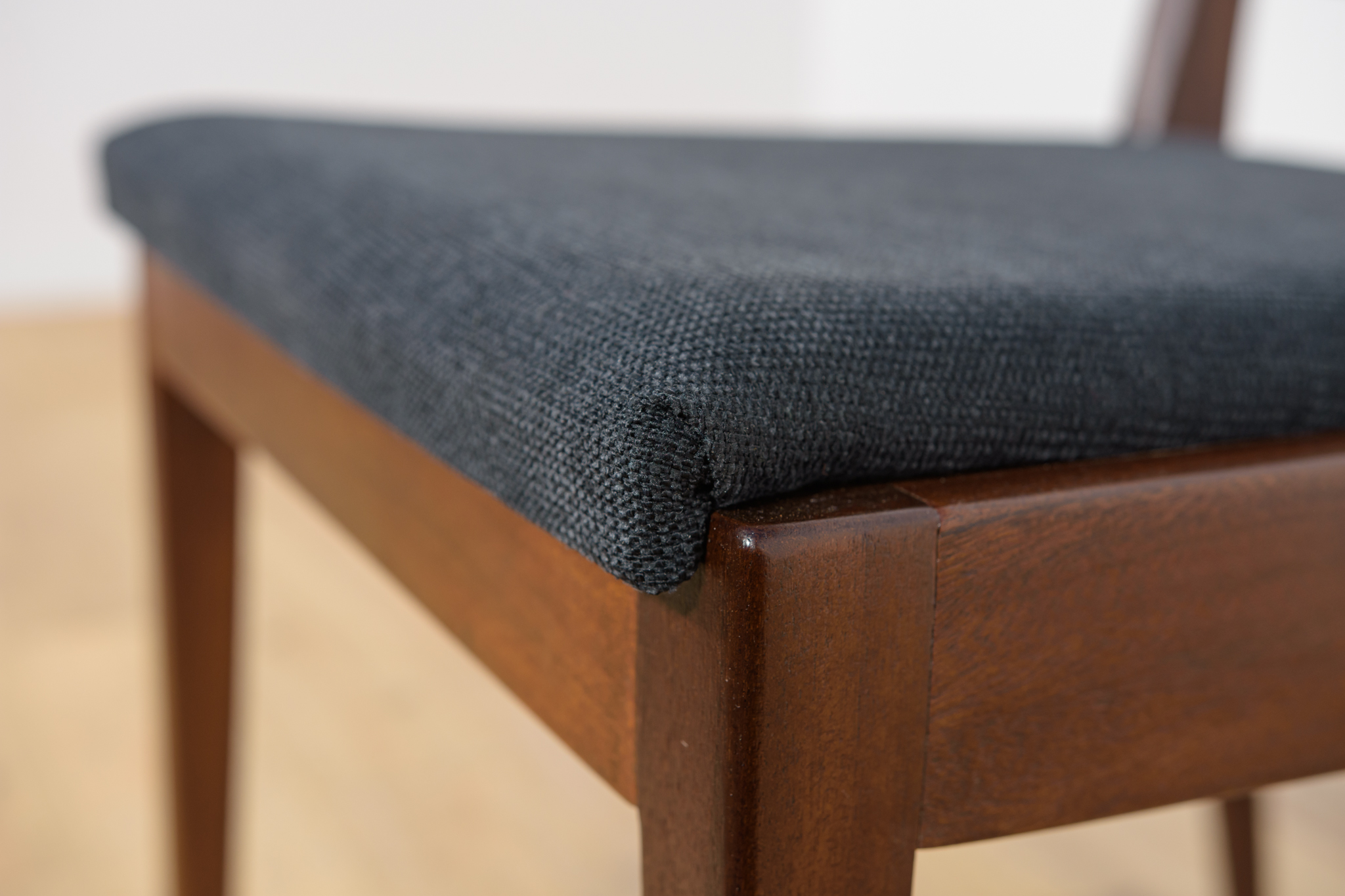 Komplet sześciu krzeseł wyprodukowanych w brytyjskiej manufakturze McIntosh w latach 60. Eleganckie krzesła o ciekawej formie. Drewno tekowe zostało oczyszczone, wykończone olejem Danish Oil. Wnętrza tapicerskie wymienione, obite nową wysokogatunkową tkaniną w kolorze czarnym.