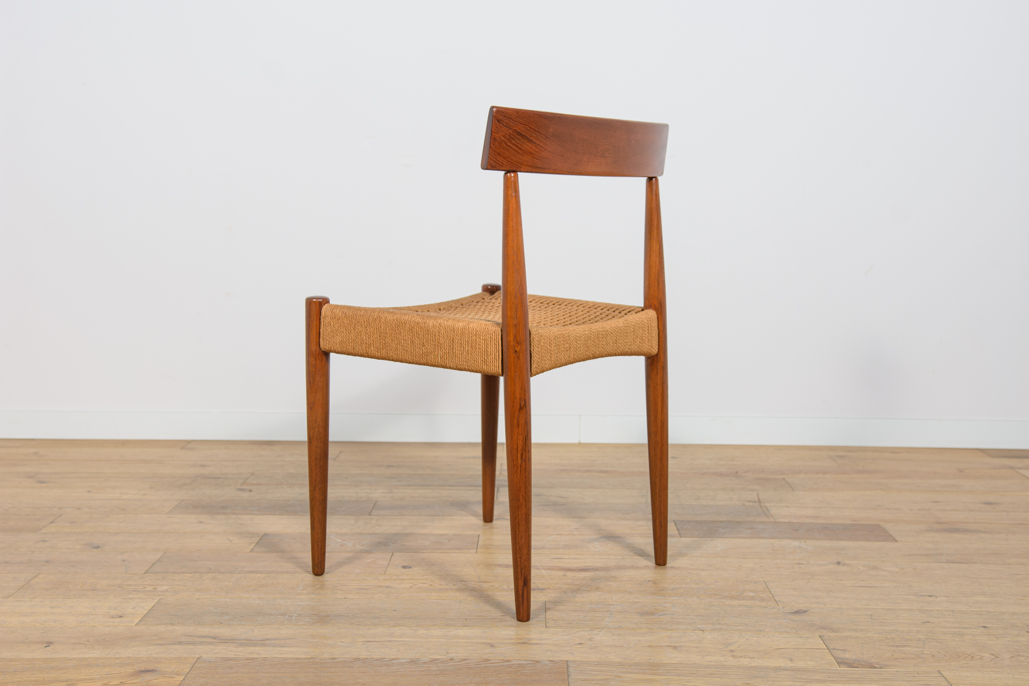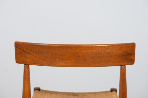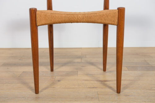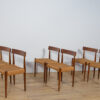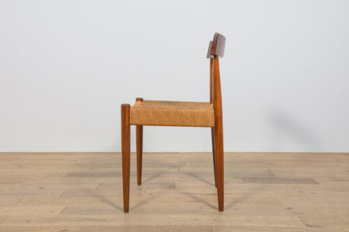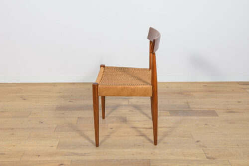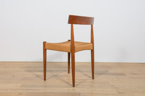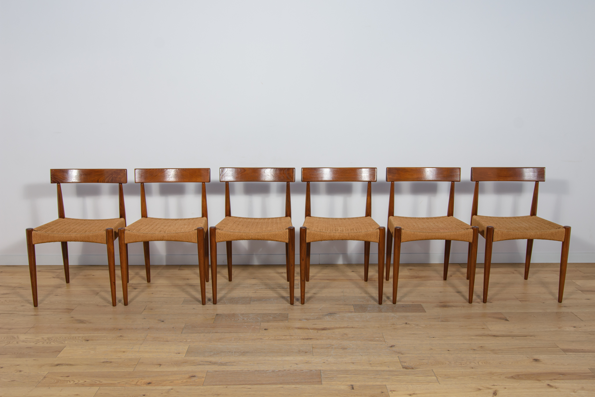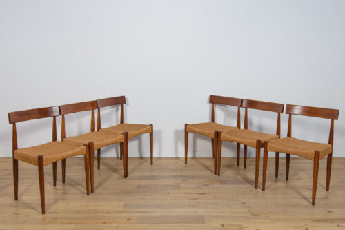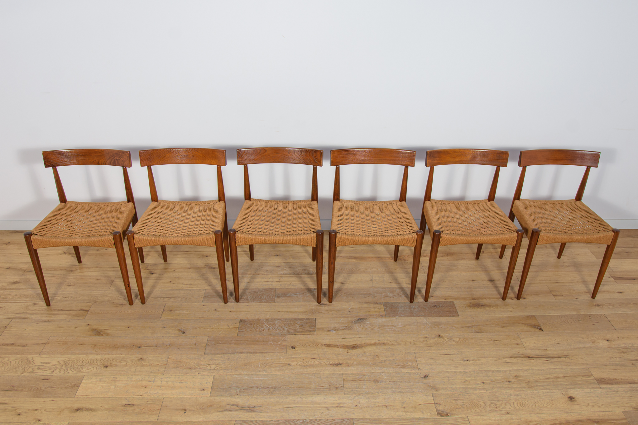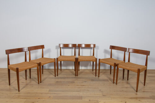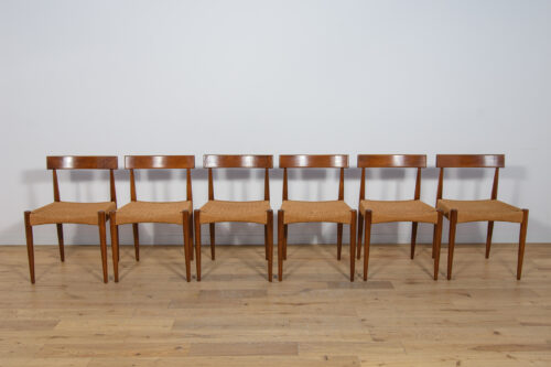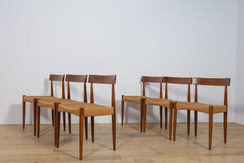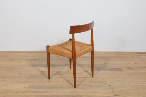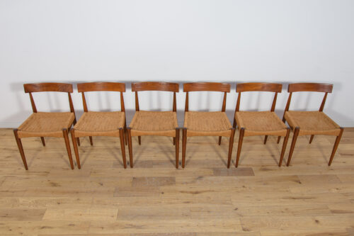 Komplet sześciu krzeseł zaprojektowanych przez Arne Hovmand Olsena, dla duńskiej manufaktury Mogens Kold, w latach 60. Krzesło wykonane z drewna tekowego po kompleksowej renowacji, oczyszczone zostały ze starej powłoki, wykończone olejem Danish Oil. Posiadają oryginalne, wyplatane siedziska, zachowane w stanie bardzo dobrym.