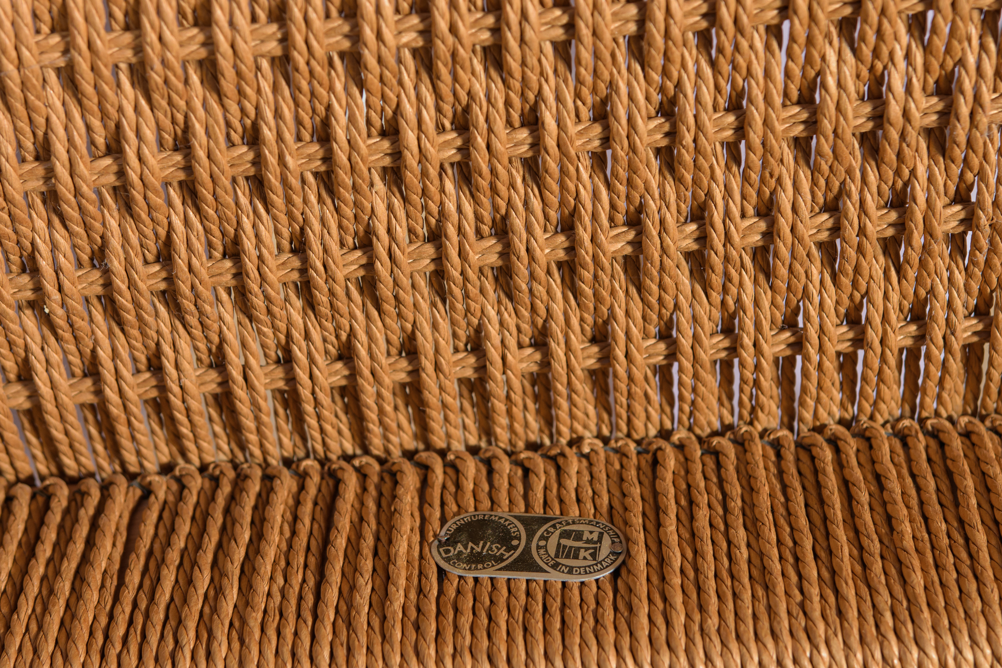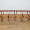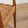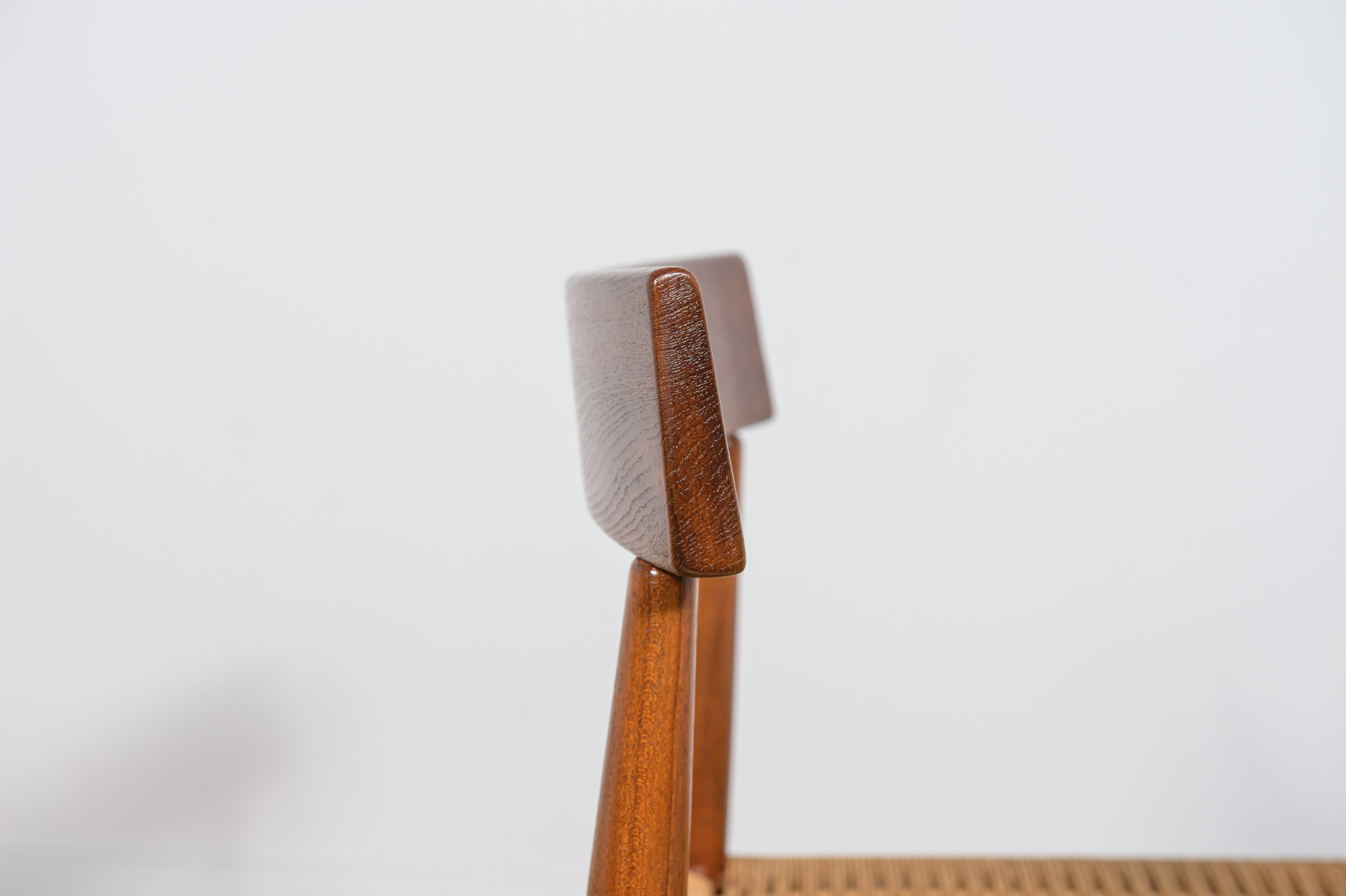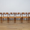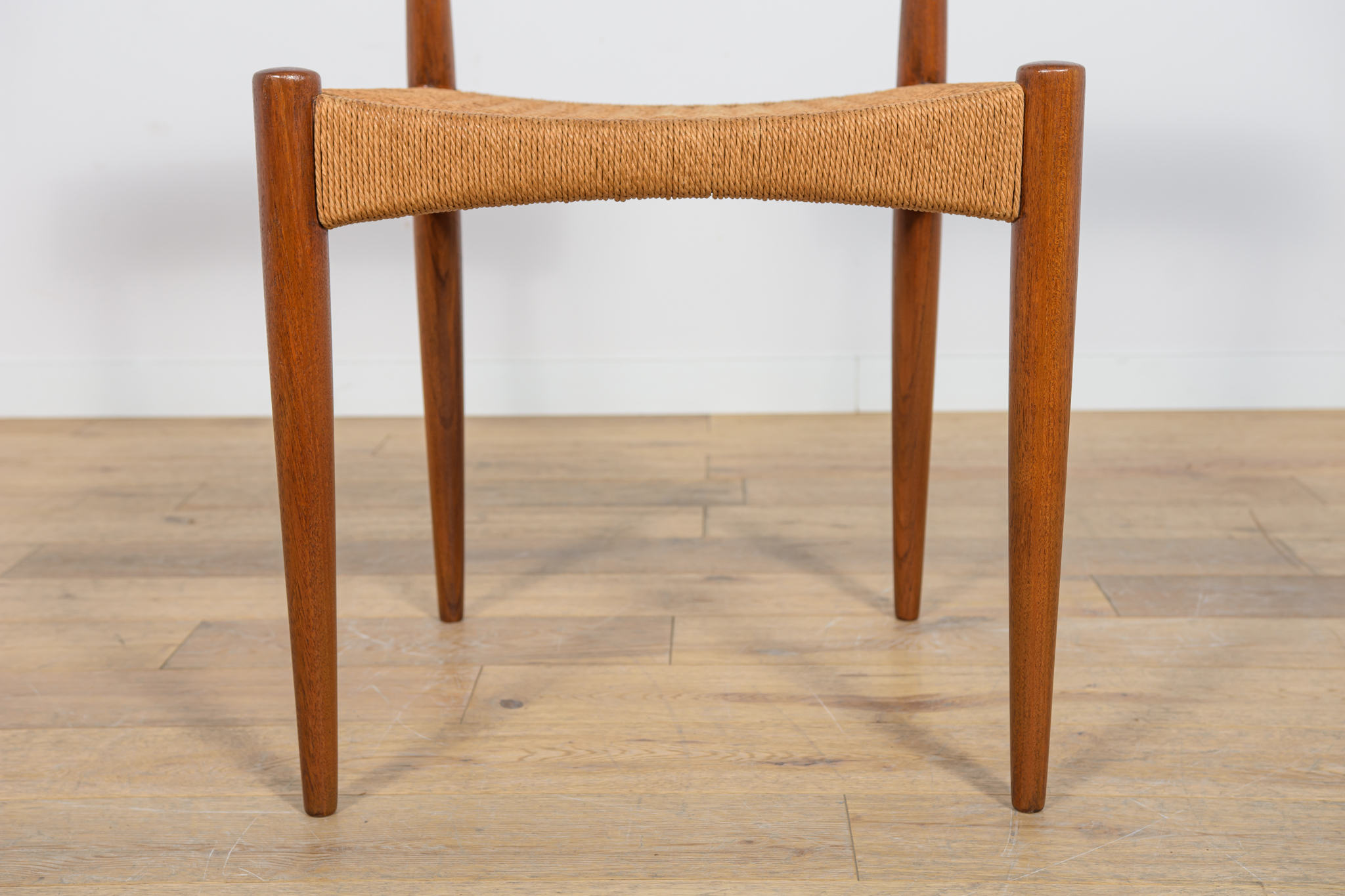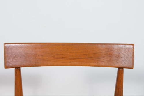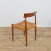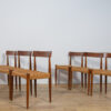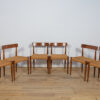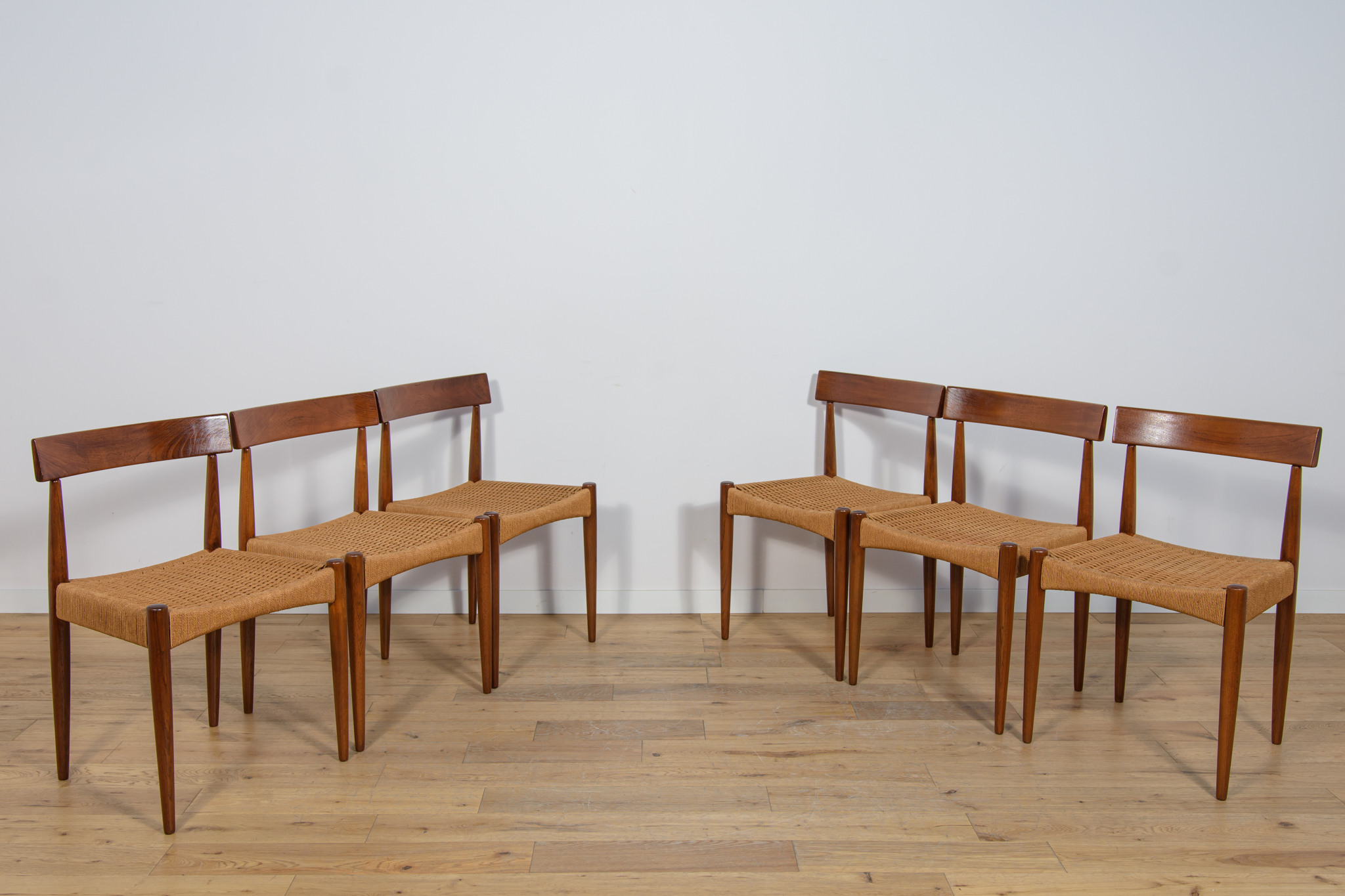 Komplet sześciu krzeseł zaprojektowanych przez Arne Hovmand Olsena, dla duńskiej manufaktury Mogens Kold, w latach 60. Krzesło wykonane z drewna tekowego po kompleksowej renowacji, oczyszczone zostały ze starej powłoki, wykończone olejem Danish Oil. Posiadają oryginalne, wyplatane siedziska, zachowane w stanie bardzo dobrym.