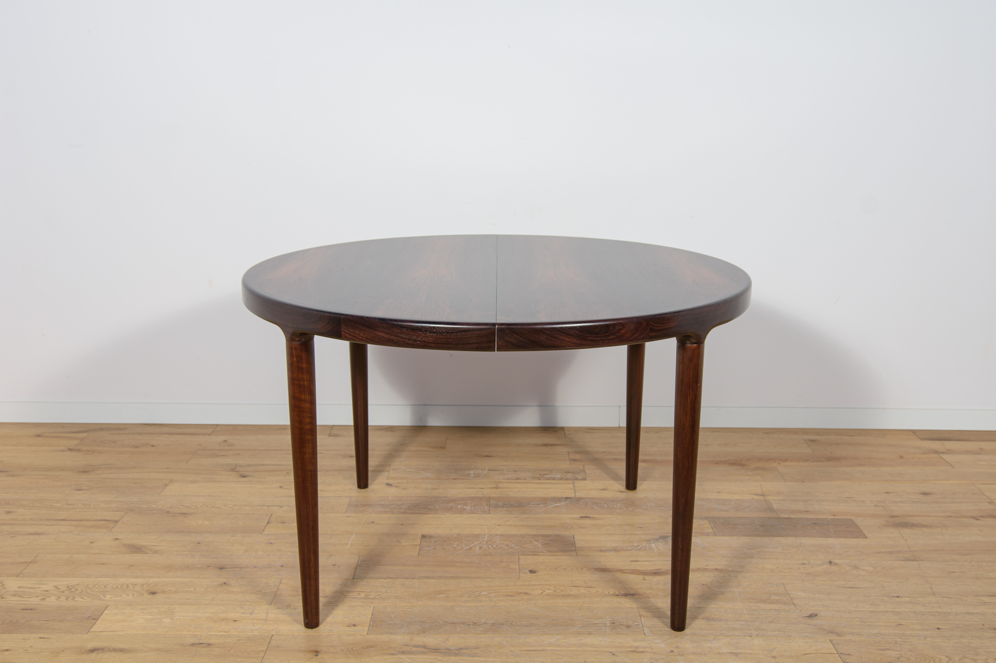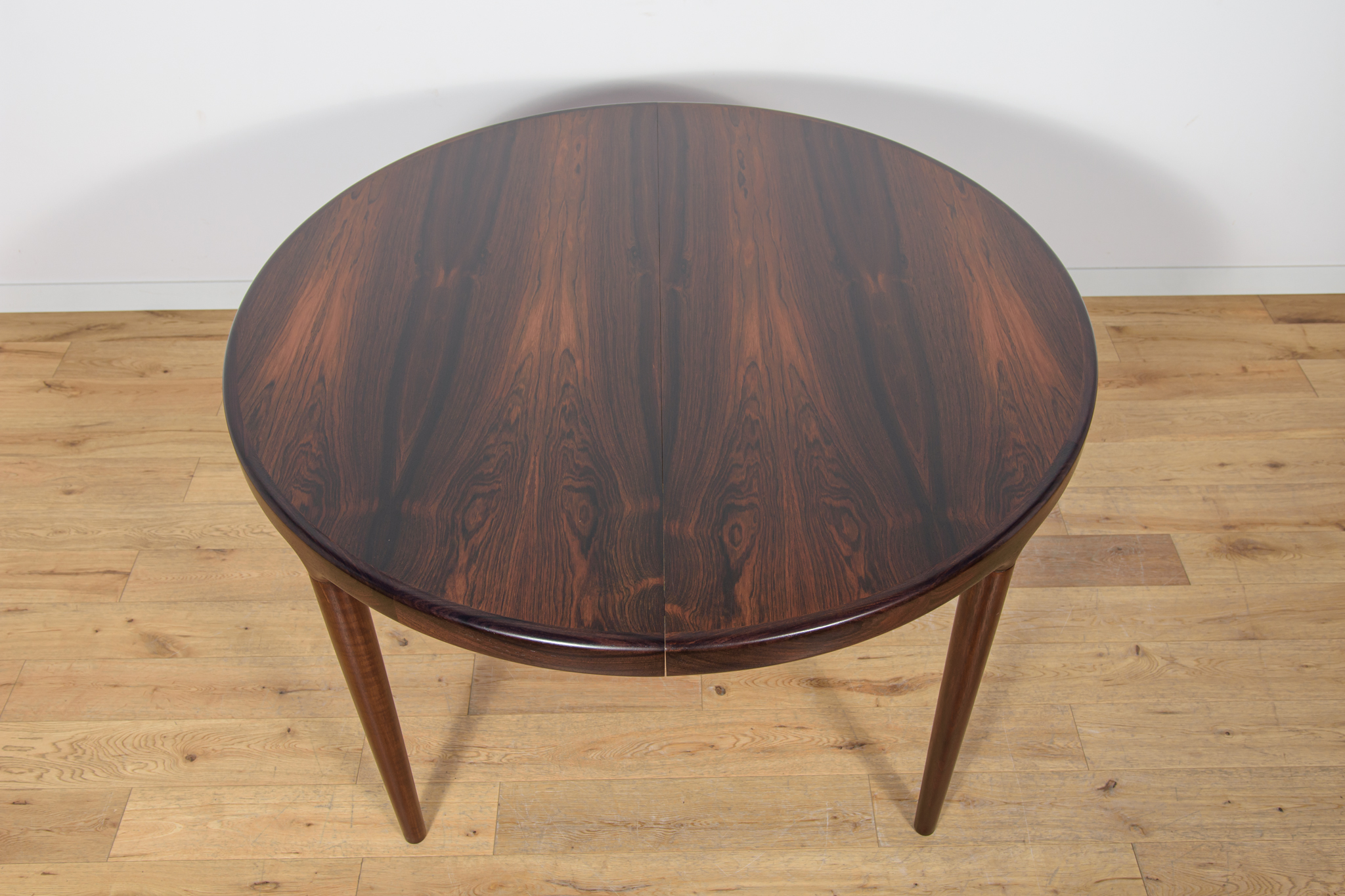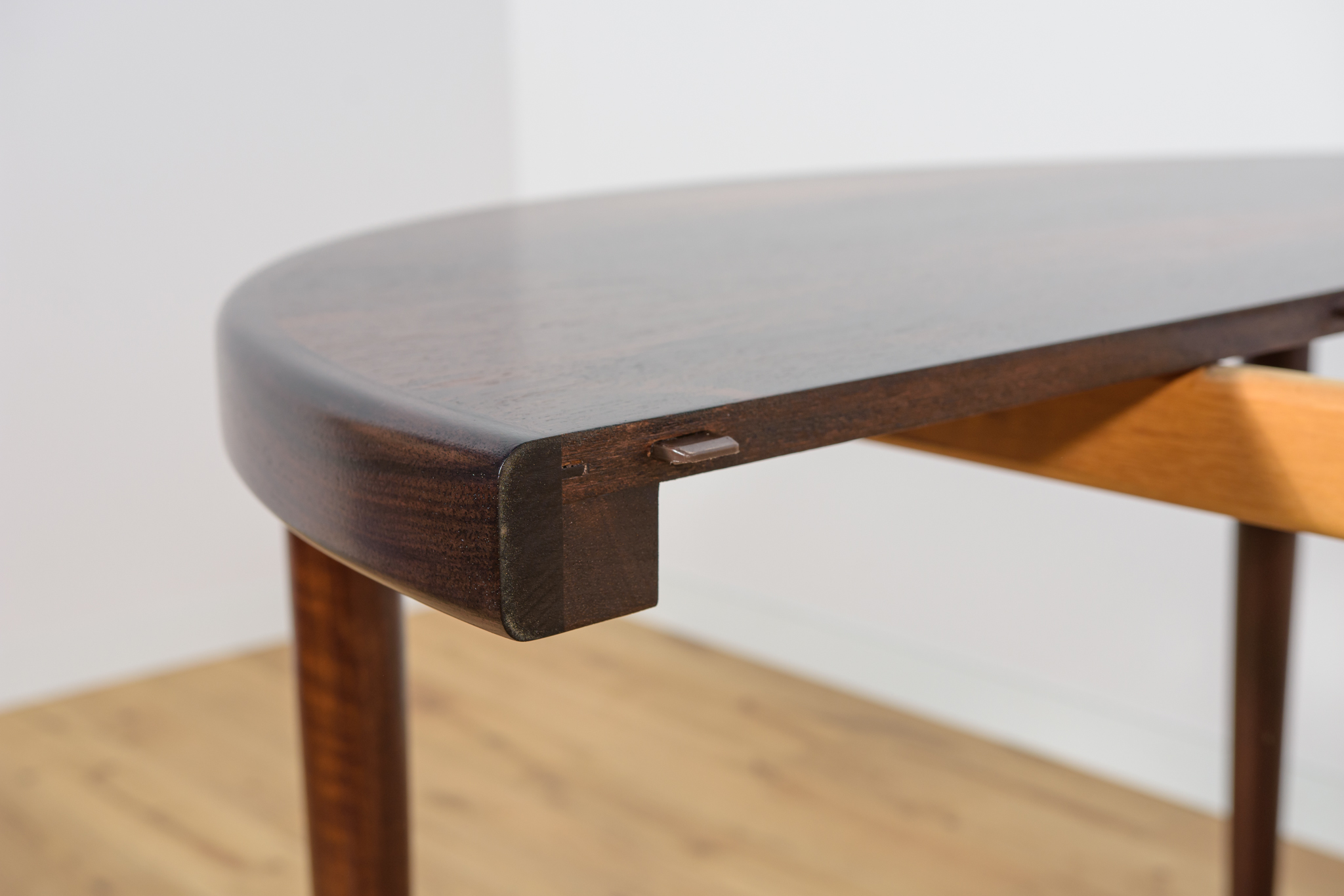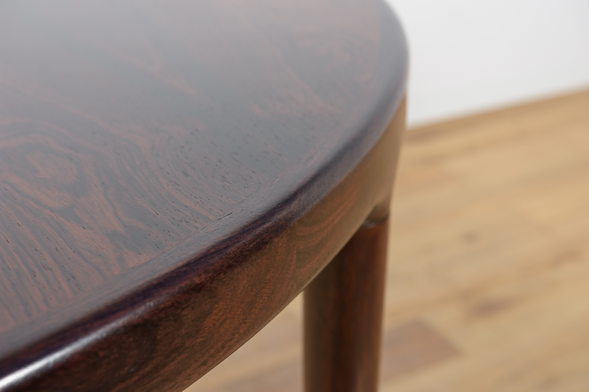 Okrągły rozkładany stół z drewna palisandrowego został wyprodukowany w Danii w latach 60. Stół o wysokim kunsztownie projektu i wykonania, świadczą o tym wyprofilowane solidne obrzeża i nogi. Mebel po kompleksowej renowacji stolarskiej, oczyszczony ze starej powłoki, barwiony bejcą w kolorze palisandrowym, wykończony mocnym półmatowym lakierem. Stół rozkłada z 120 cm- do 170 cm do 220 cm.