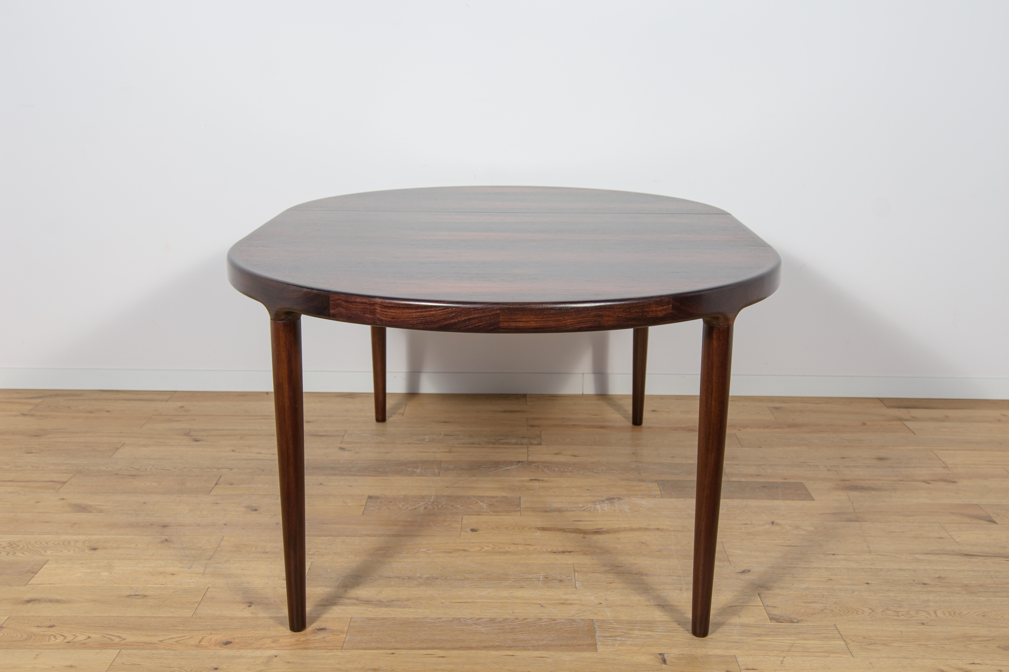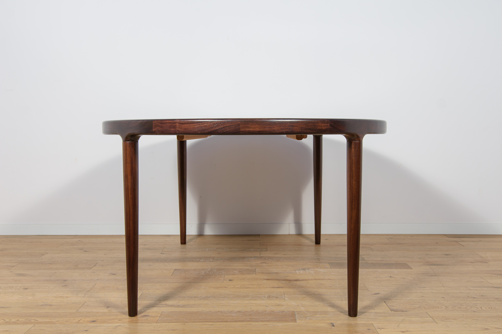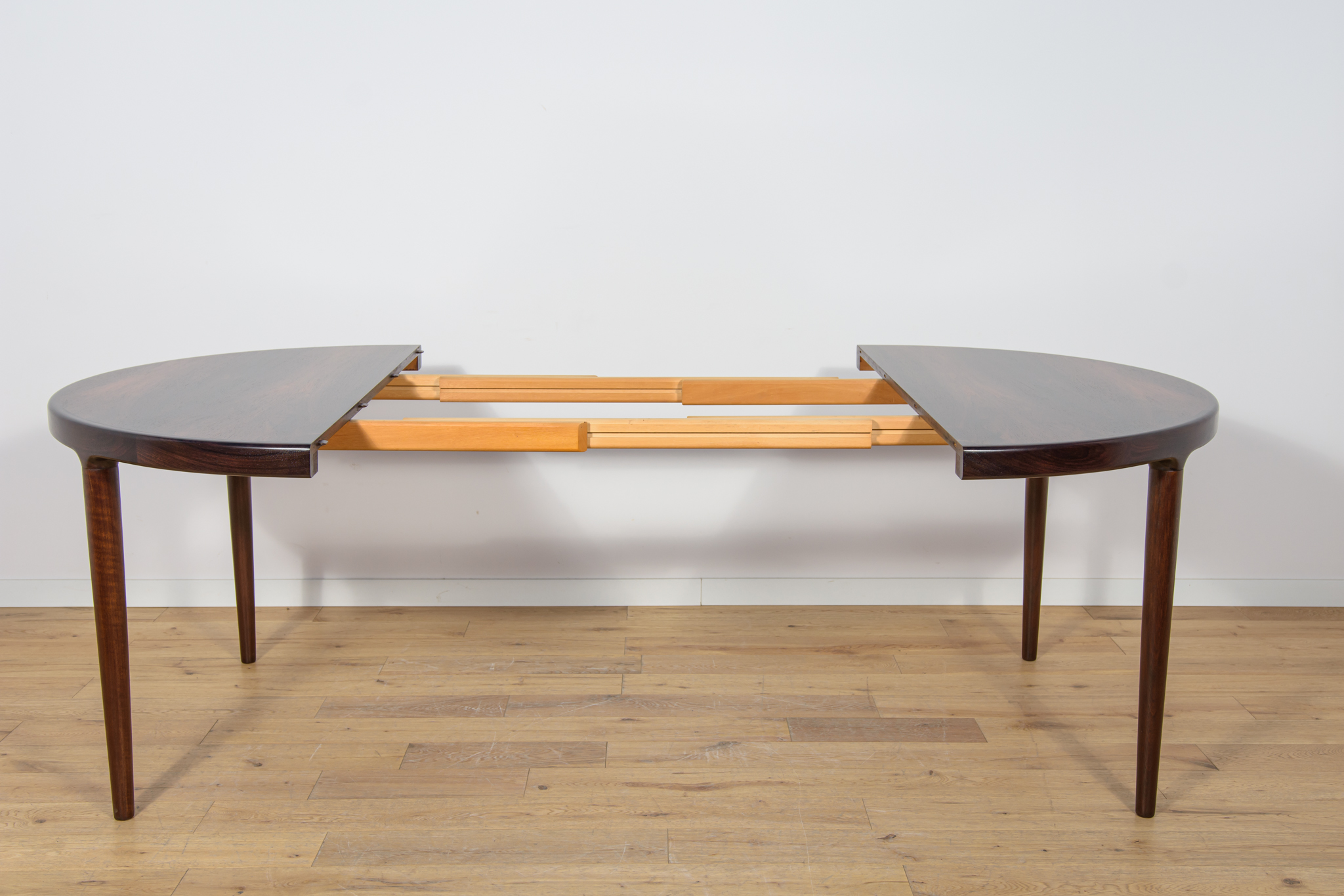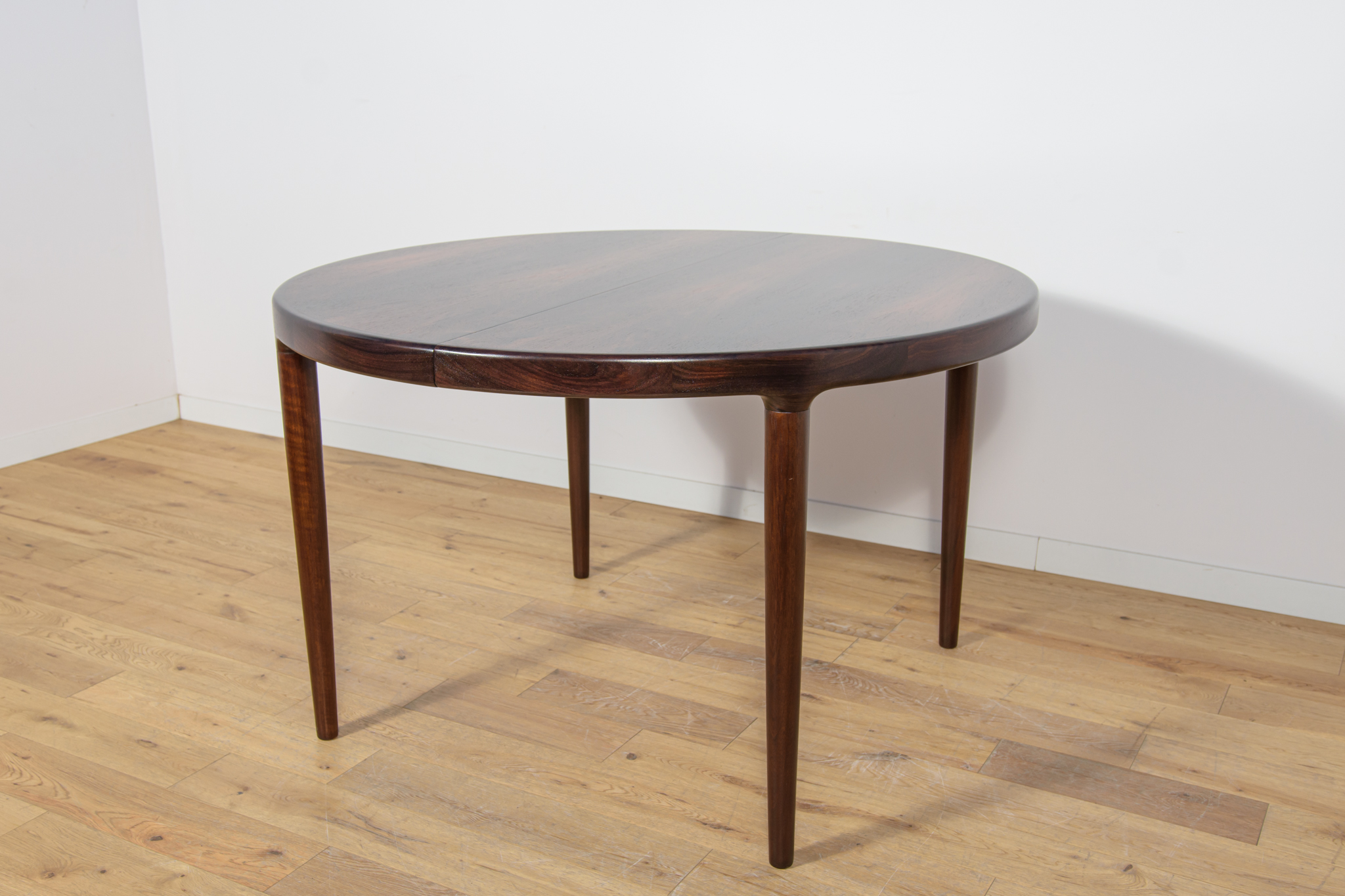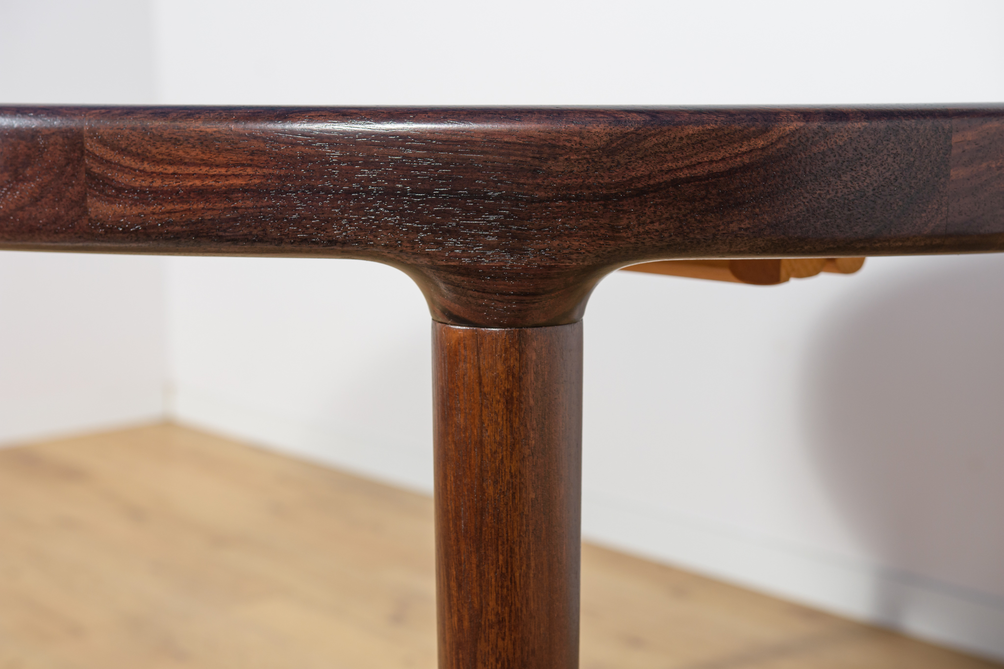 Okrągły rozkładany stół z drewna palisandrowego został wyprodukowany w Danii w latach 60. Stół o wysokim kunsztownie projektu i wykonania, świadczą o tym wyprofilowane solidne obrzeża i nogi. Mebel po kompleksowej renowacji stolarskiej, oczyszczony ze starej powłoki, barwiony bejcą w kolorze palisandrowym, wykończony mocnym półmatowym lakierem. Stół rozkłada z 120 cm- do 170 cm do 220 cm.